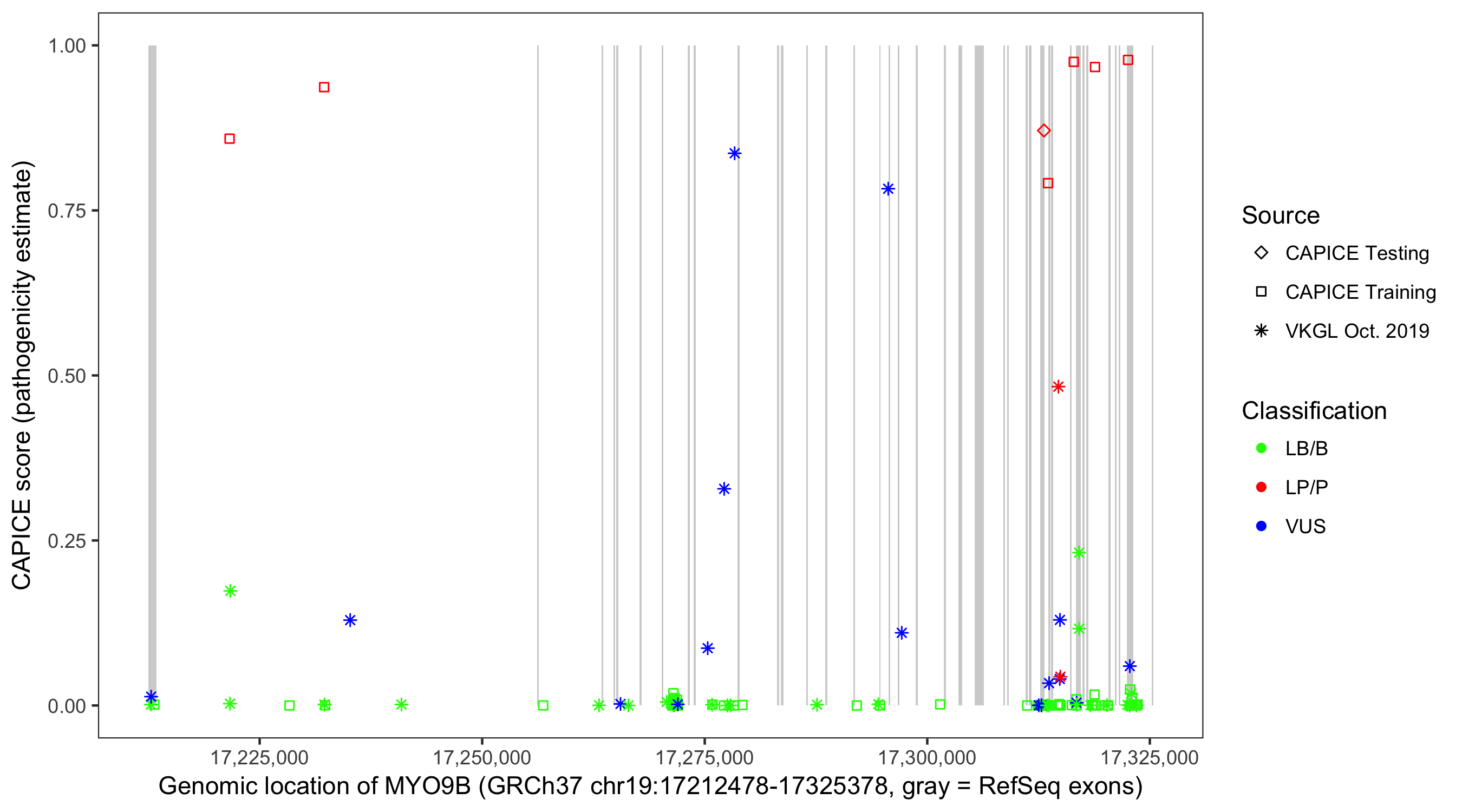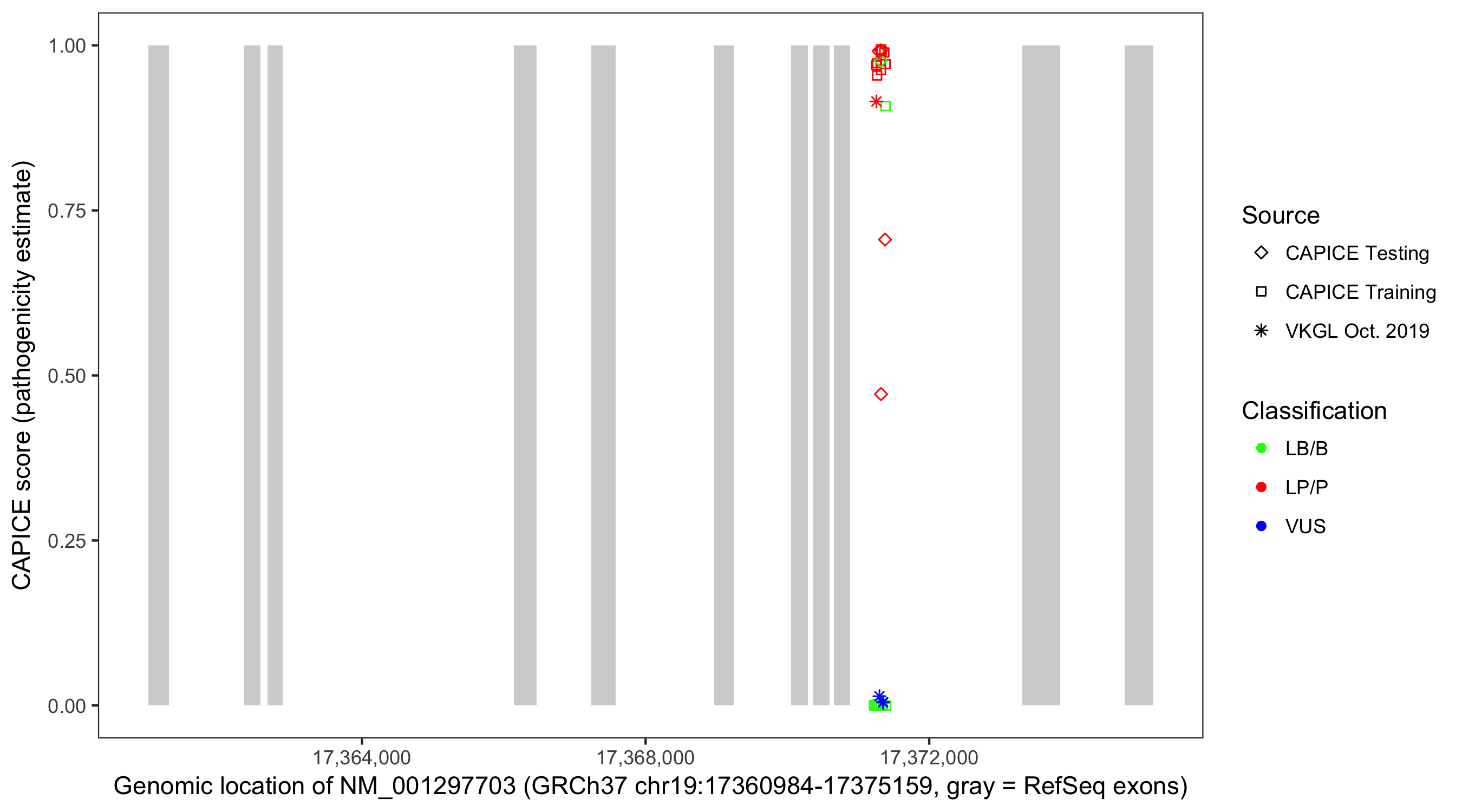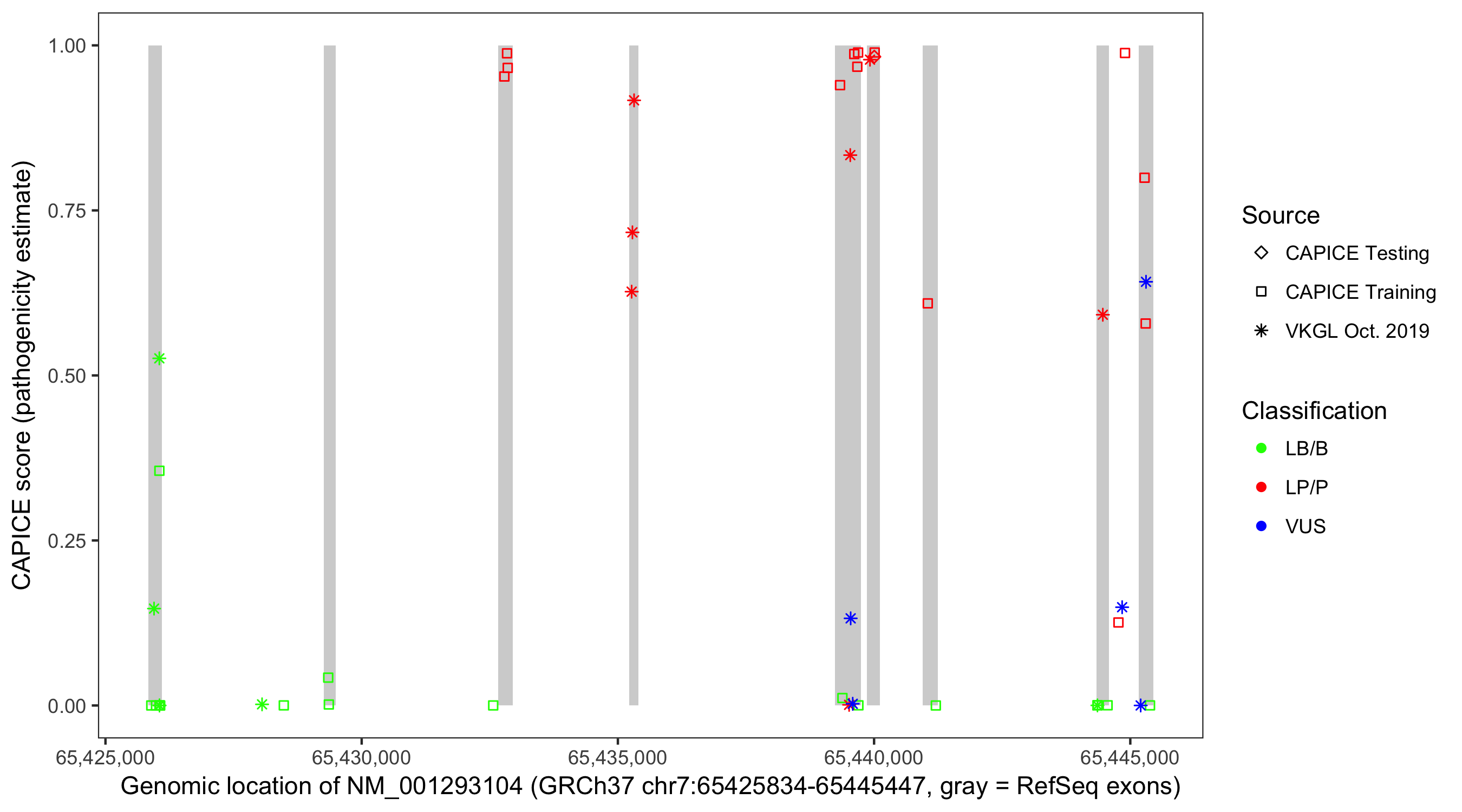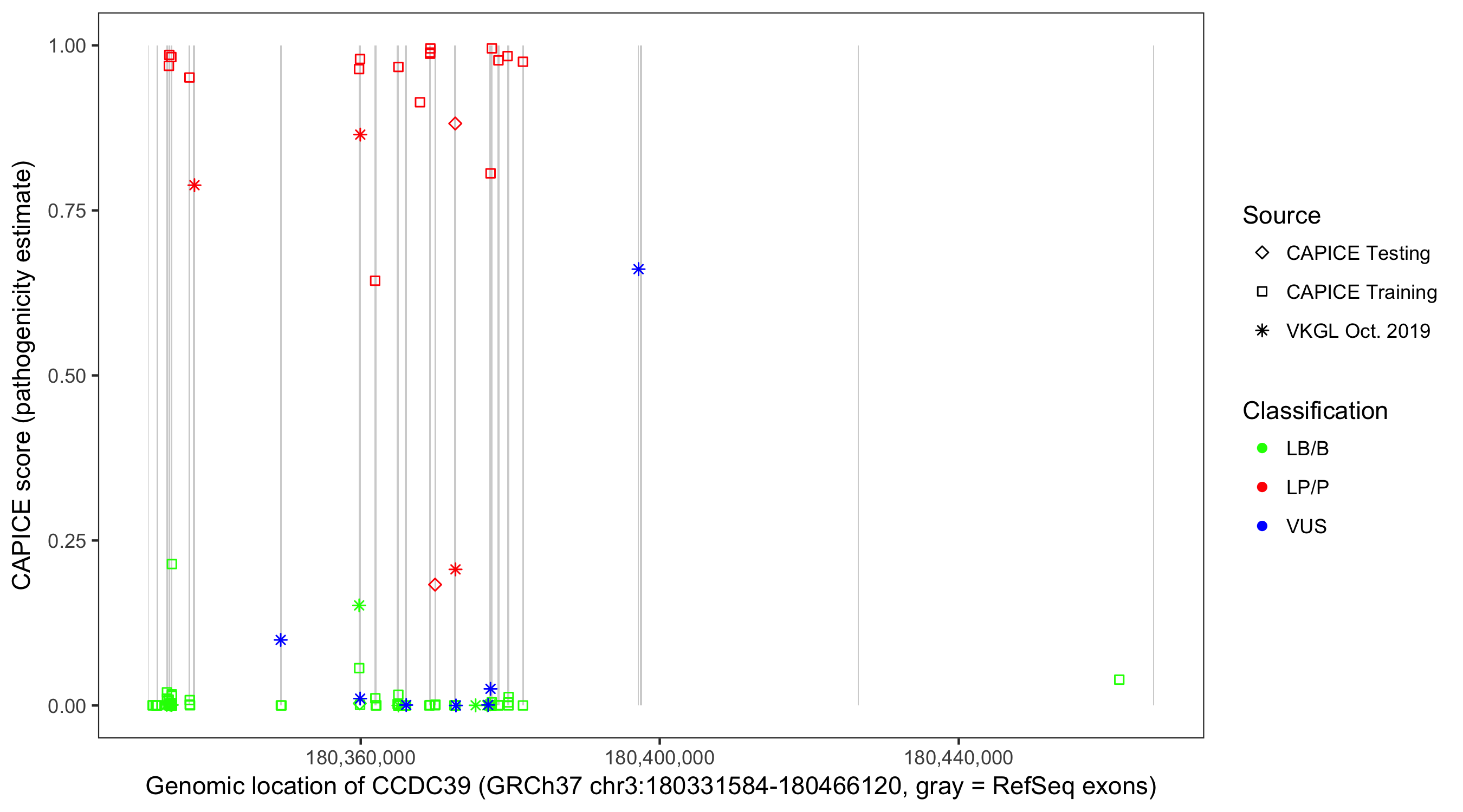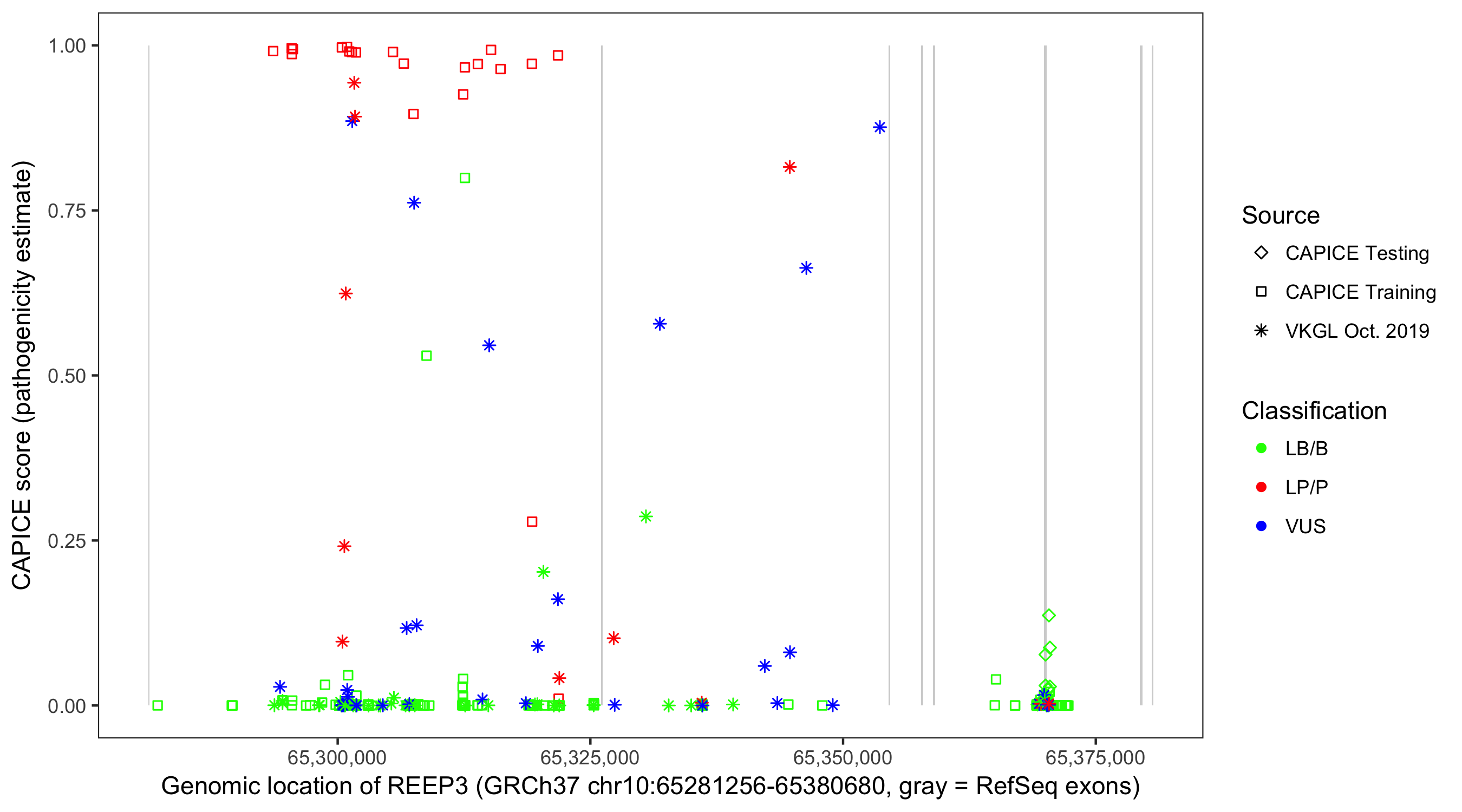 Shown are CAPICE train/test variants plus VKGL Oct 2019.