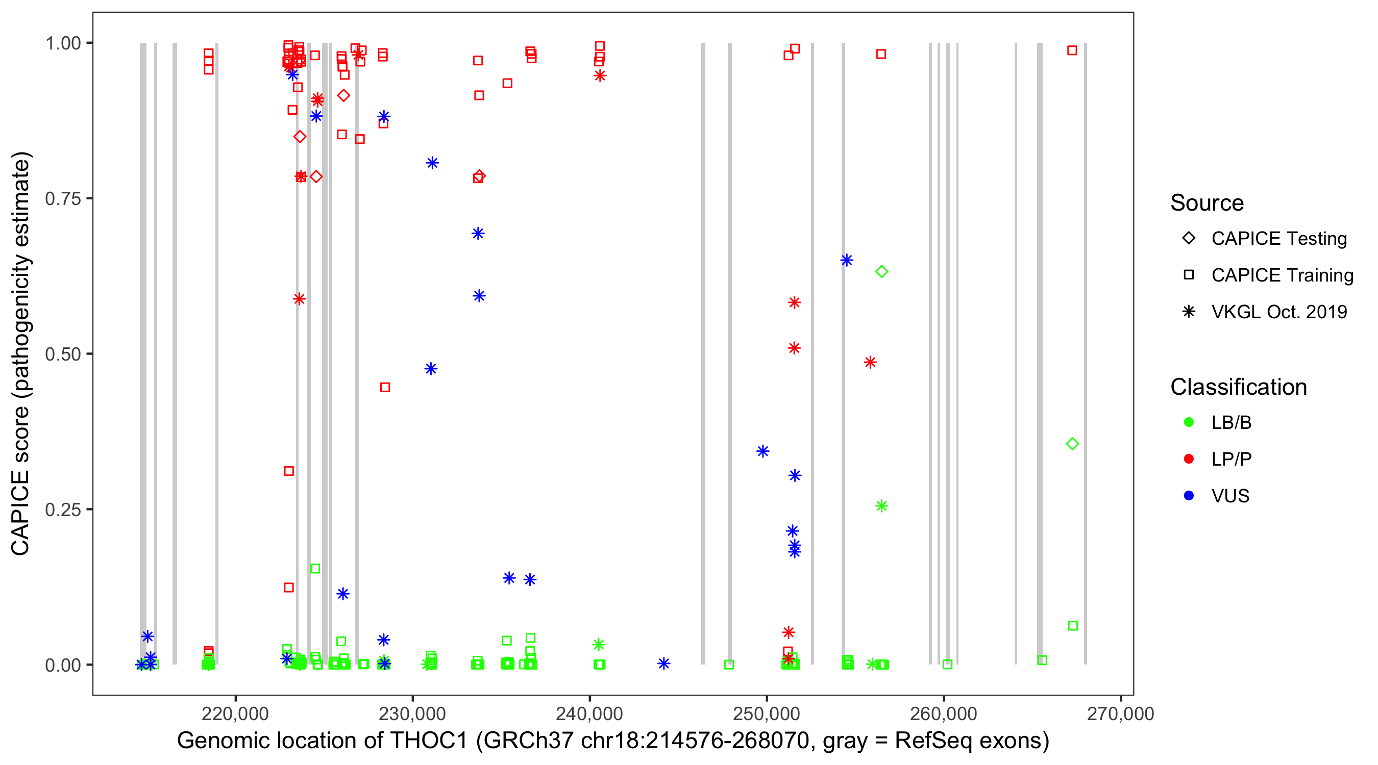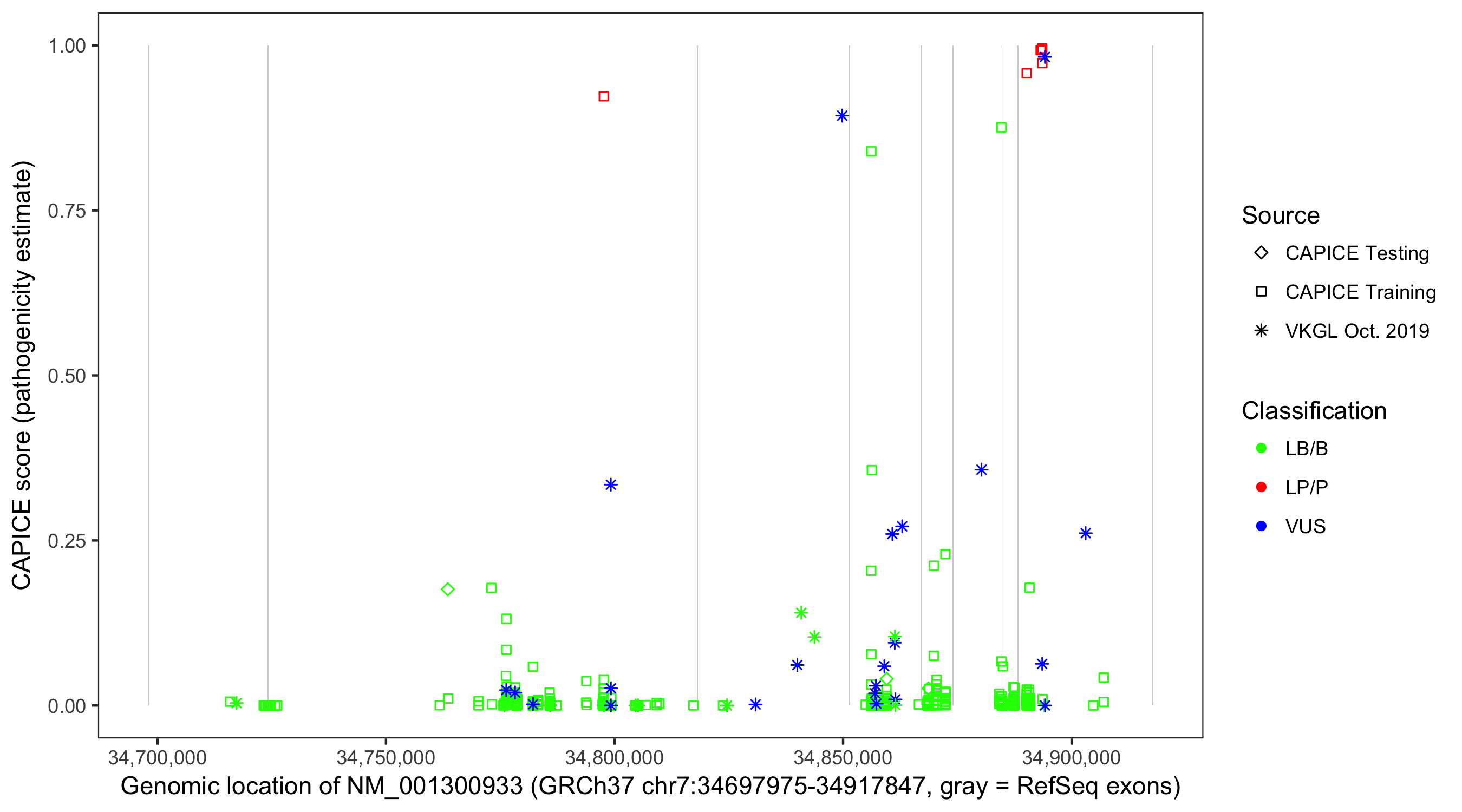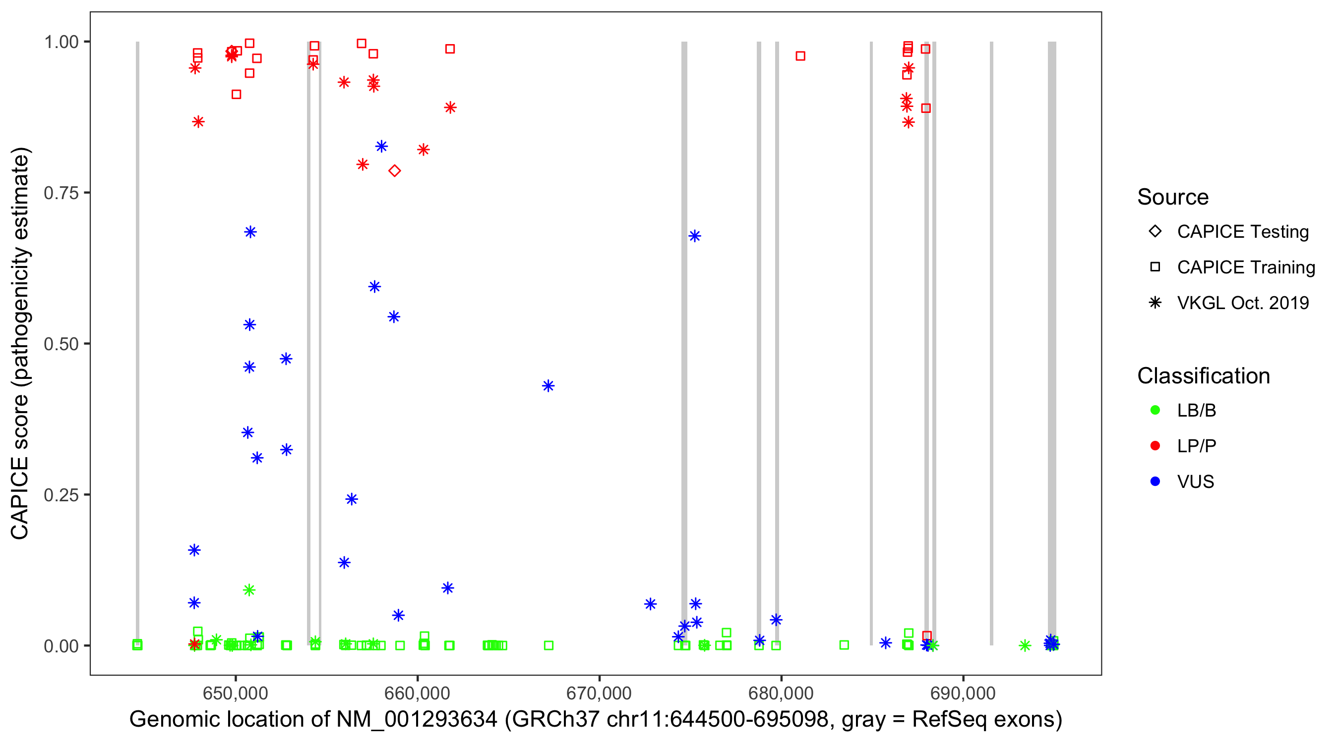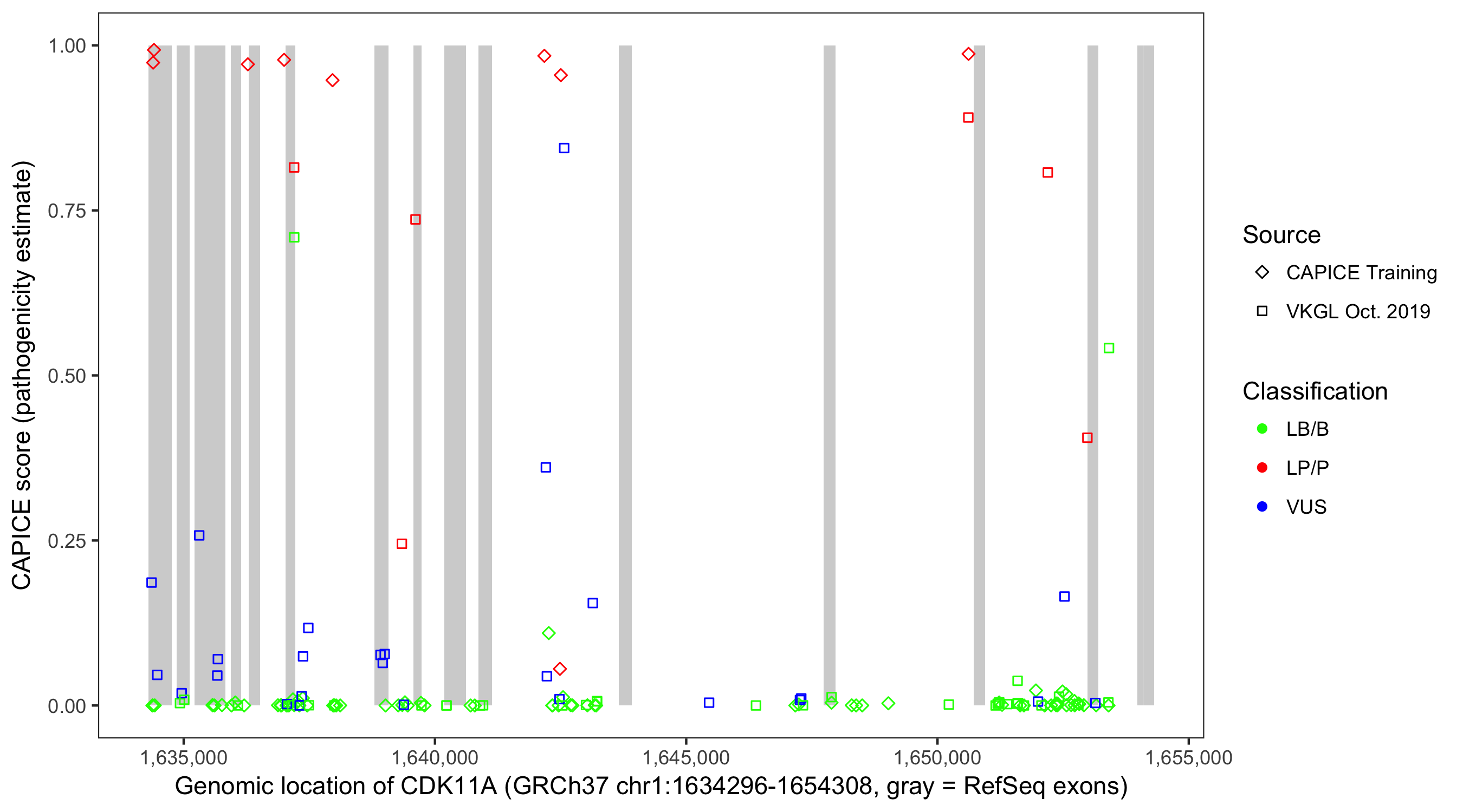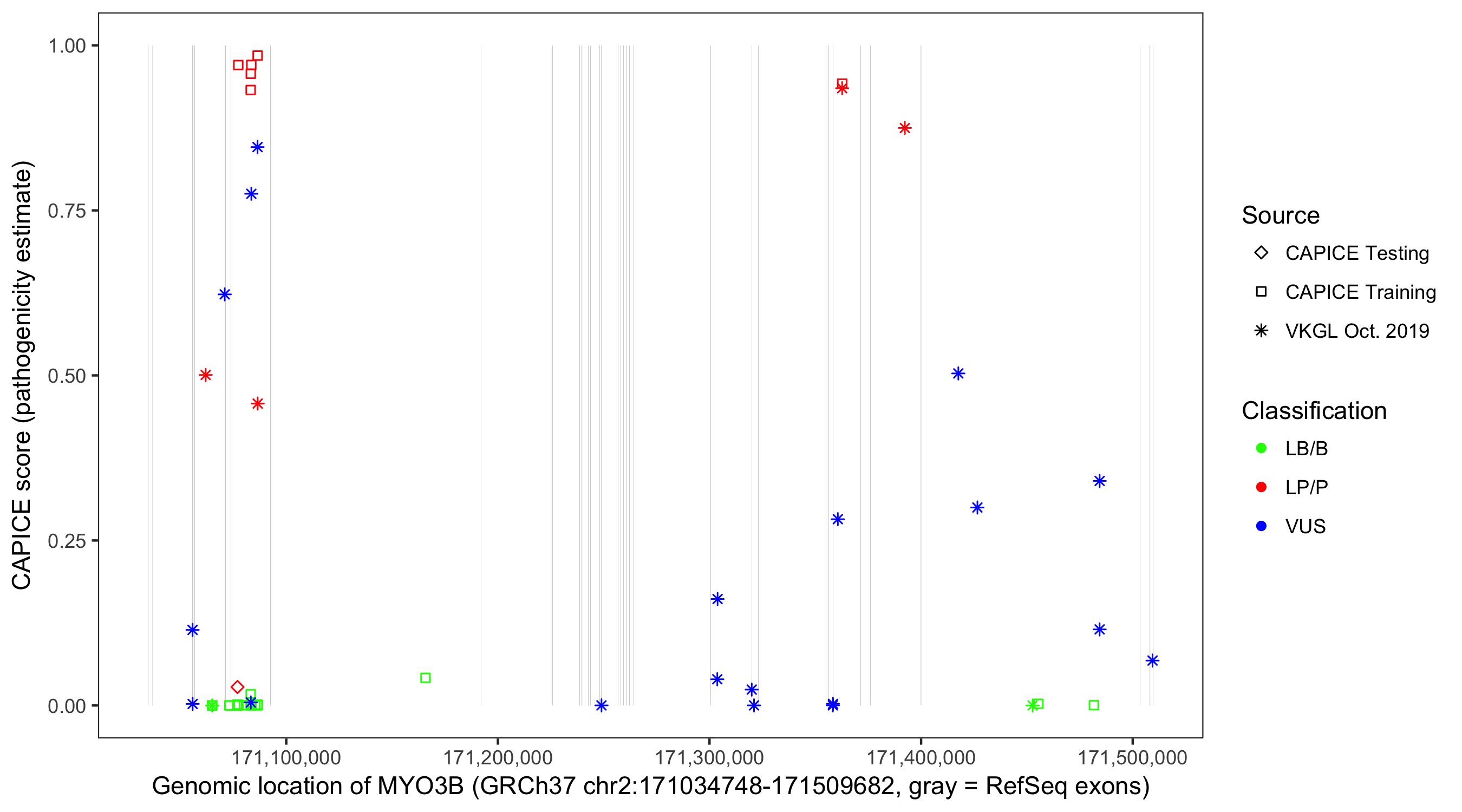 Shown are CAPICE train/test variants plus VKGL Oct 2019.