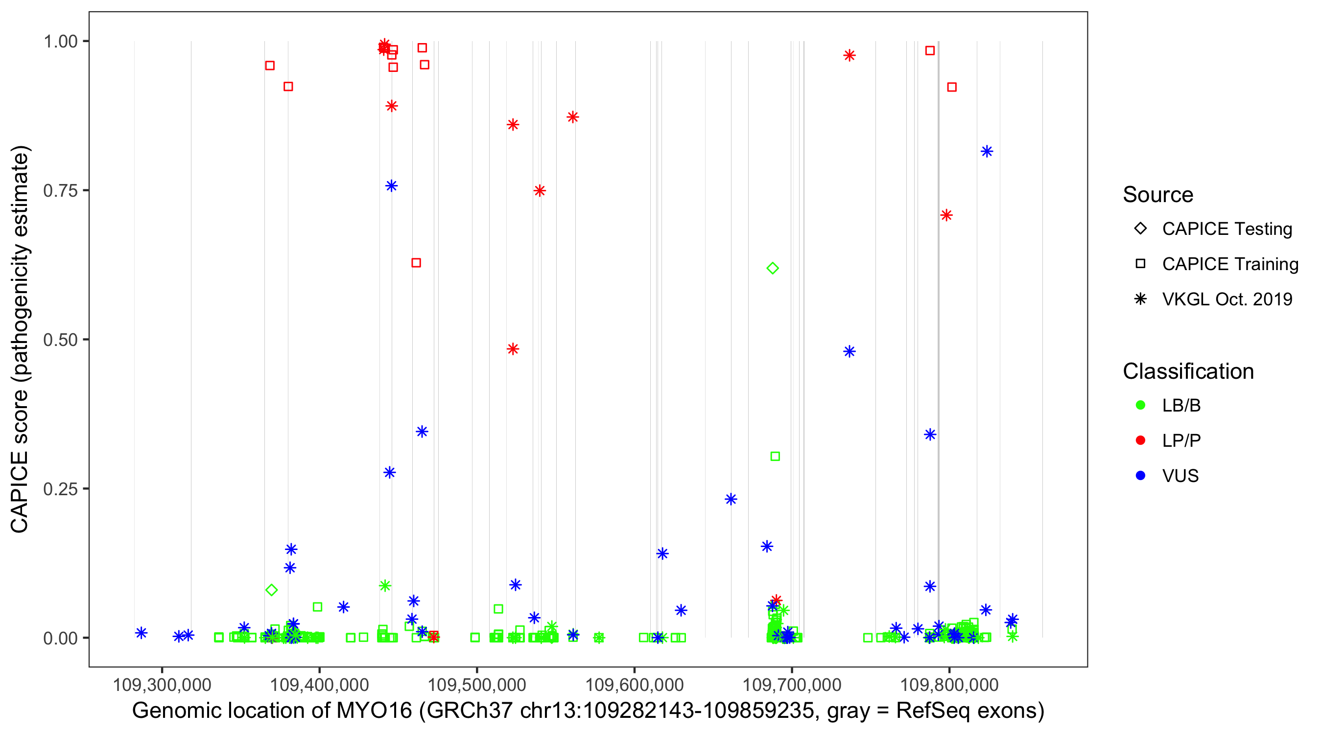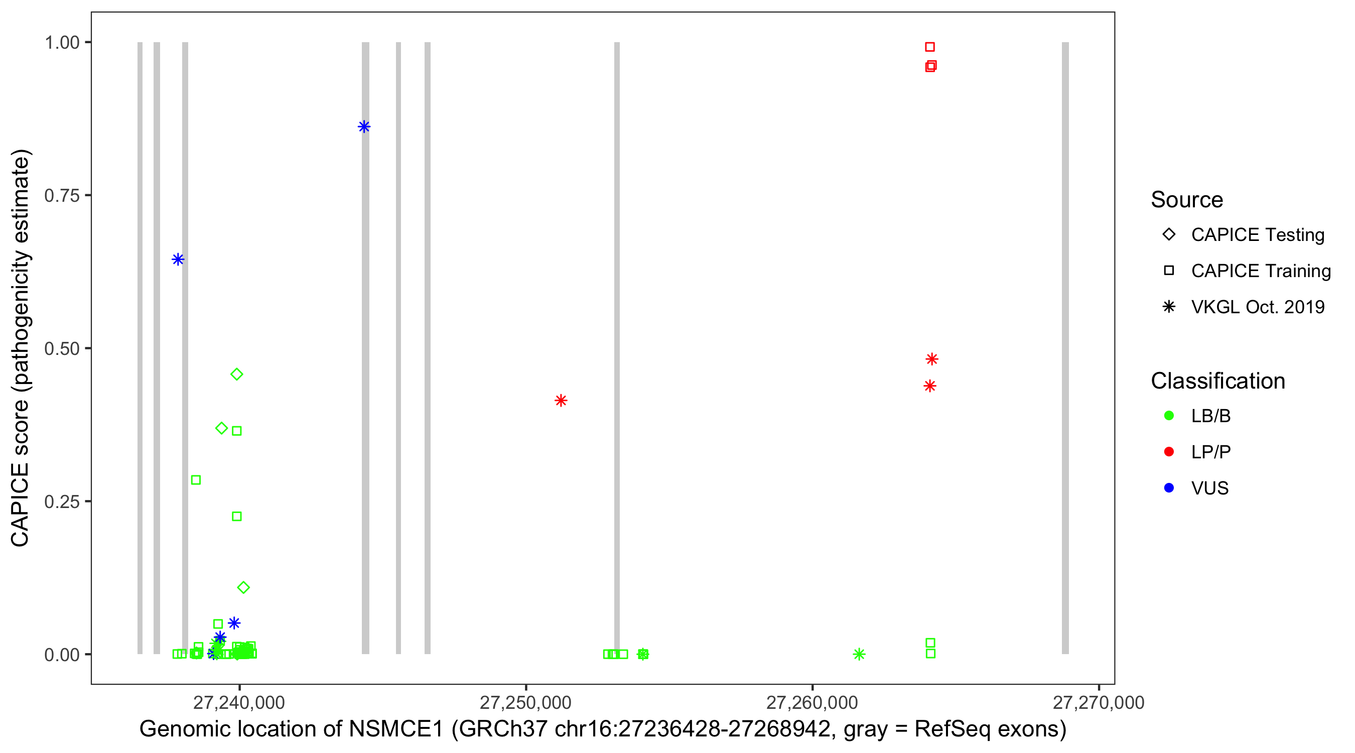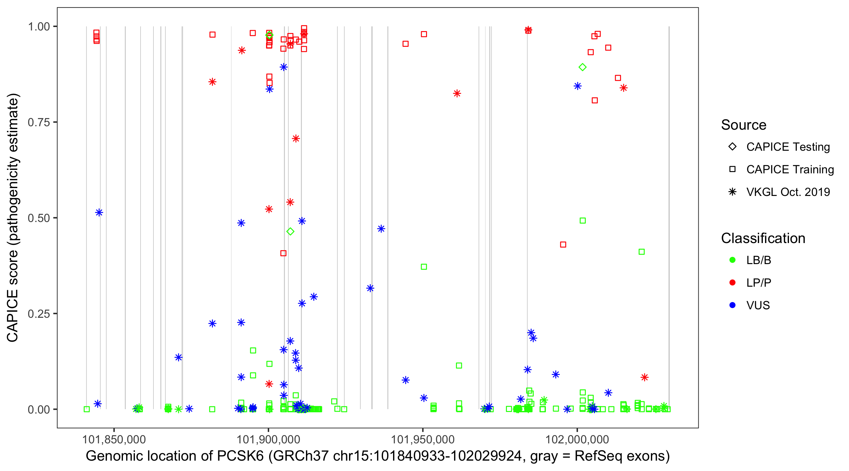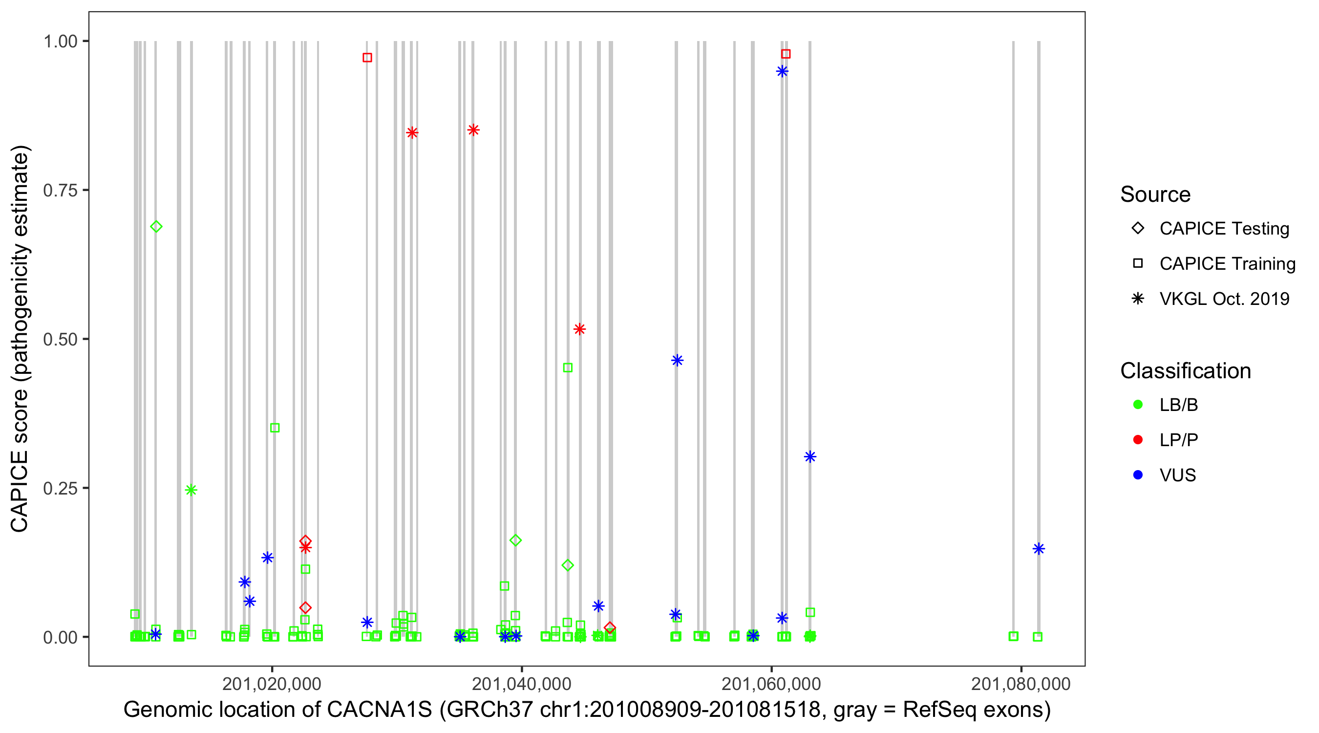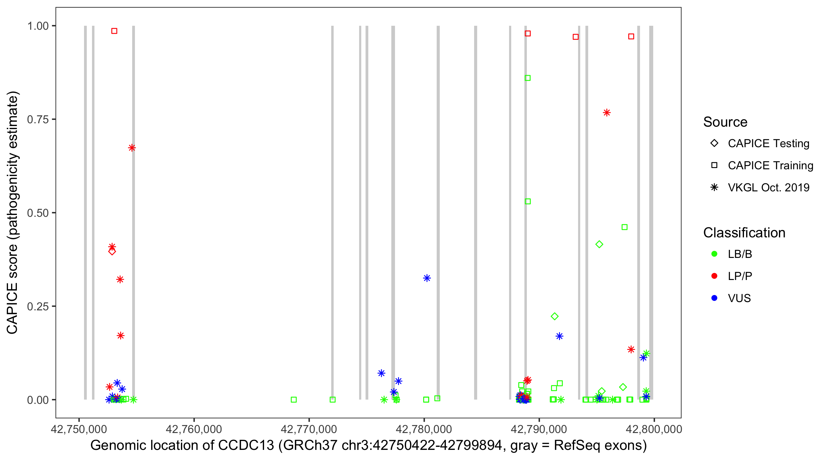 Shown are CAPICE train/test variants plus VKGL Oct 2019.