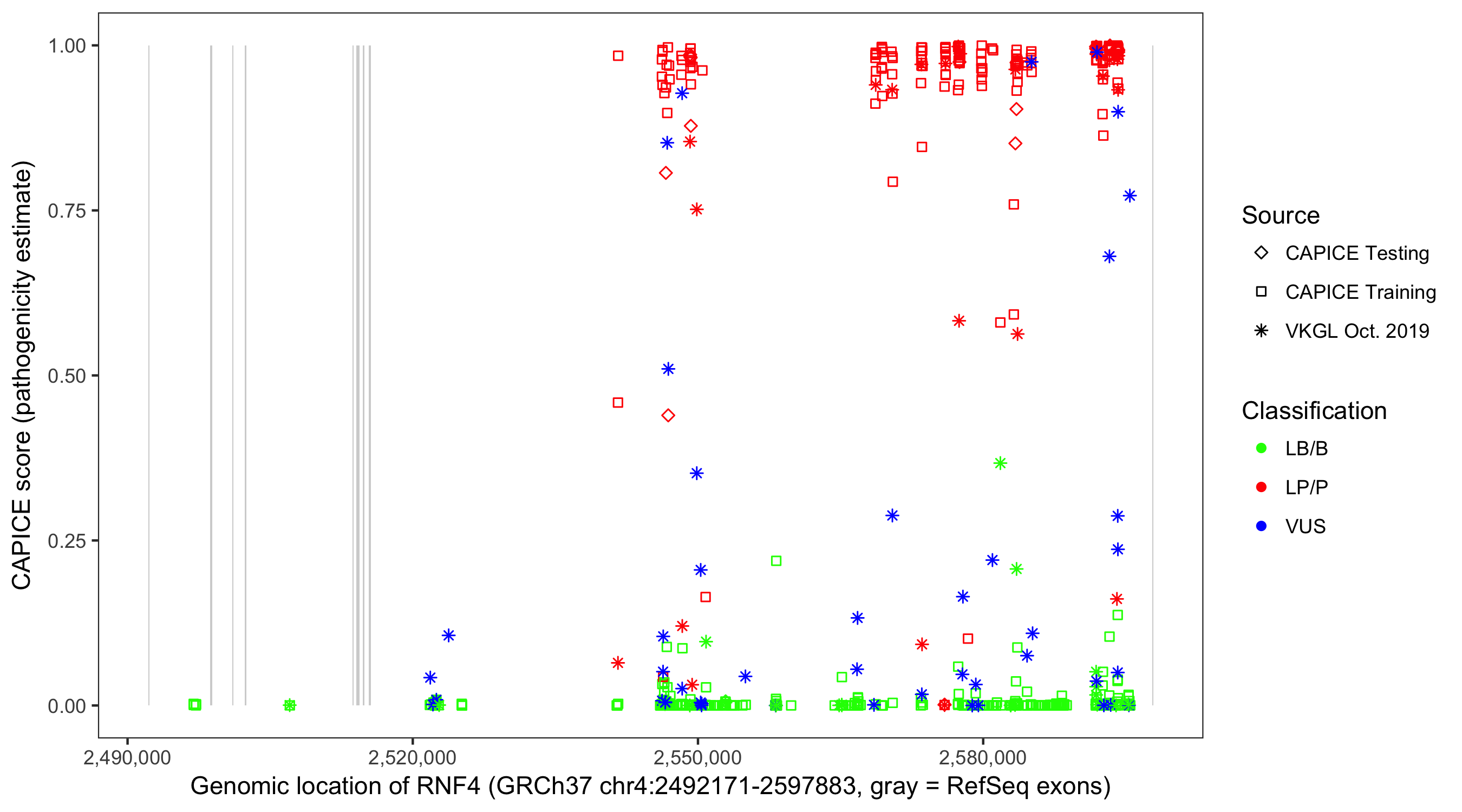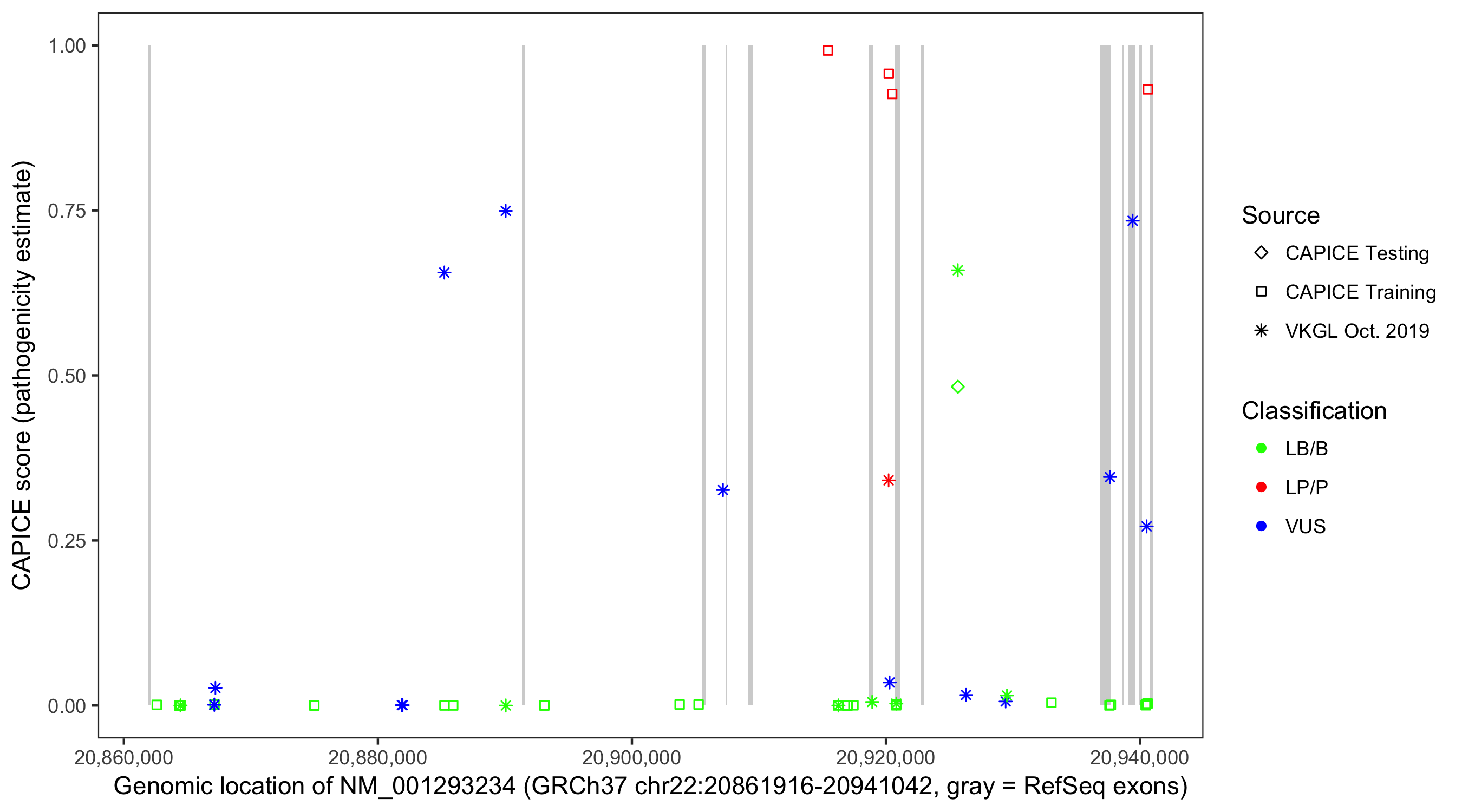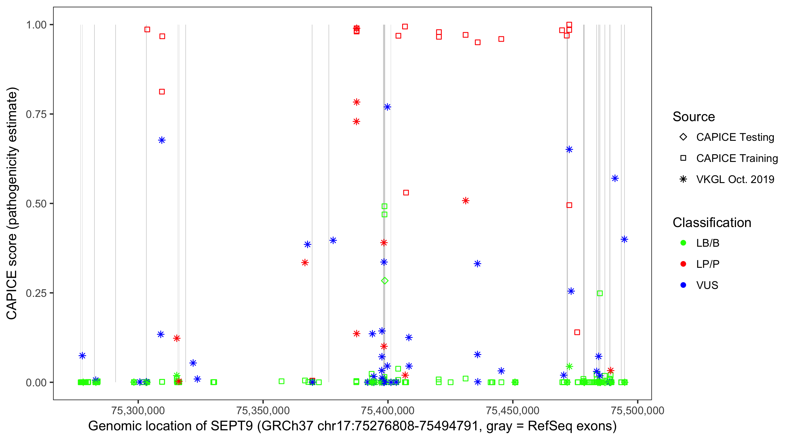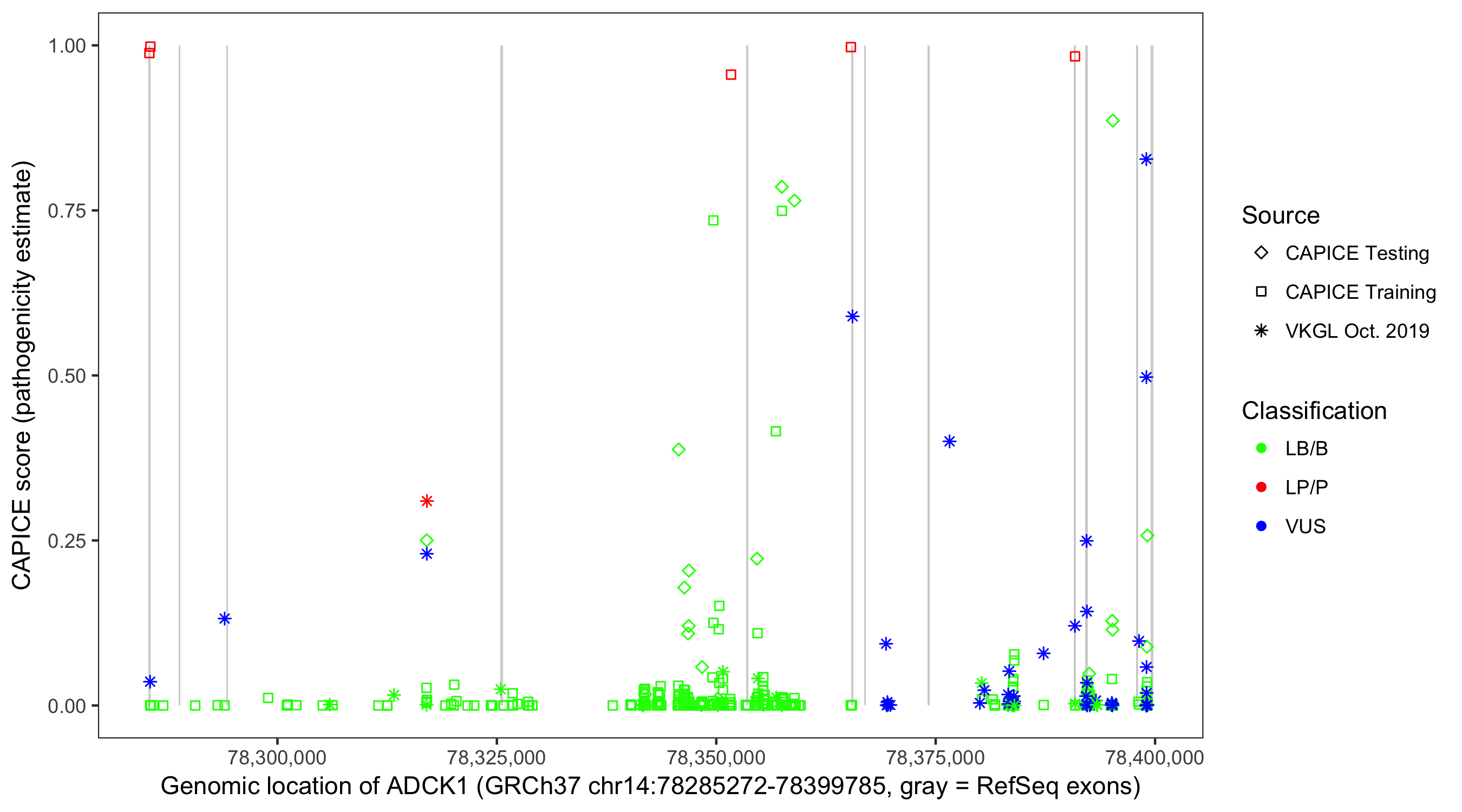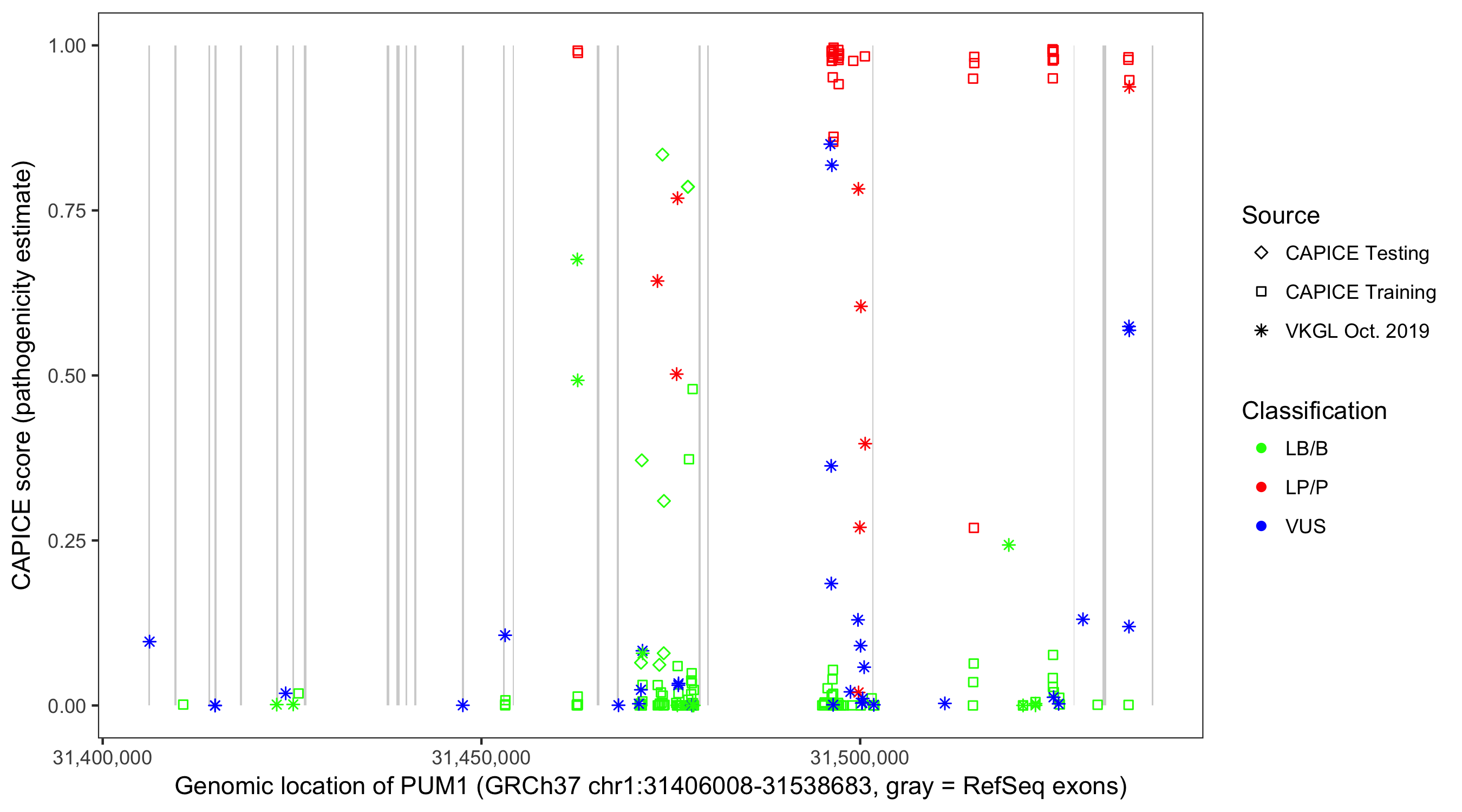 Shown are CAPICE train/test variants plus VKGL Oct 2019.
