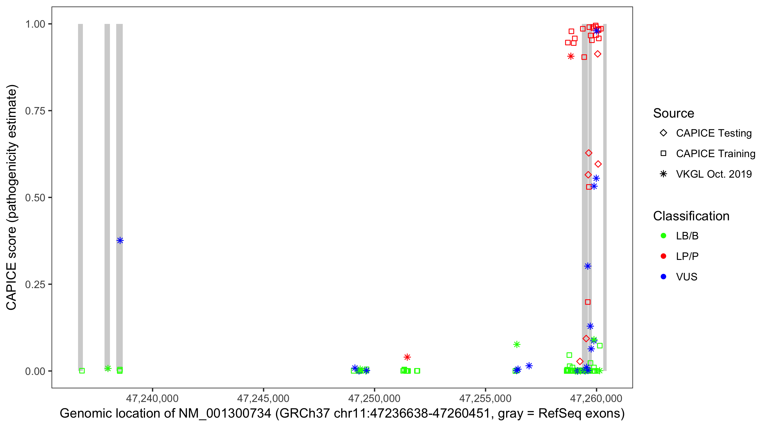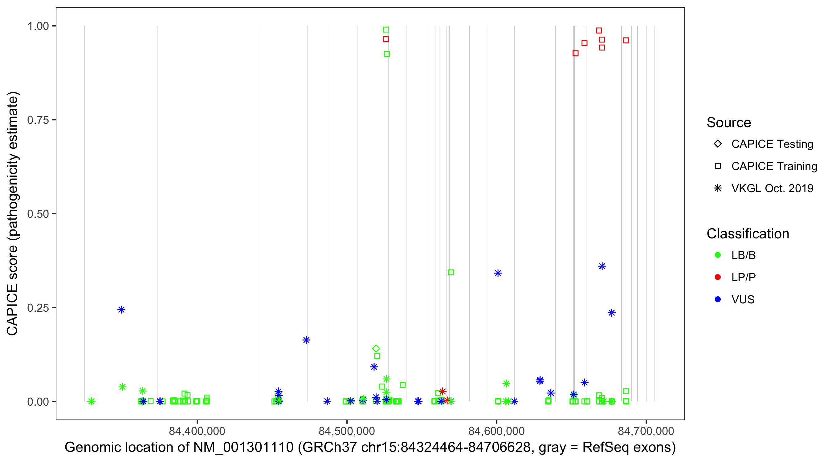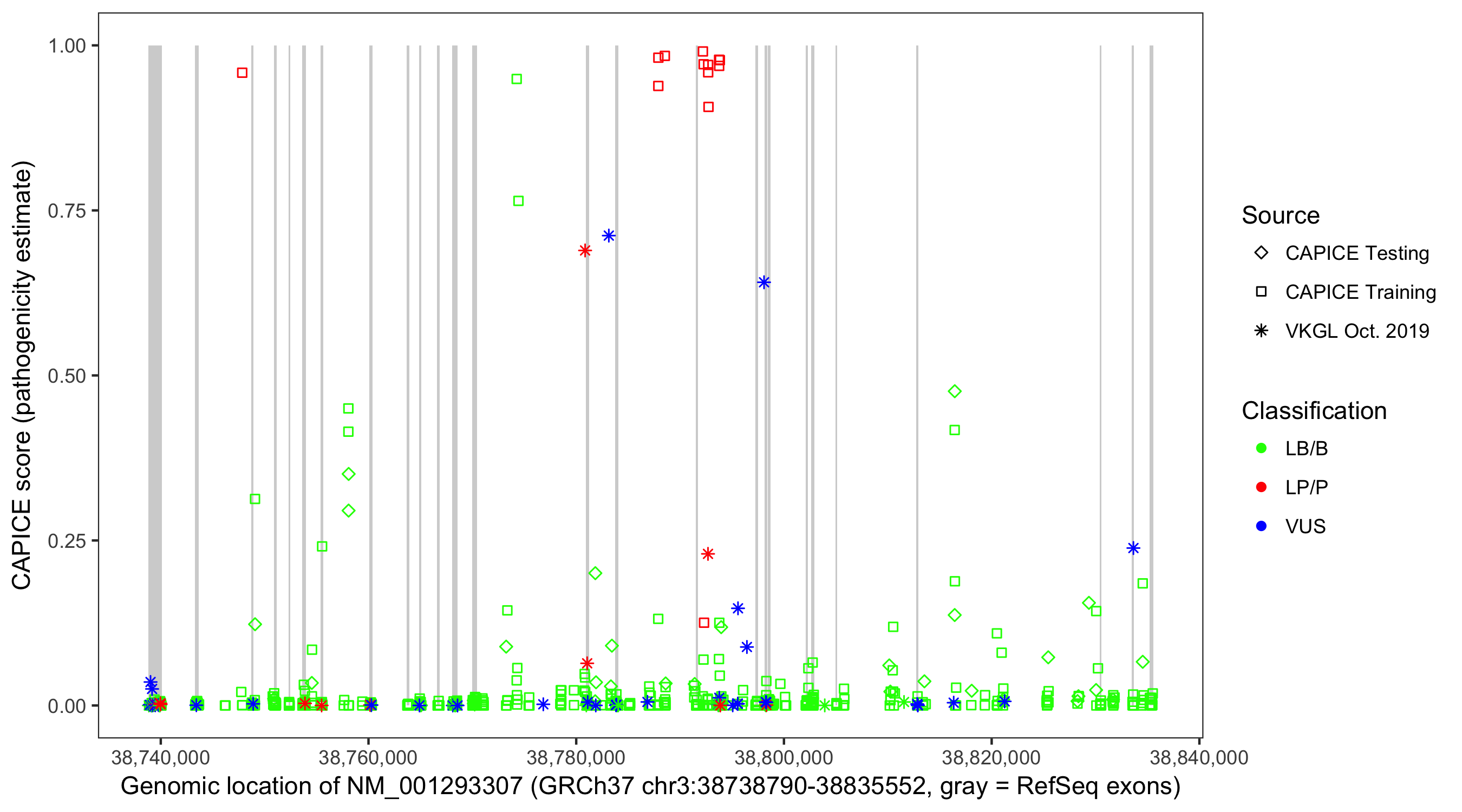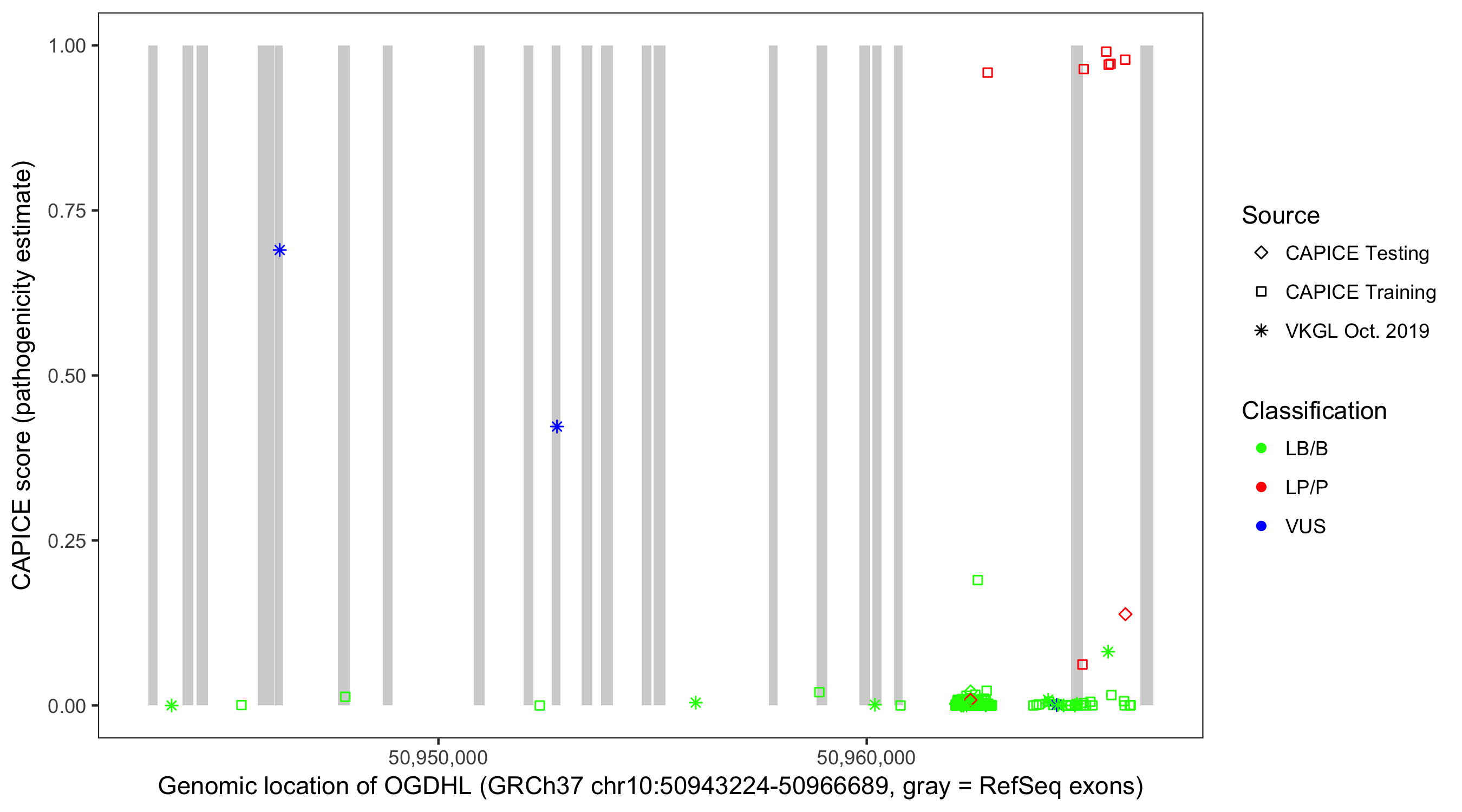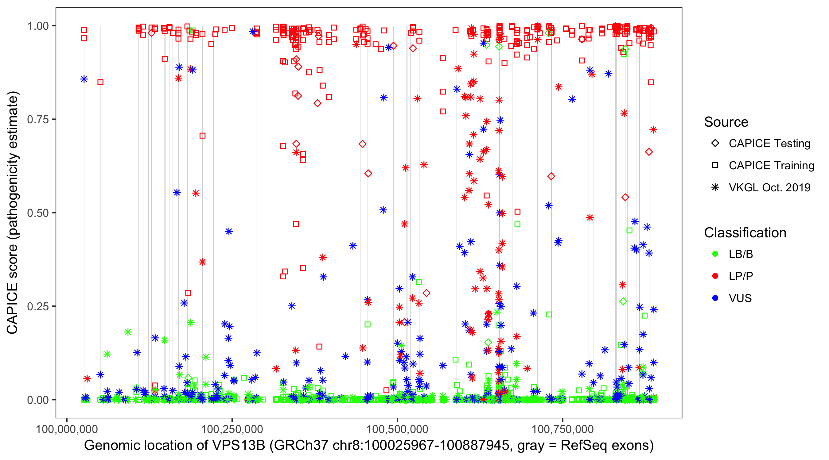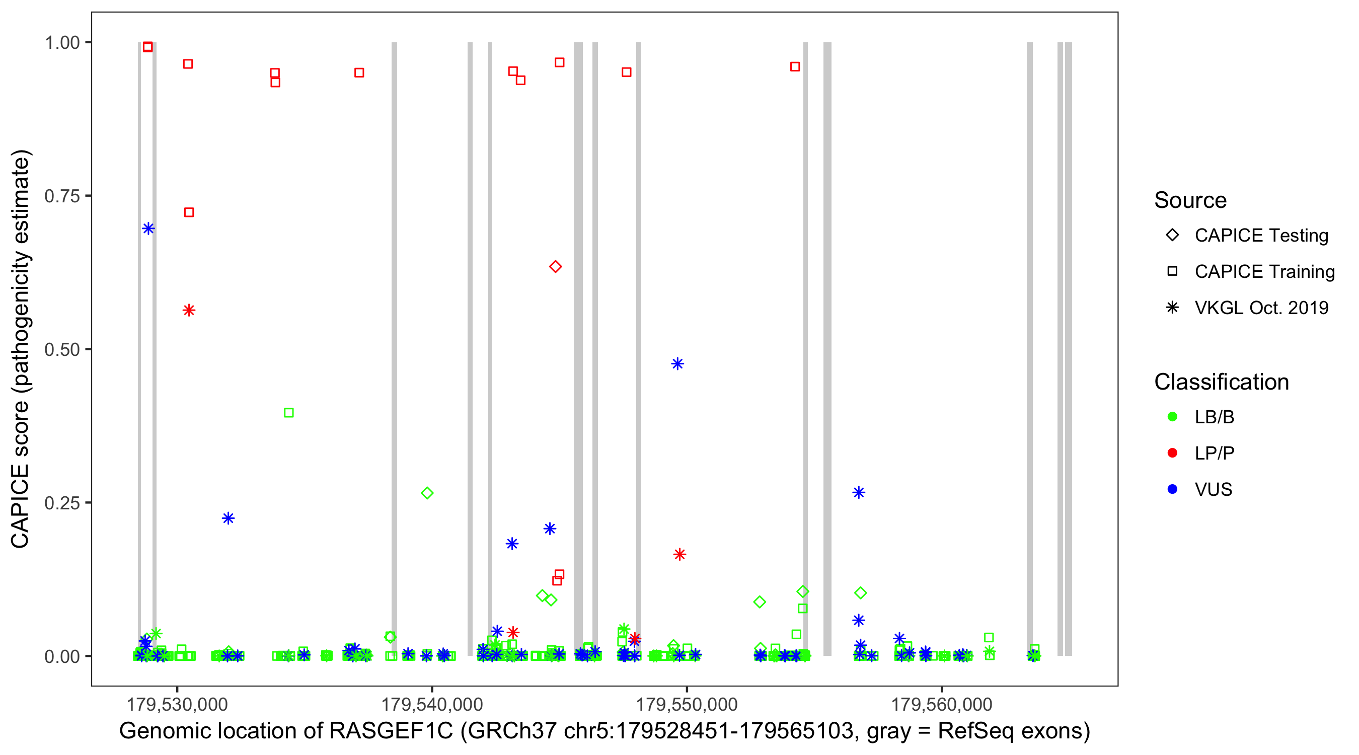 Shown are CAPICE train/test variants plus VKGL Oct 2019.