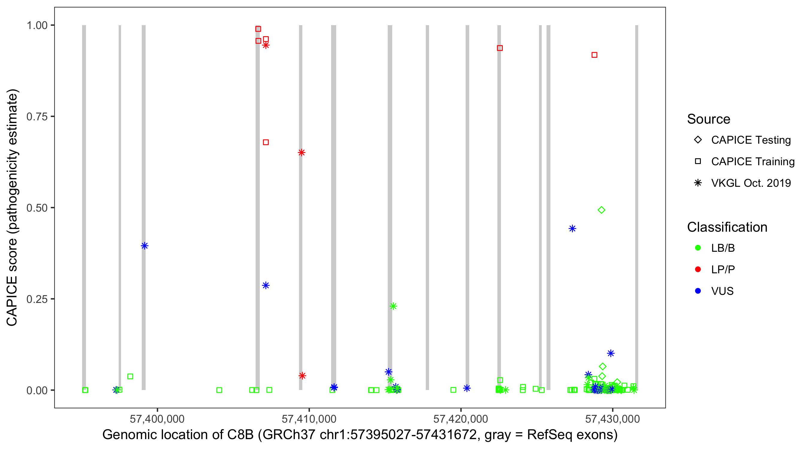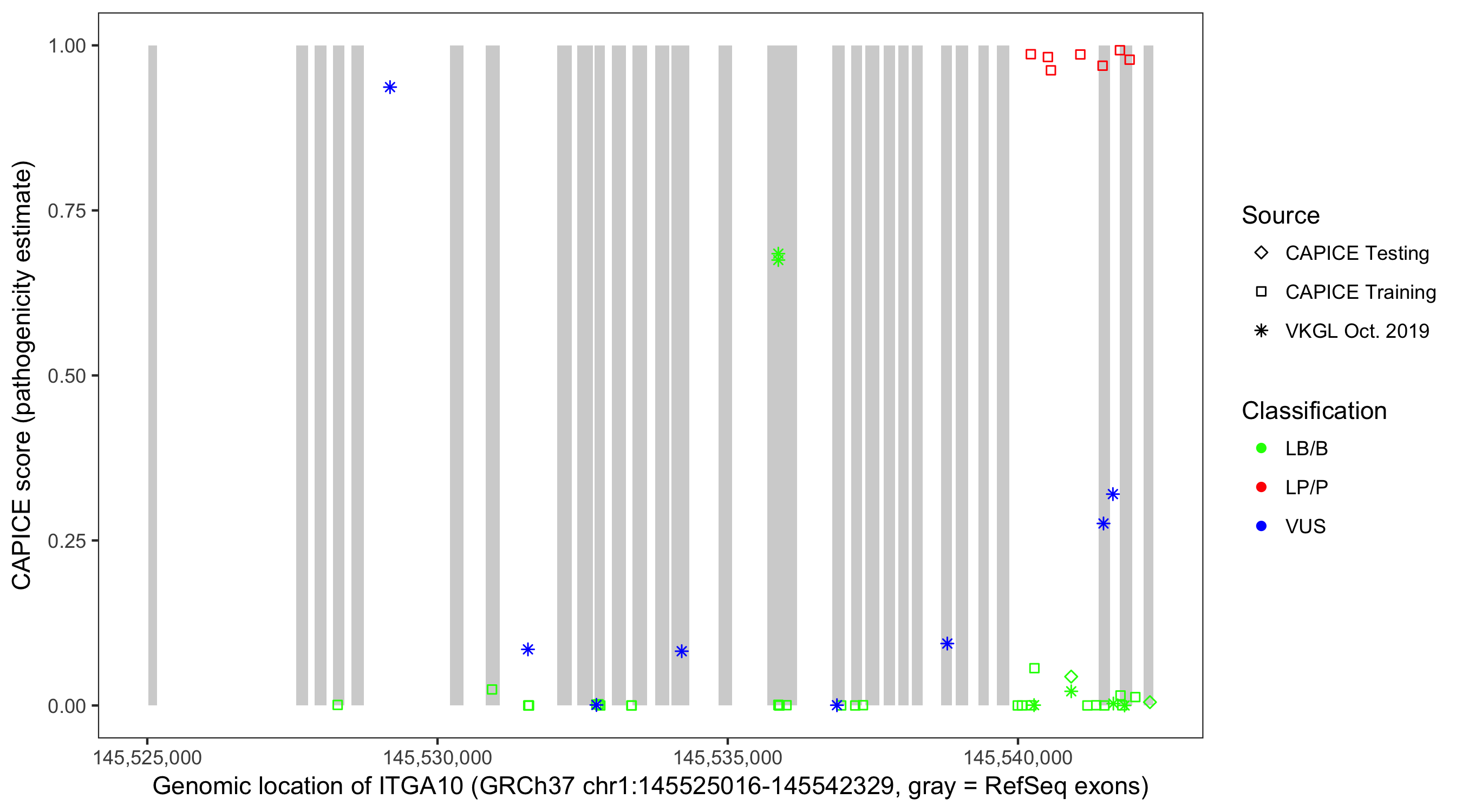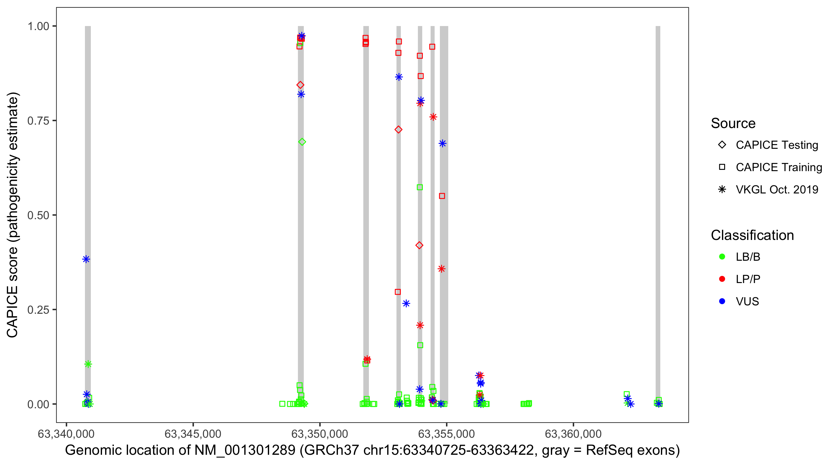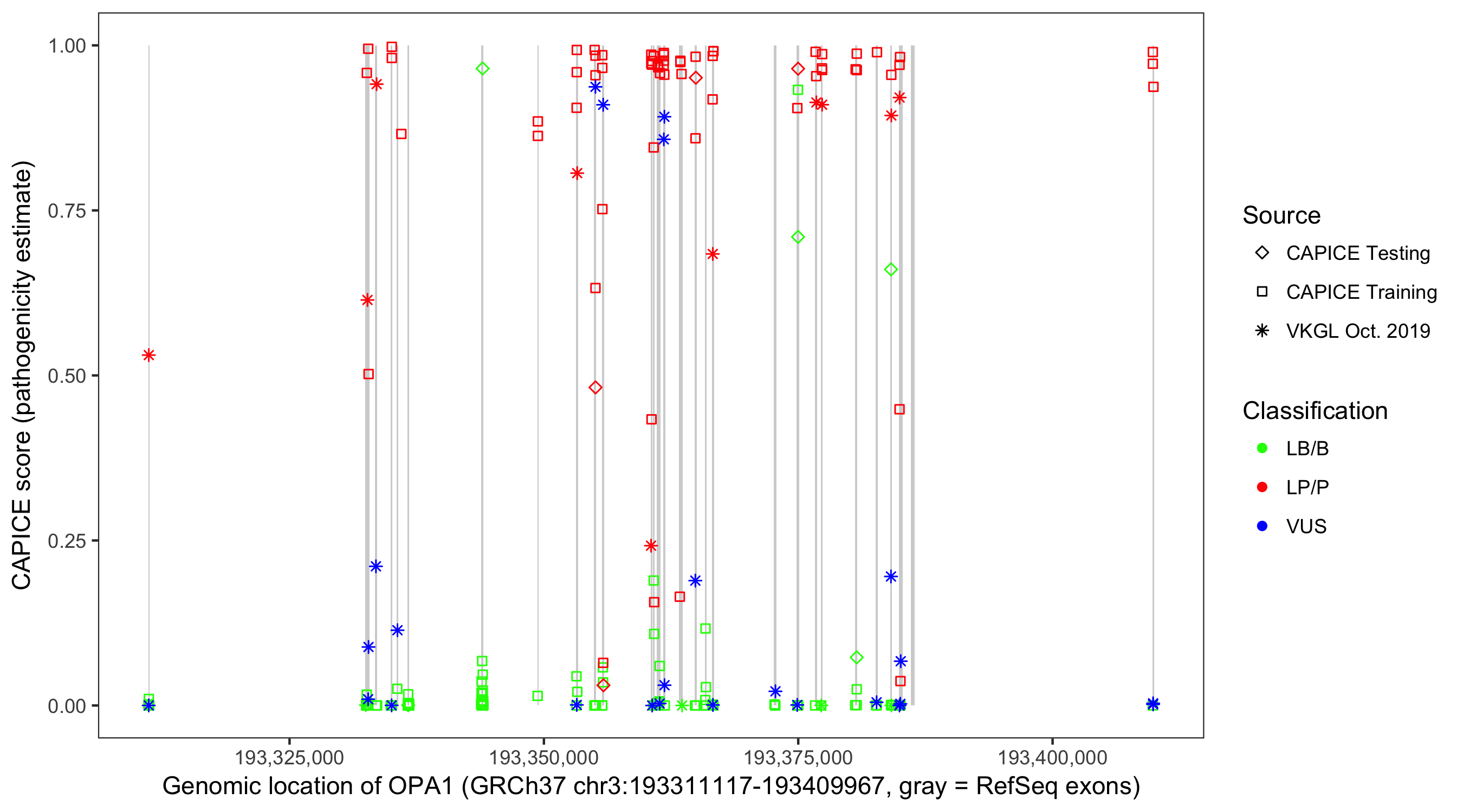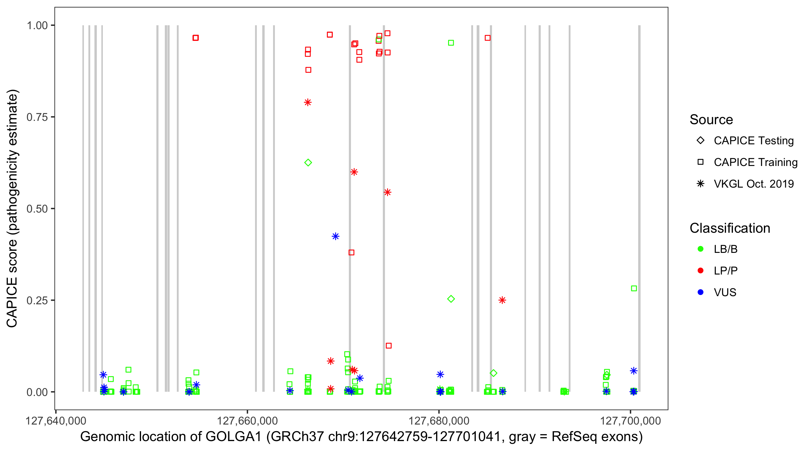 Shown are CAPICE train/test variants plus VKGL Oct 2019.