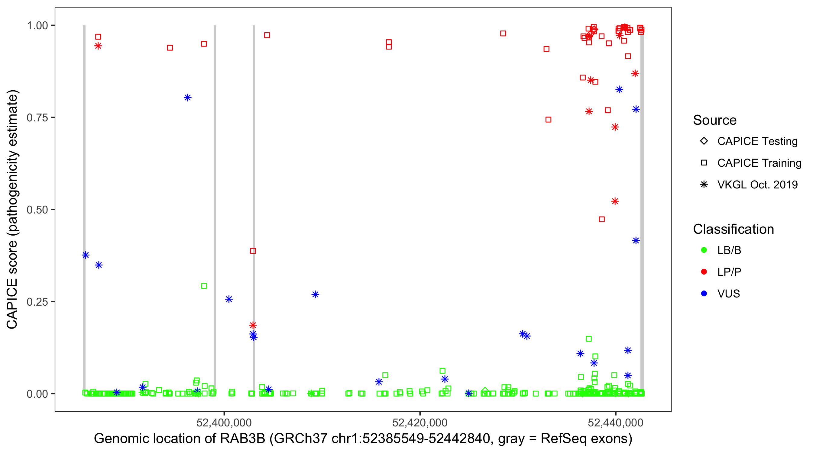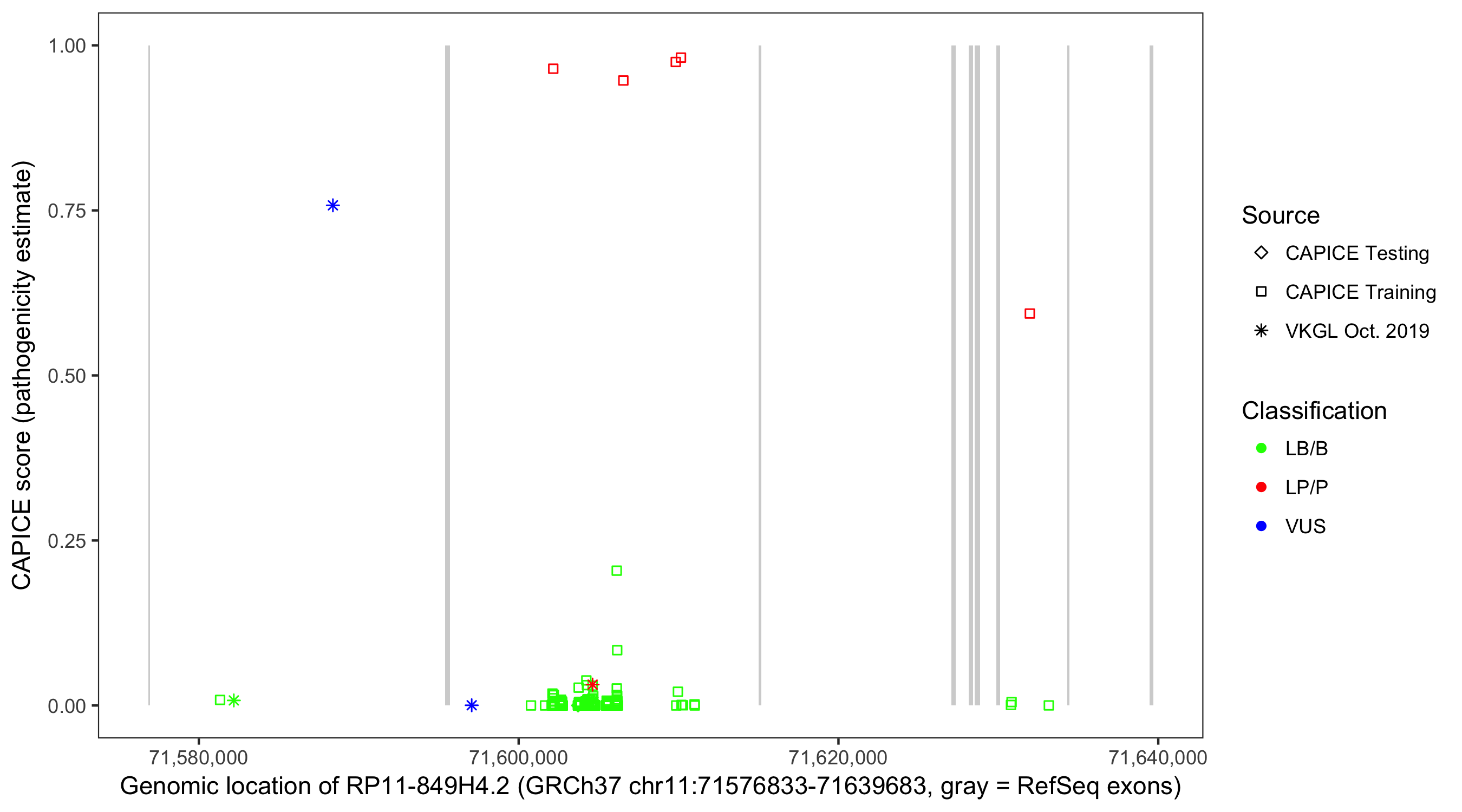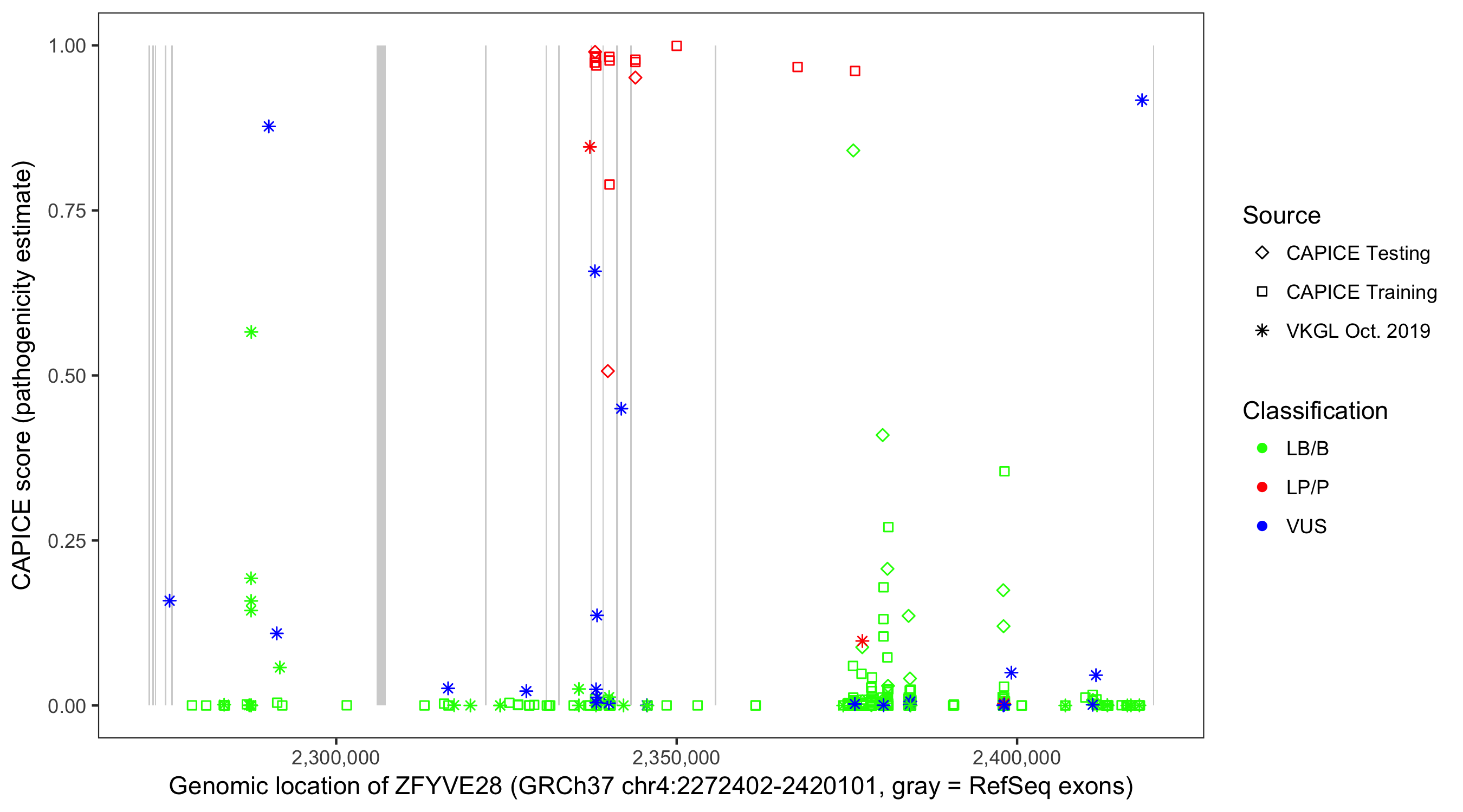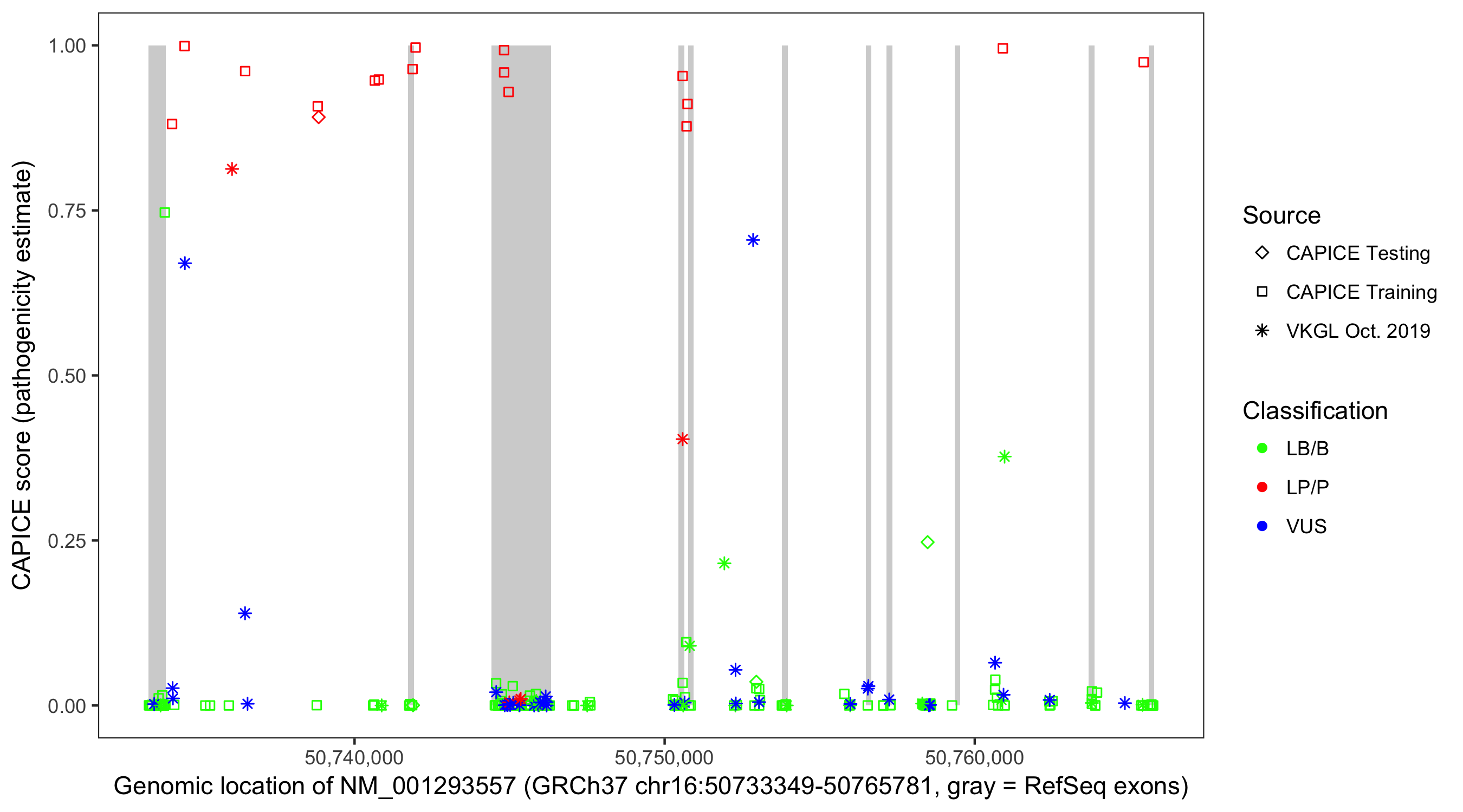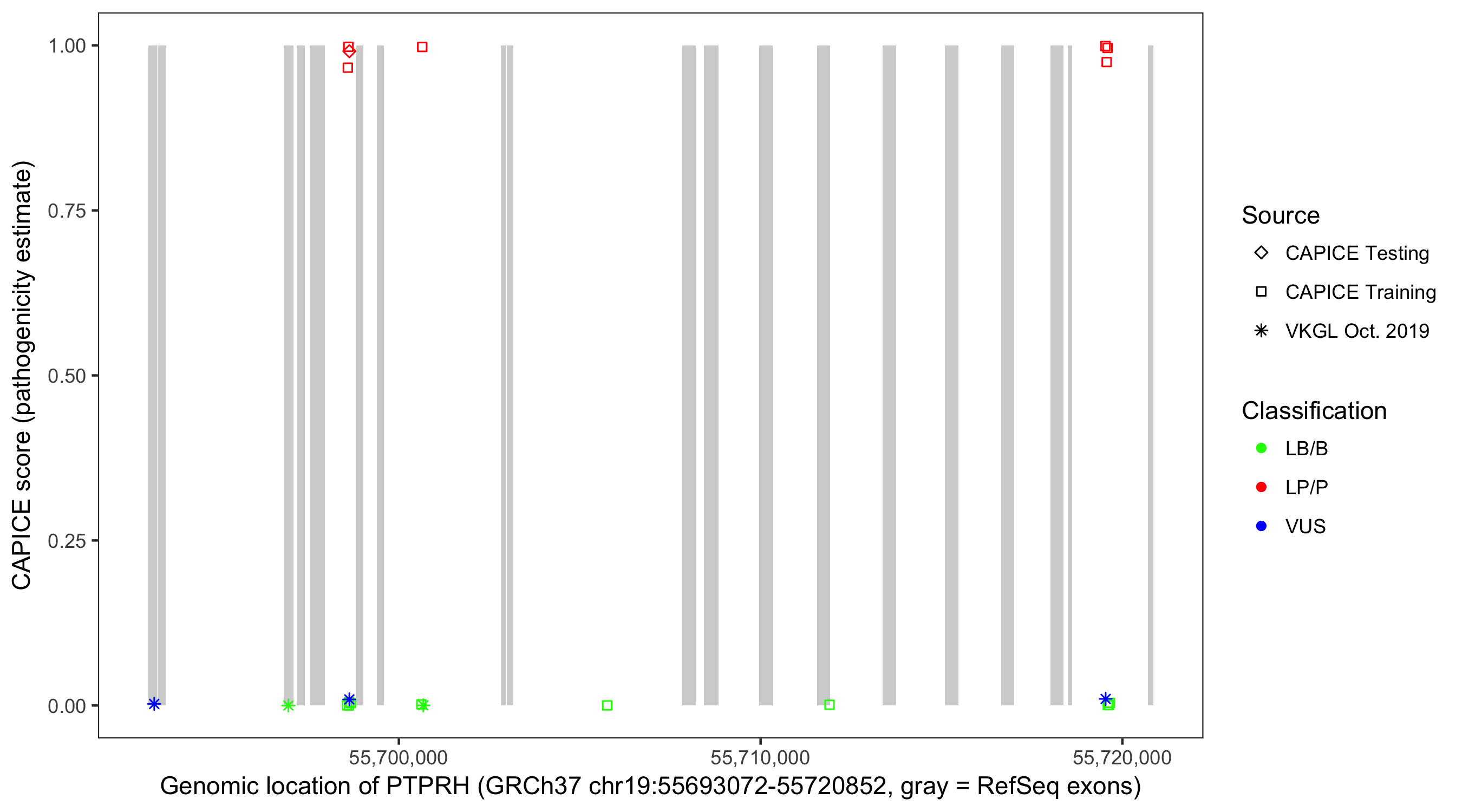 Shown are CAPICE train/test variants plus VKGL Oct 2019.