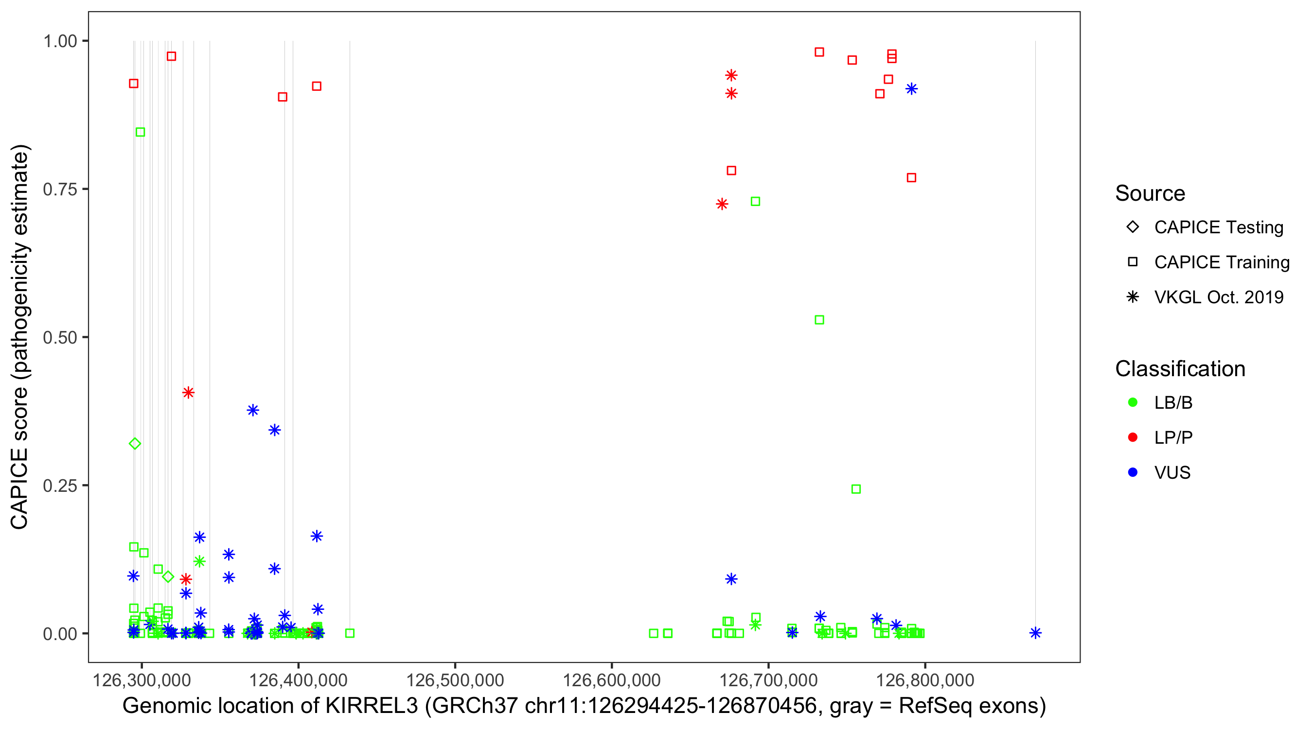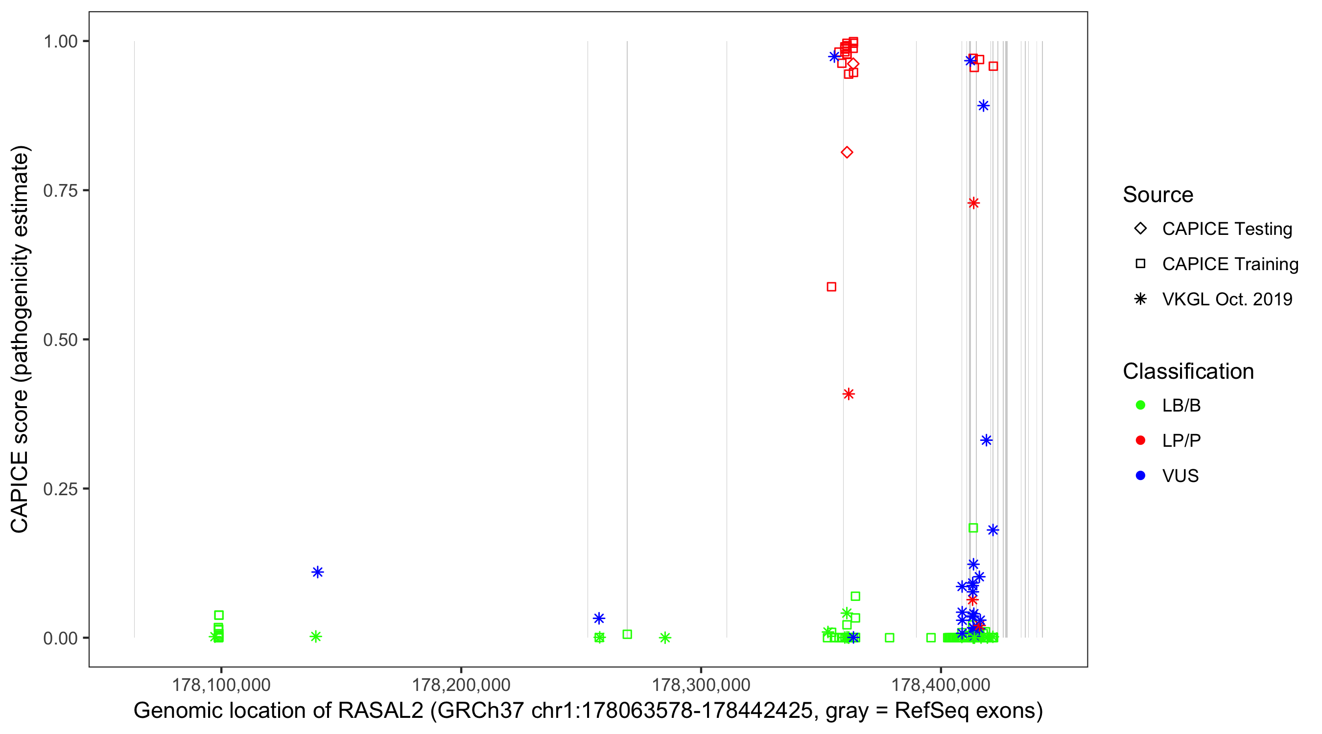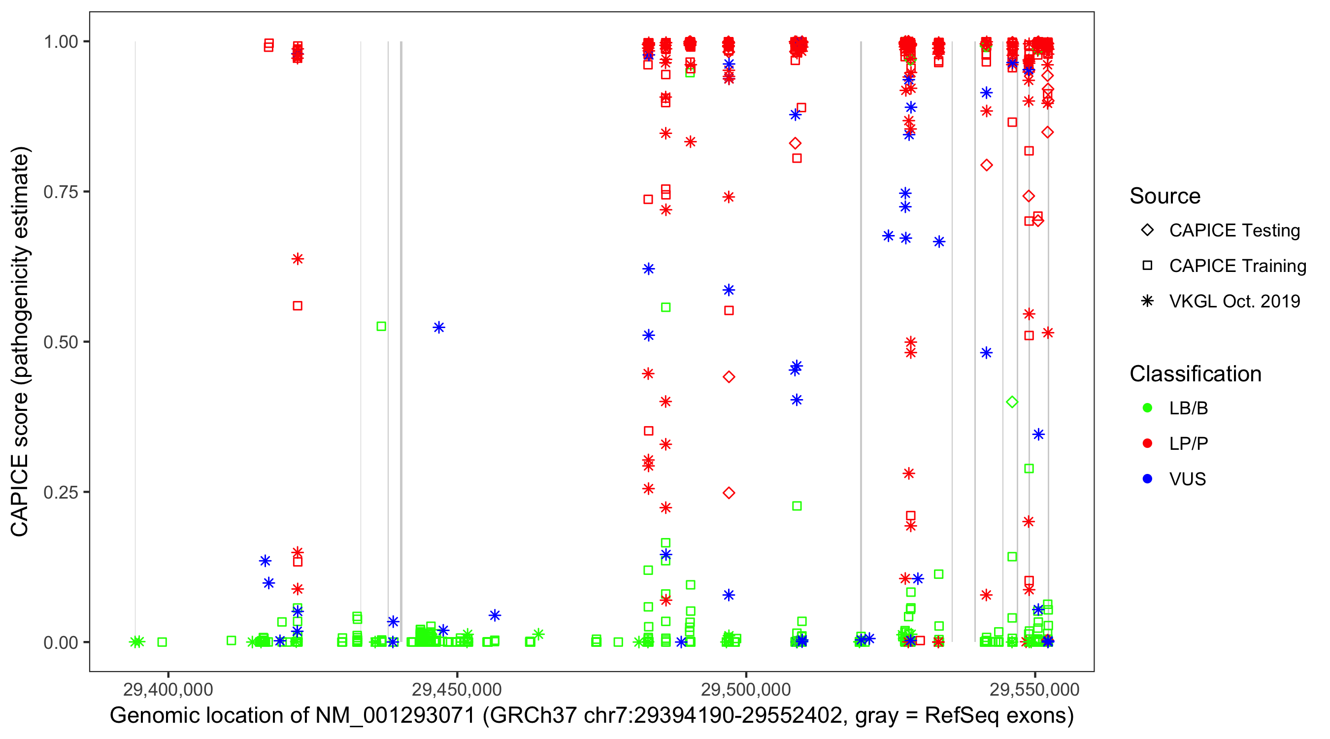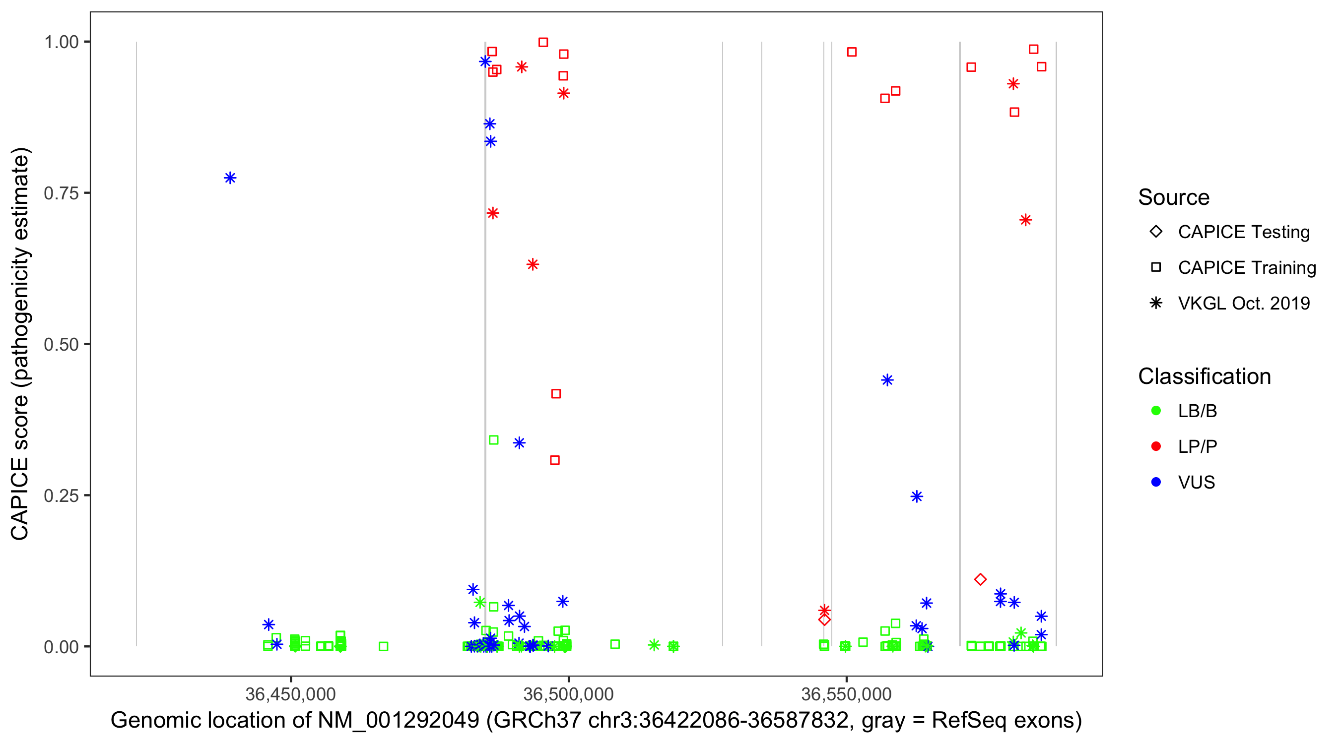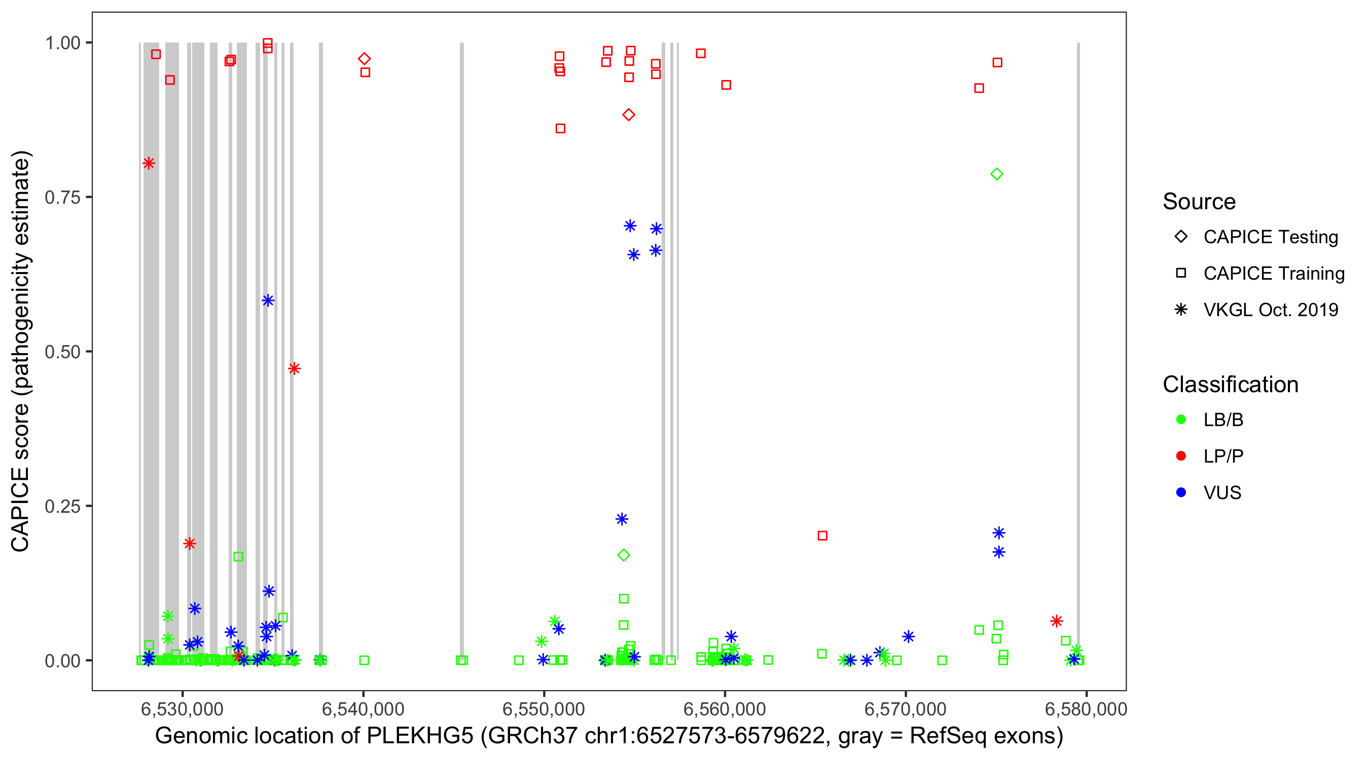 Shown are CAPICE train/test variants plus VKGL Oct 2019.