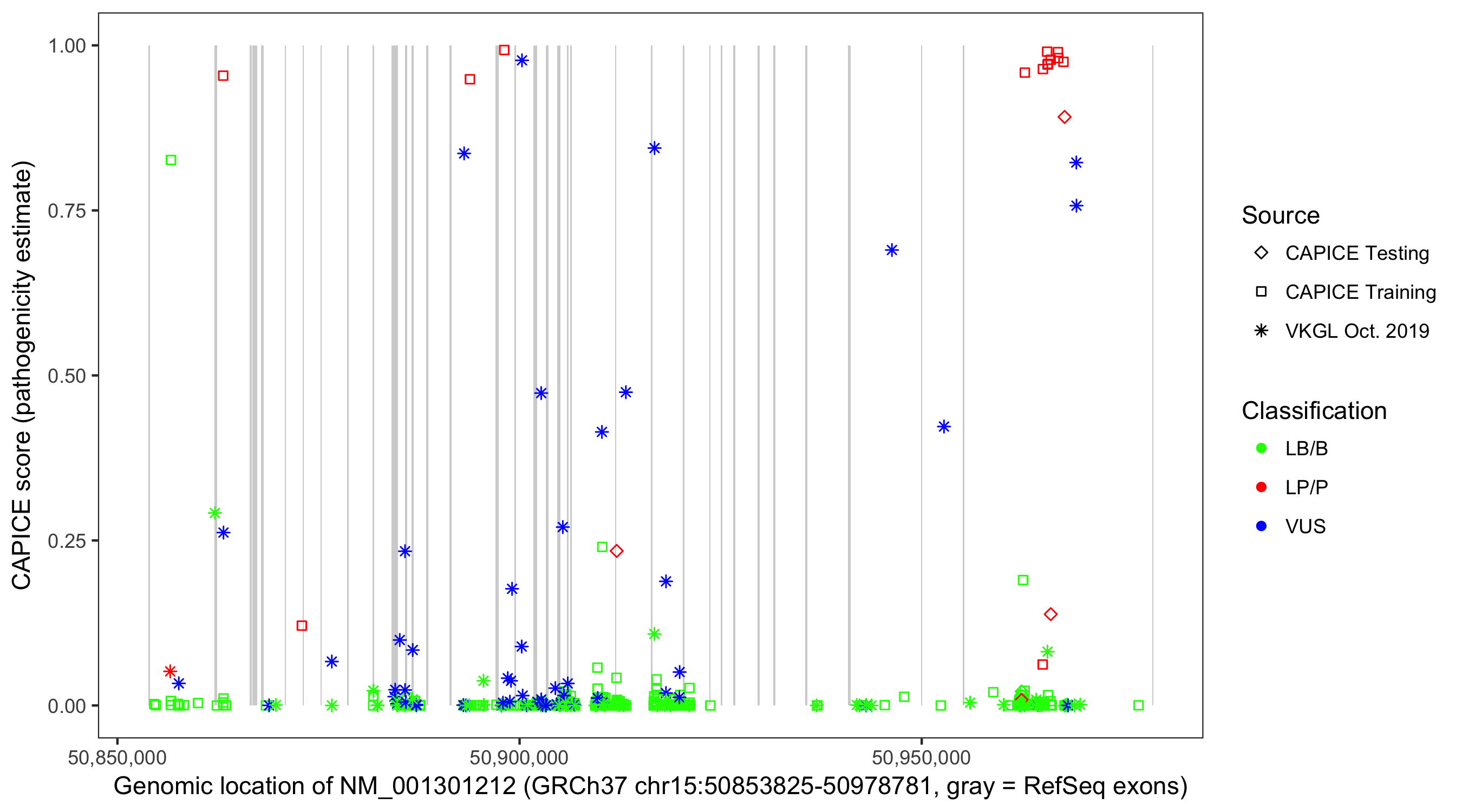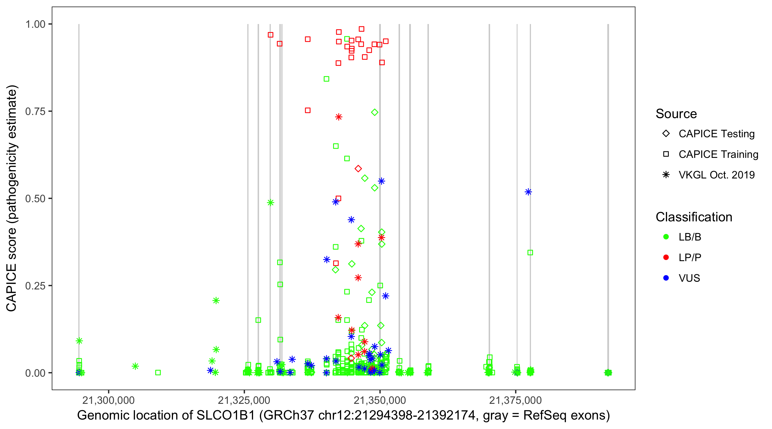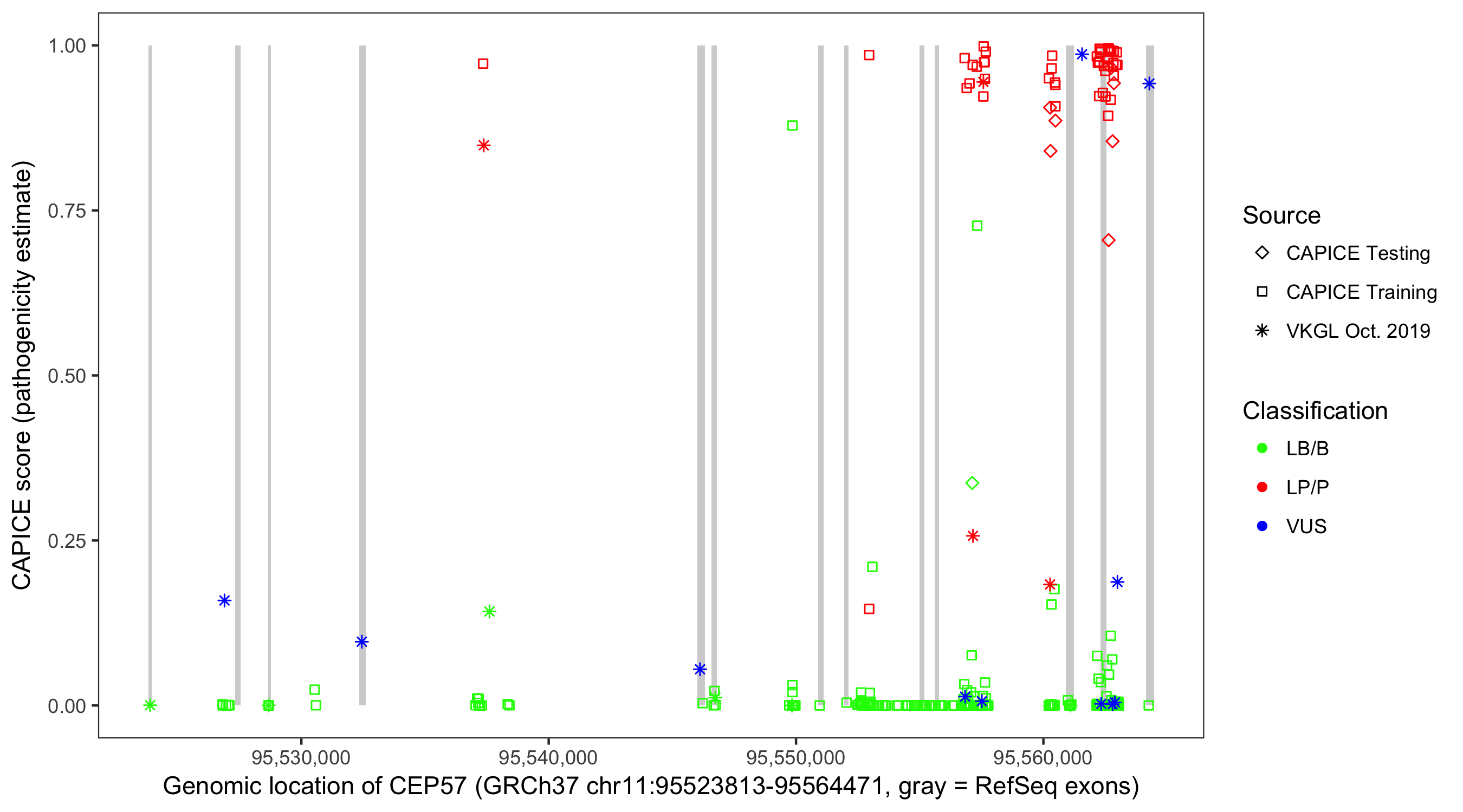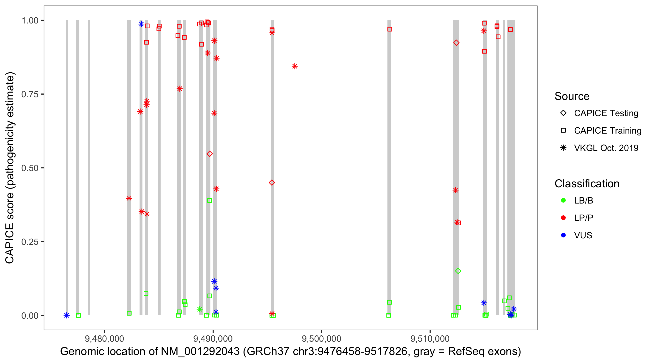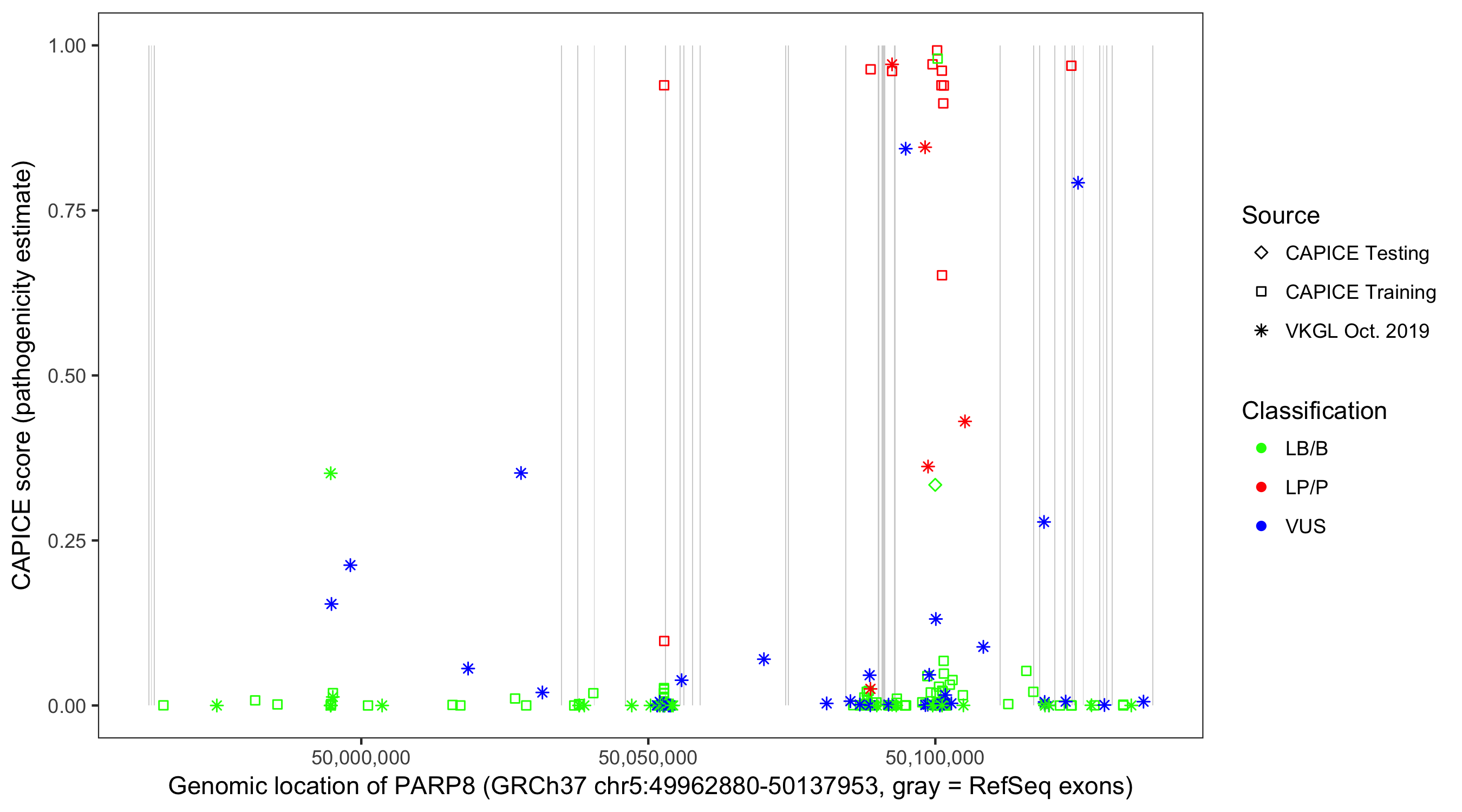 Shown are CAPICE train/test variants plus VKGL Oct 2019.