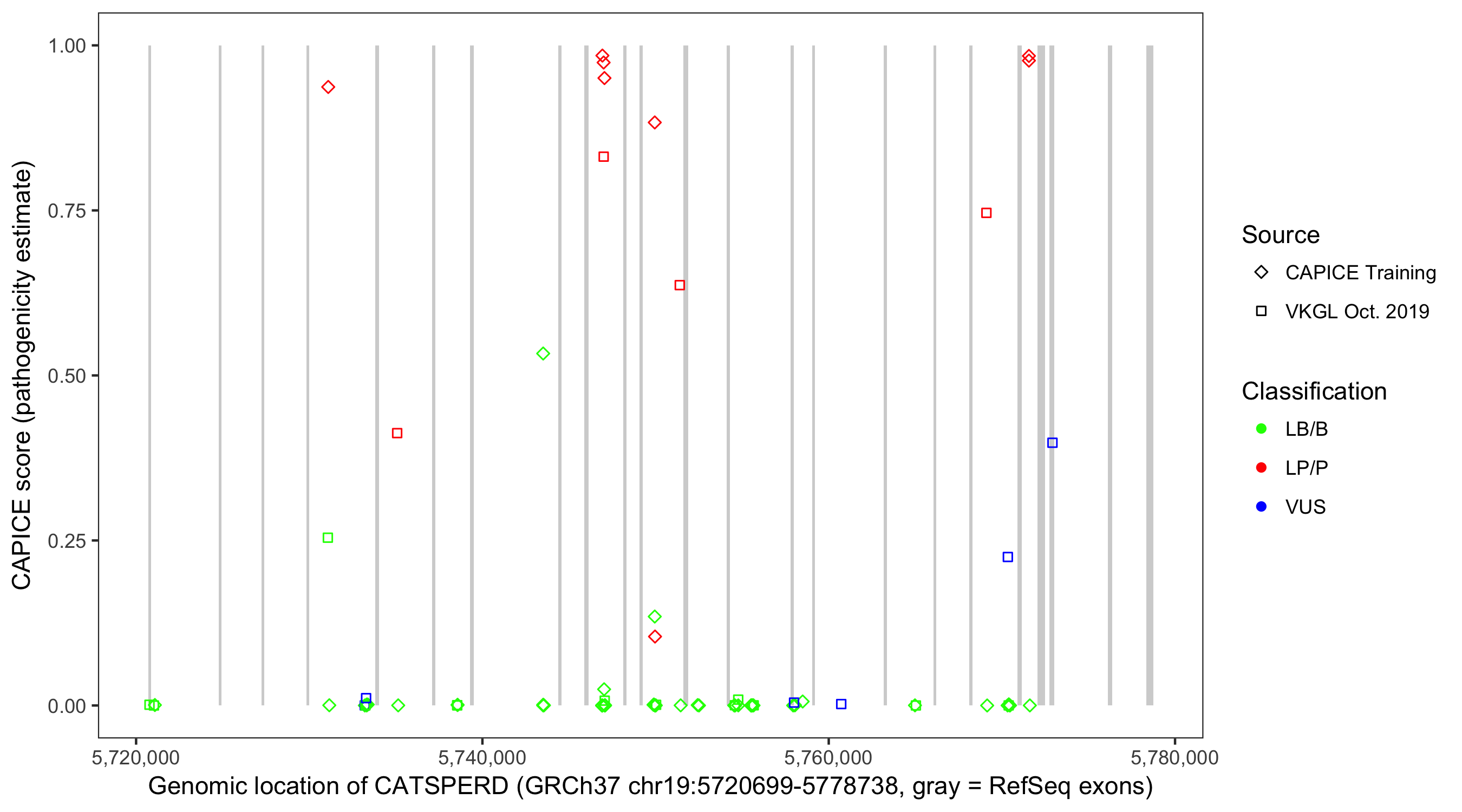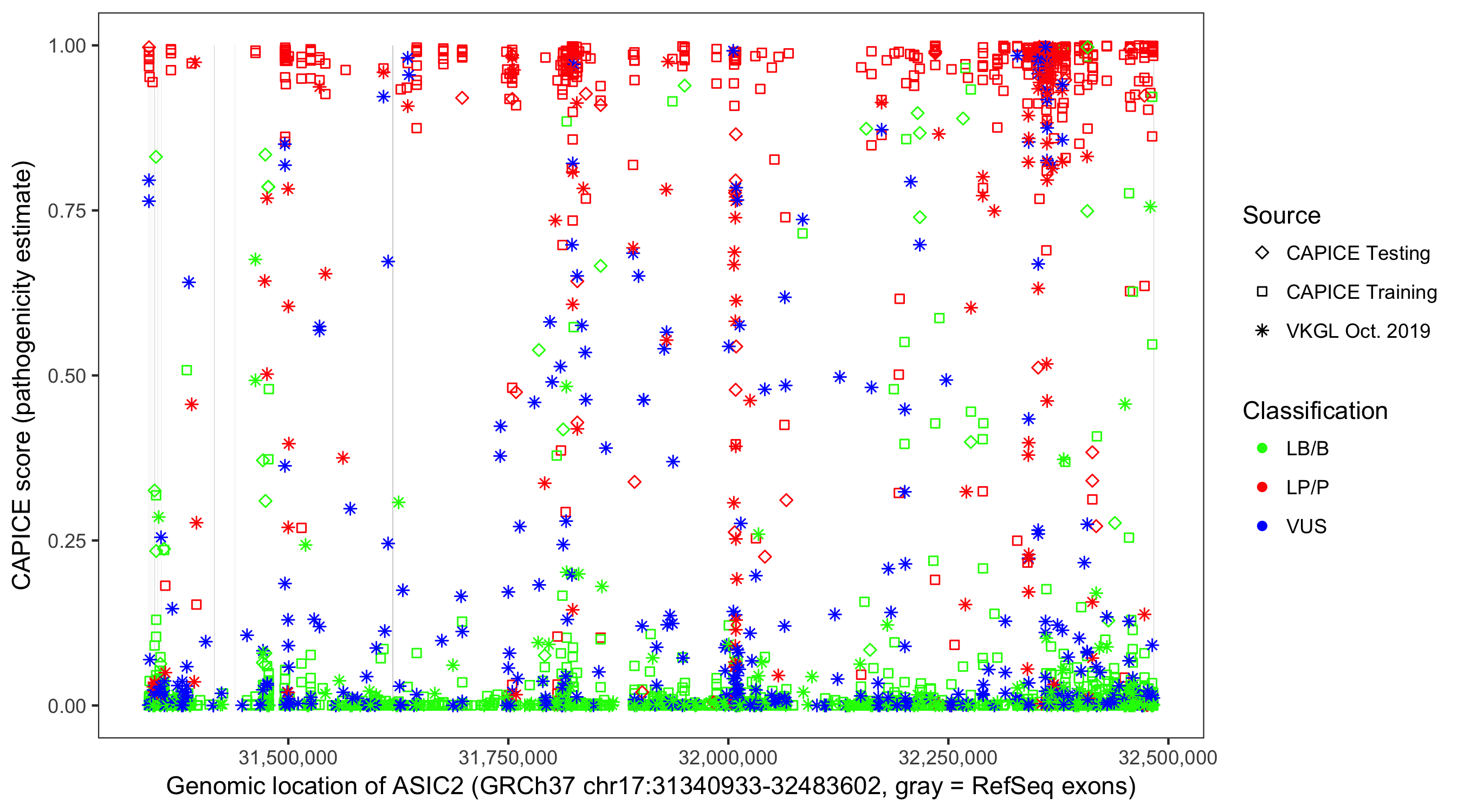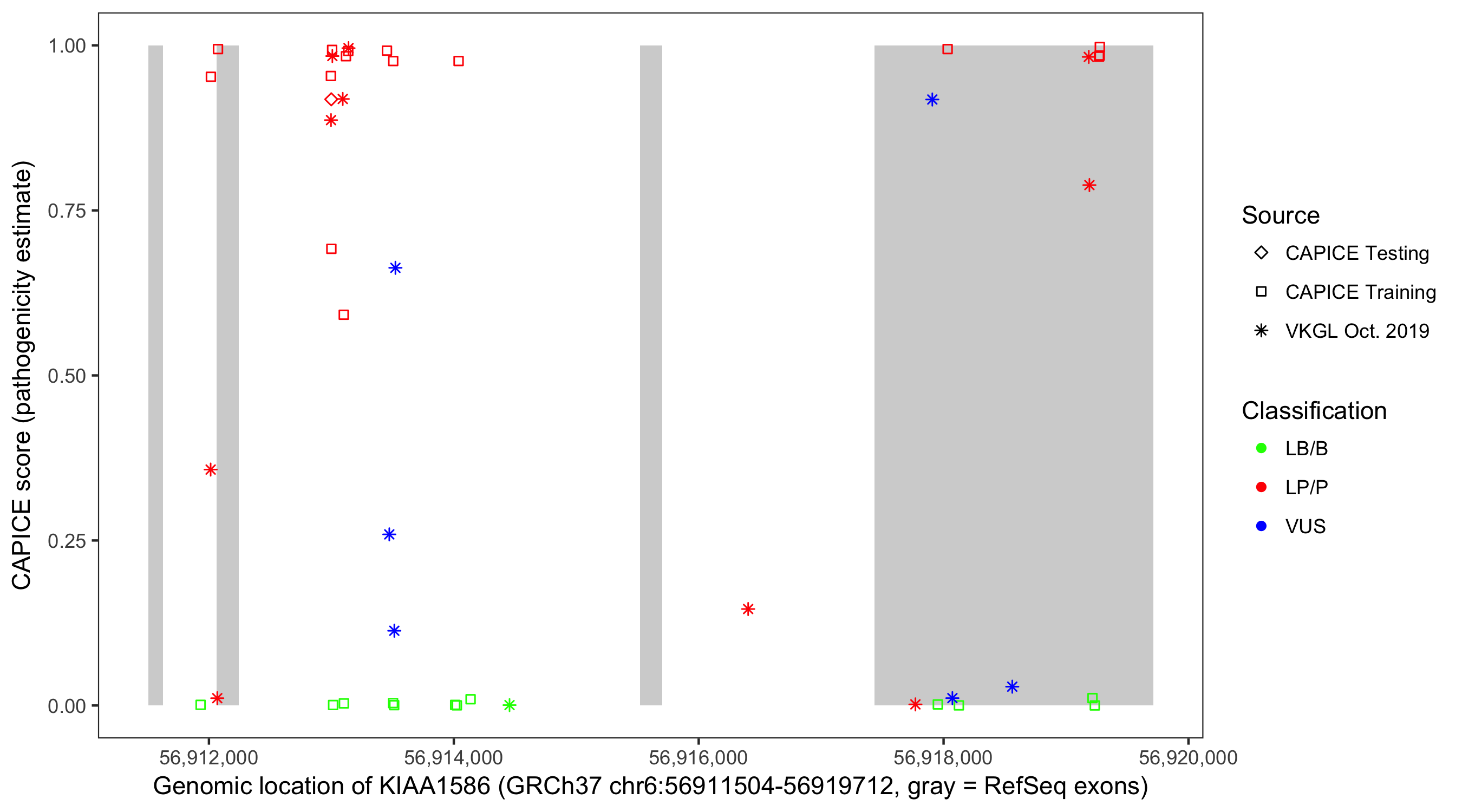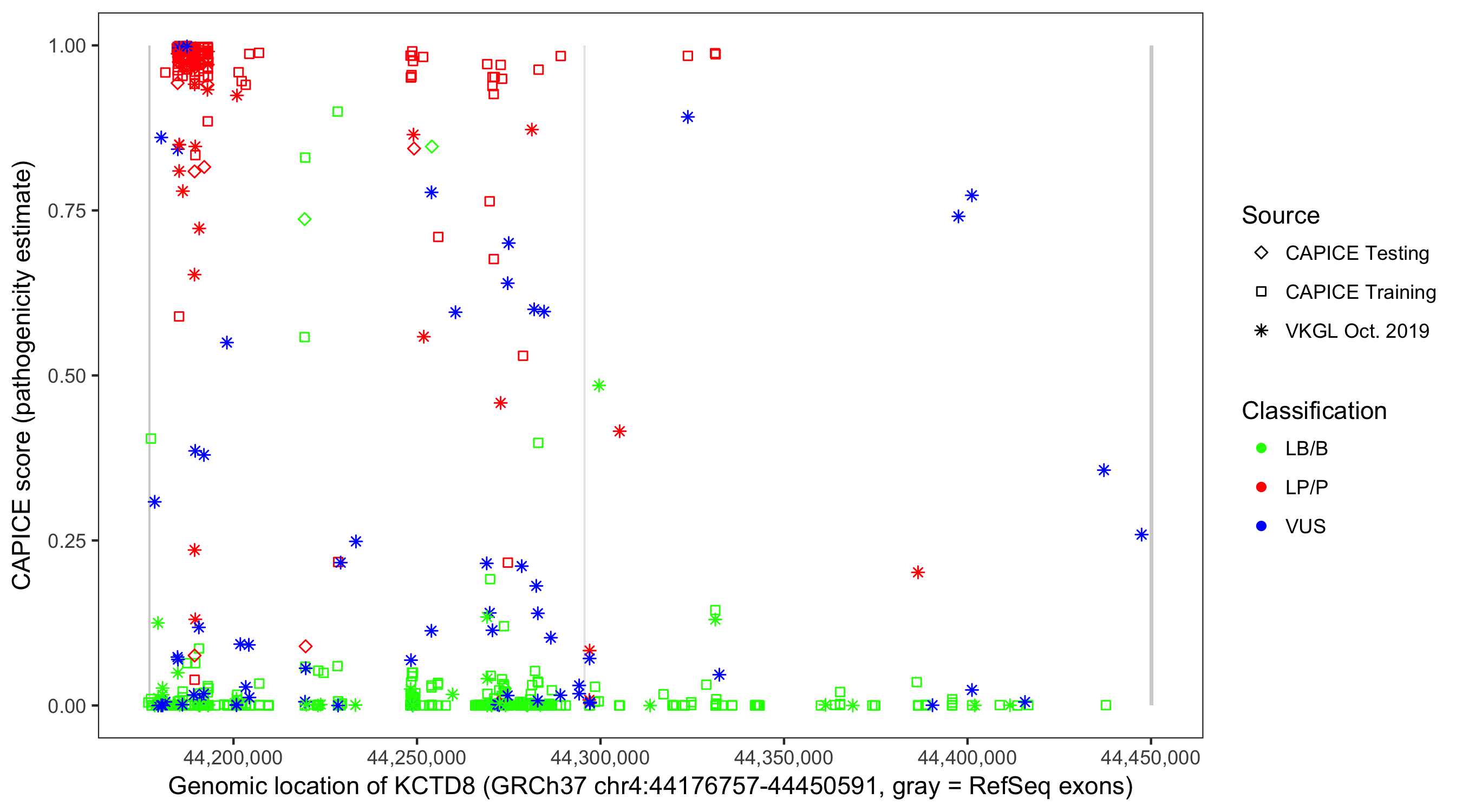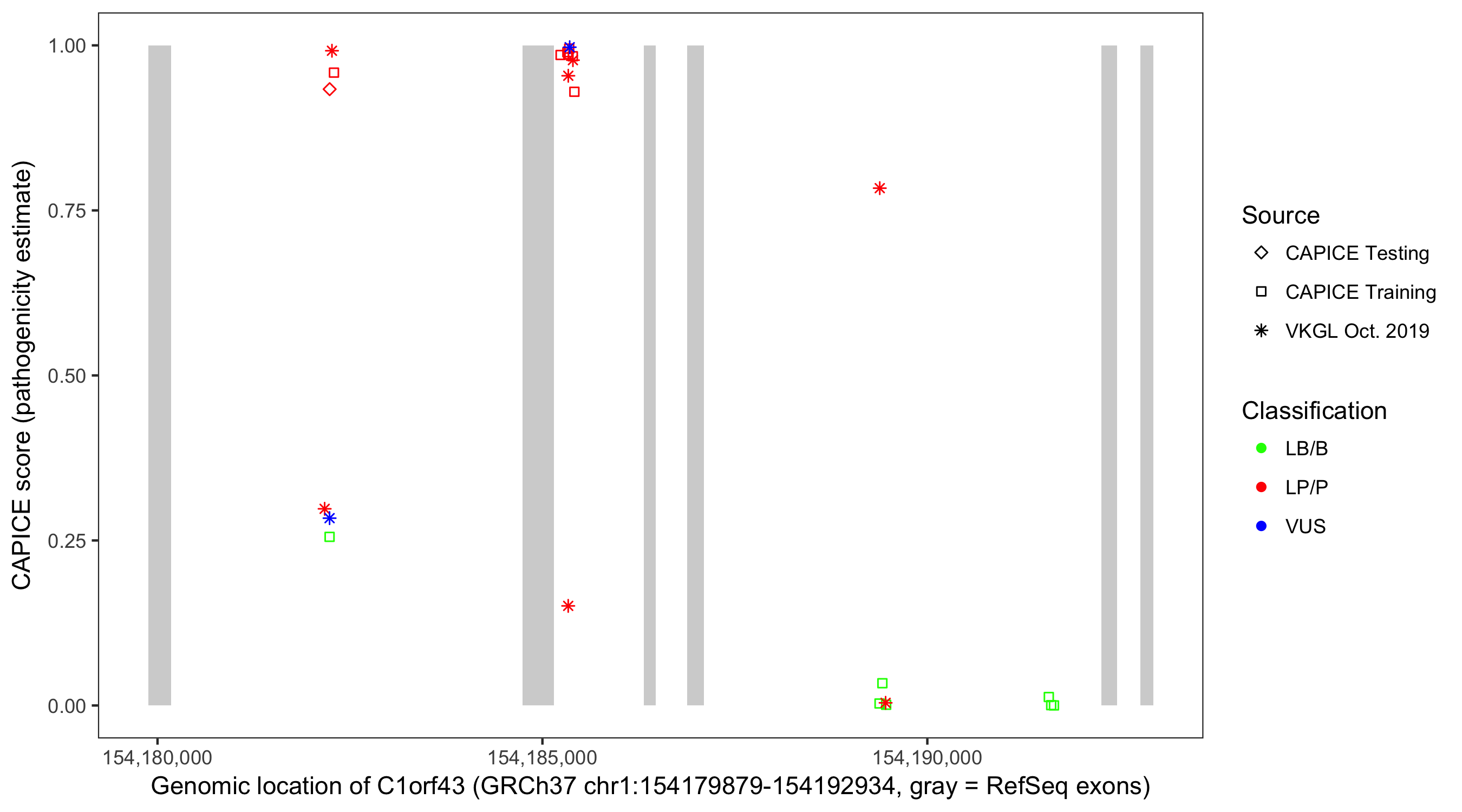 Shown are CAPICE train/test variants plus VKGL Oct 2019.