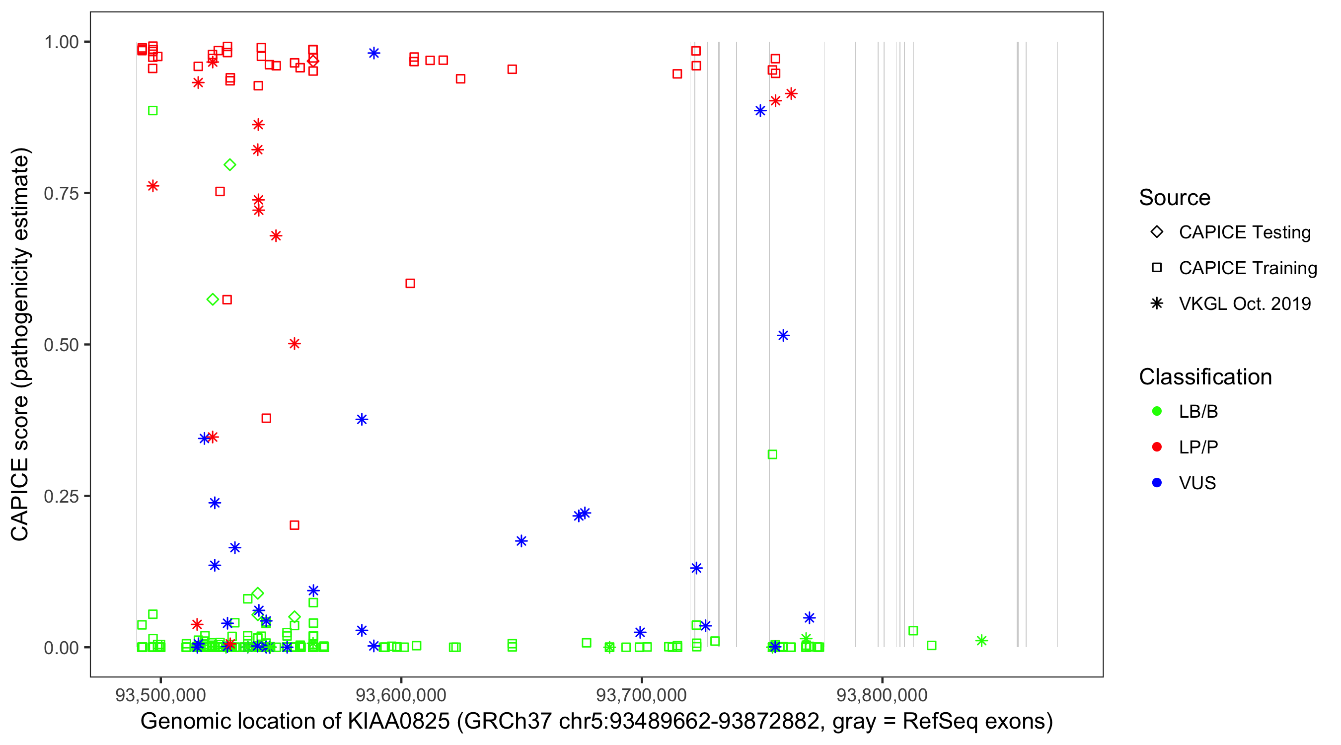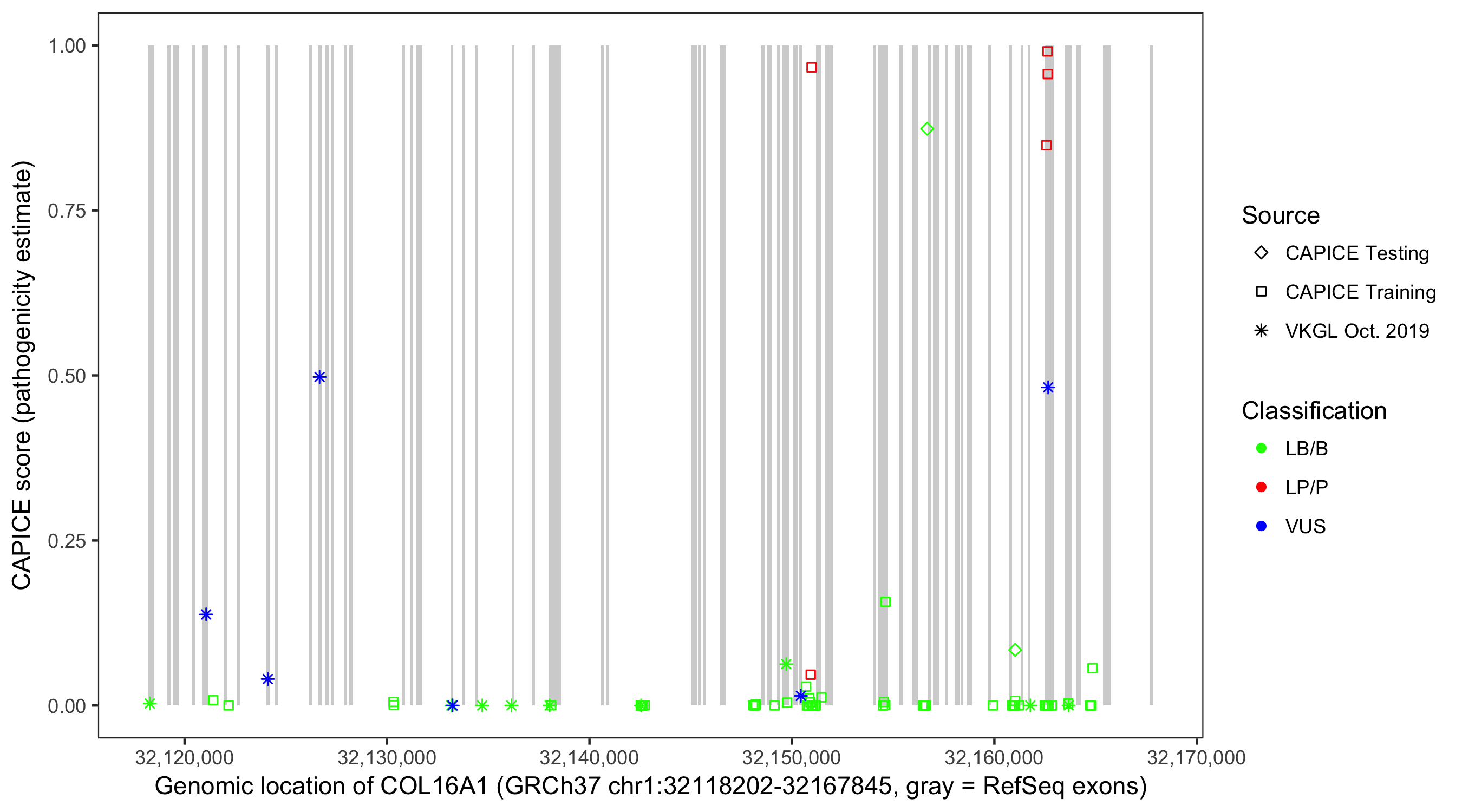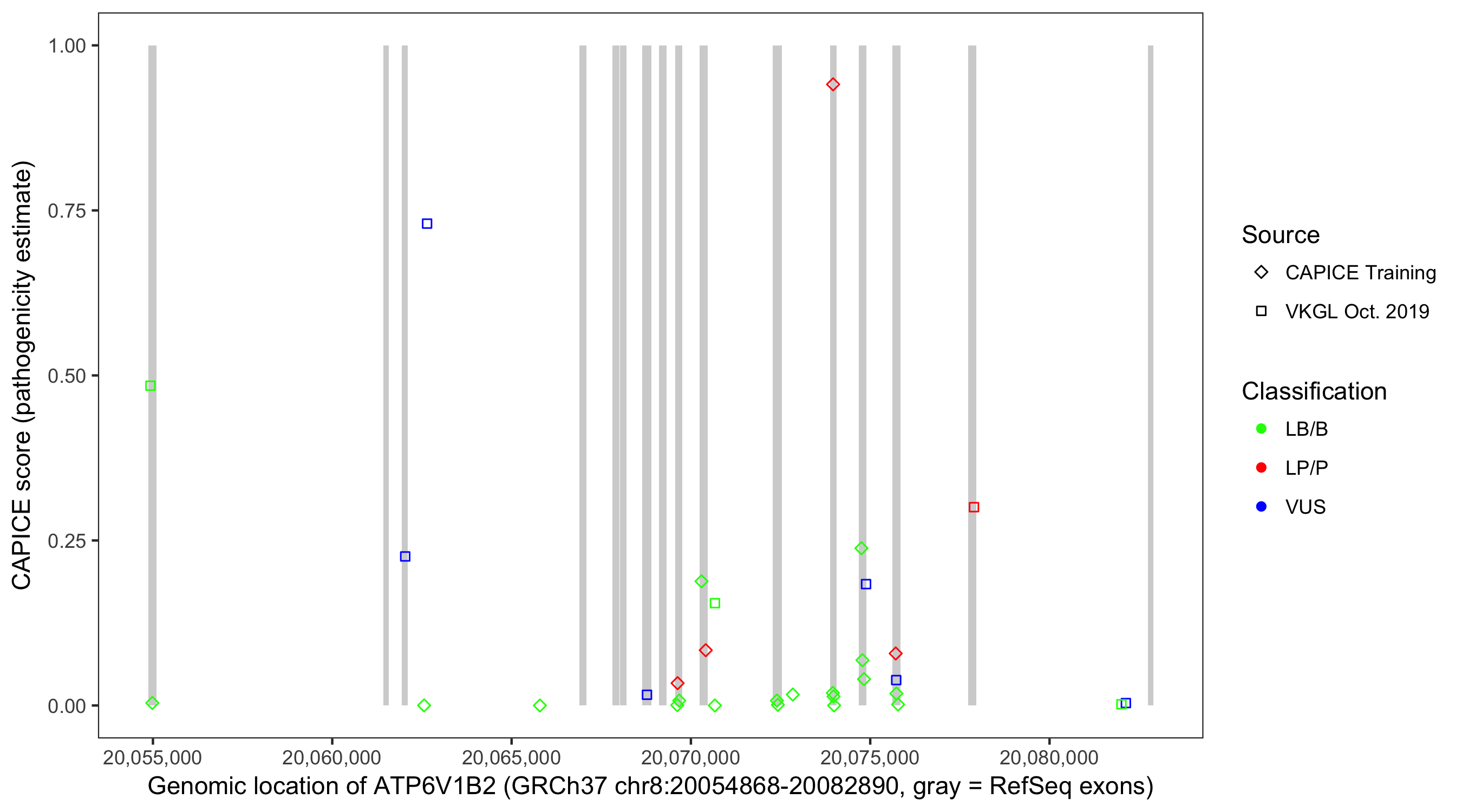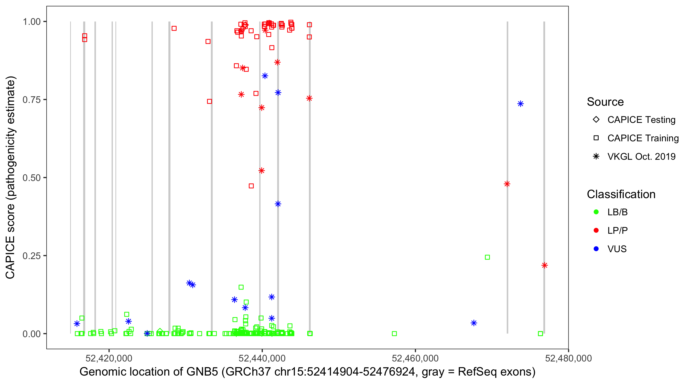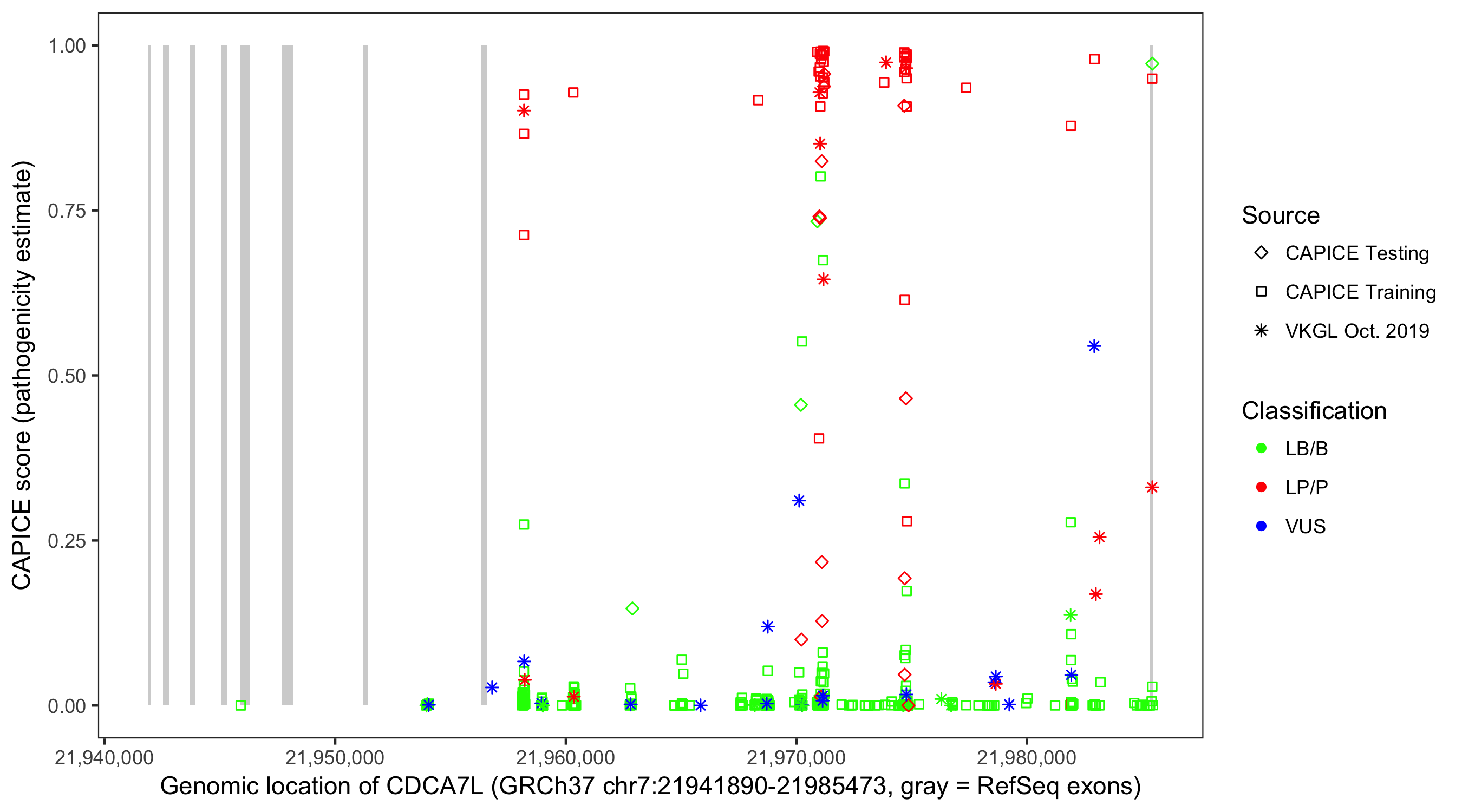 Shown are CAPICE train/test variants plus VKGL Oct 2019.