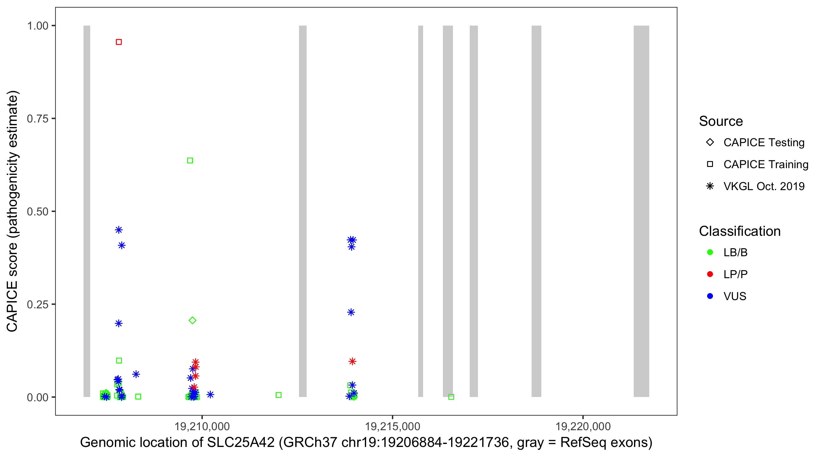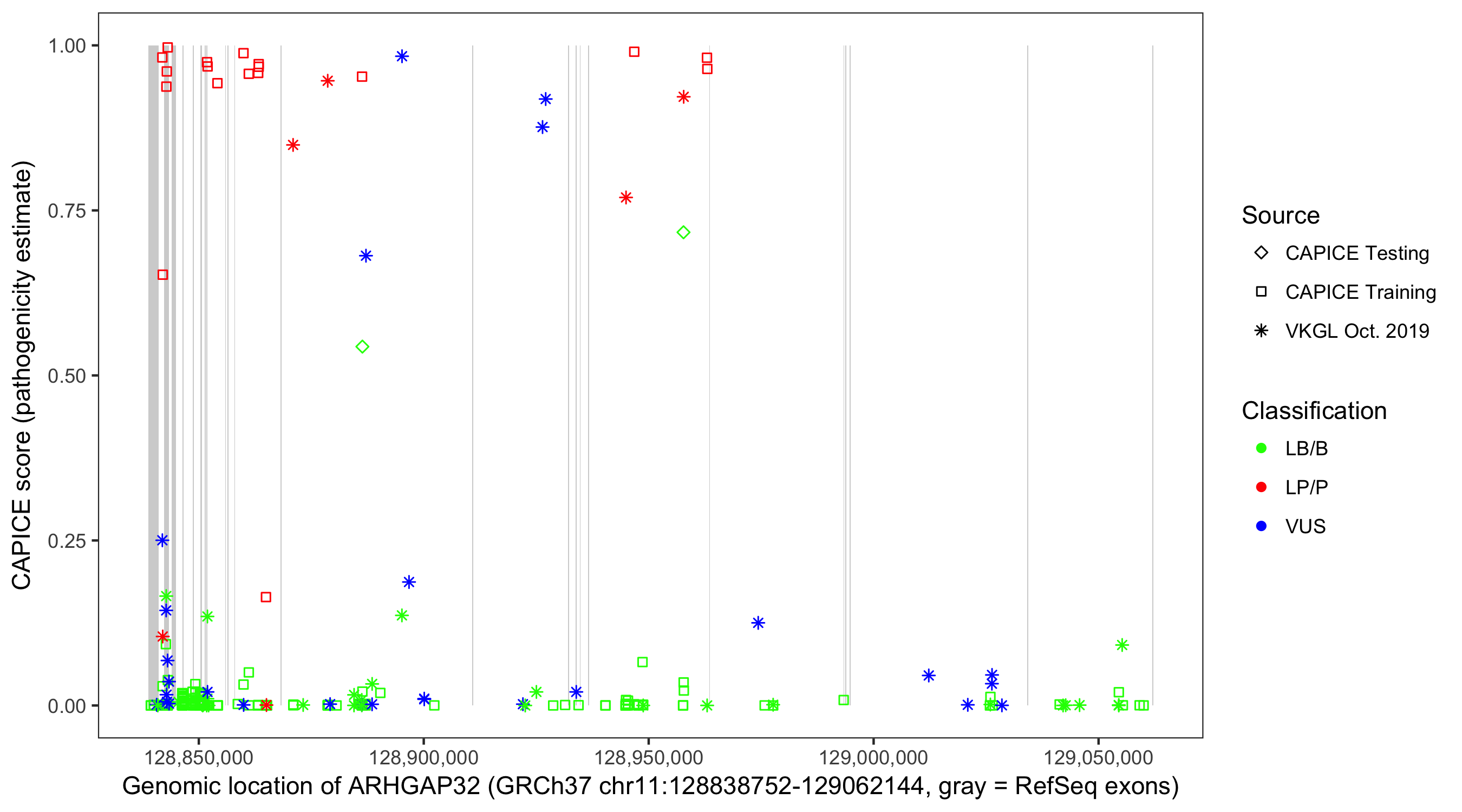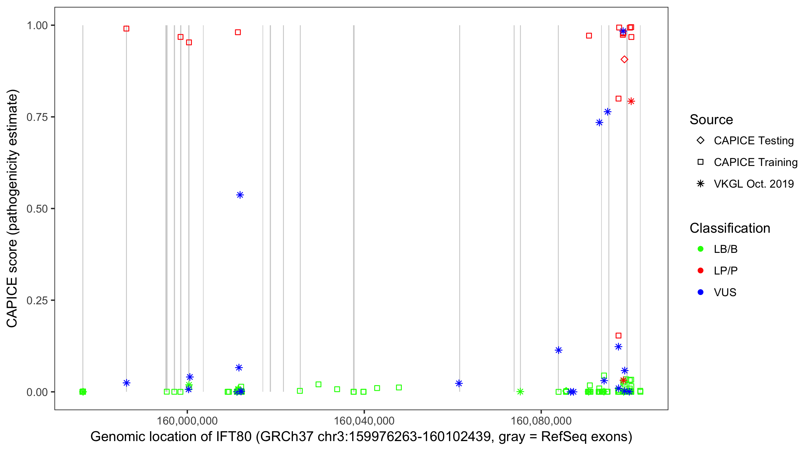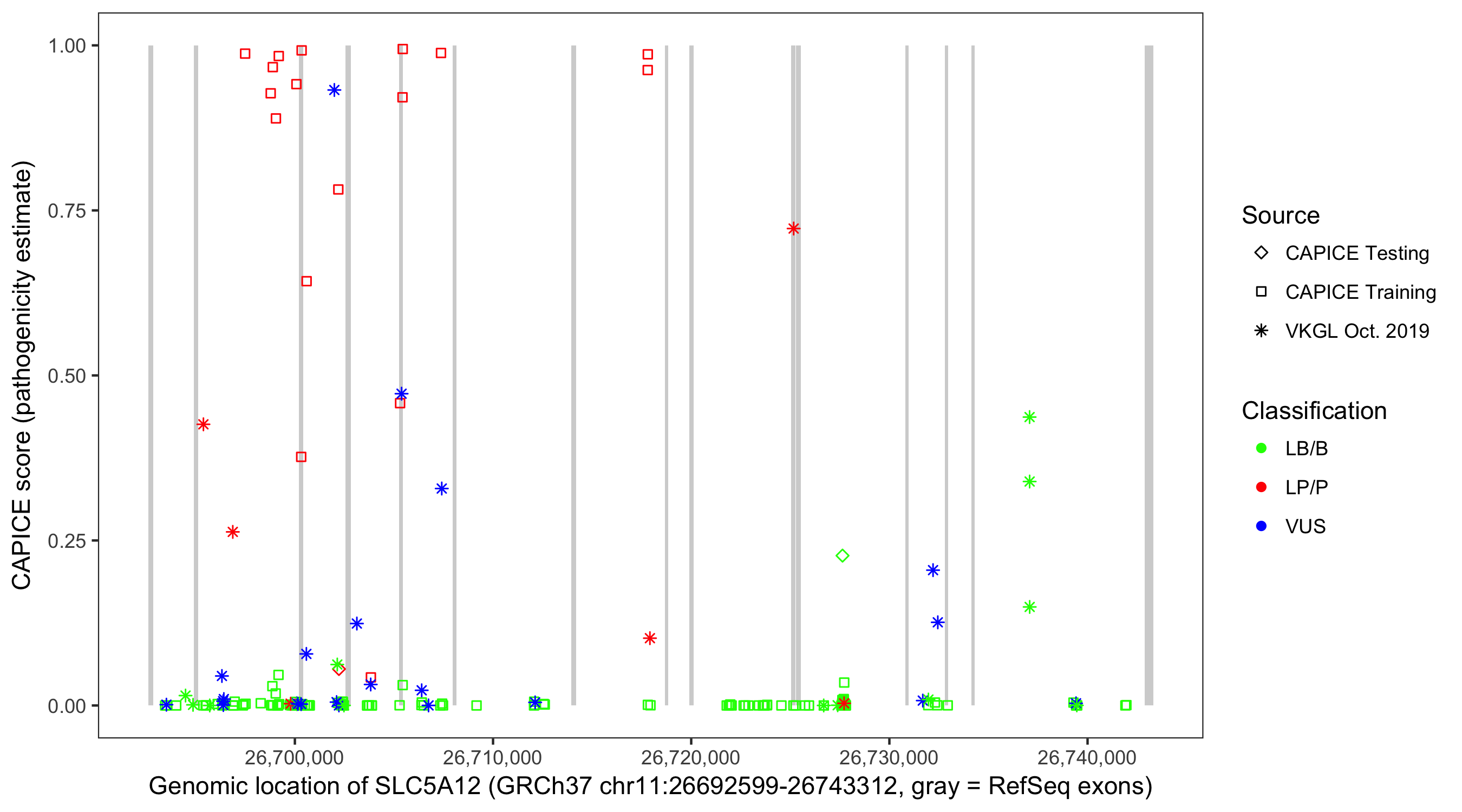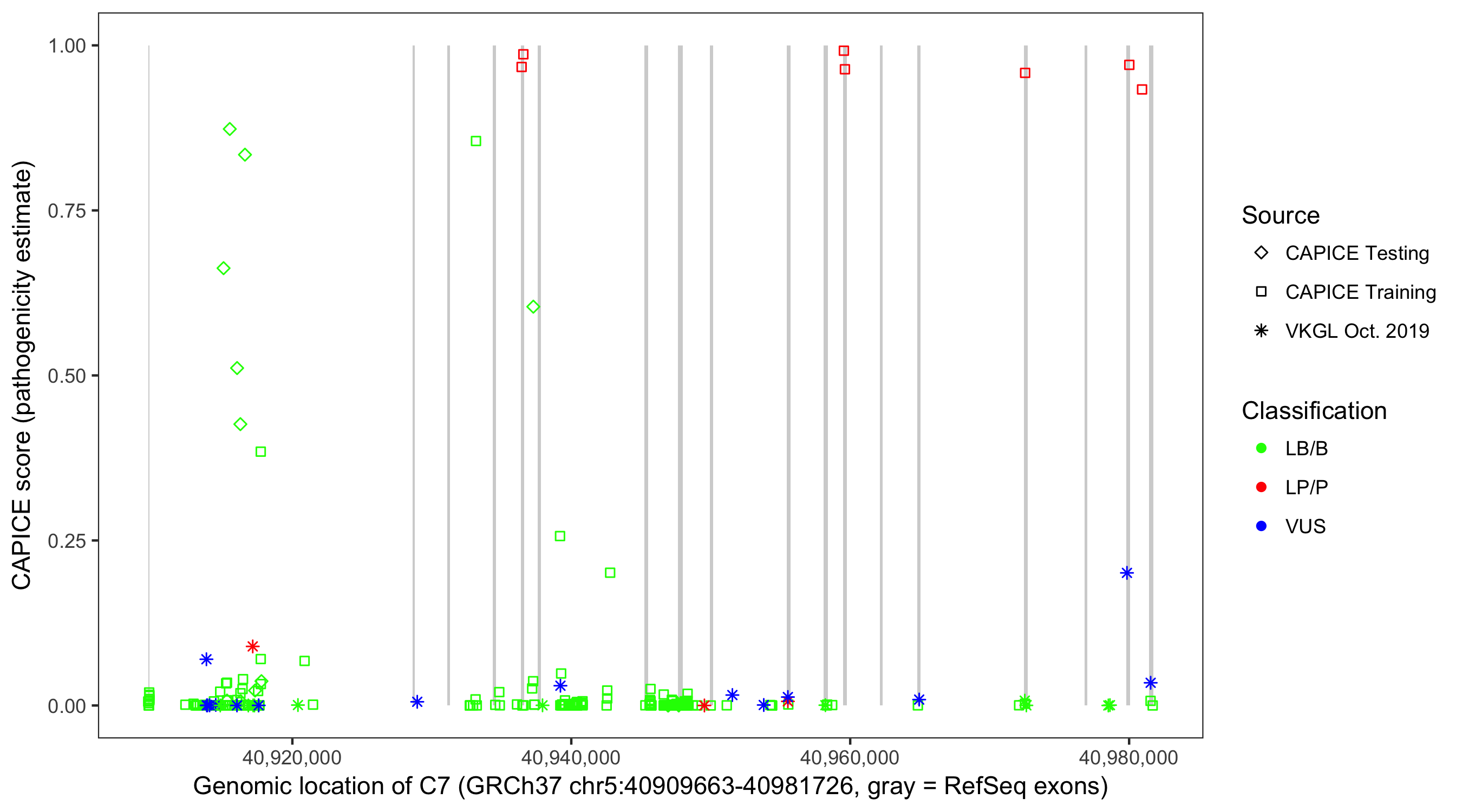 Shown are CAPICE train/test variants plus VKGL Oct 2019.