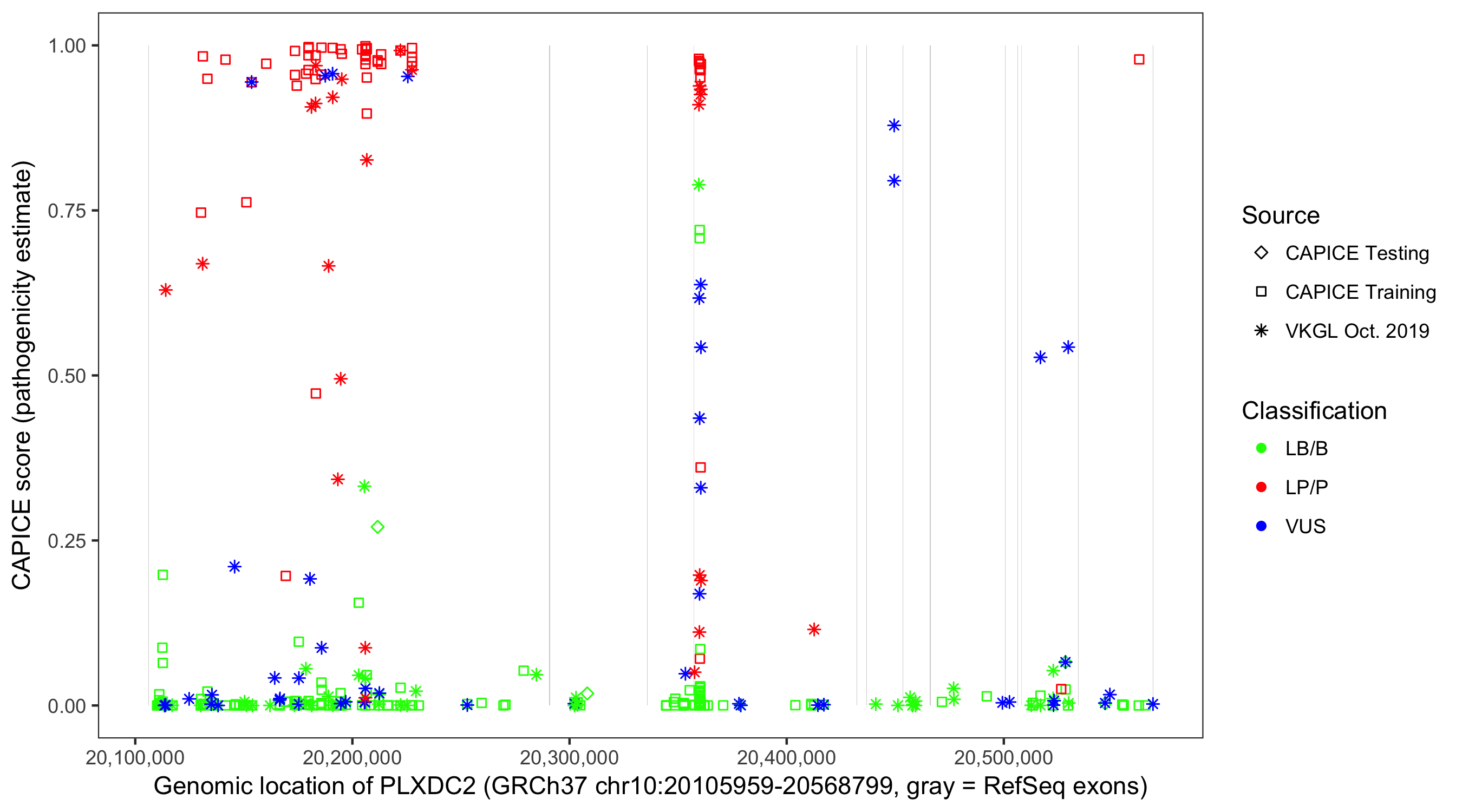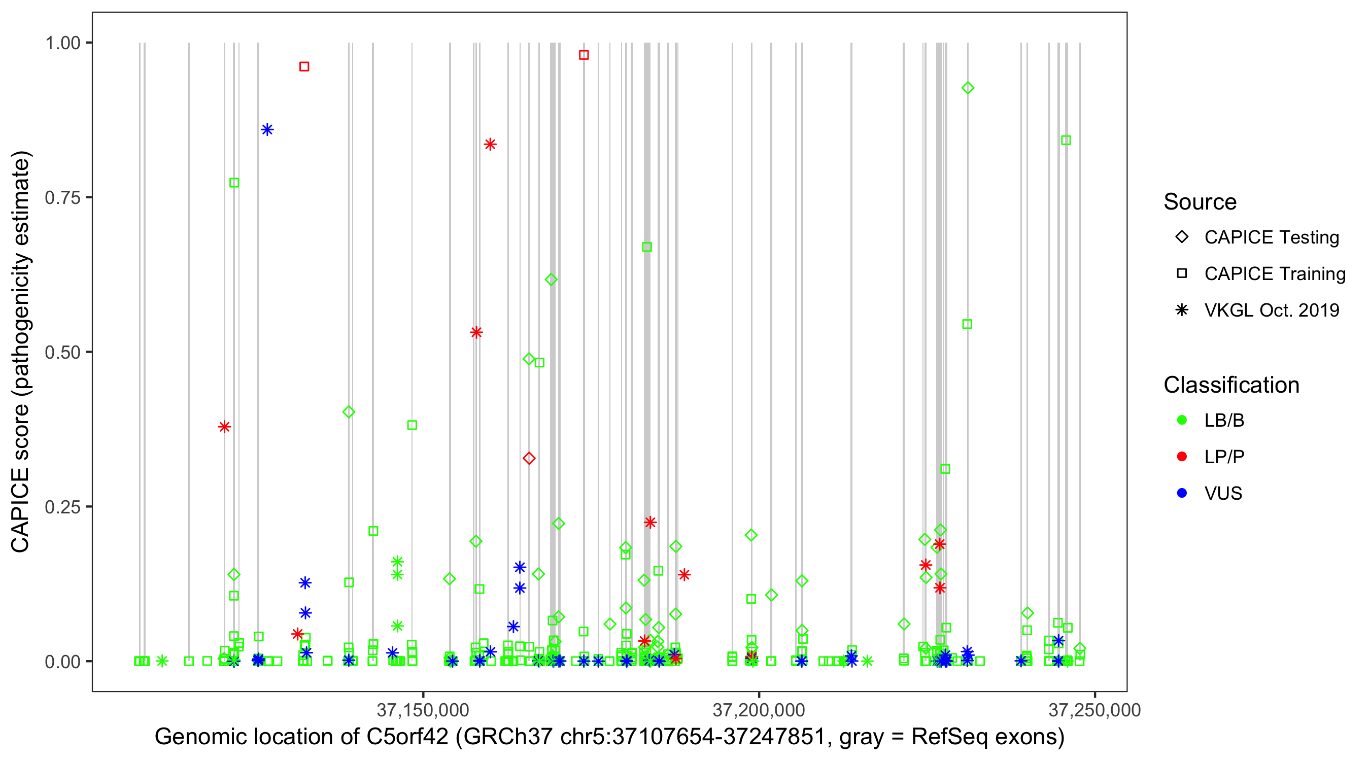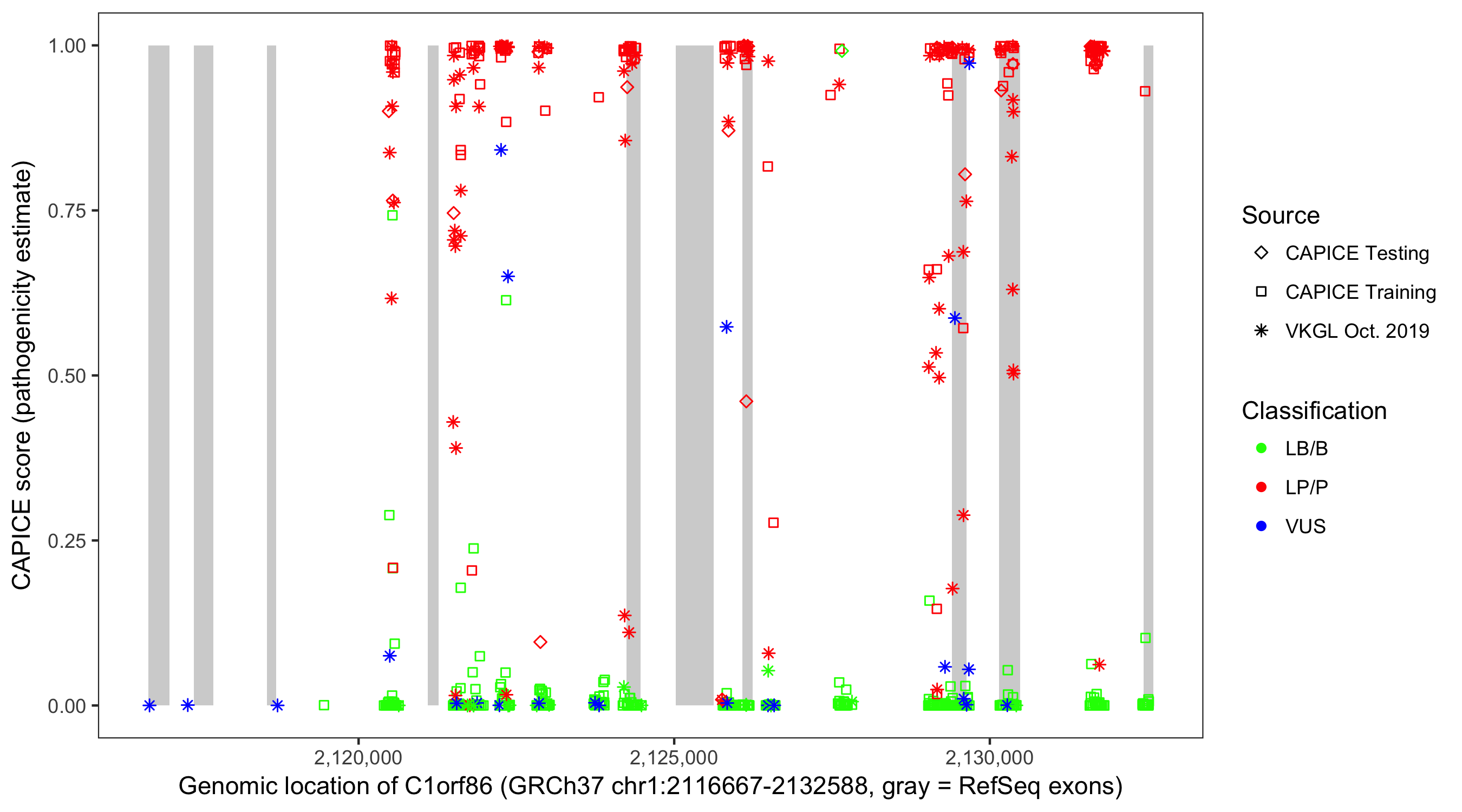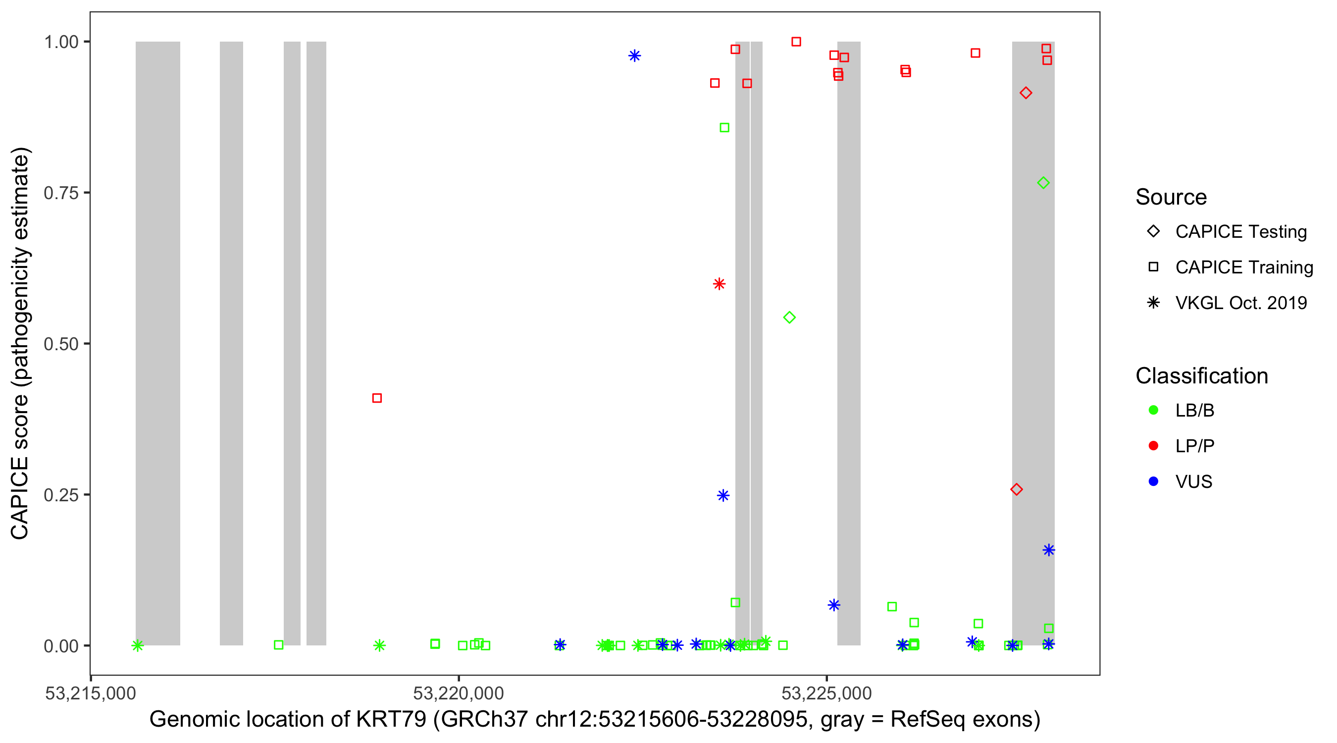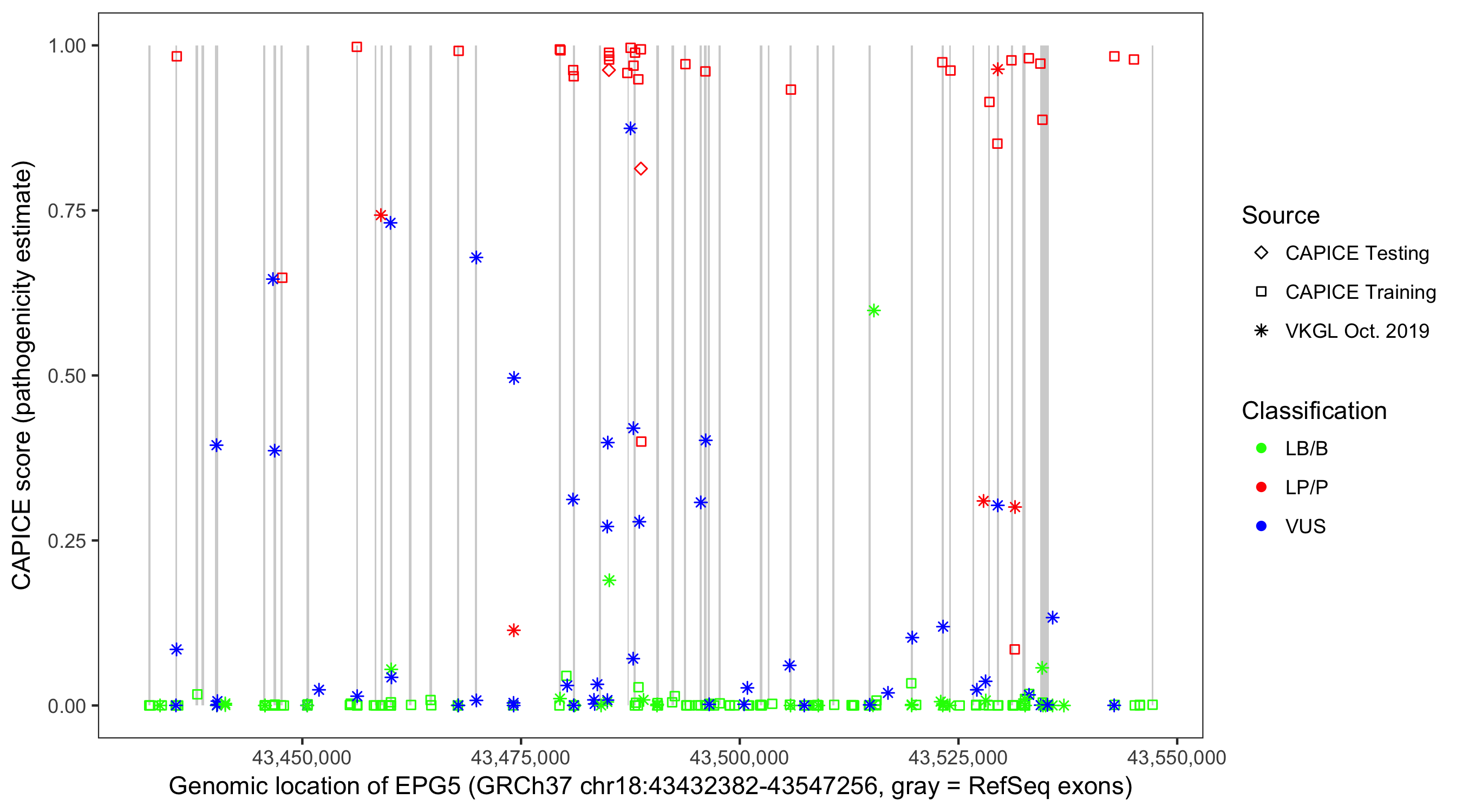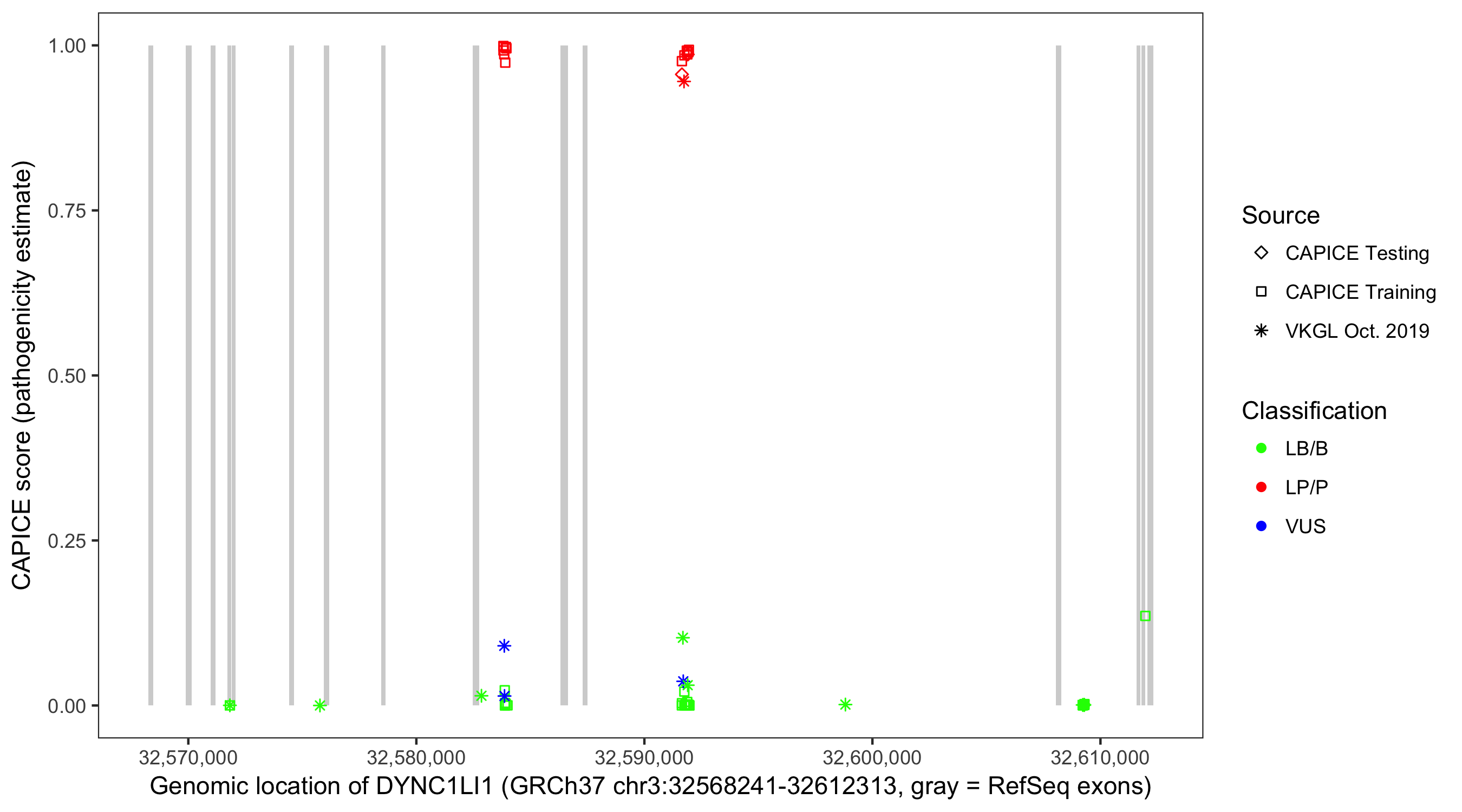 Shown are CAPICE train/test variants plus VKGL Oct 2019.