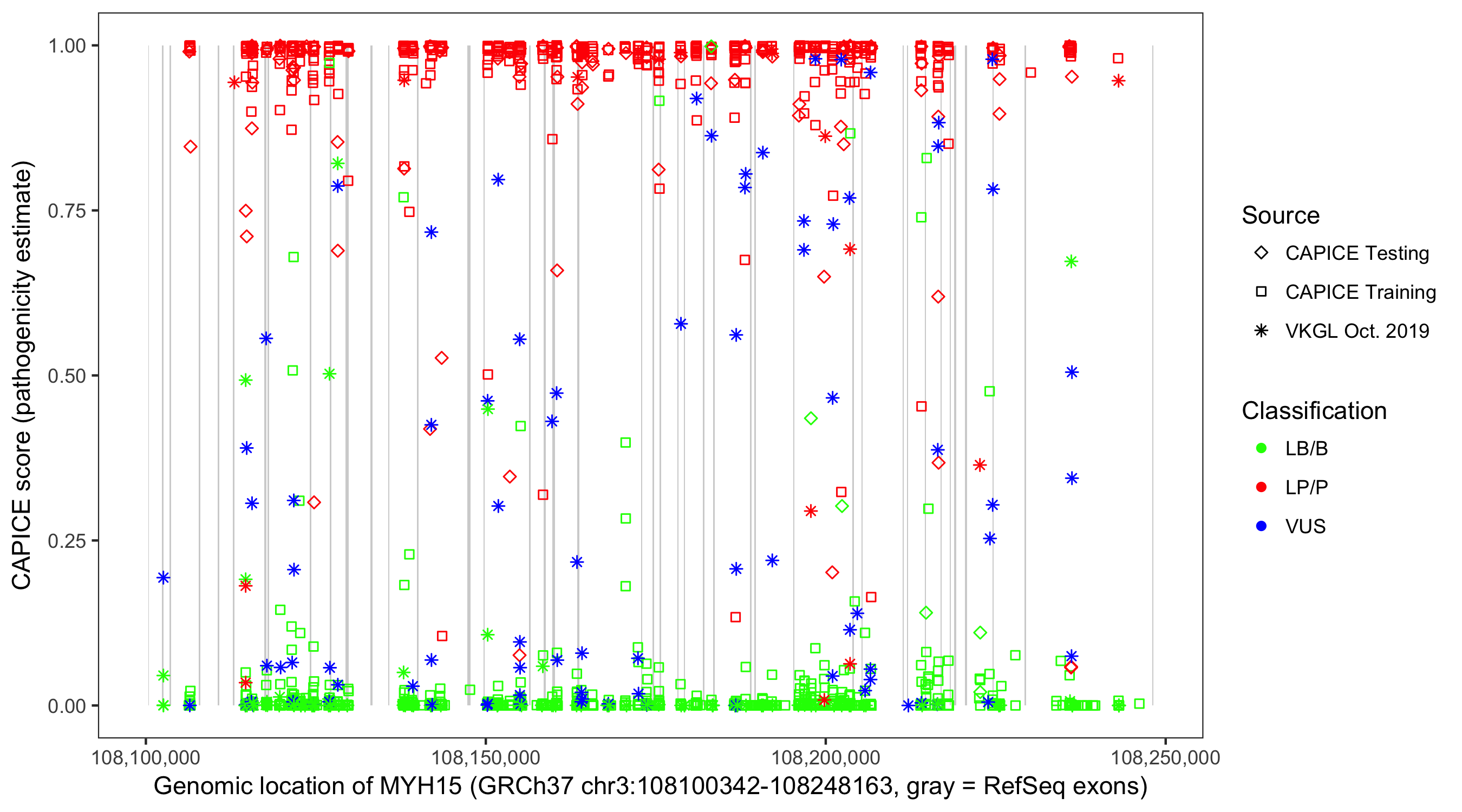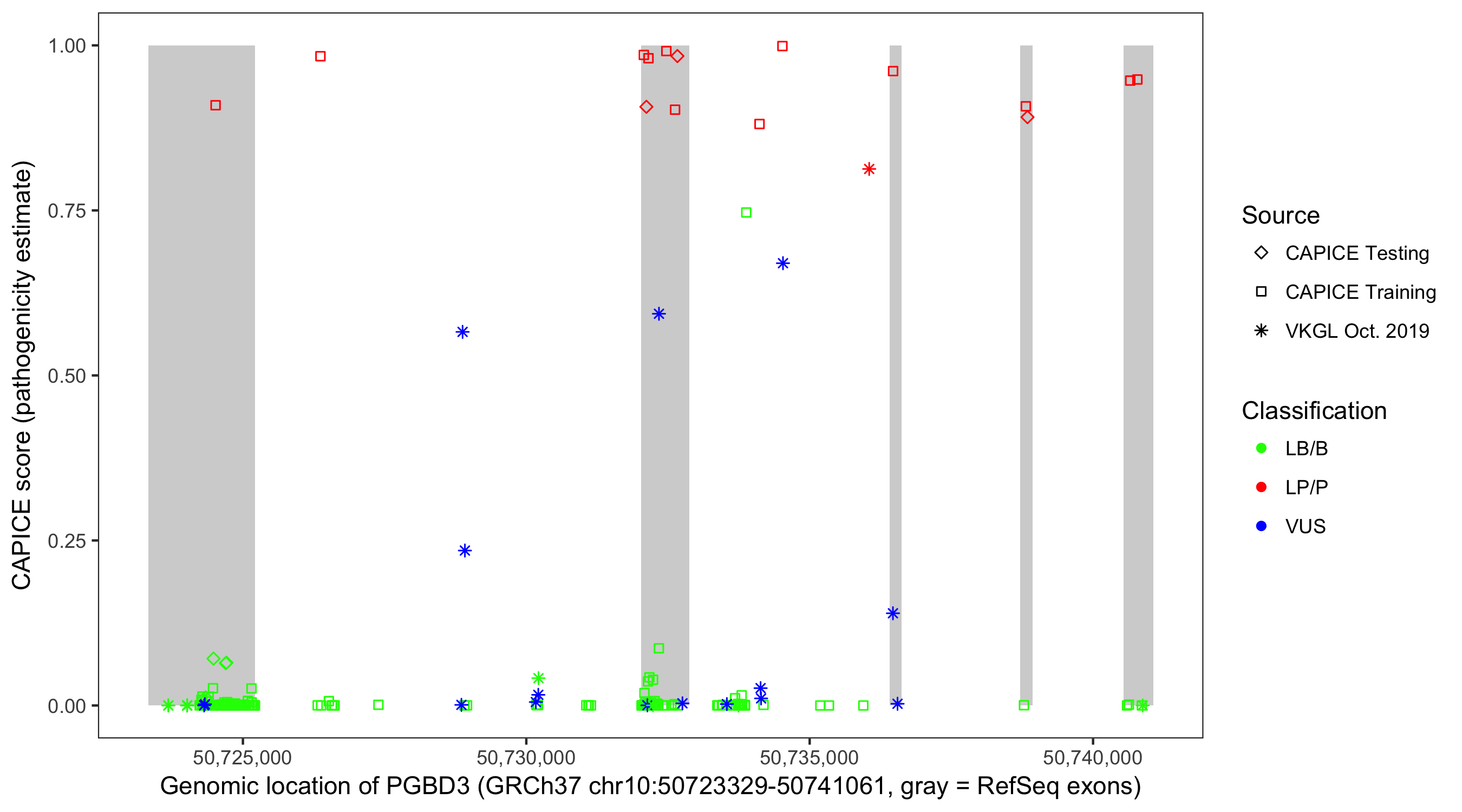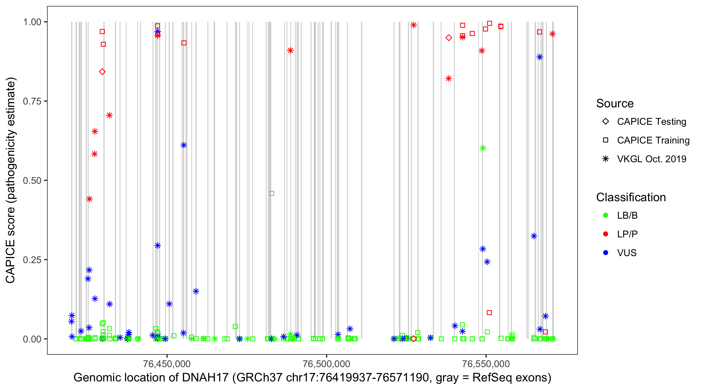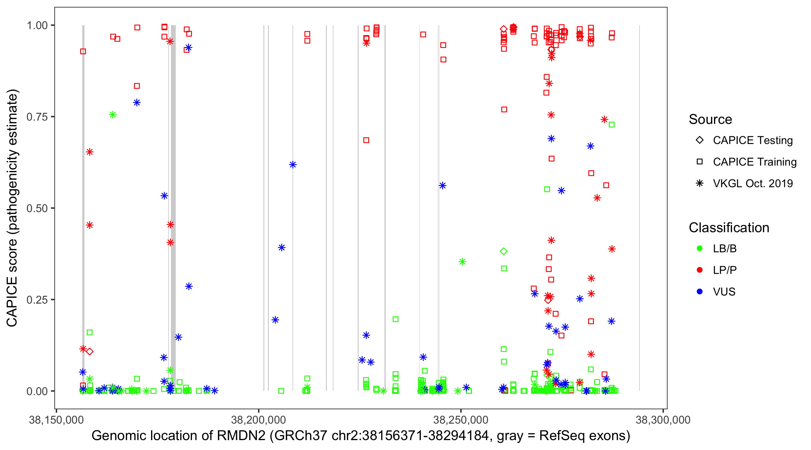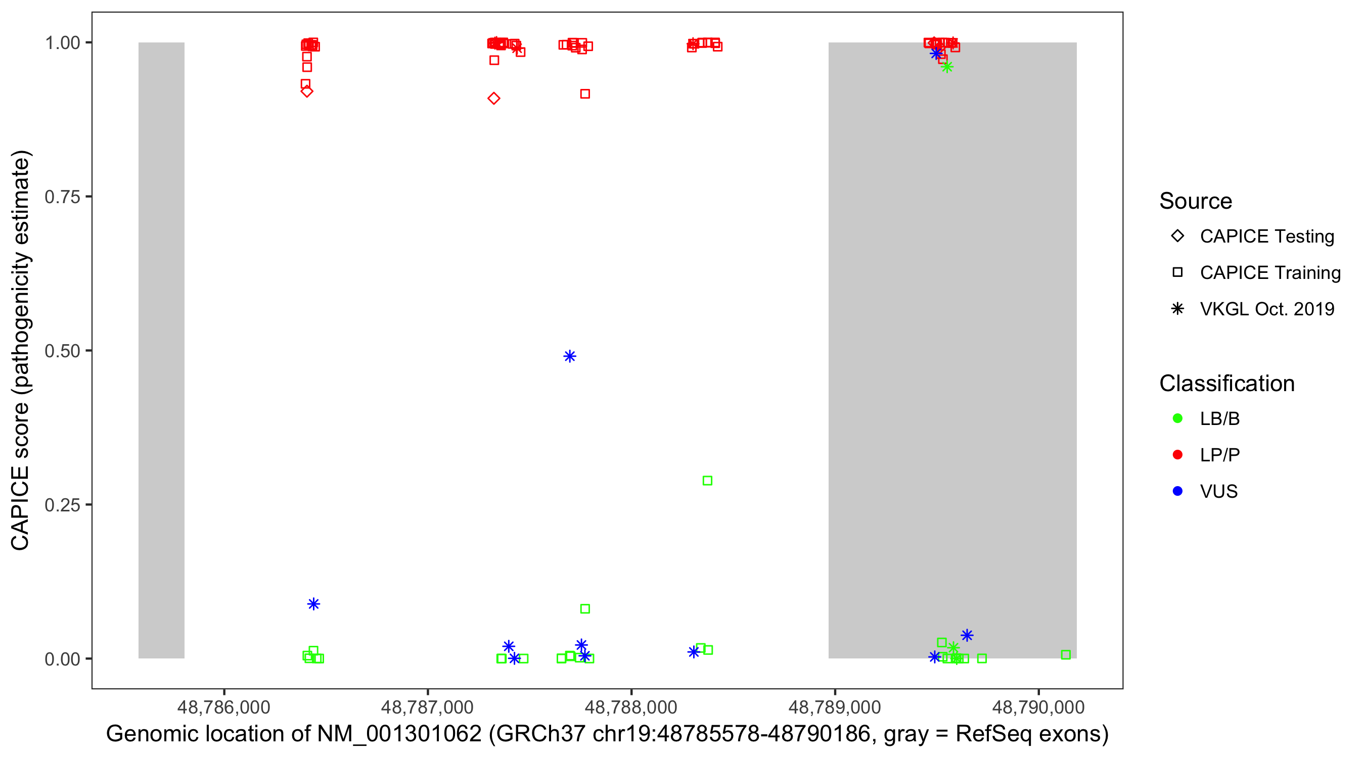 Shown are CAPICE train/test variants plus VKGL Oct 2019.