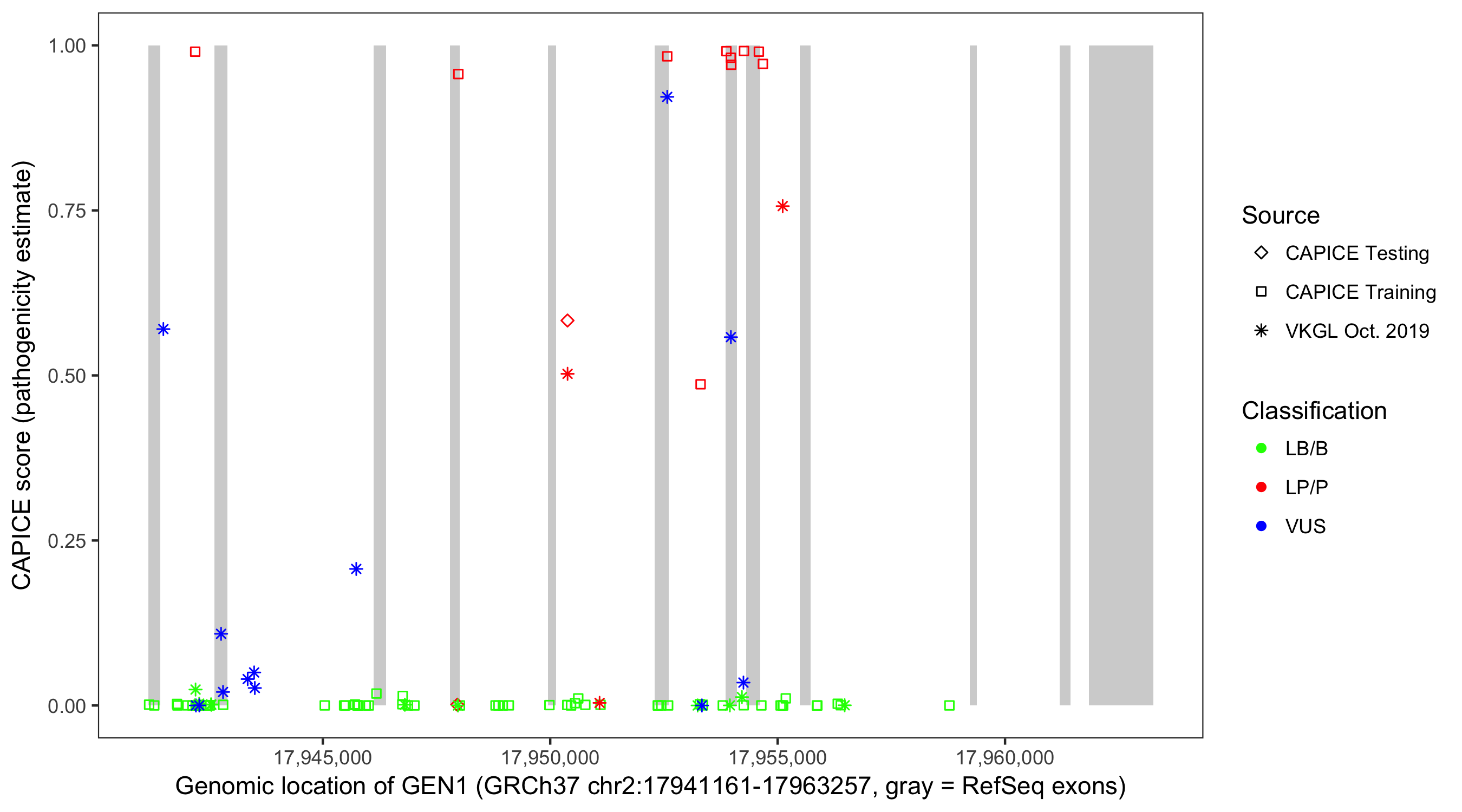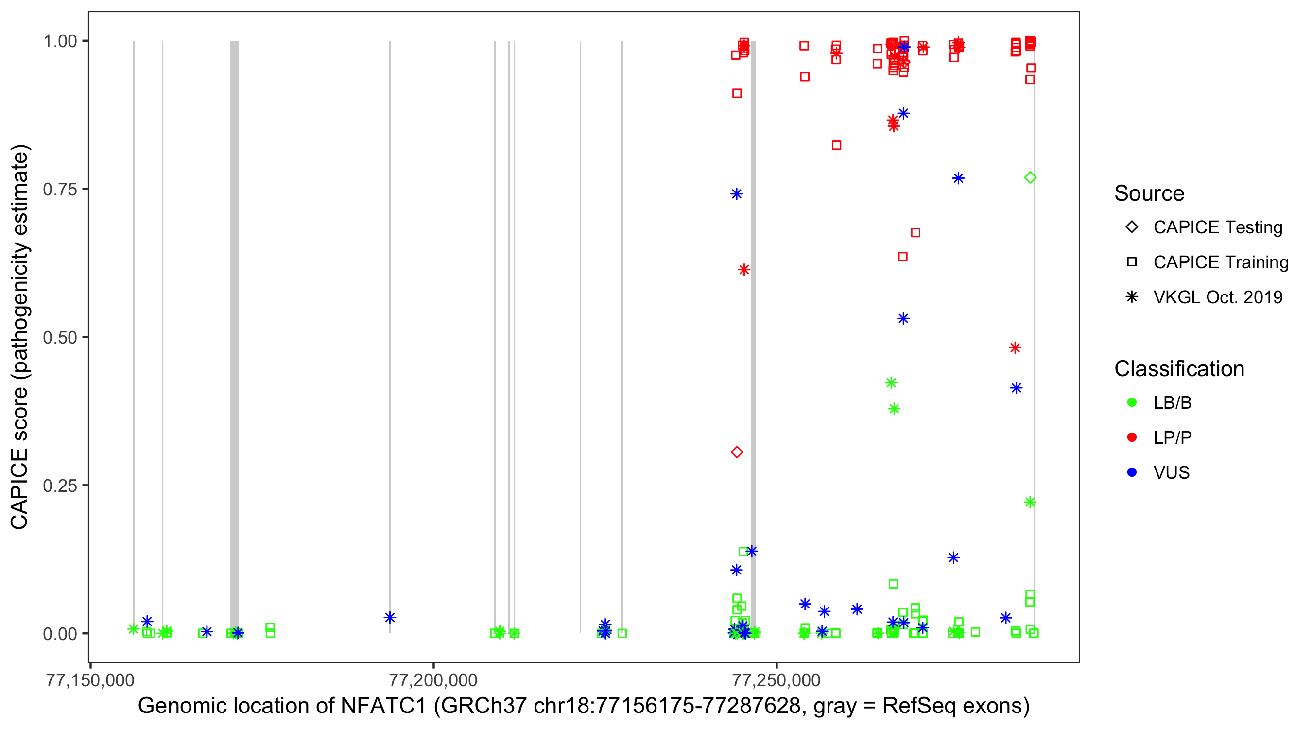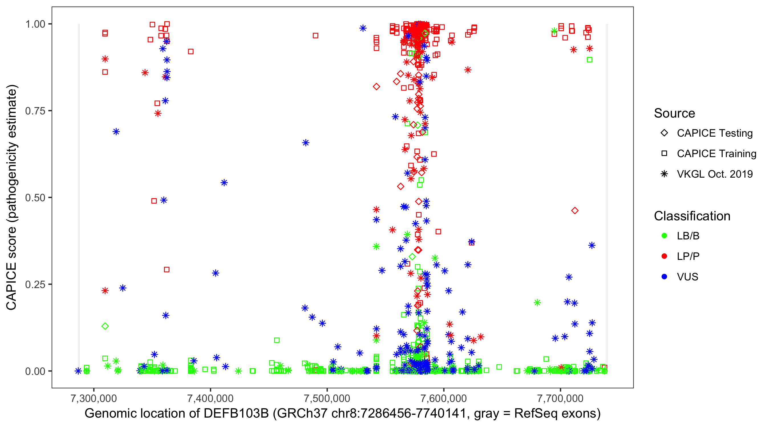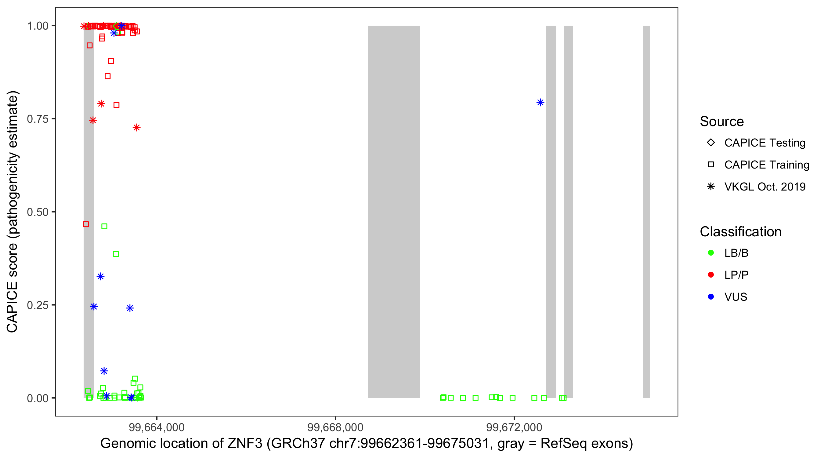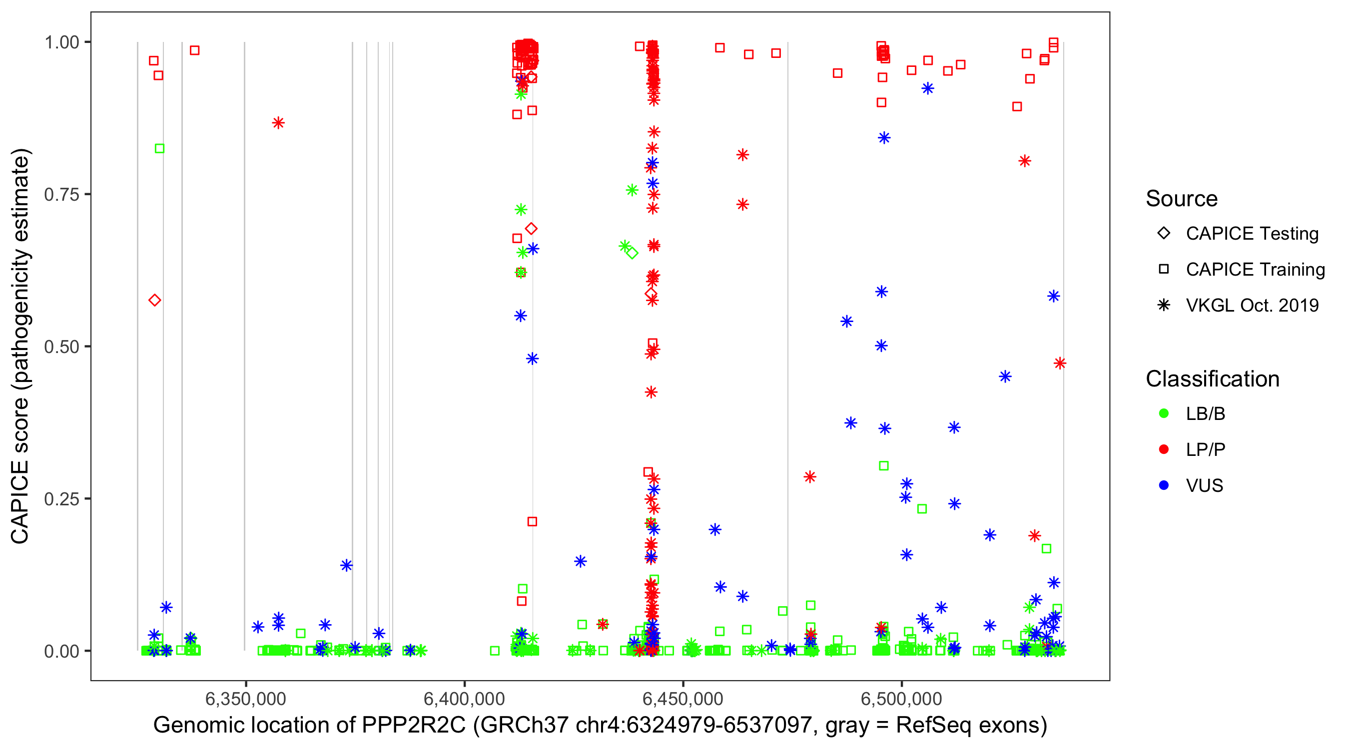 Shown are CAPICE train/test variants plus VKGL Oct 2019.