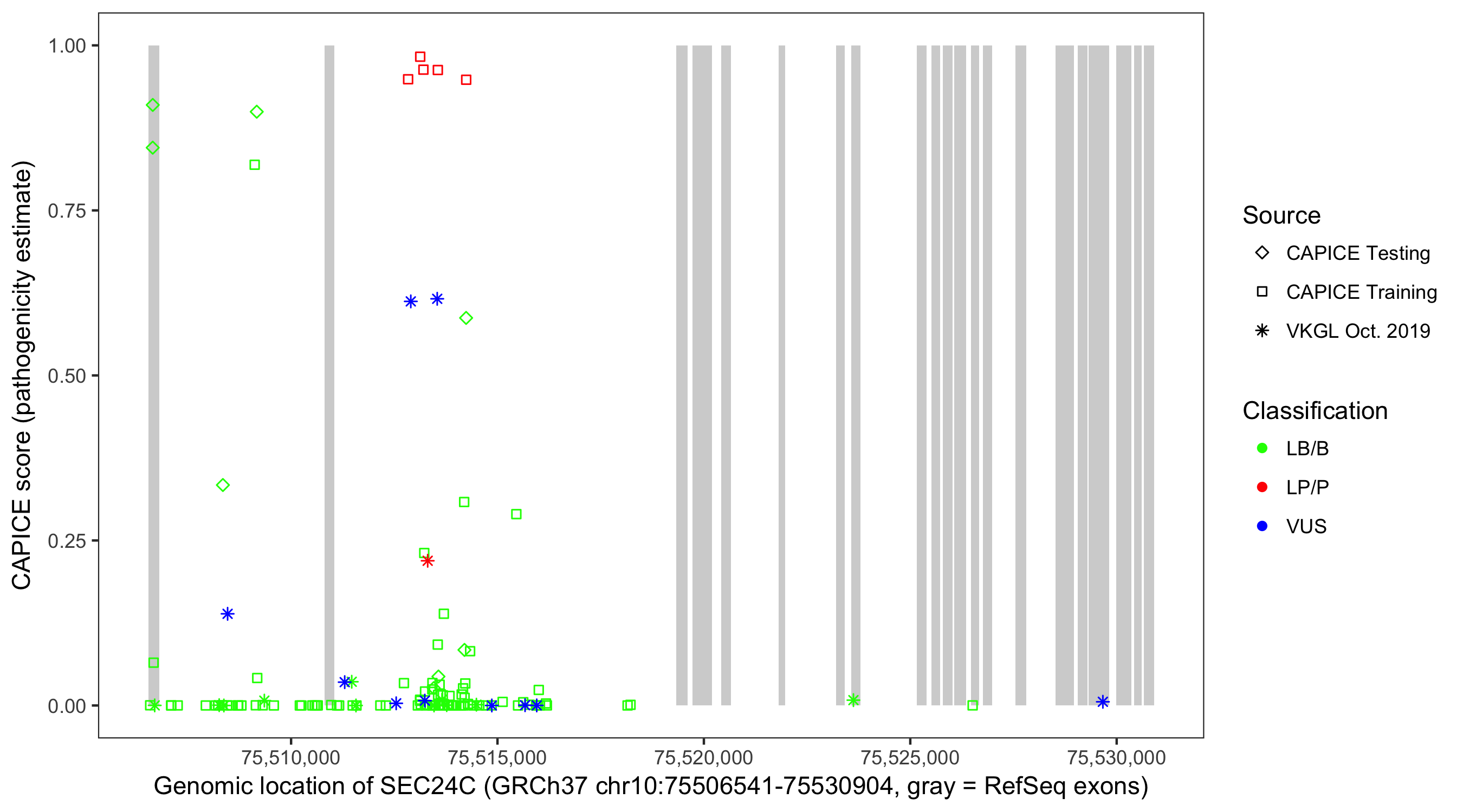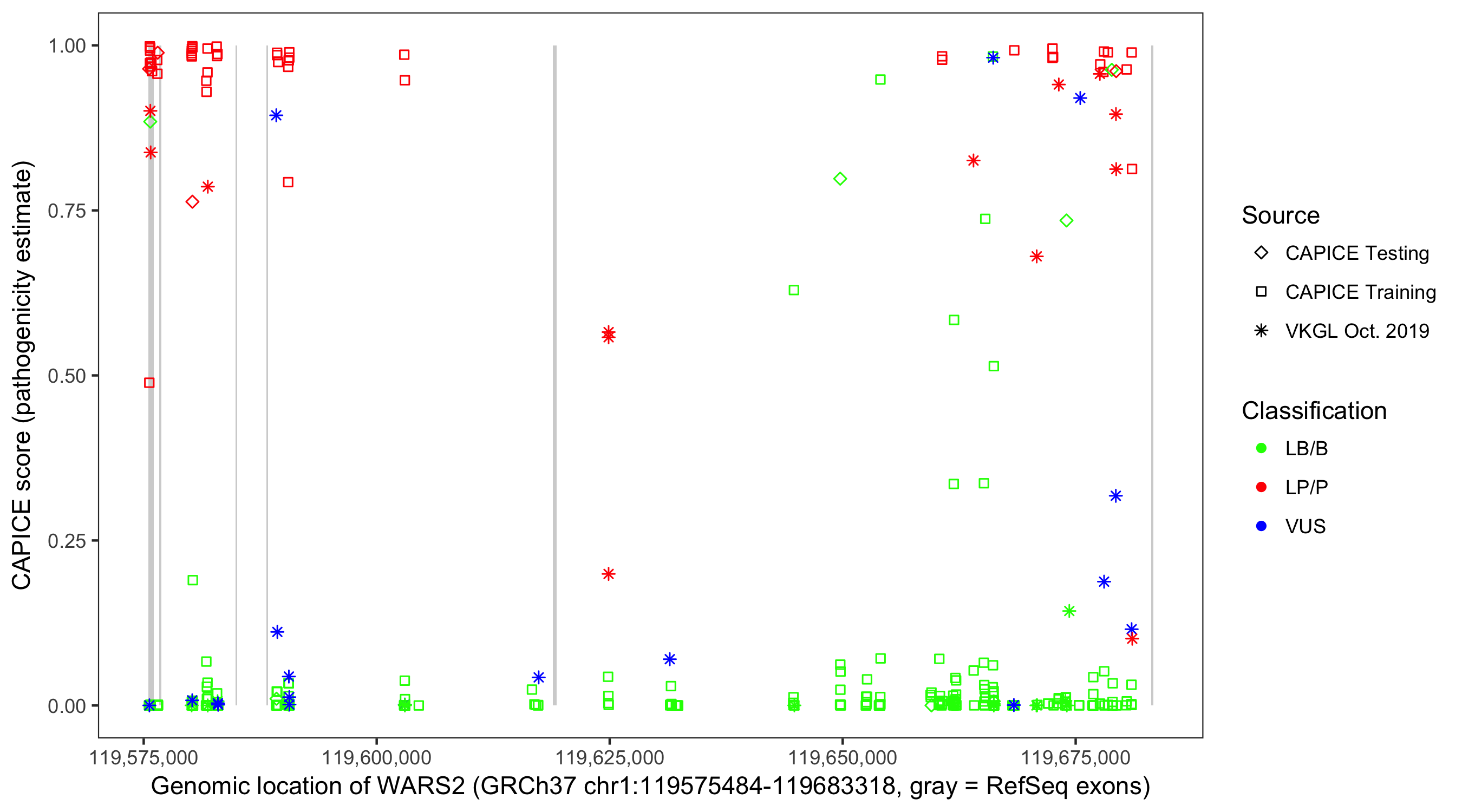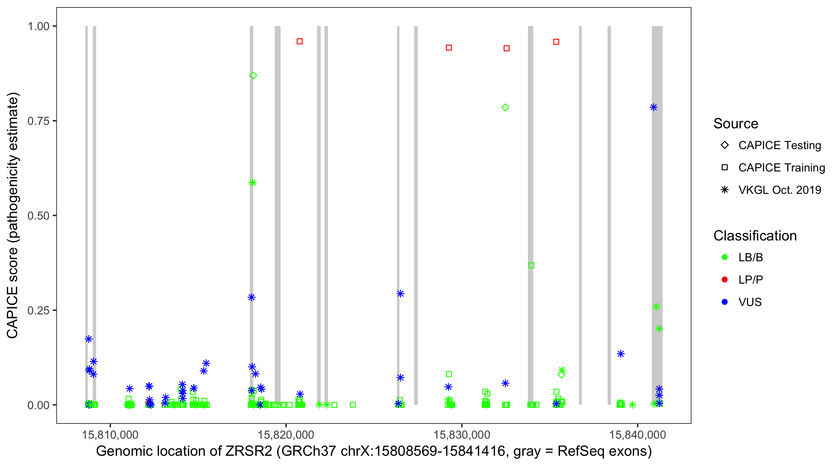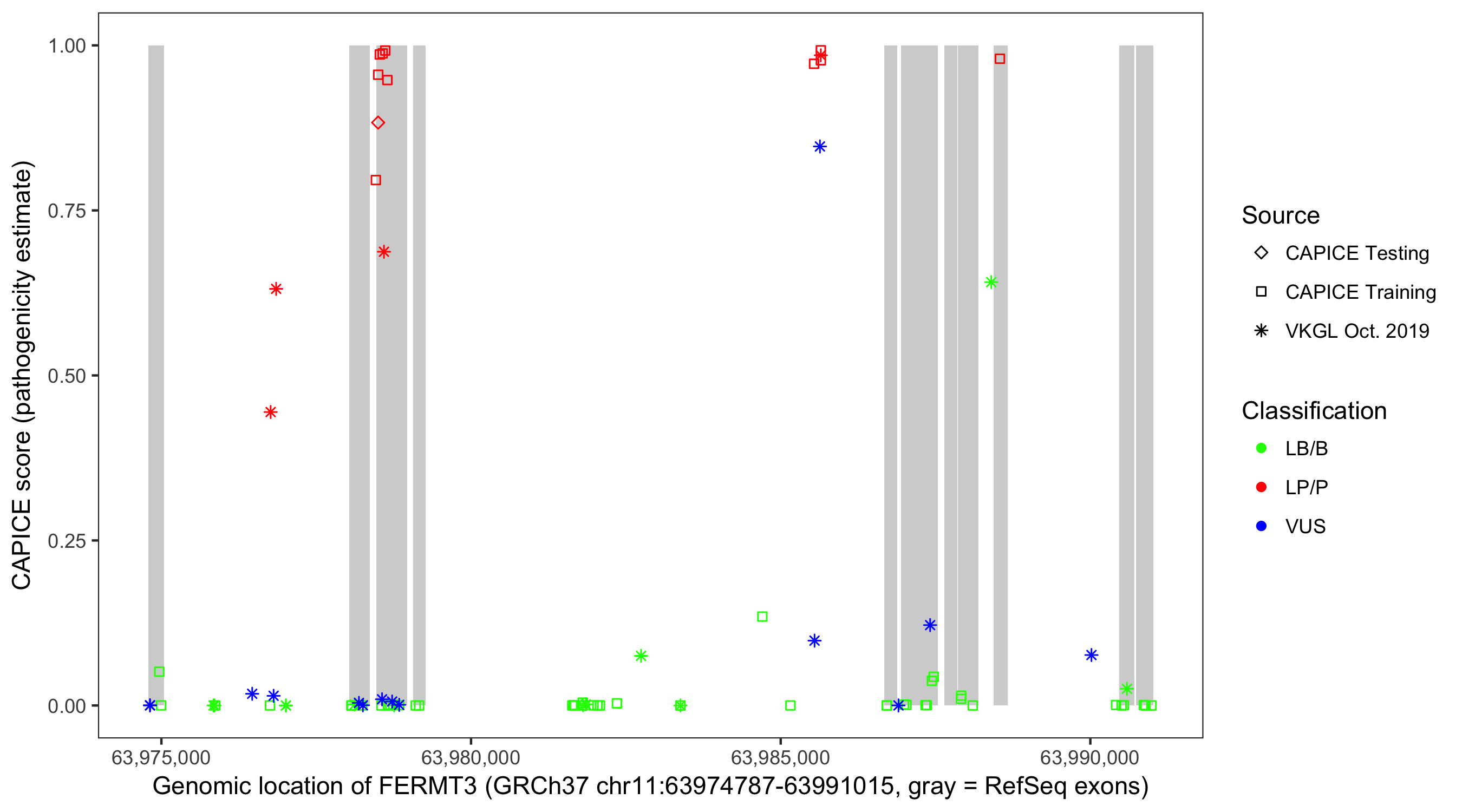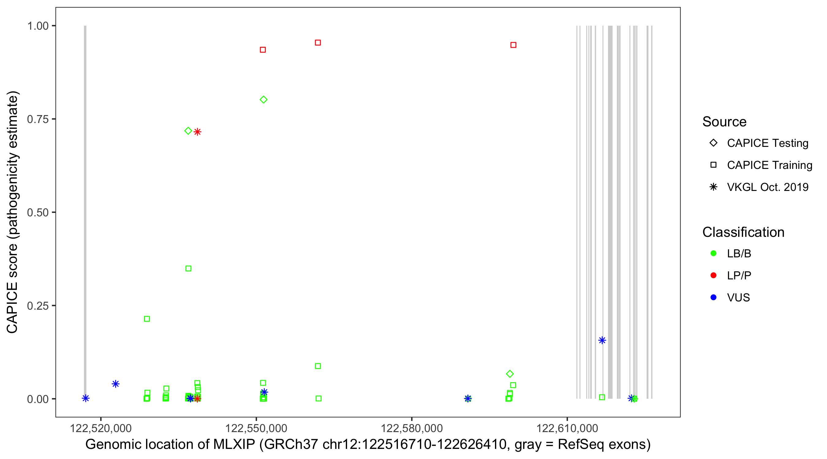 Shown are CAPICE train/test variants plus VKGL Oct 2019.