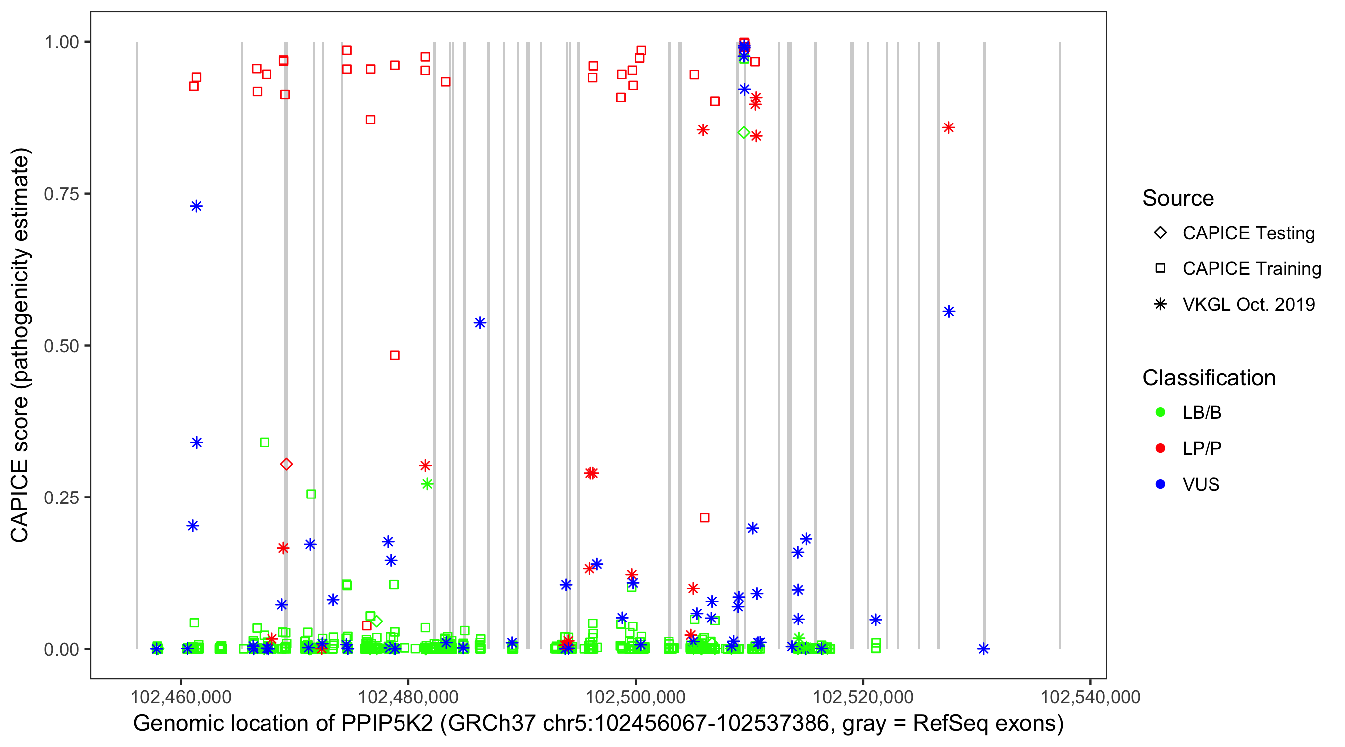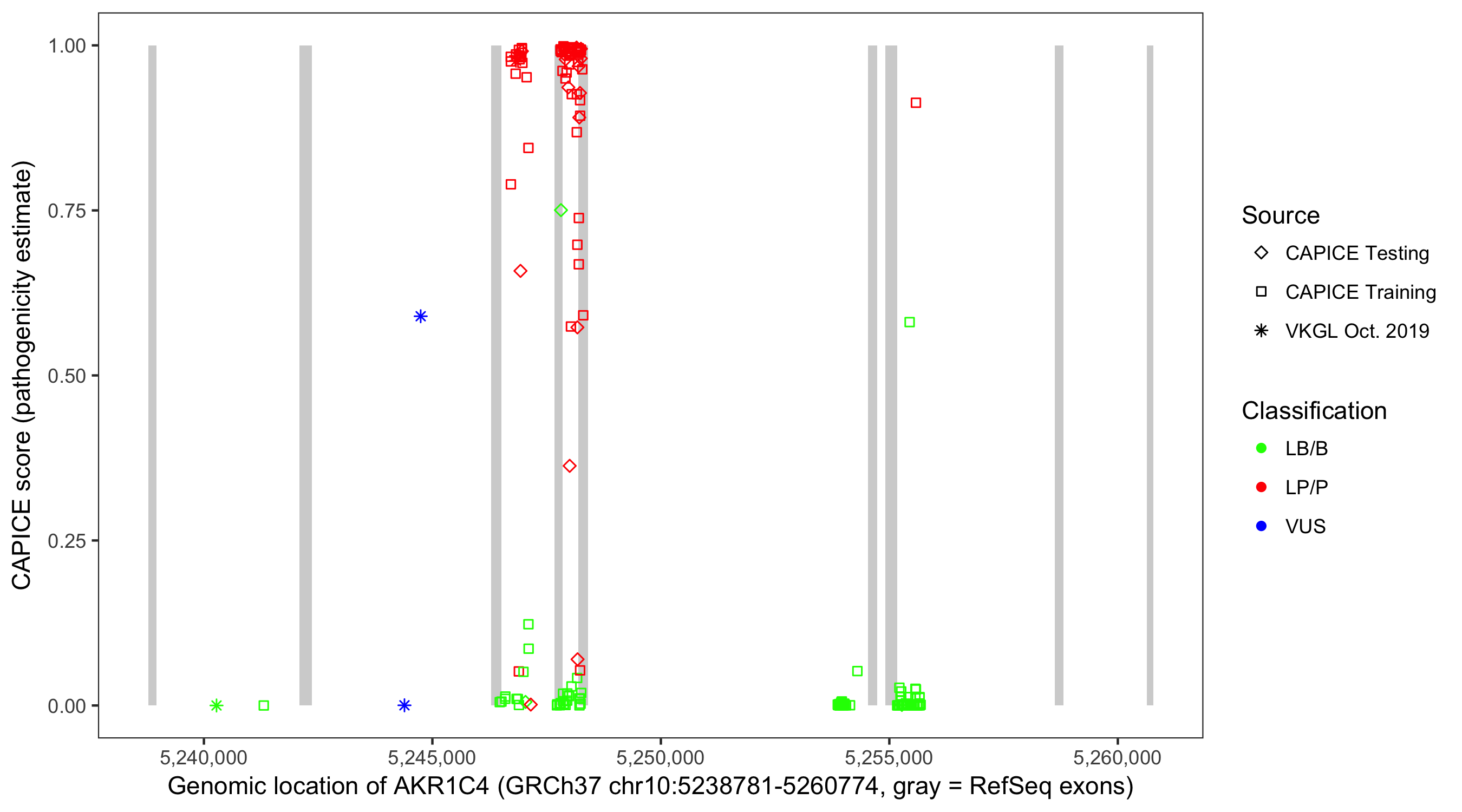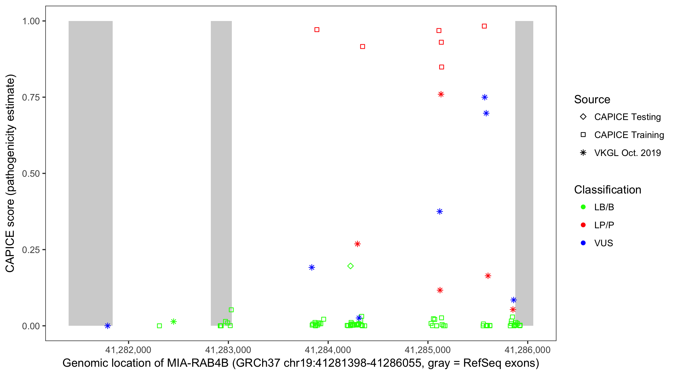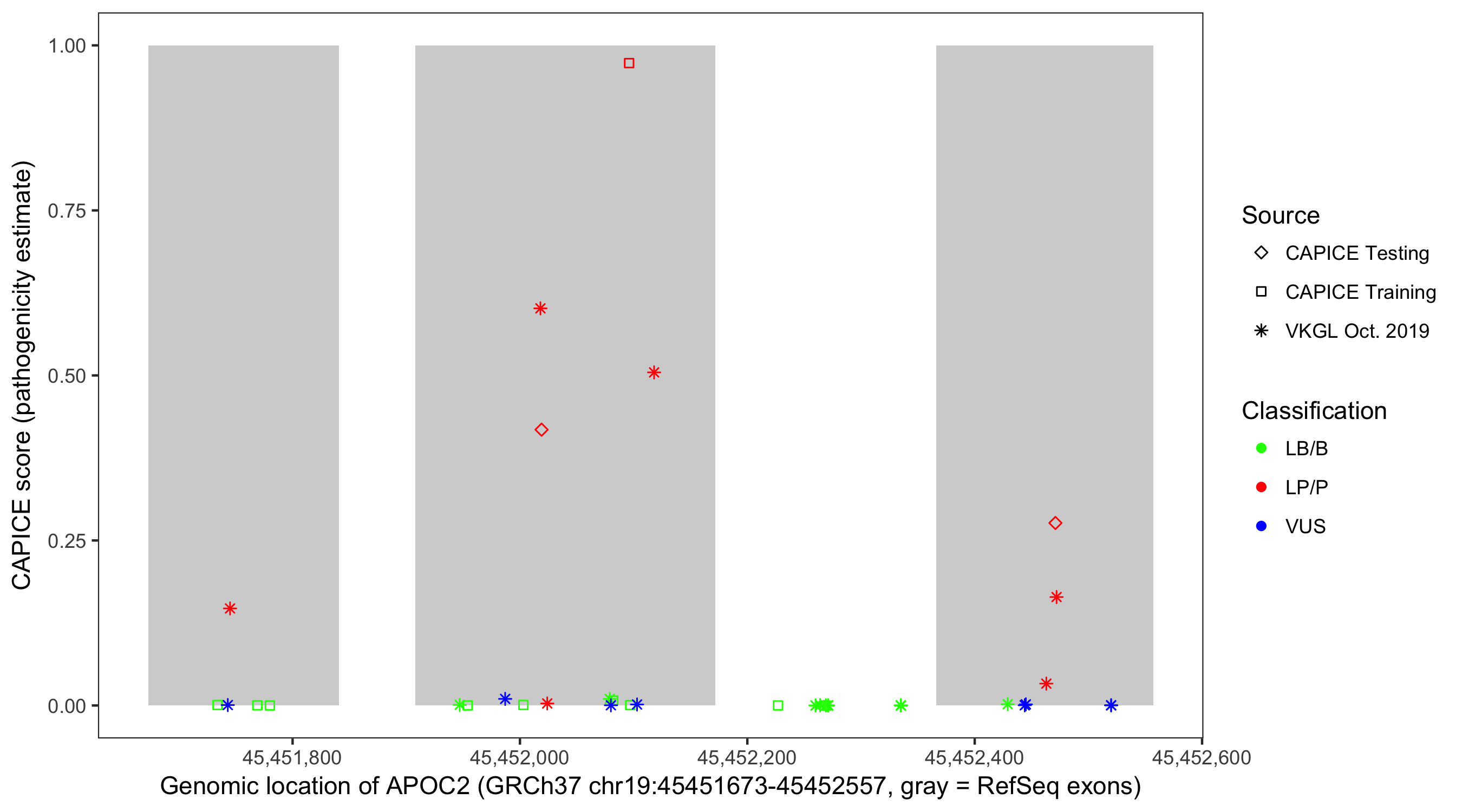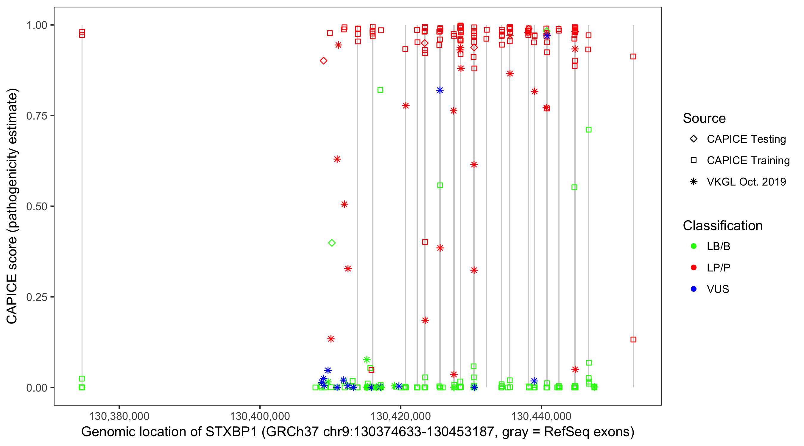 Shown are CAPICE train/test variants plus VKGL Oct 2019.