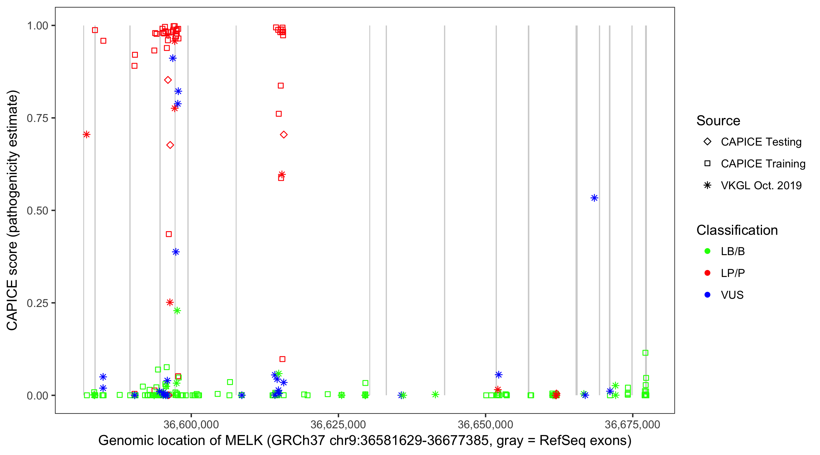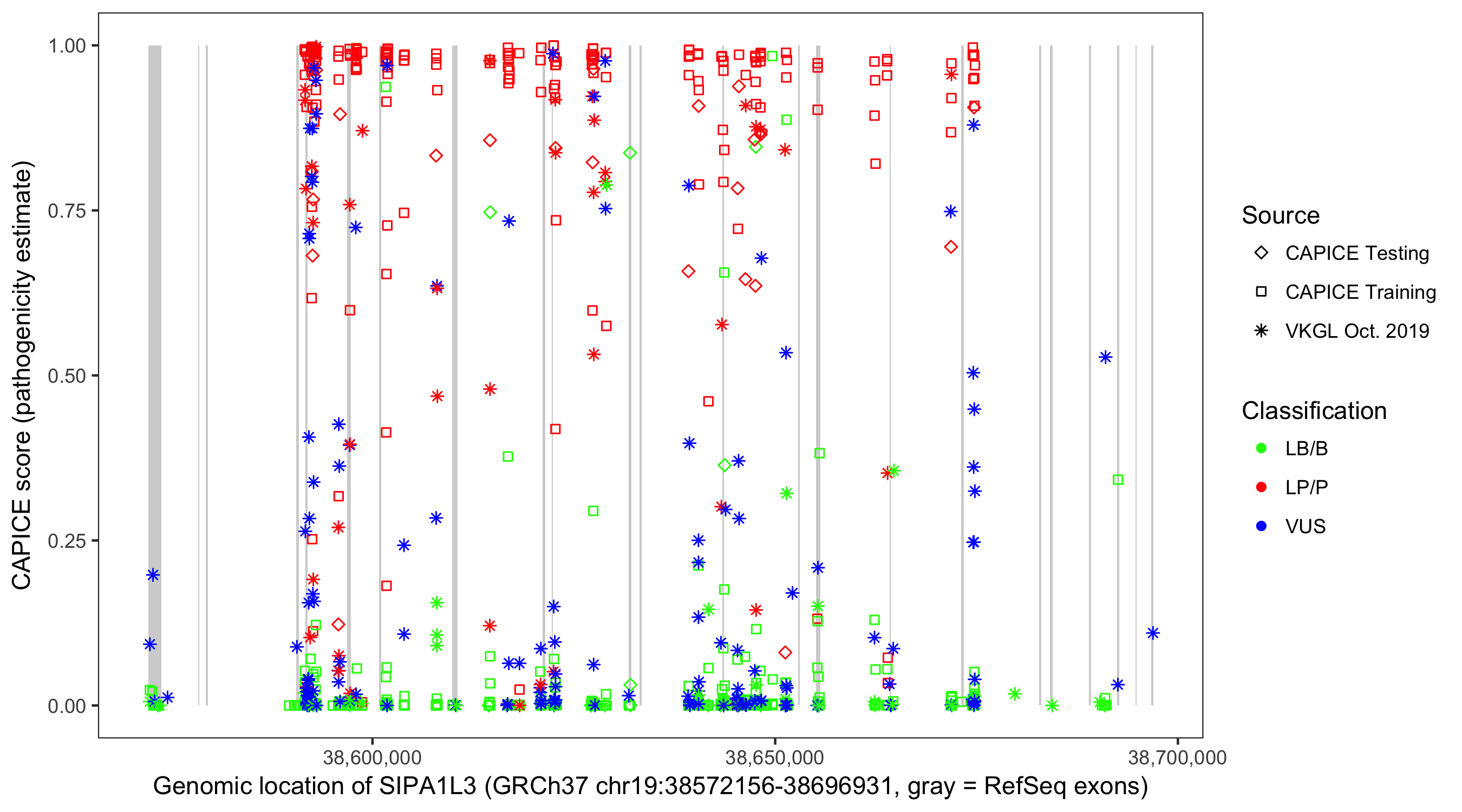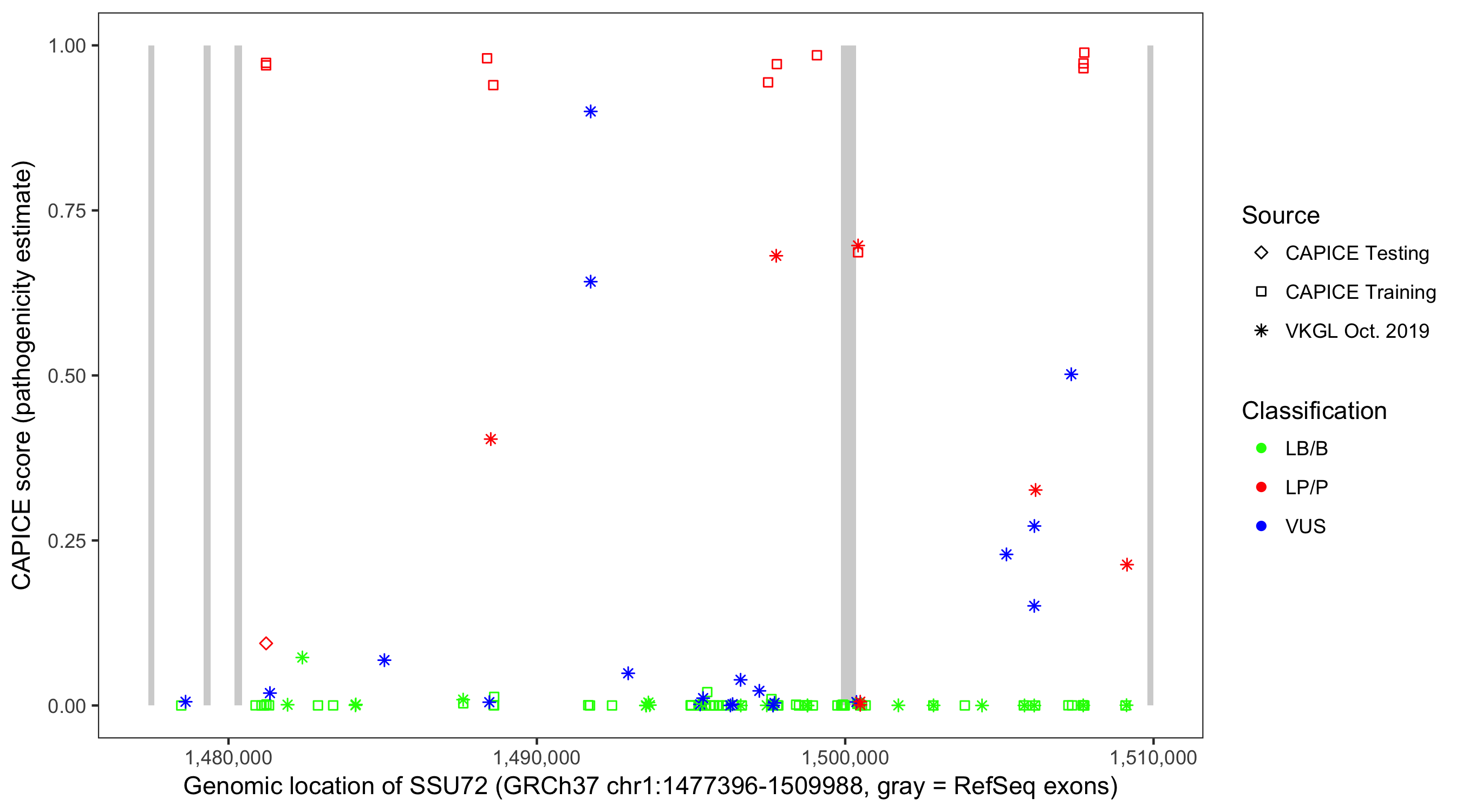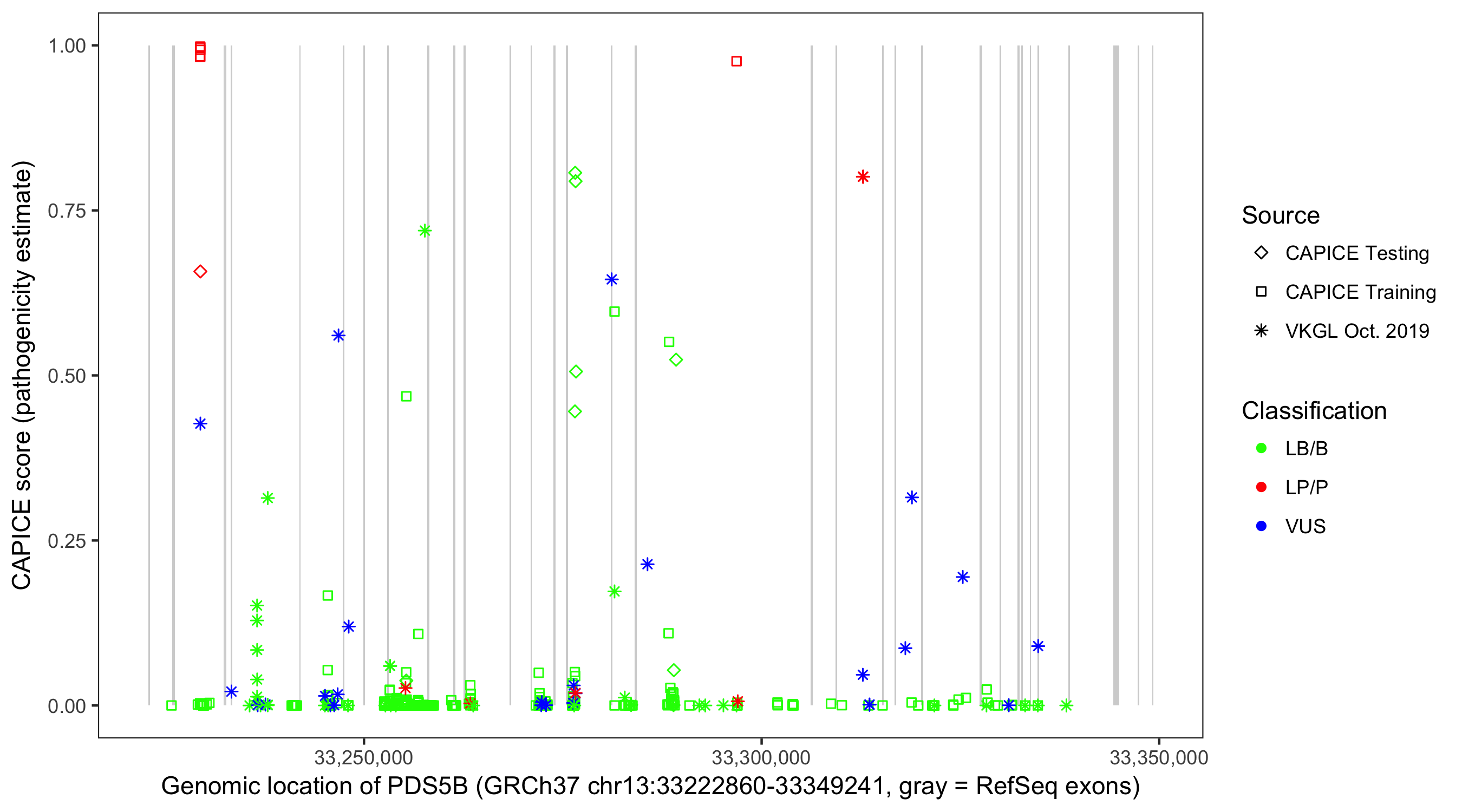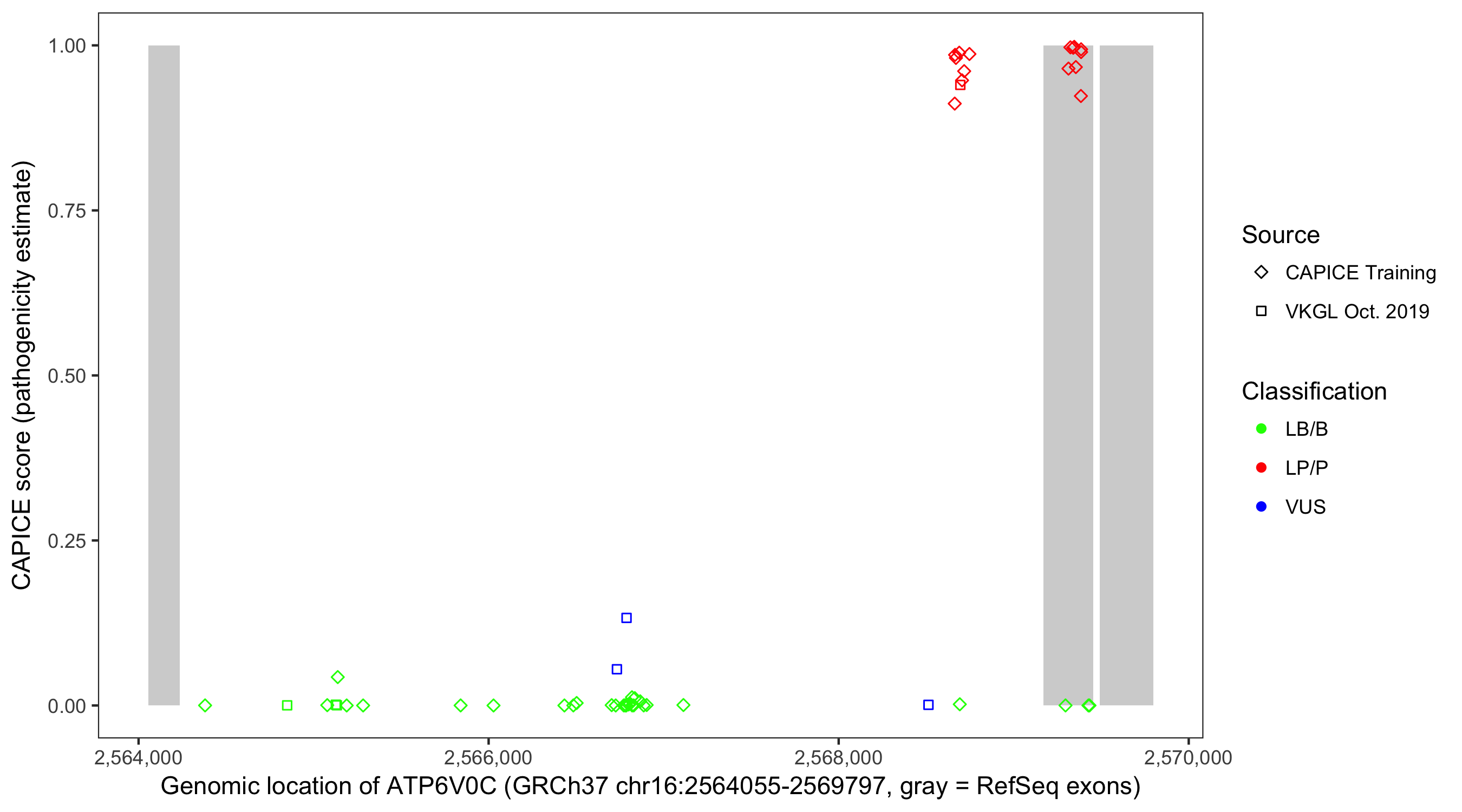 Shown are CAPICE train/test variants plus VKGL Oct 2019.