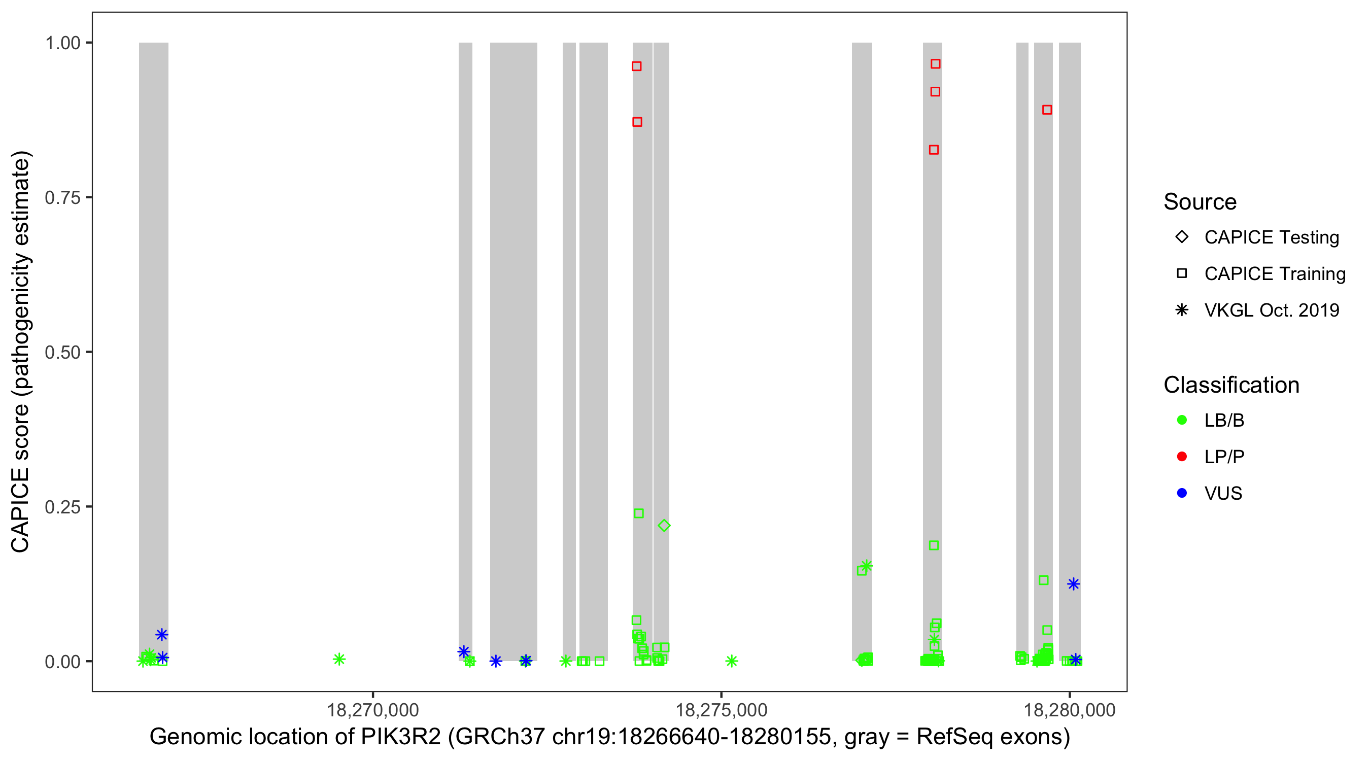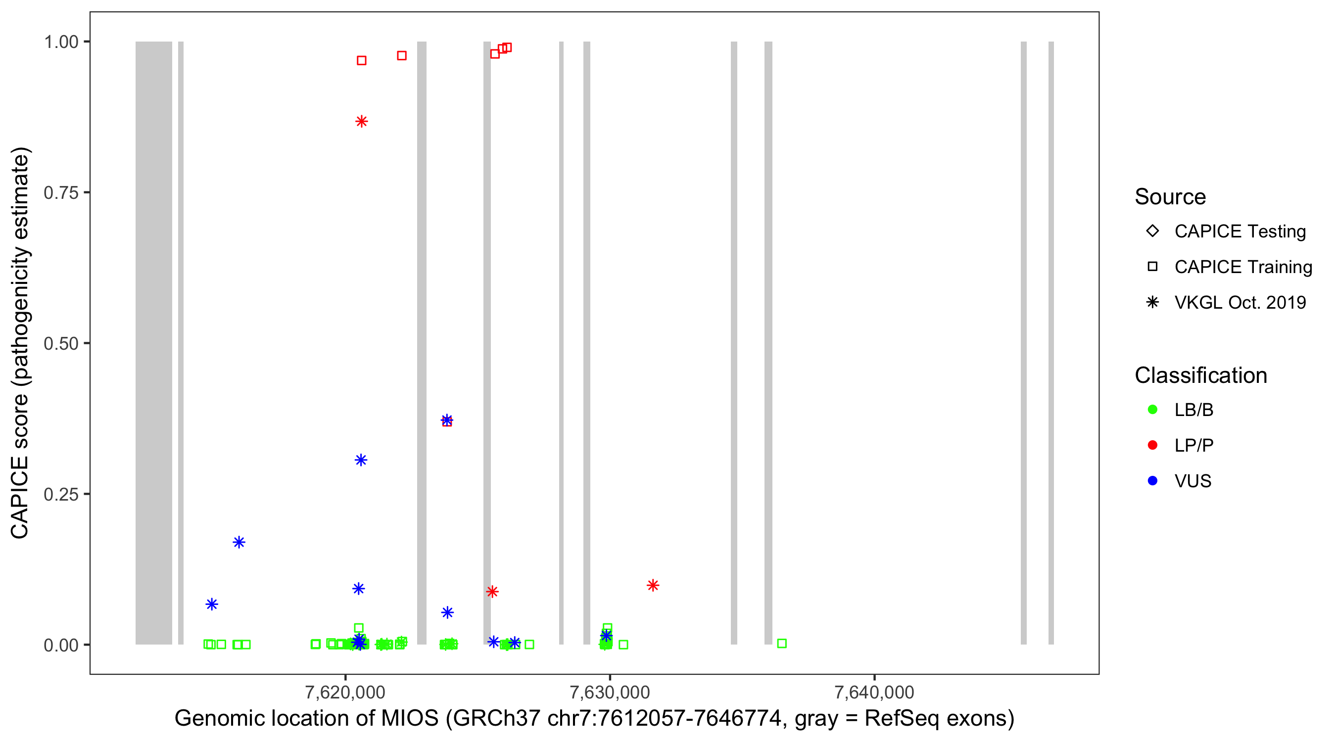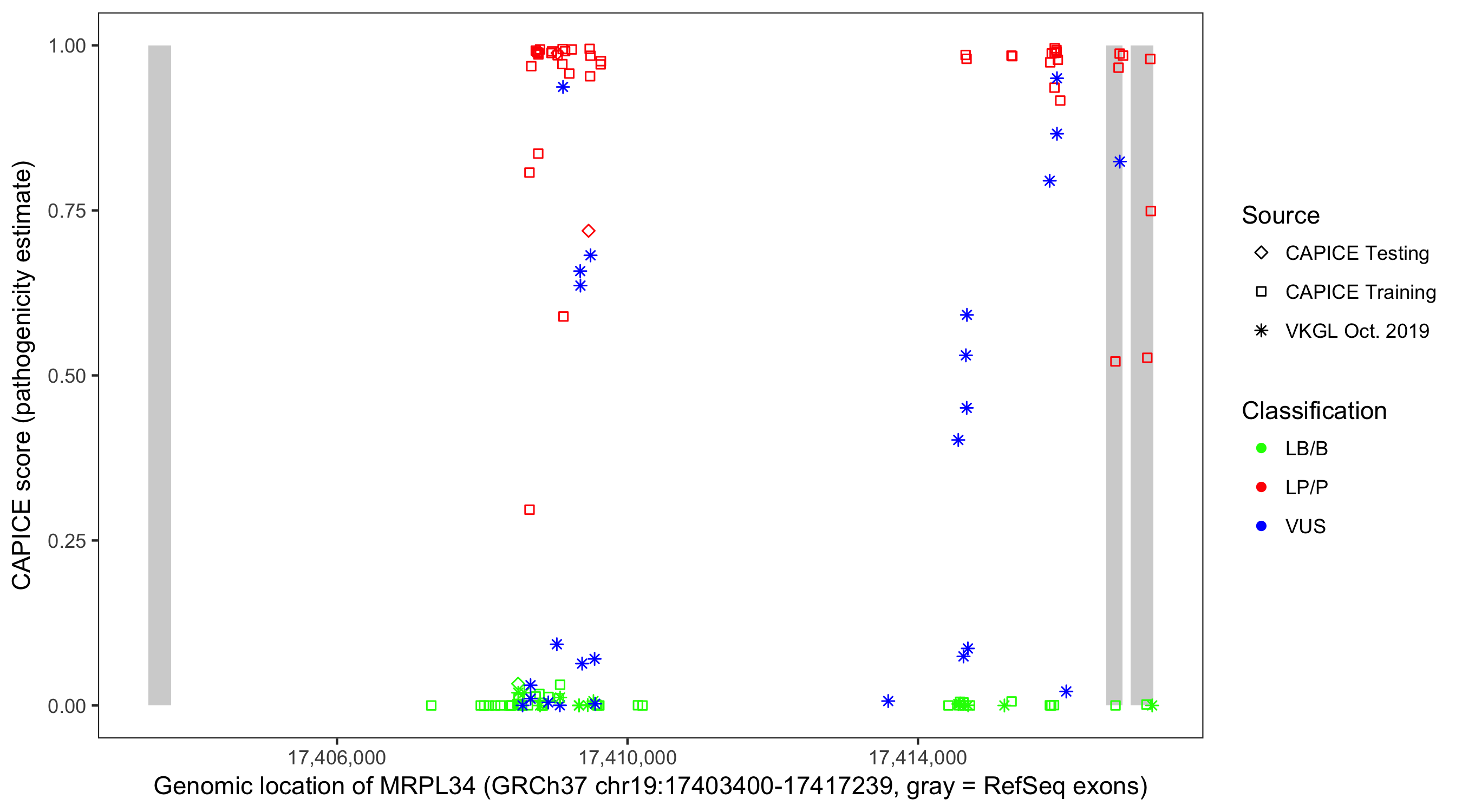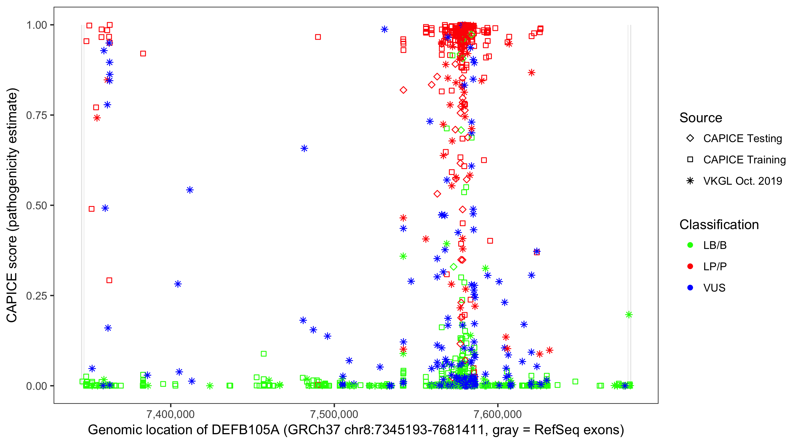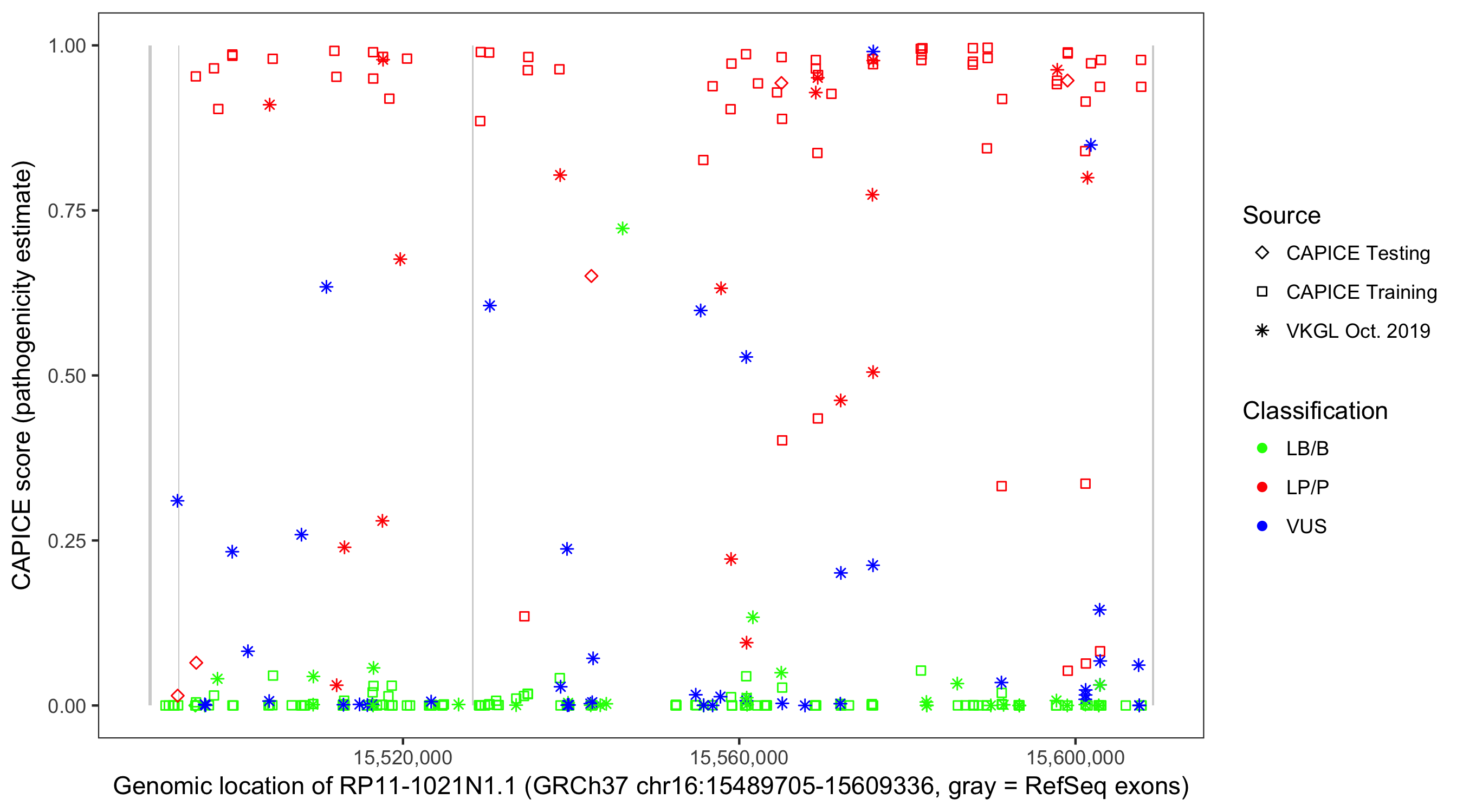 Shown are CAPICE train/test variants plus VKGL Oct 2019.