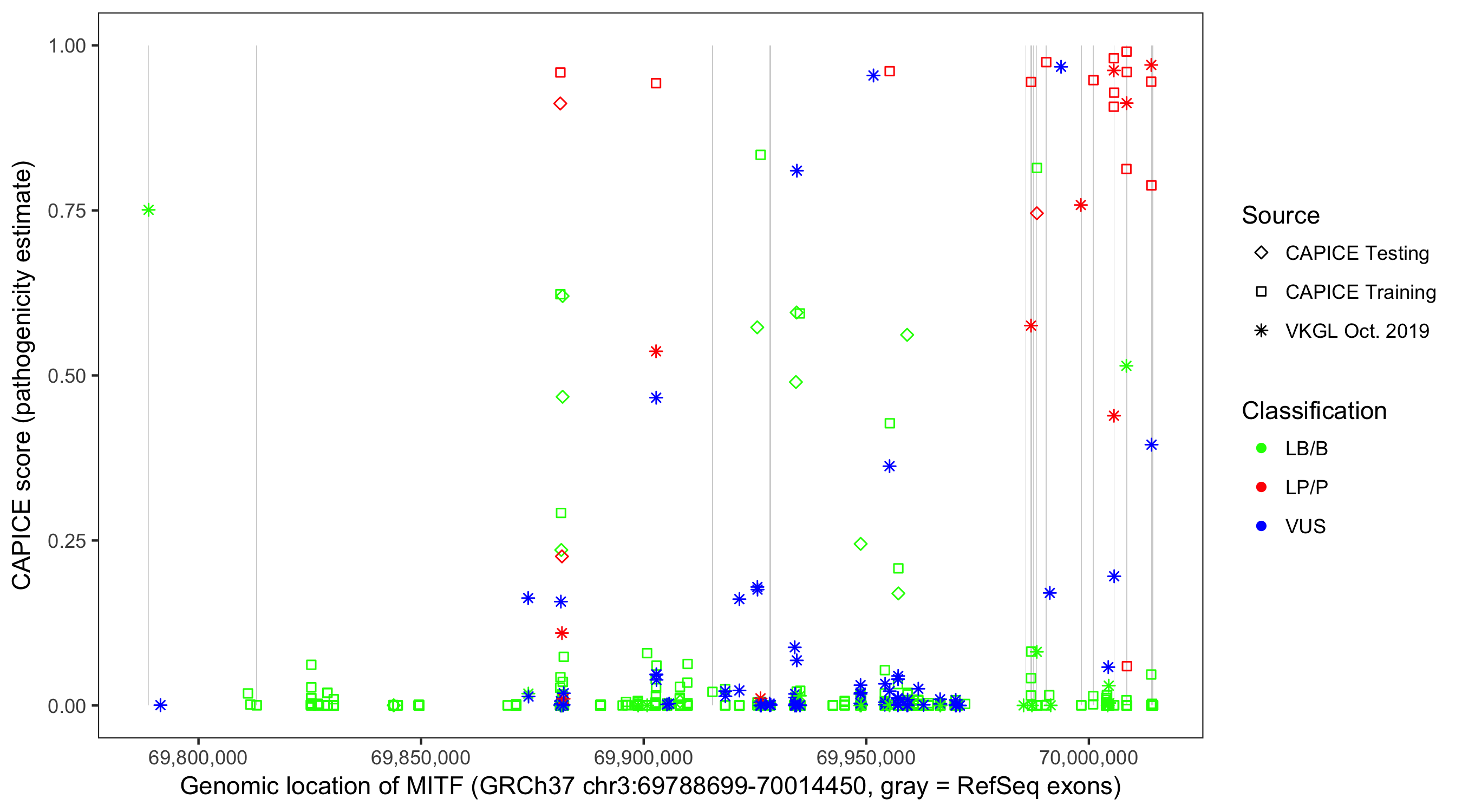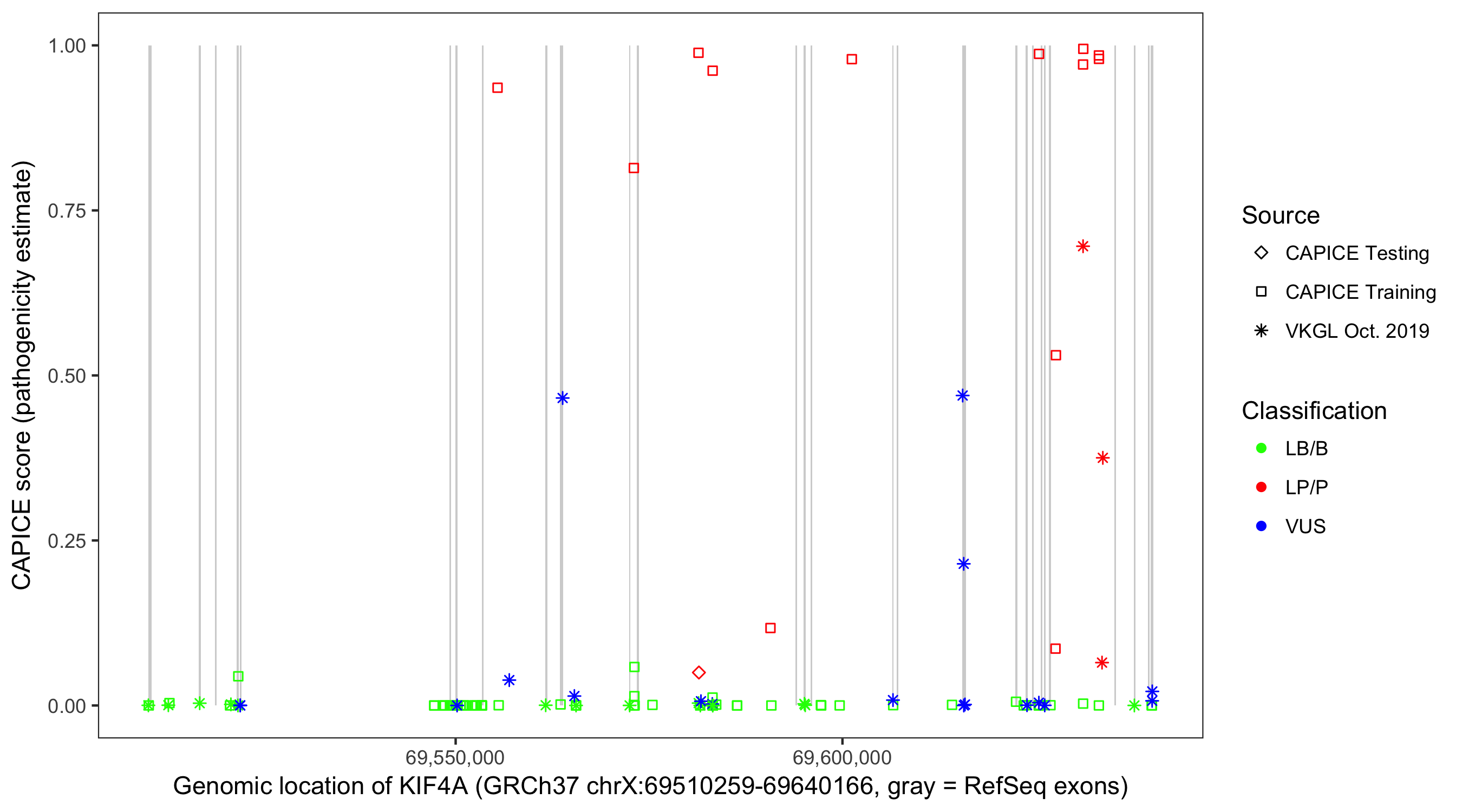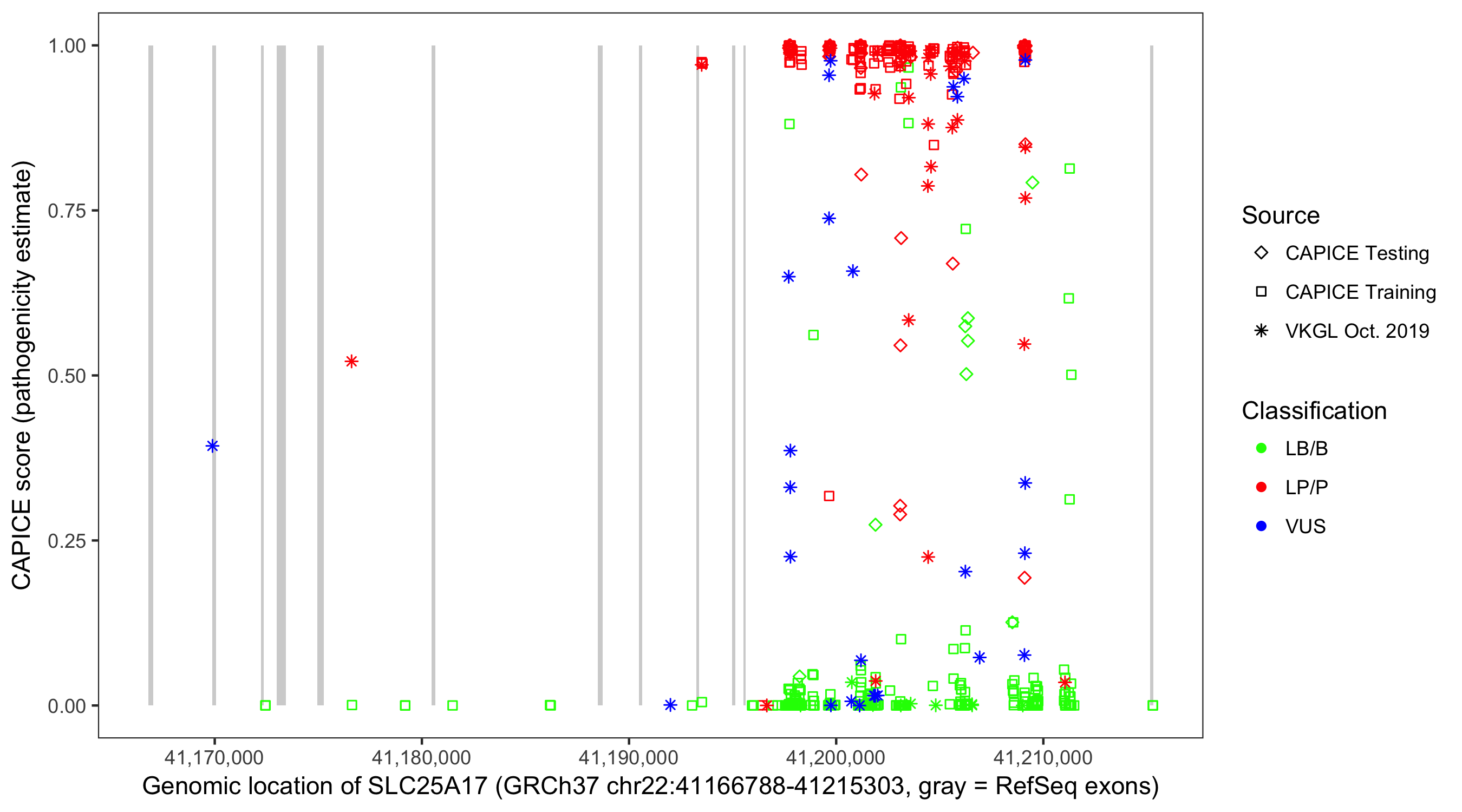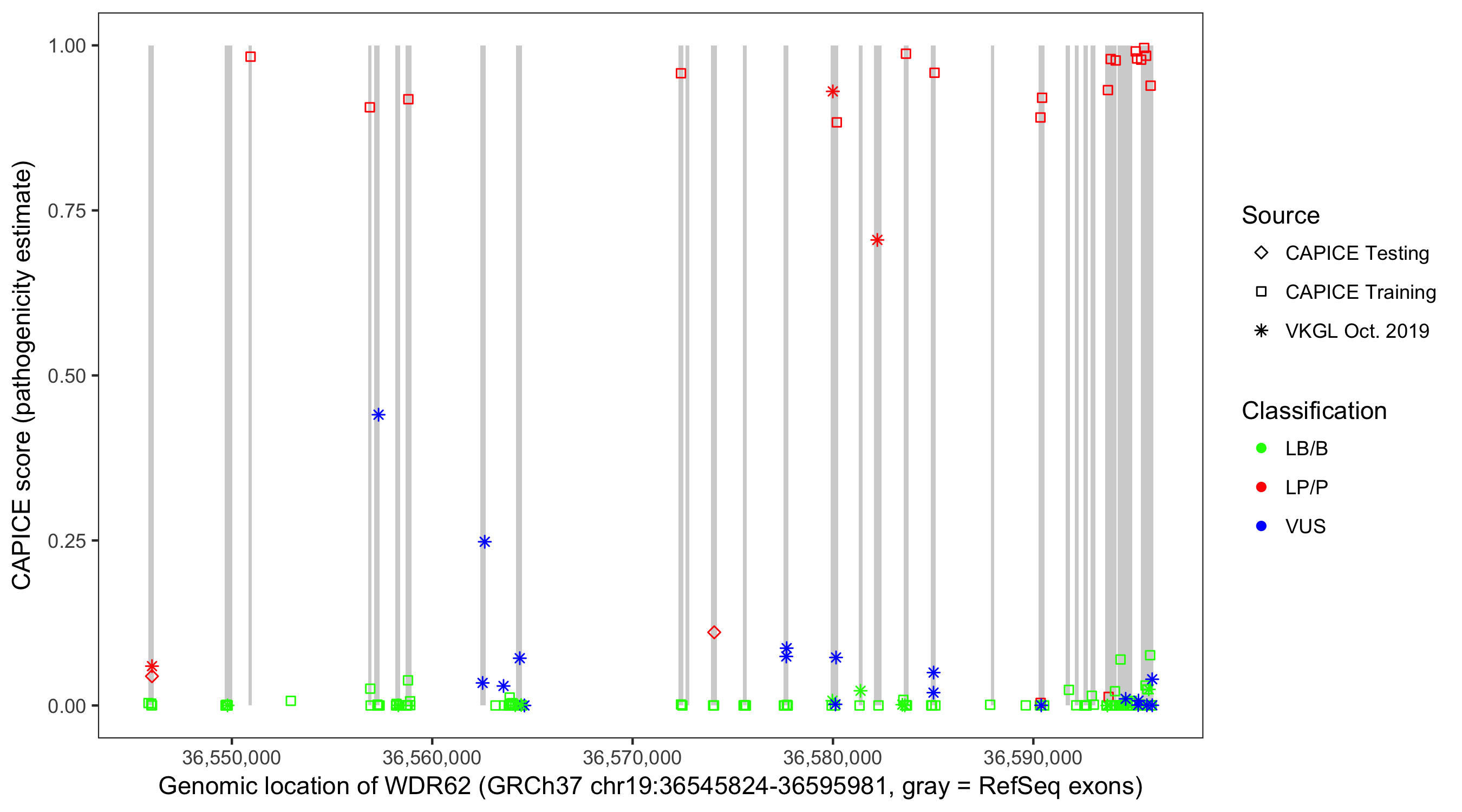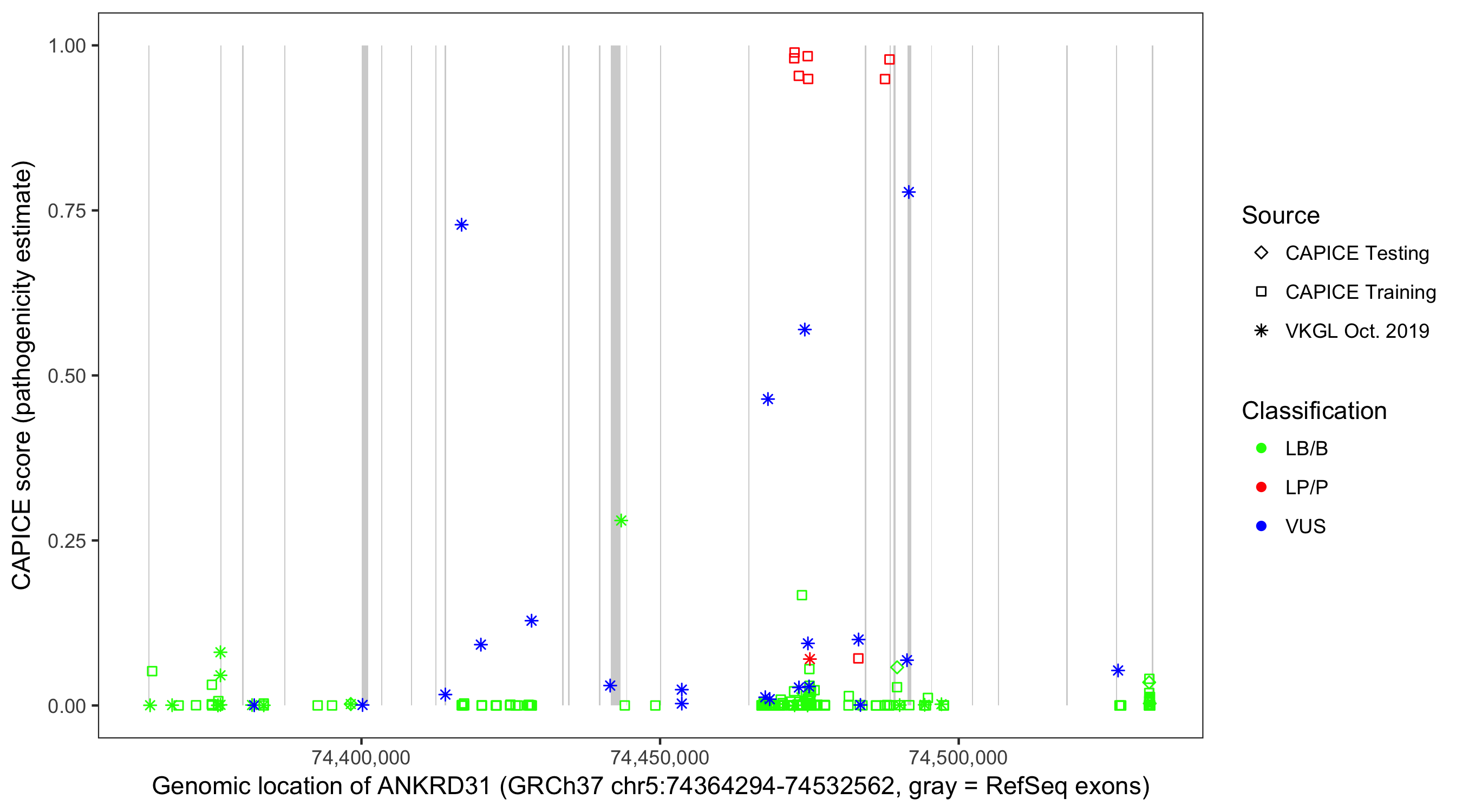 Shown are CAPICE train/test variants plus VKGL Oct 2019.