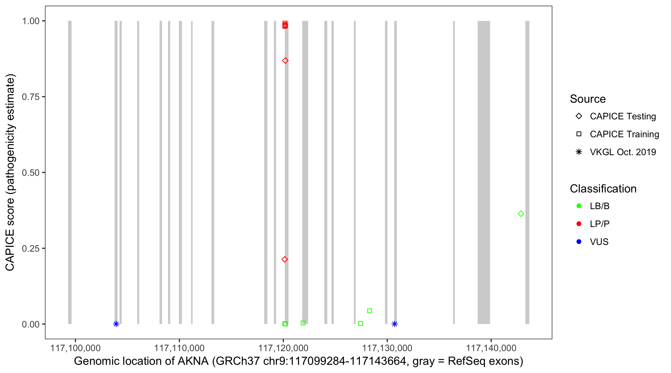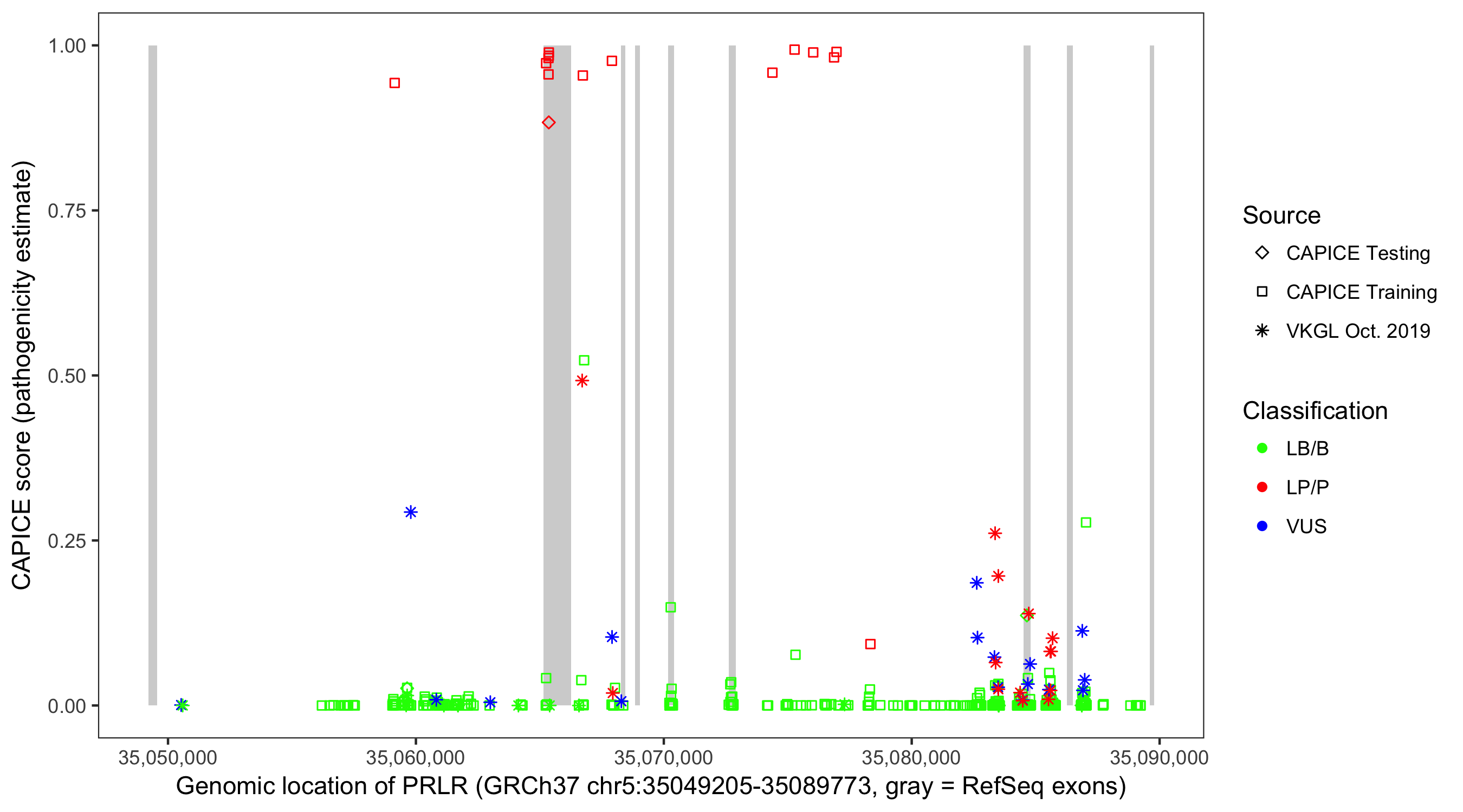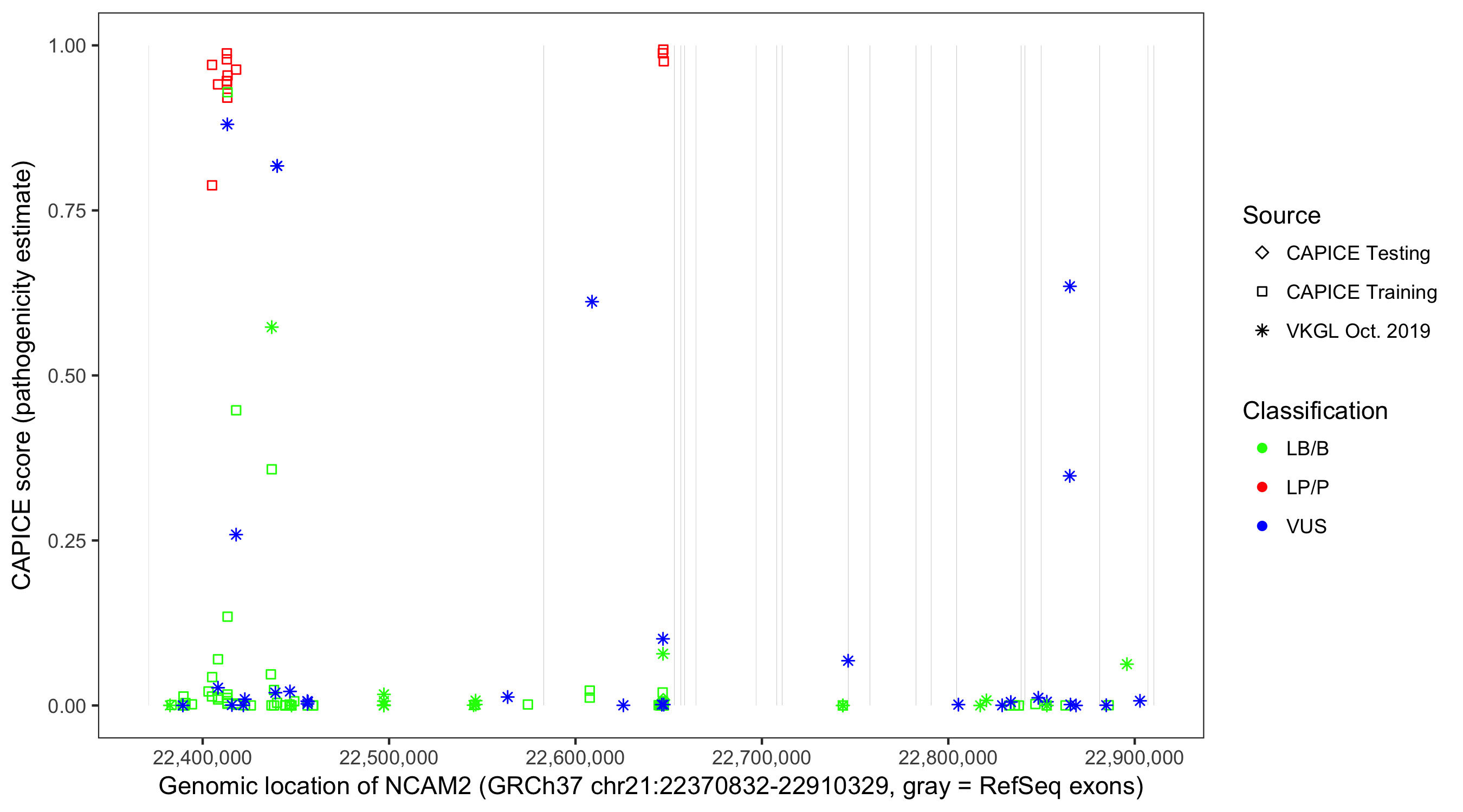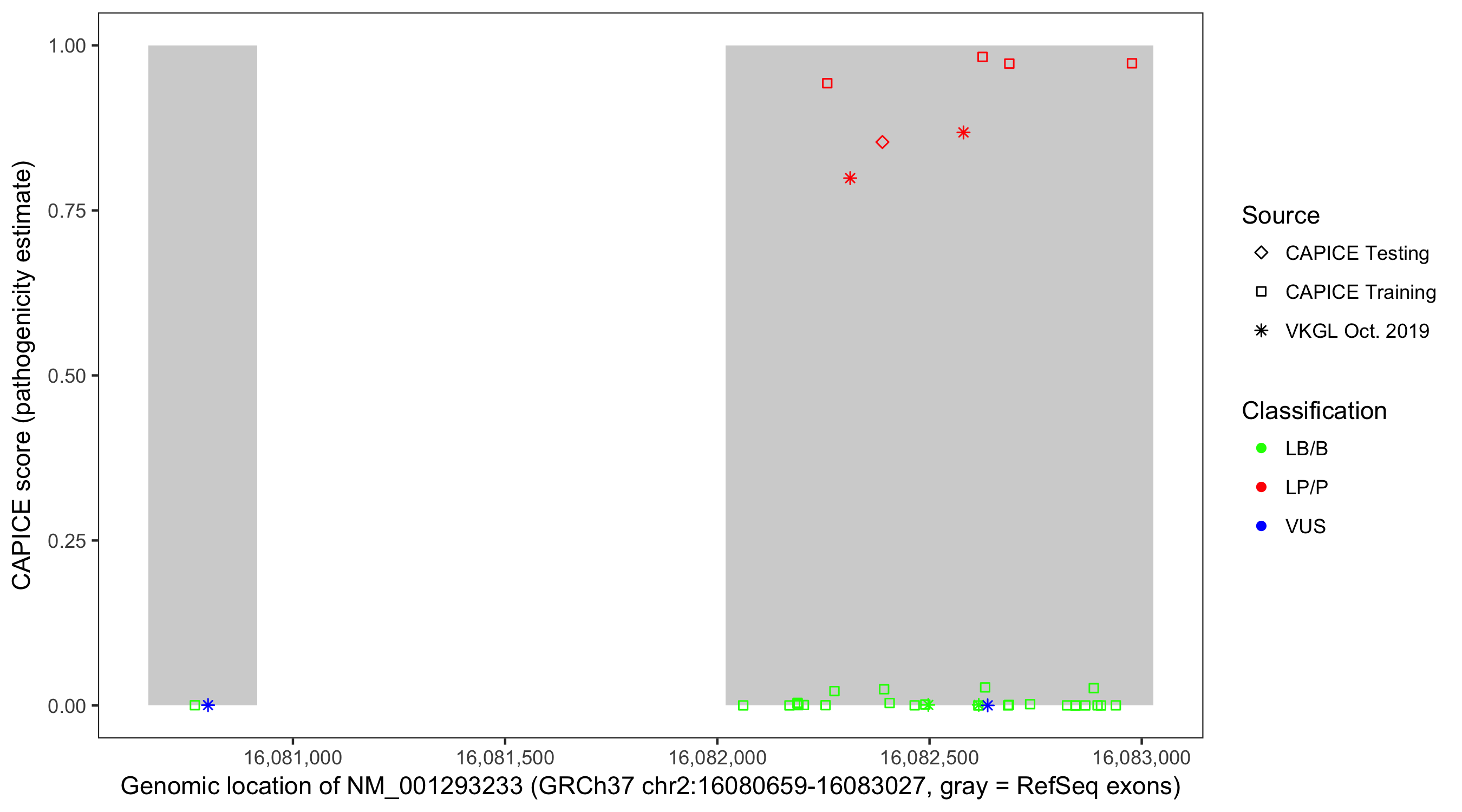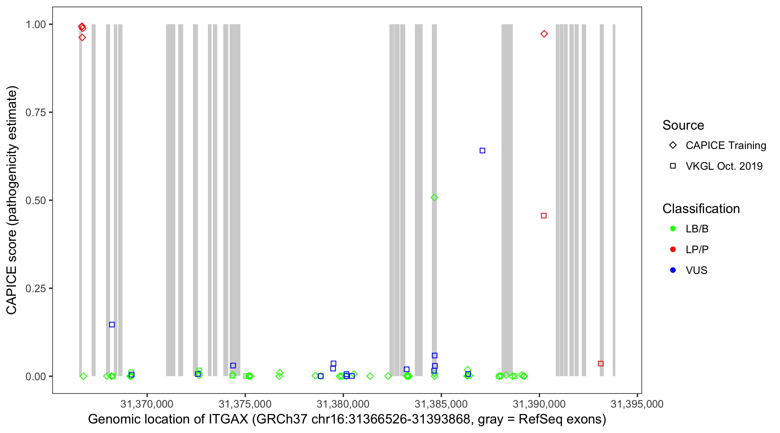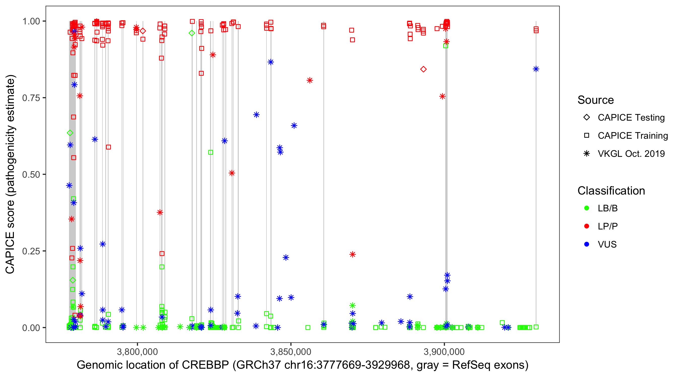 Shown are CAPICE train/test variants plus VKGL Oct 2019.