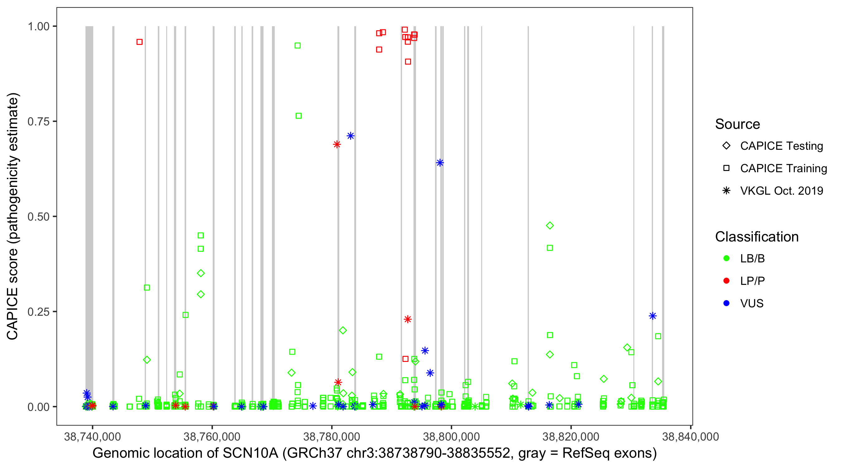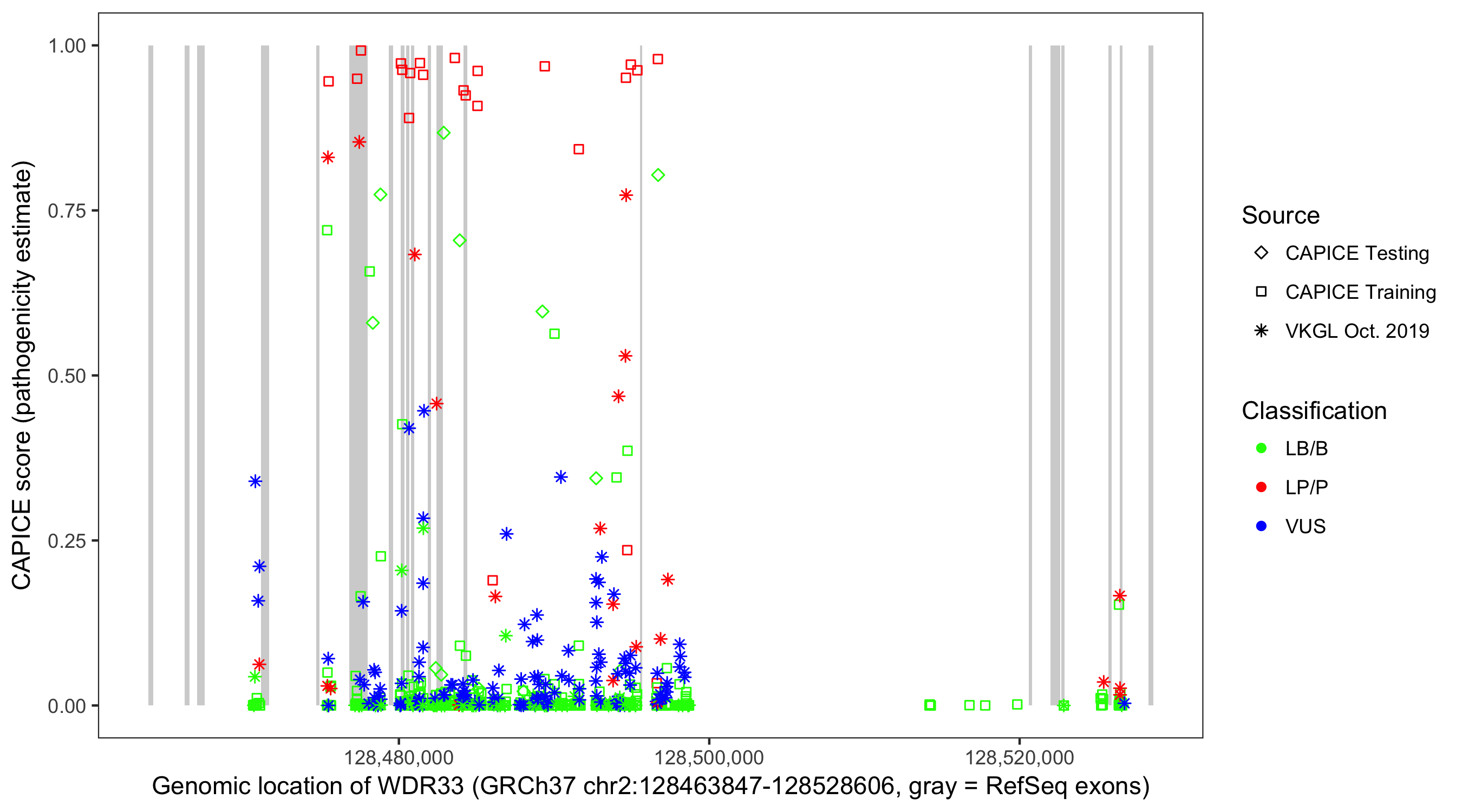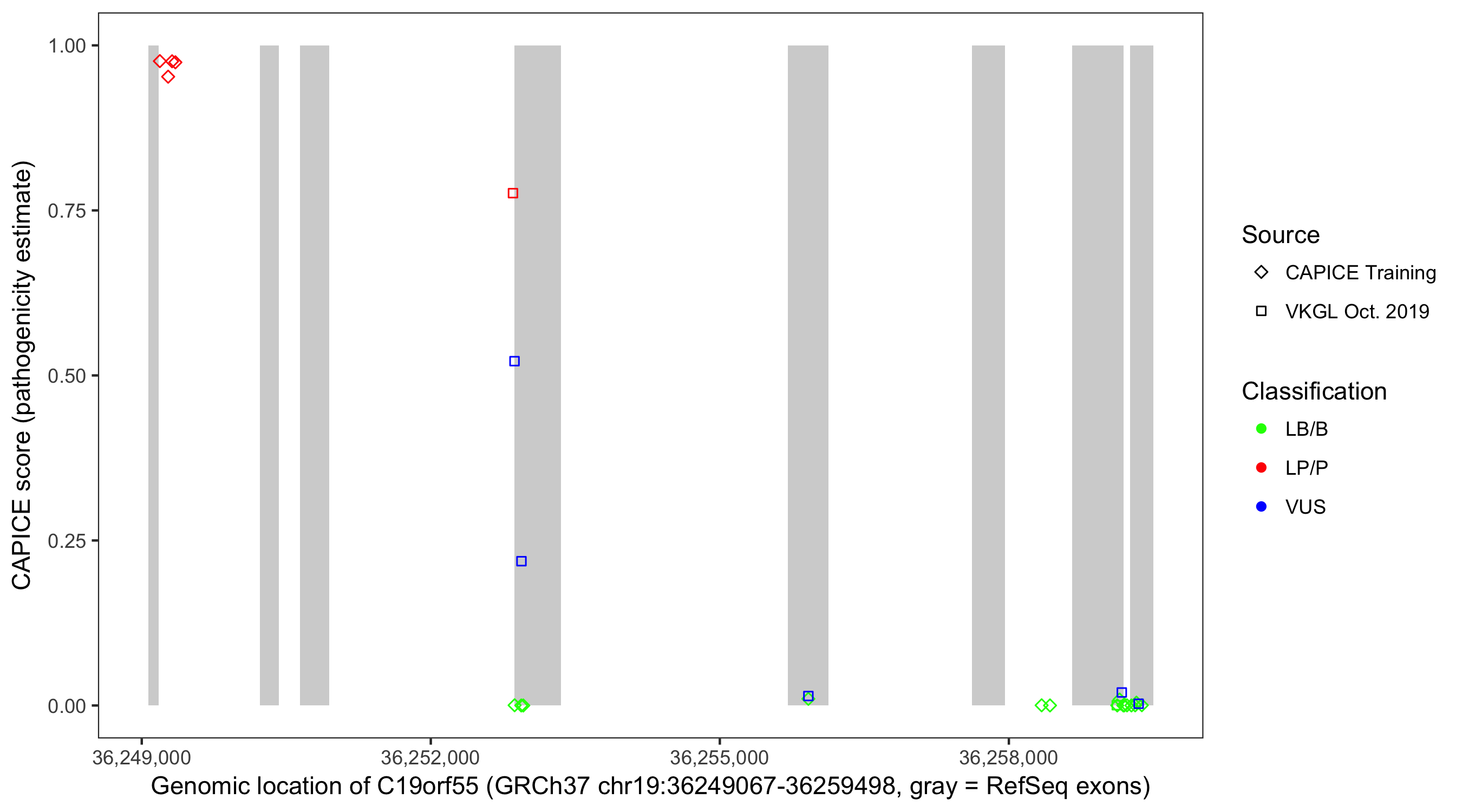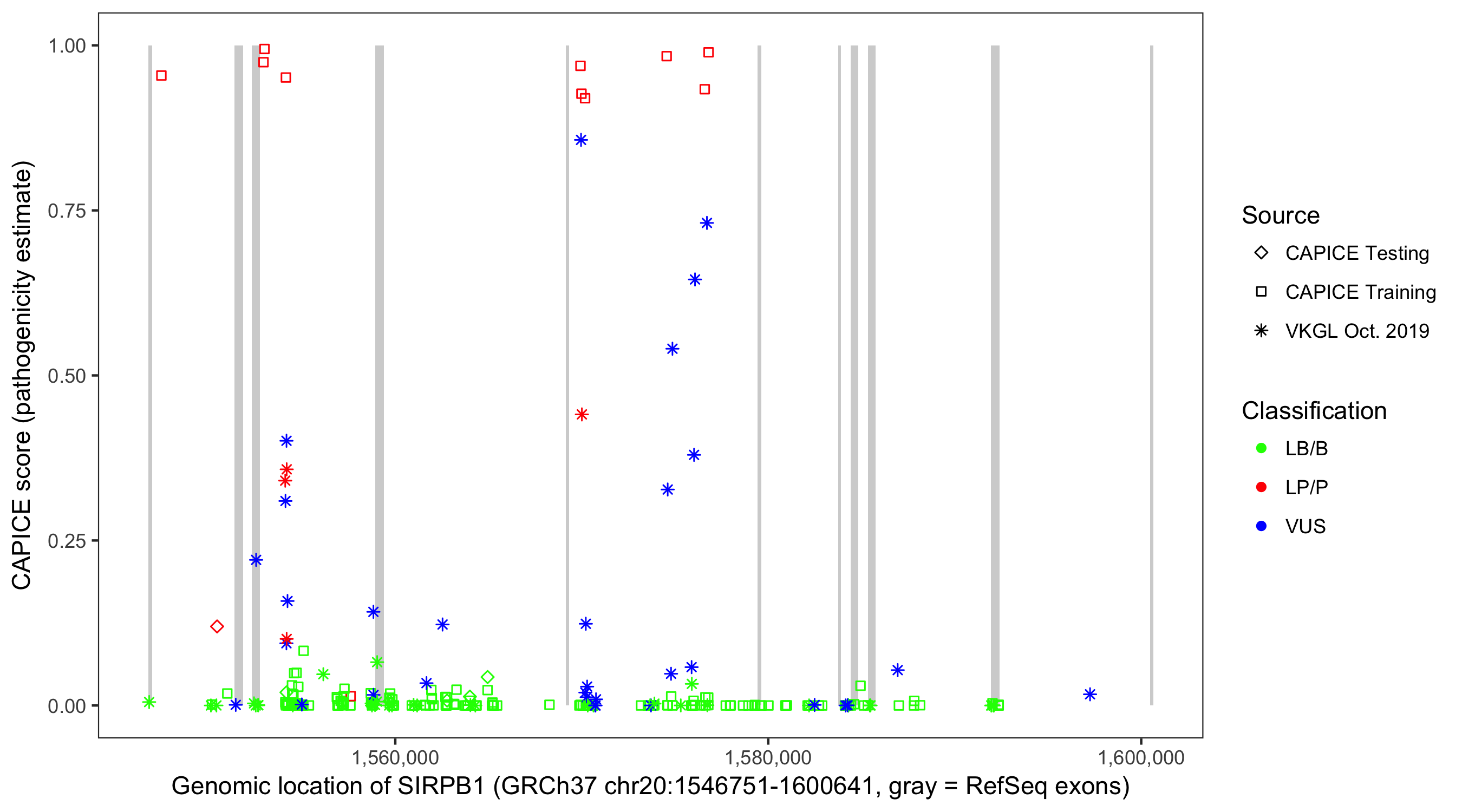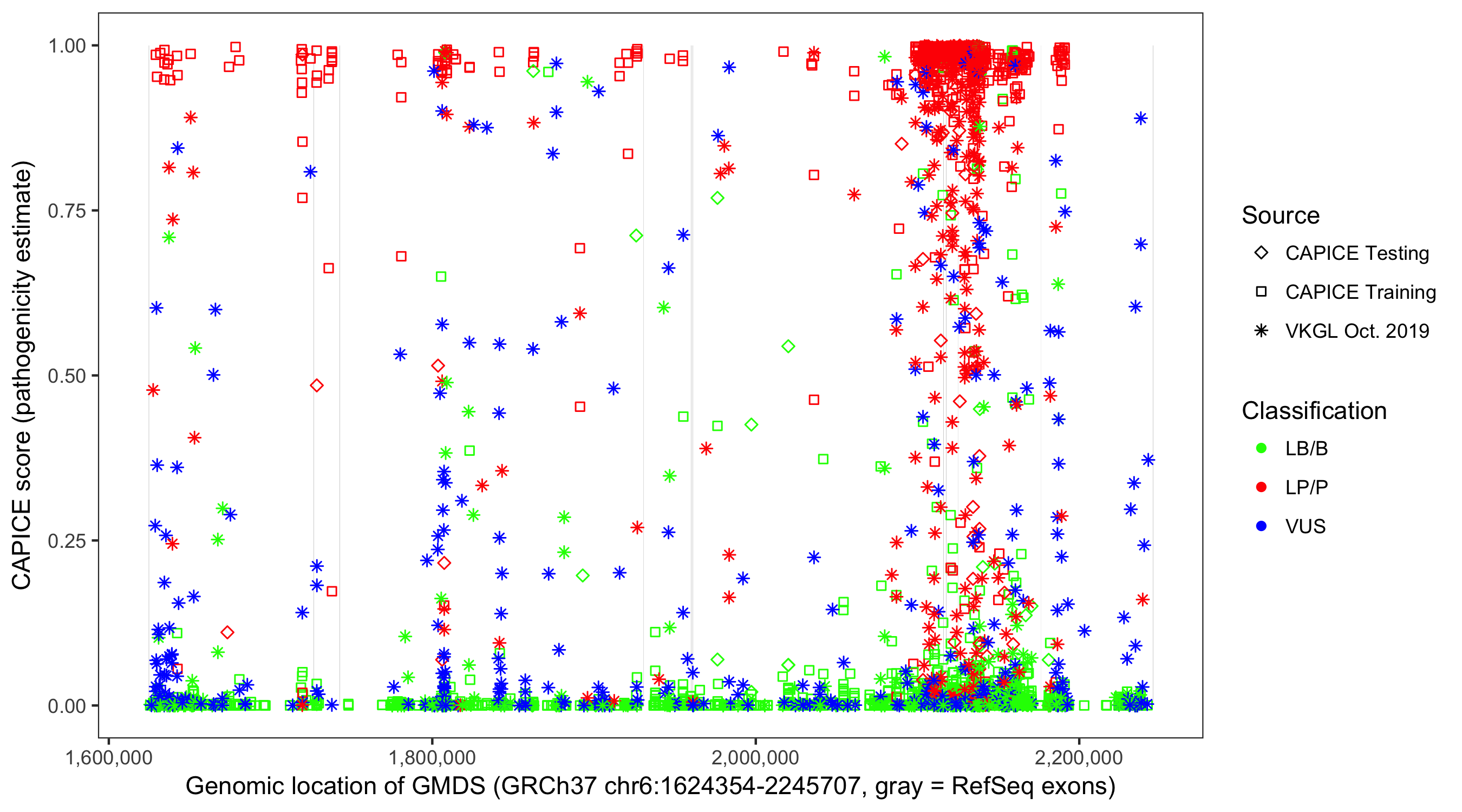 Shown are CAPICE train/test variants plus VKGL Oct 2019.