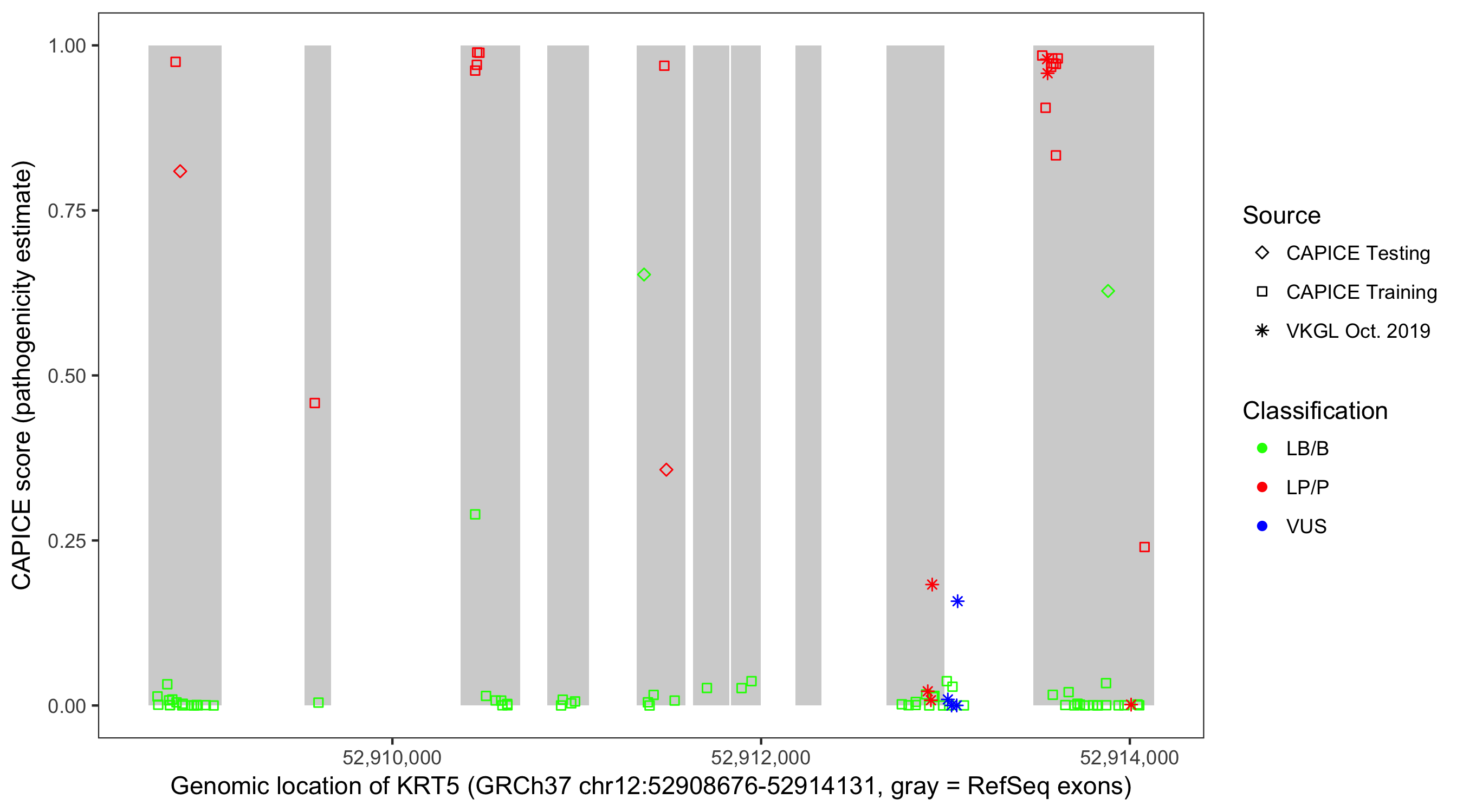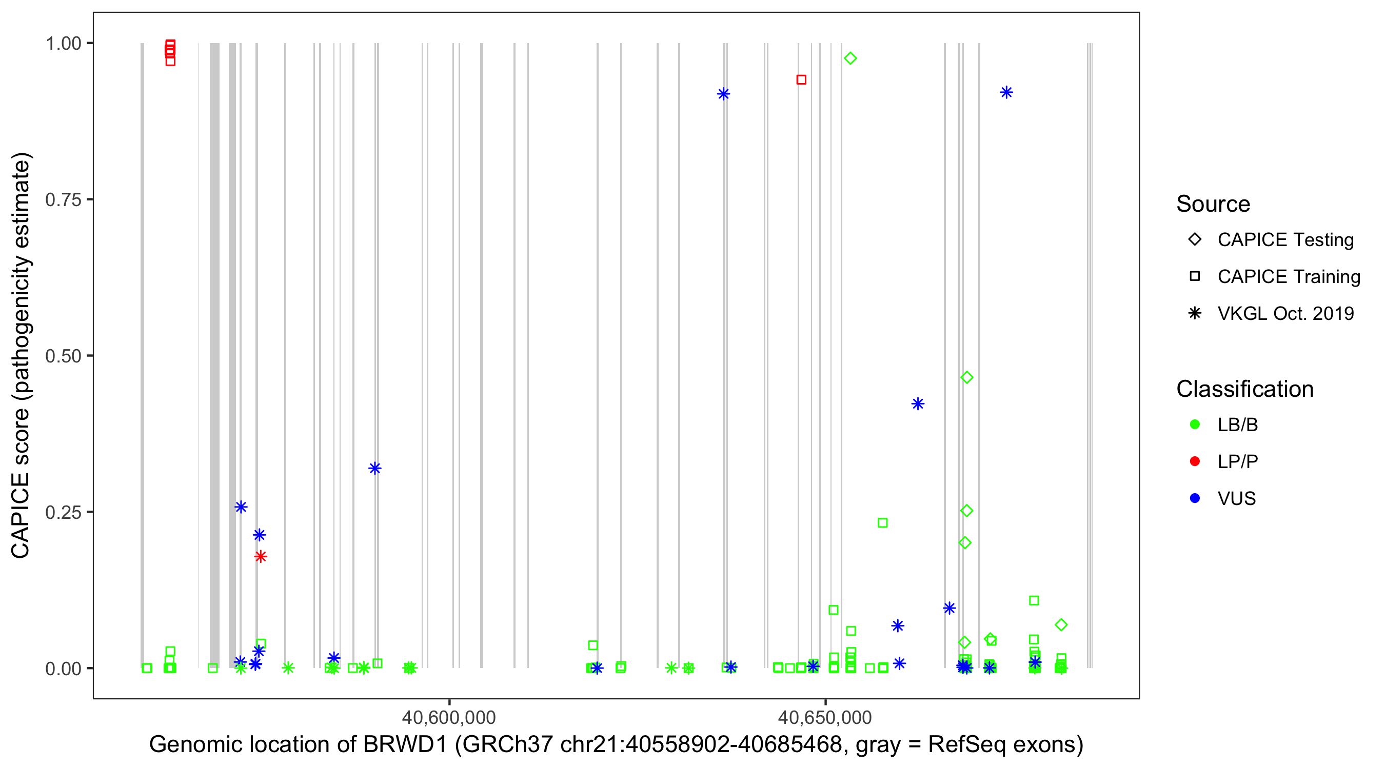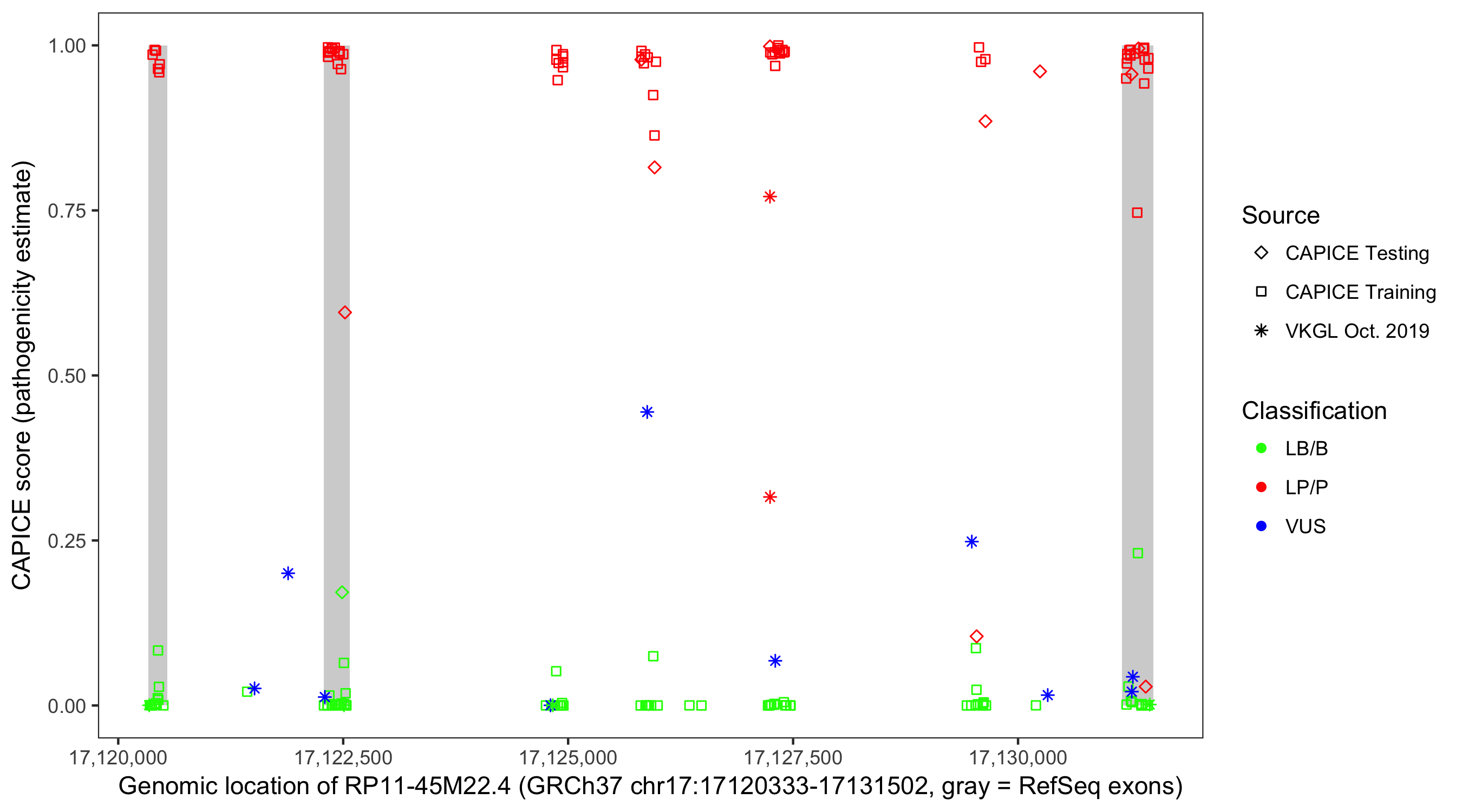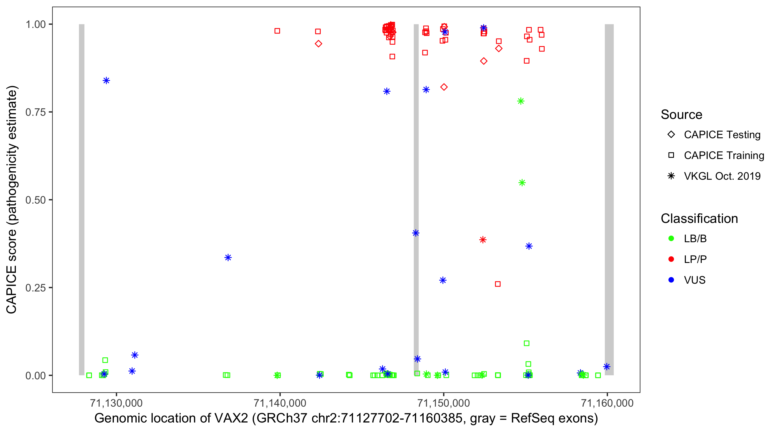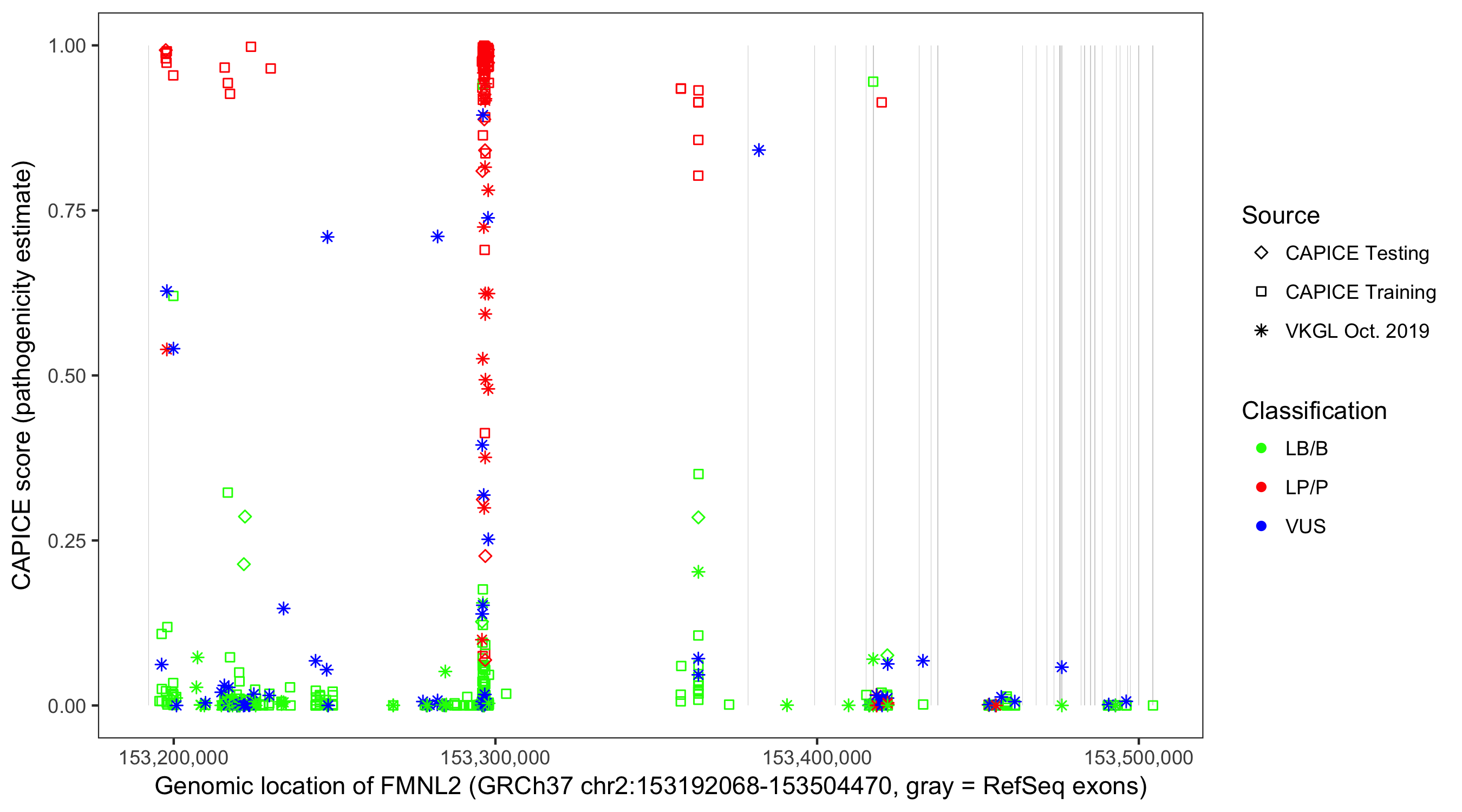 Shown are CAPICE train/test variants plus VKGL Oct 2019.