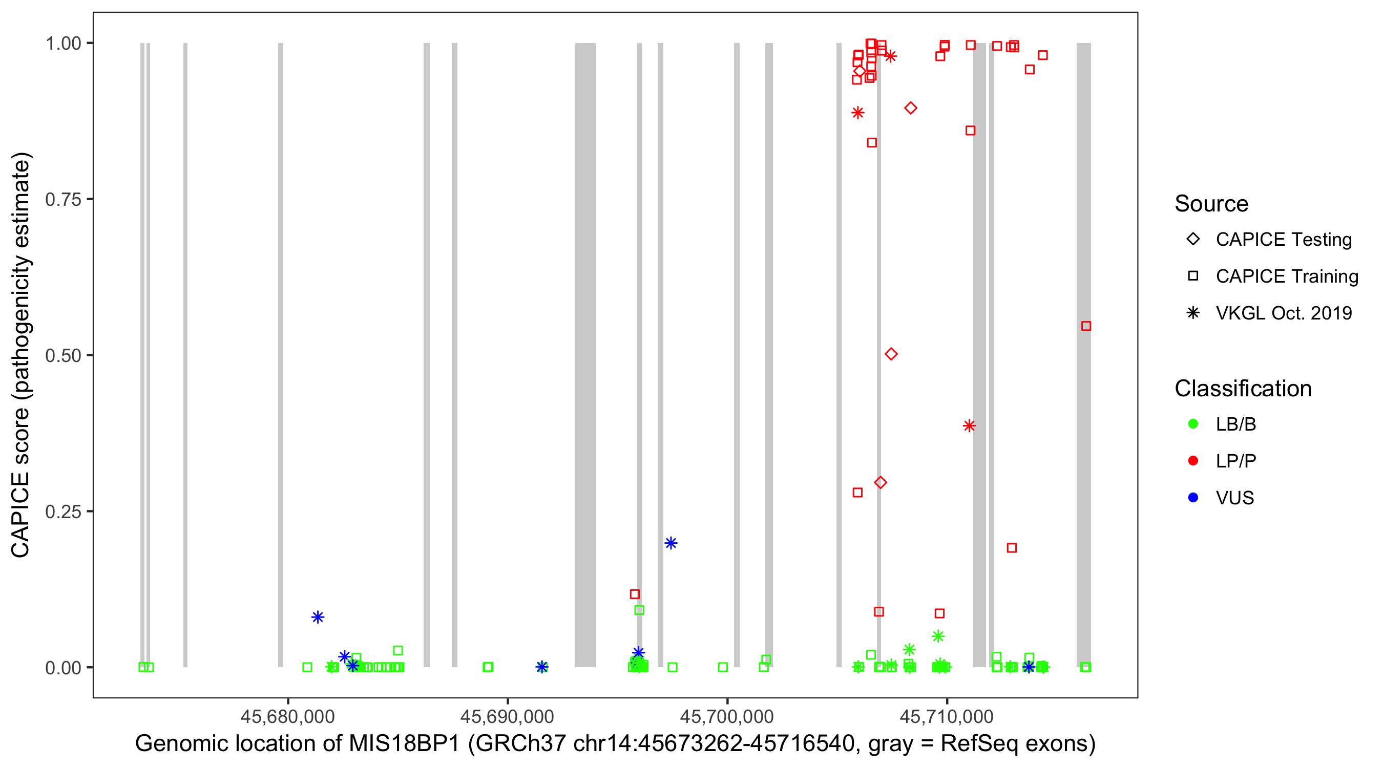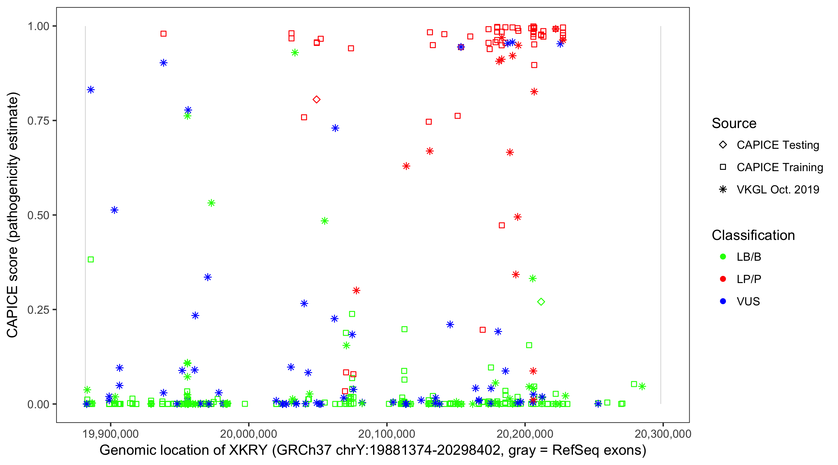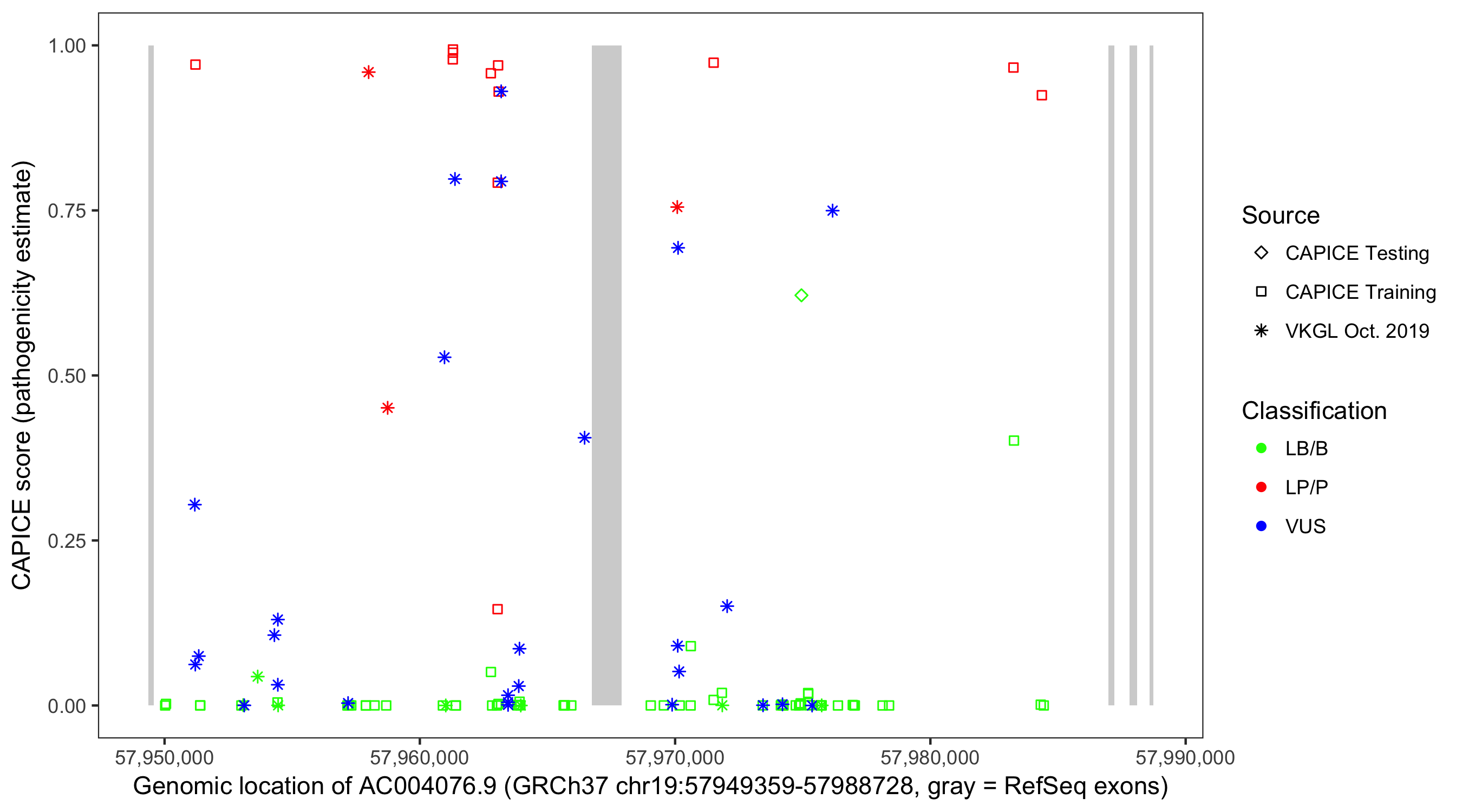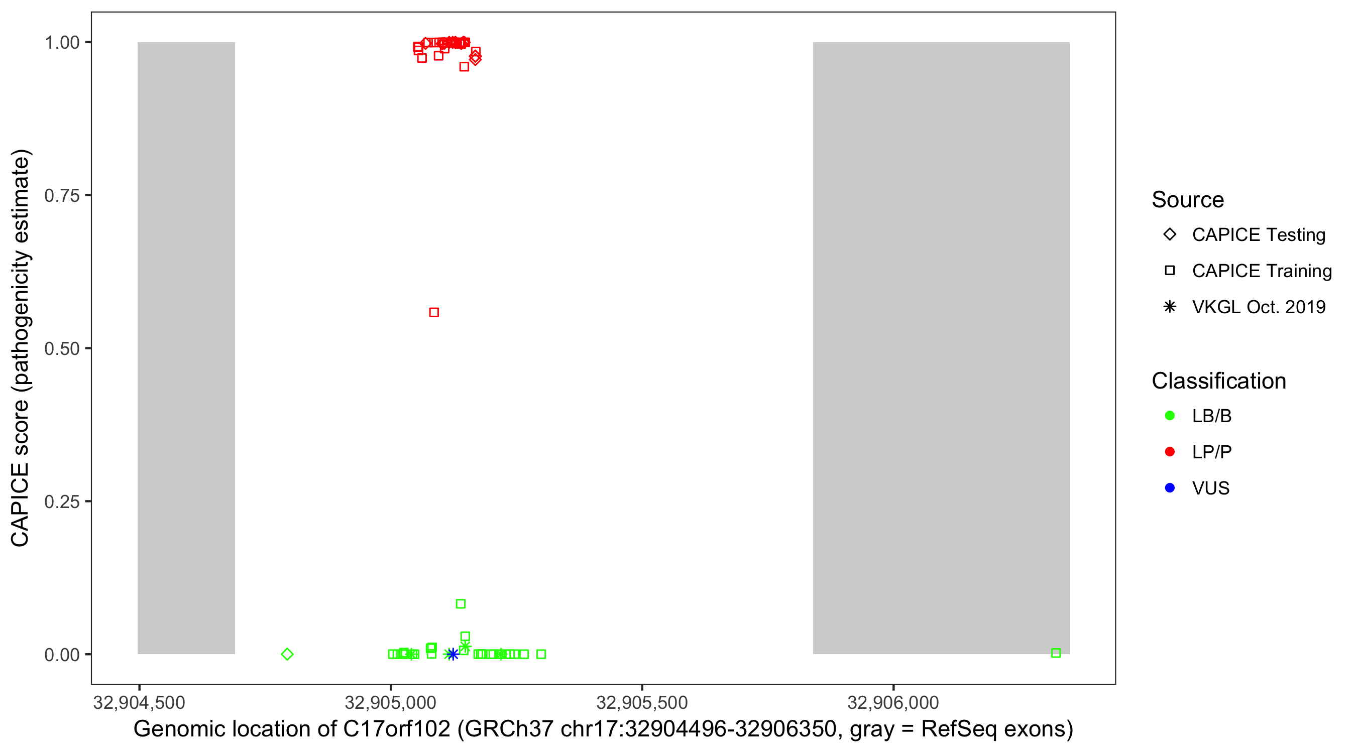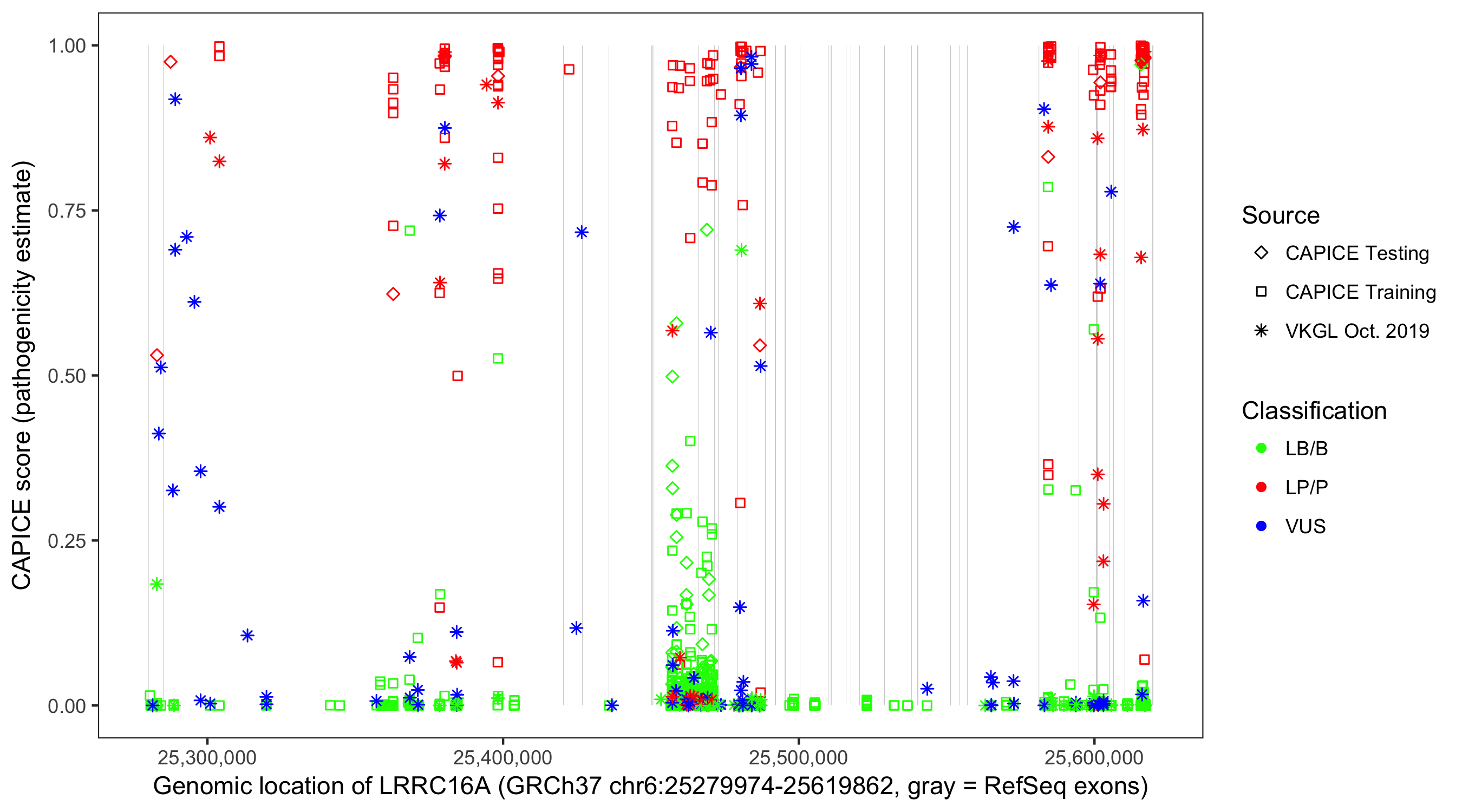Shown are CAPICE train/test variants plus VKGL Oct 2019.