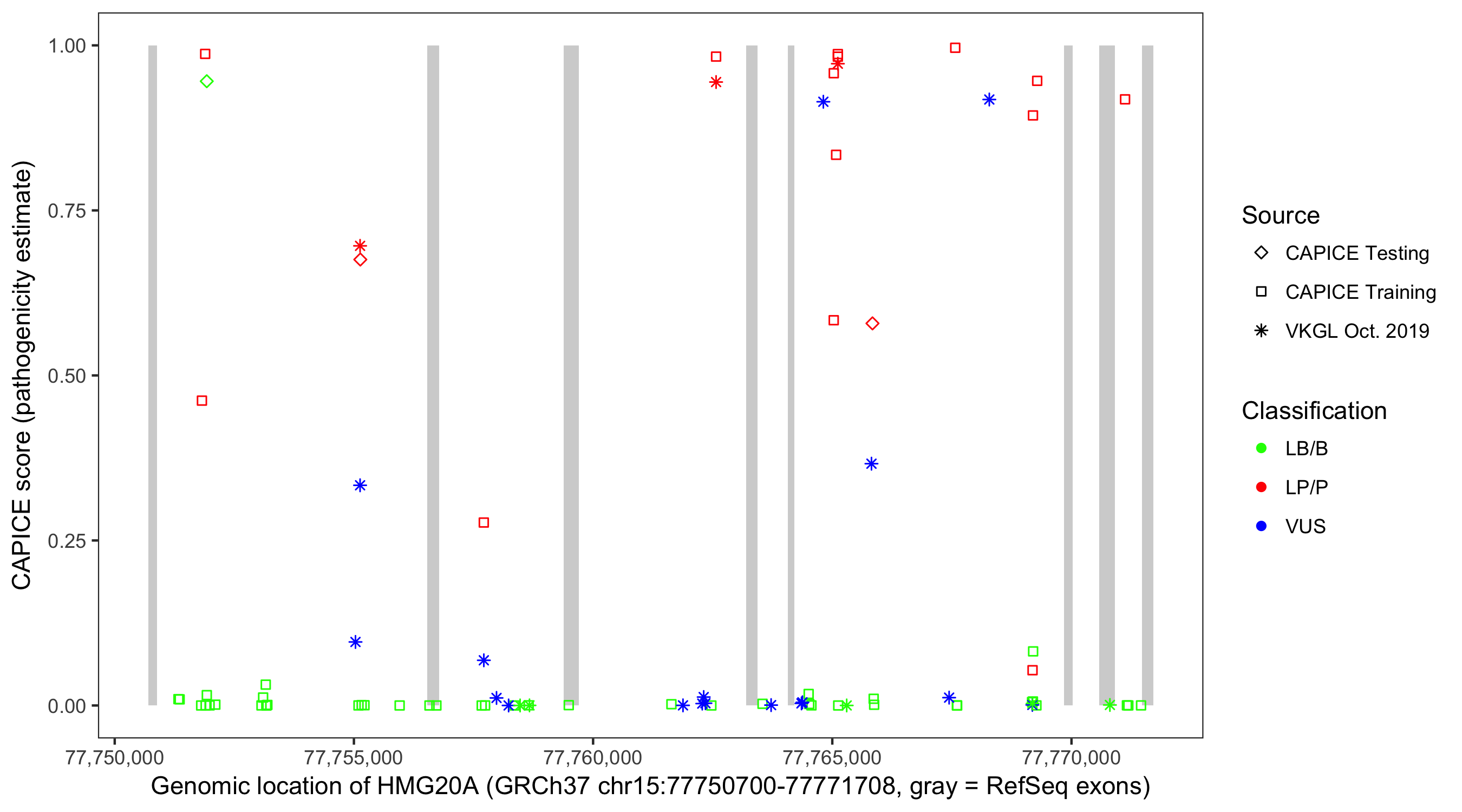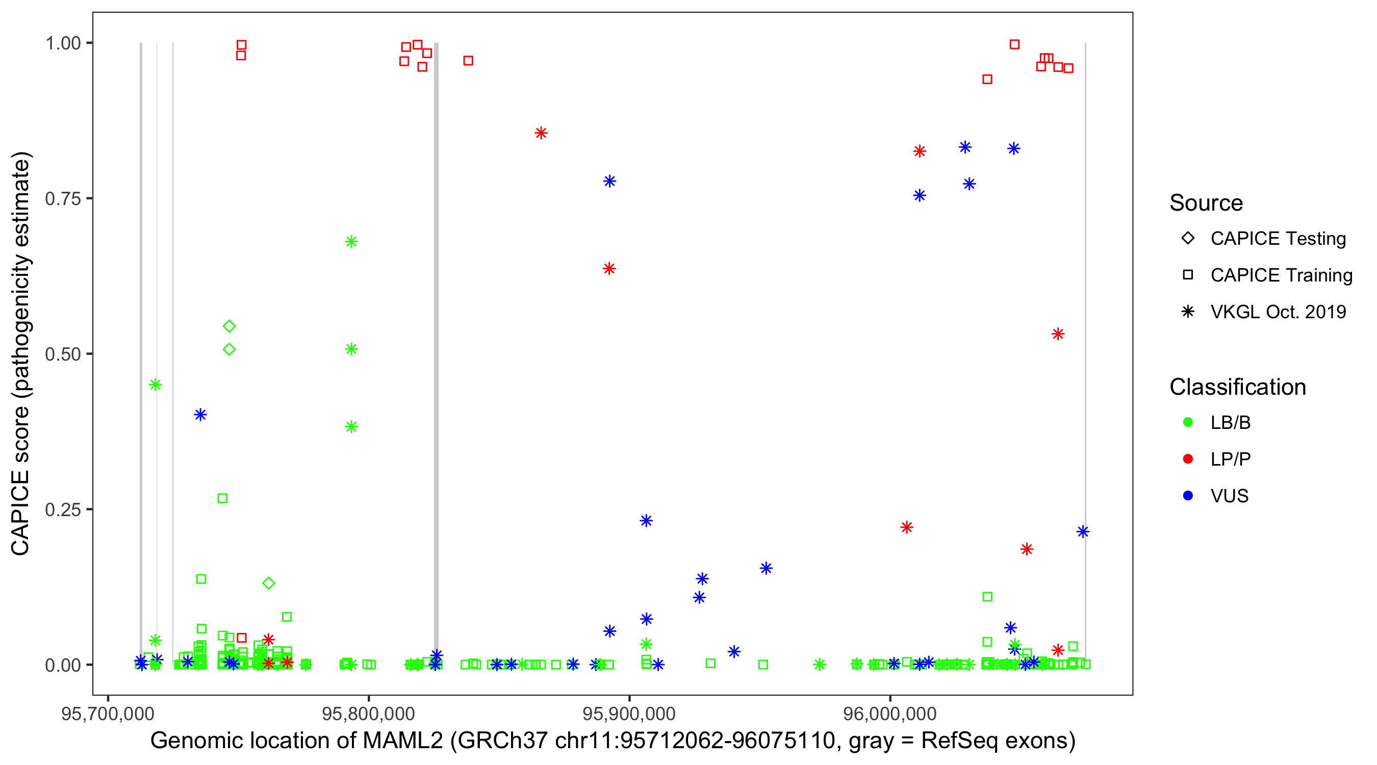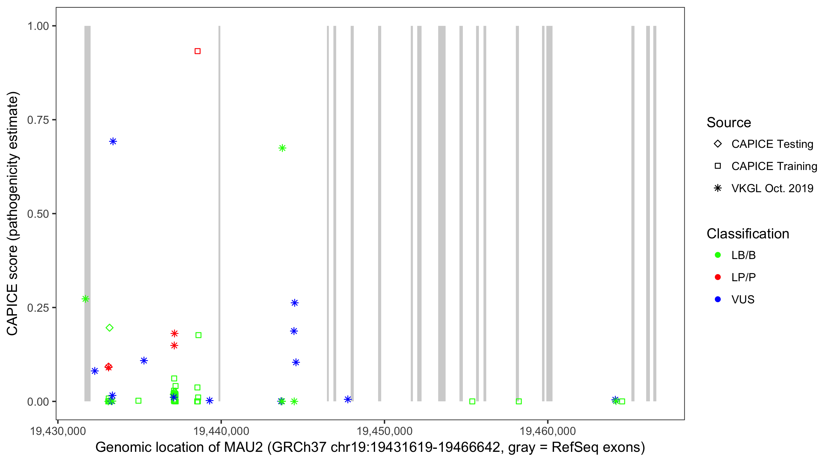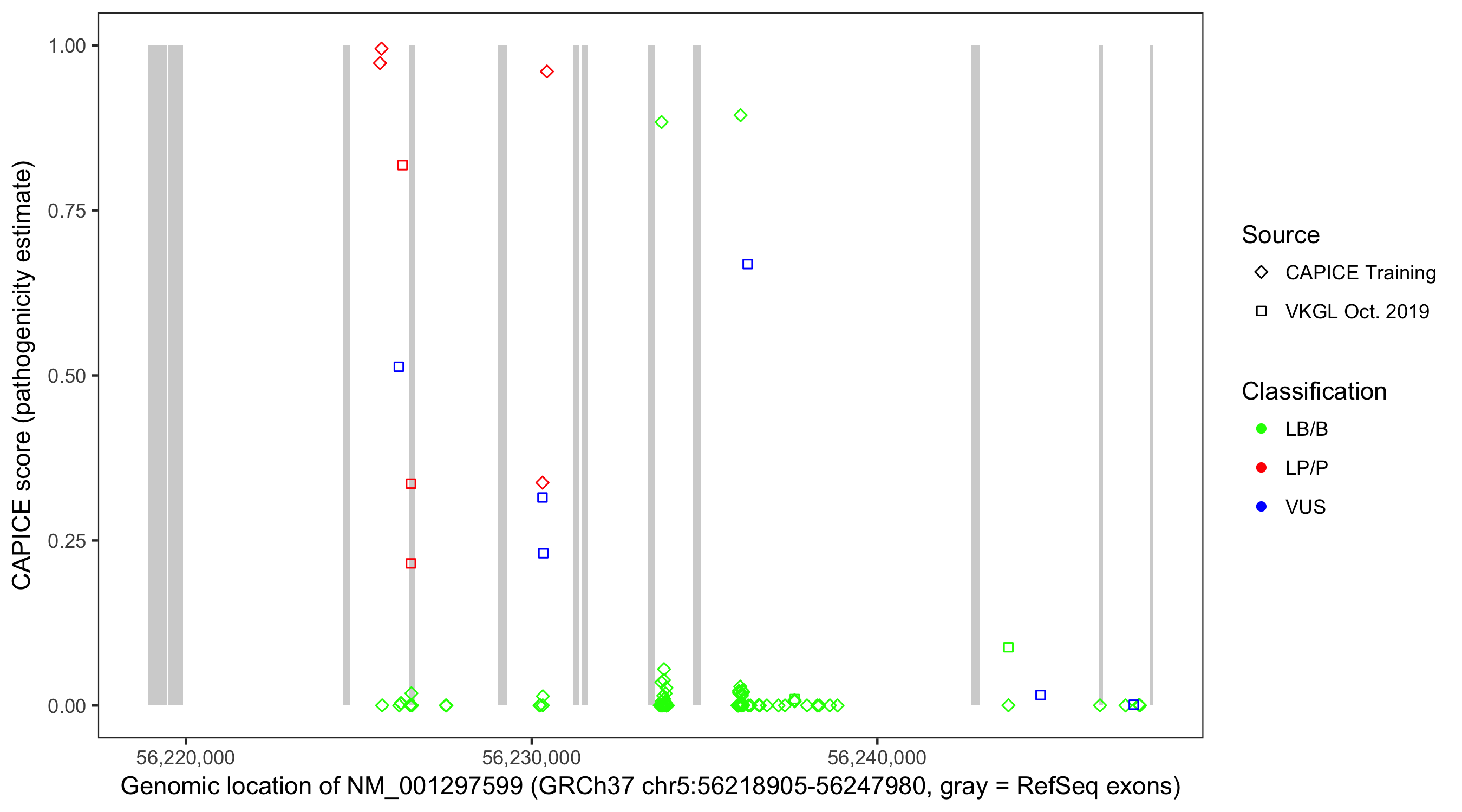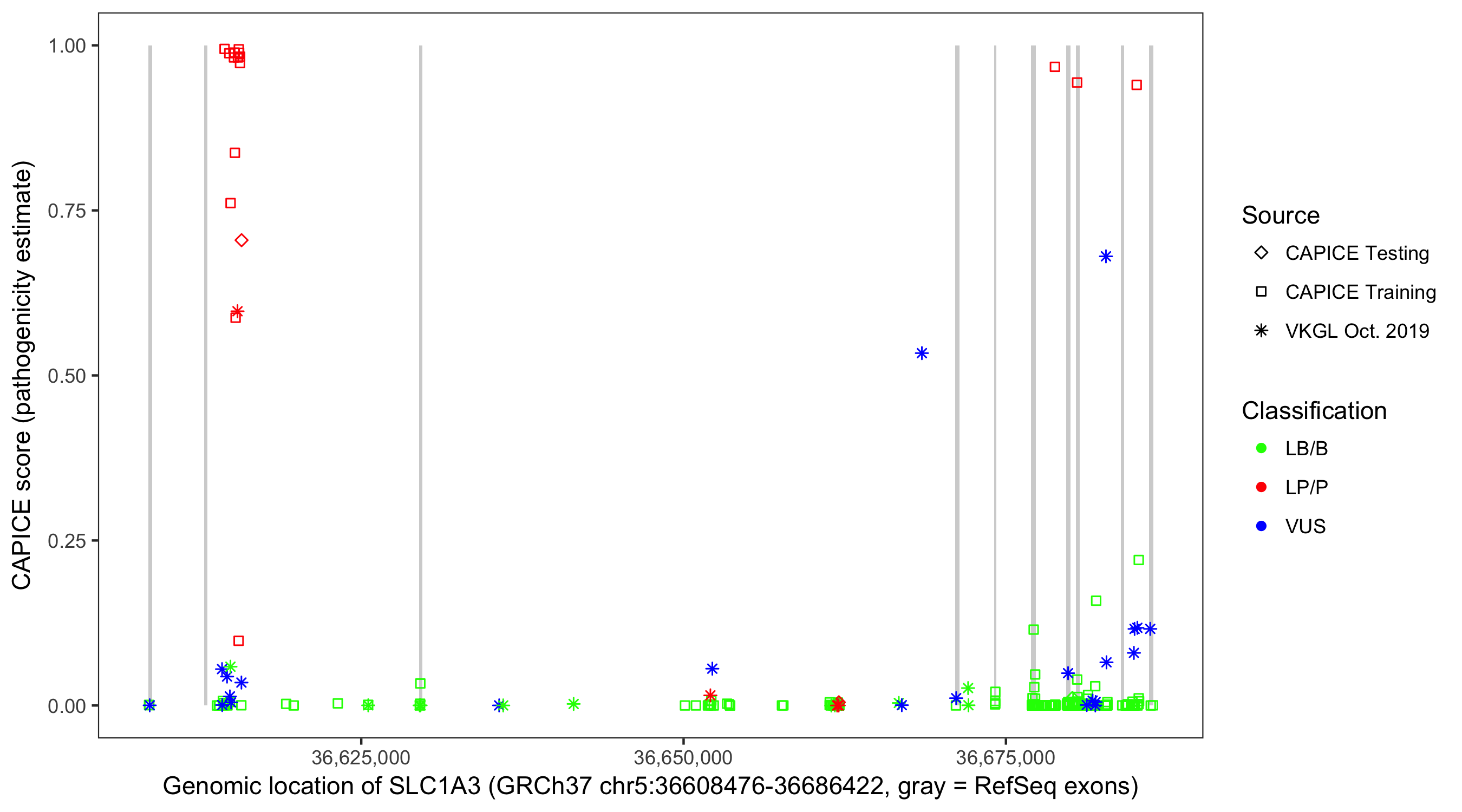 Shown are CAPICE train/test variants plus VKGL Oct 2019.