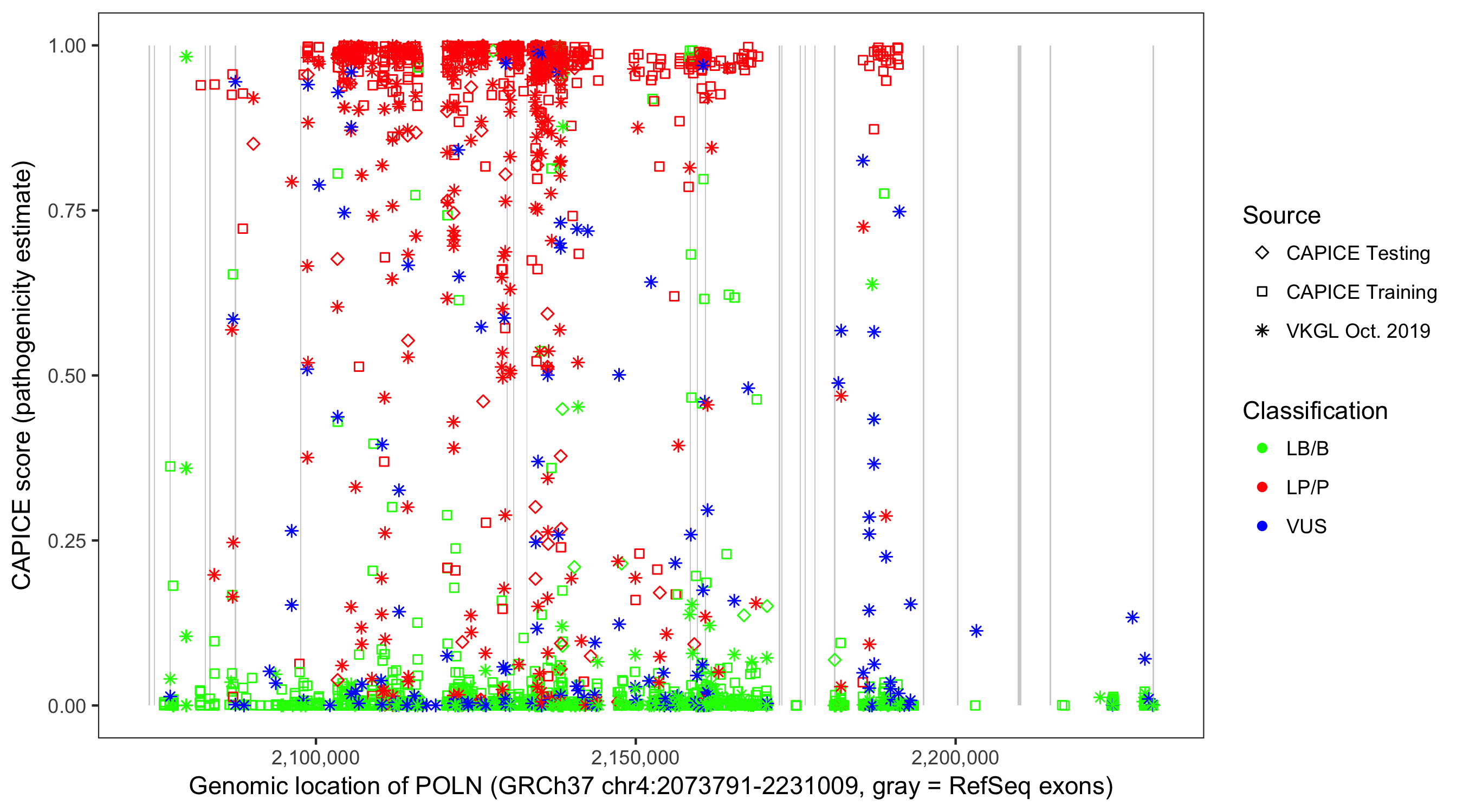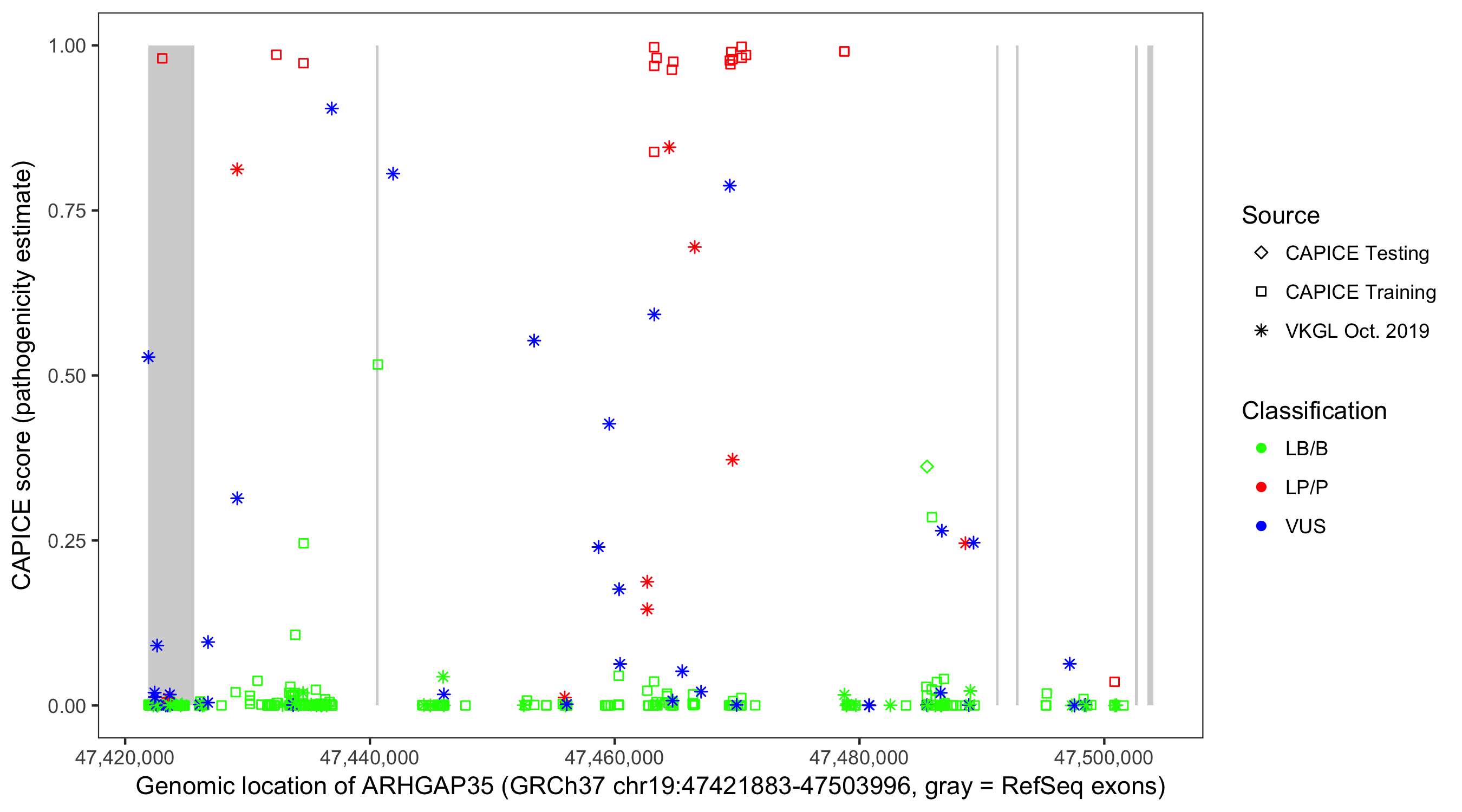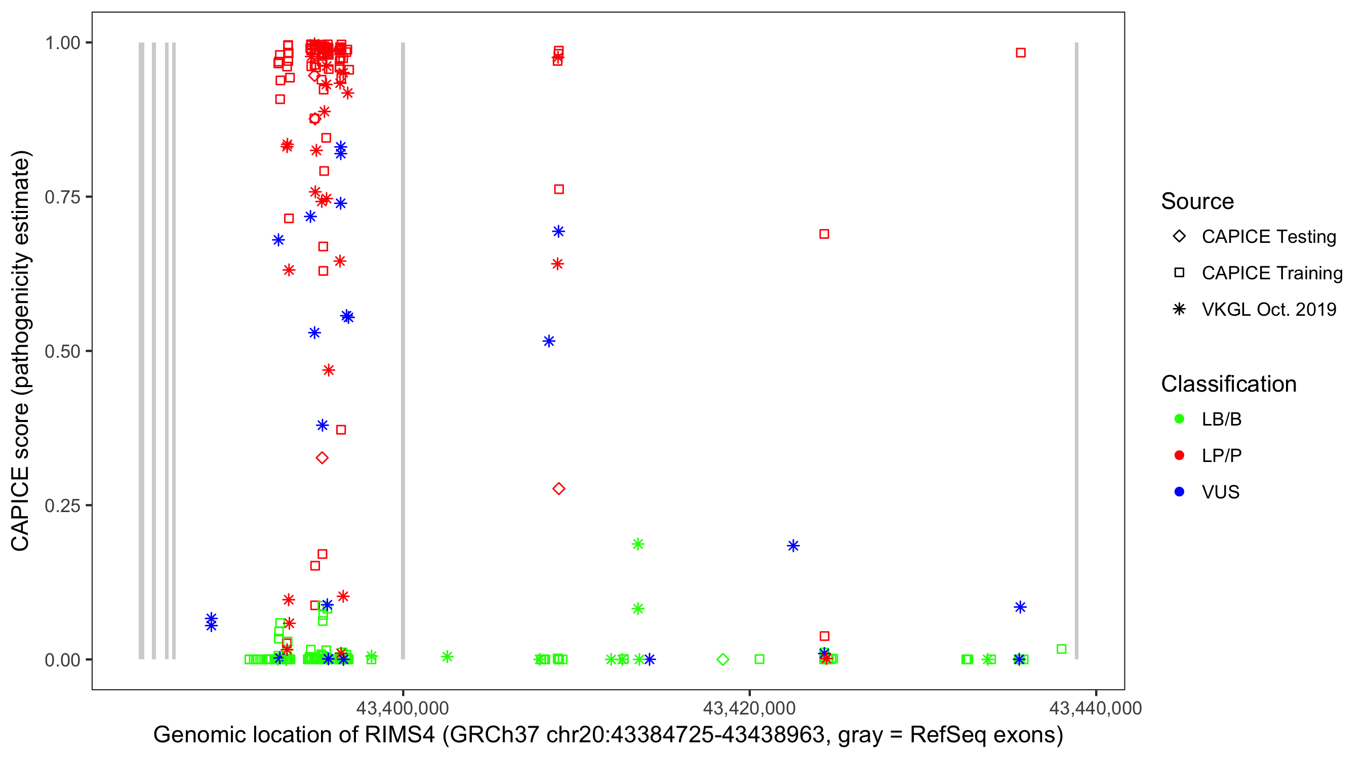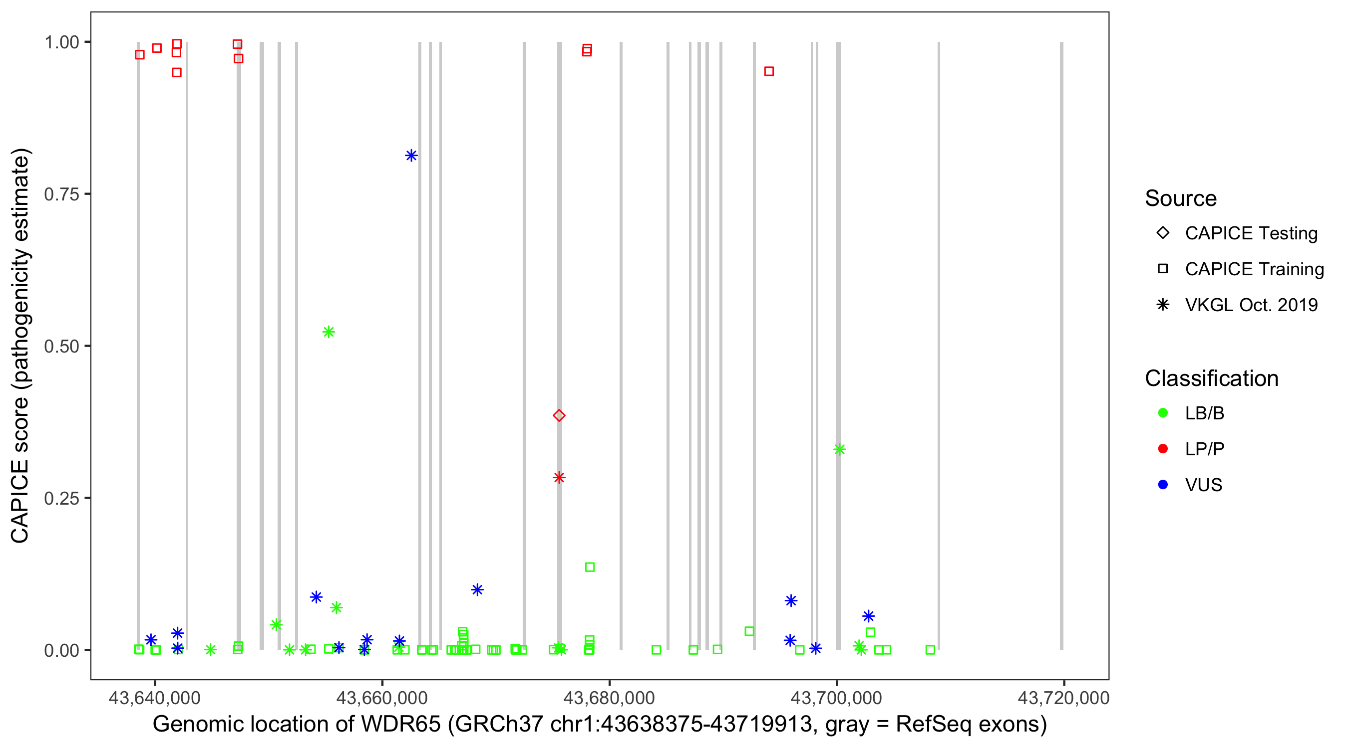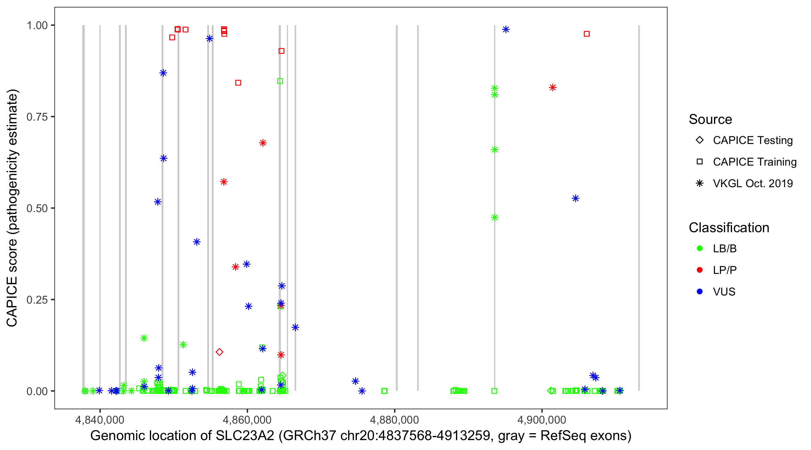 Shown are CAPICE train/test variants plus VKGL Oct 2019.