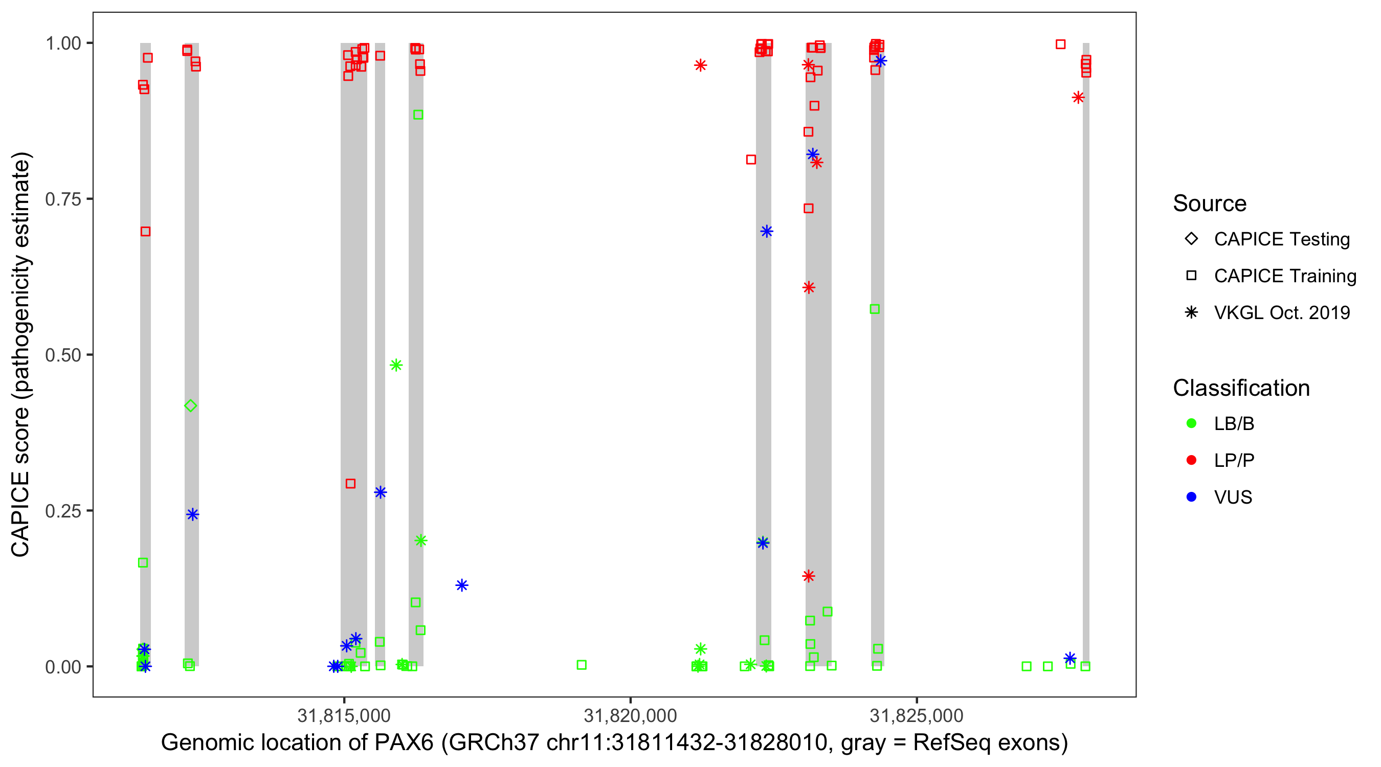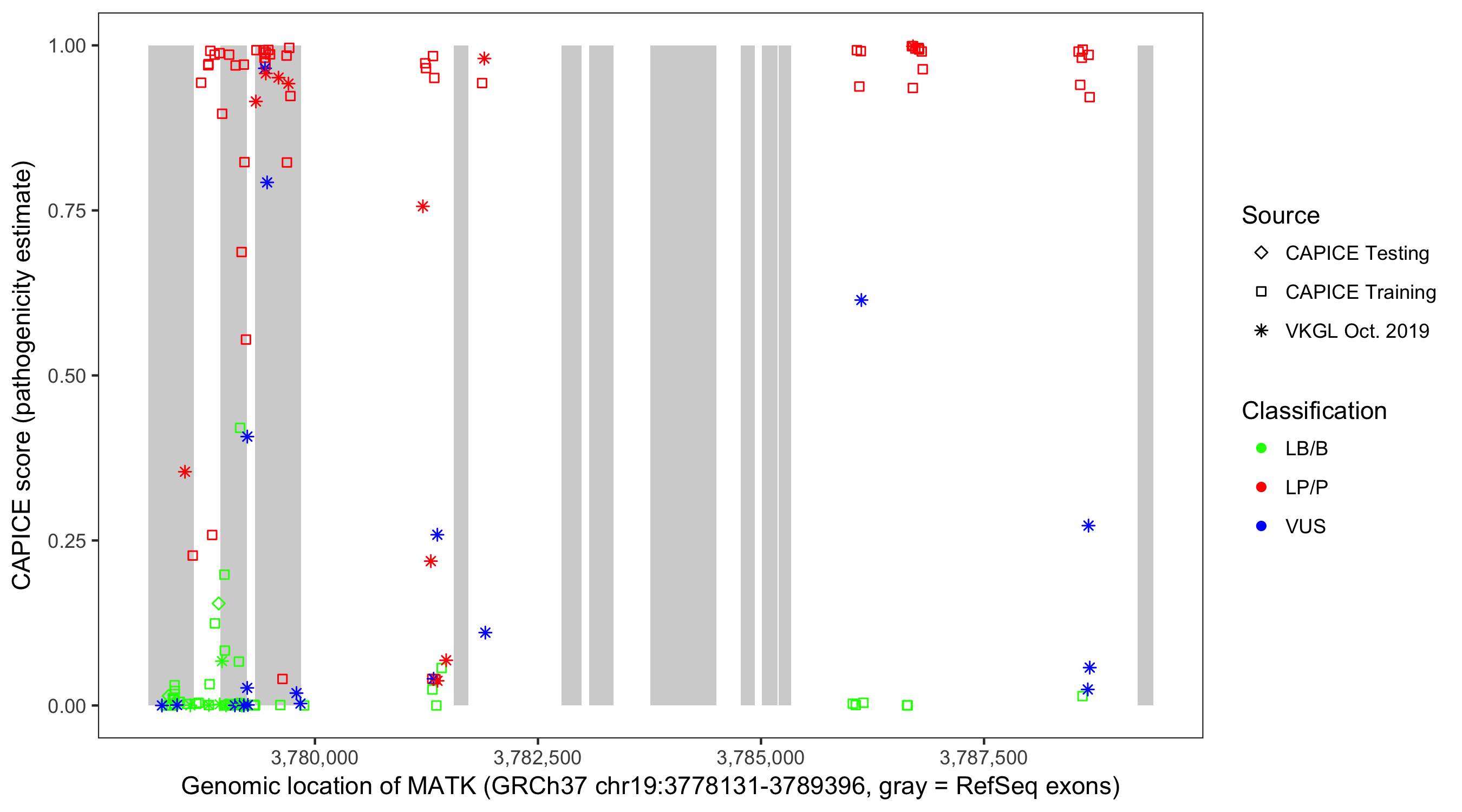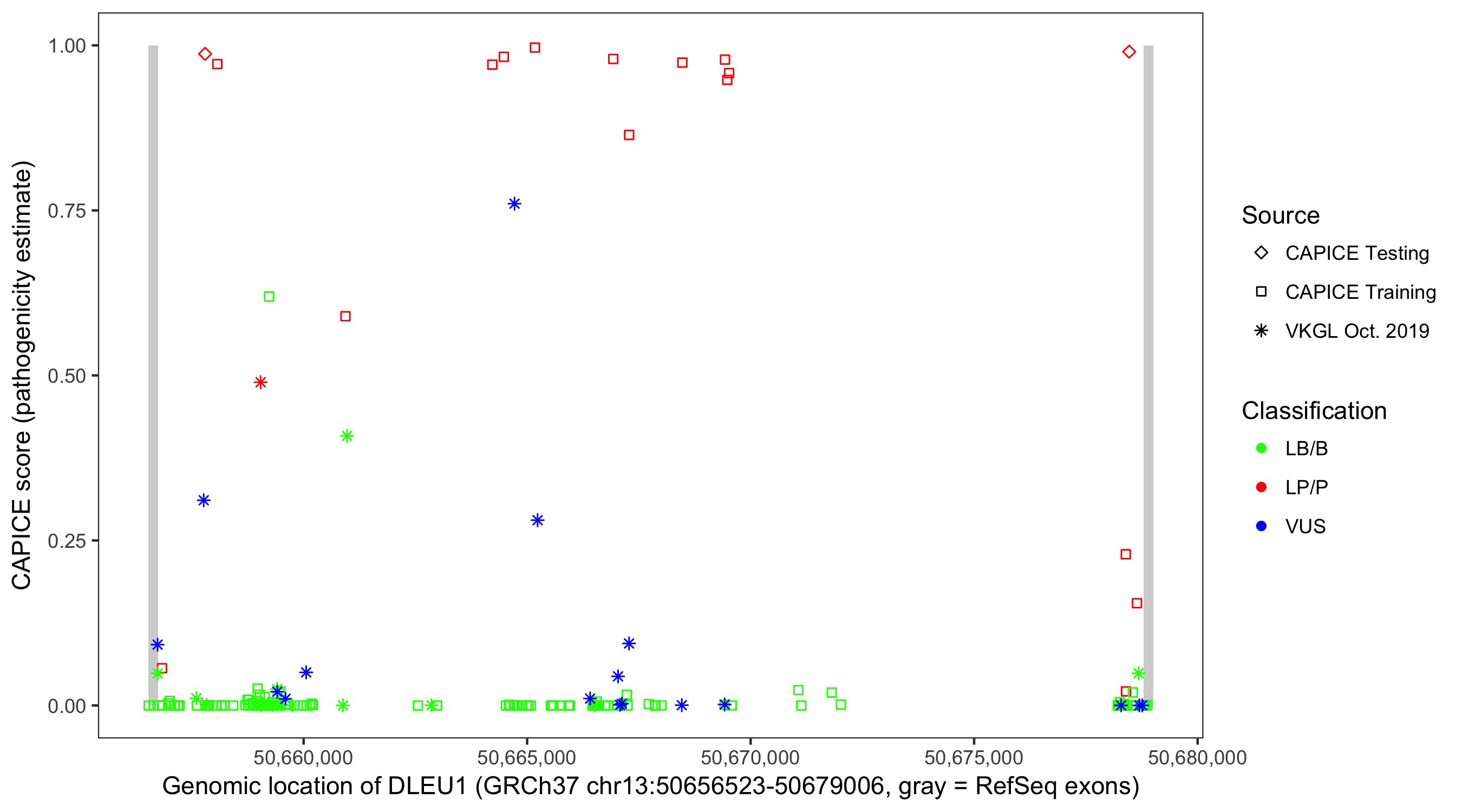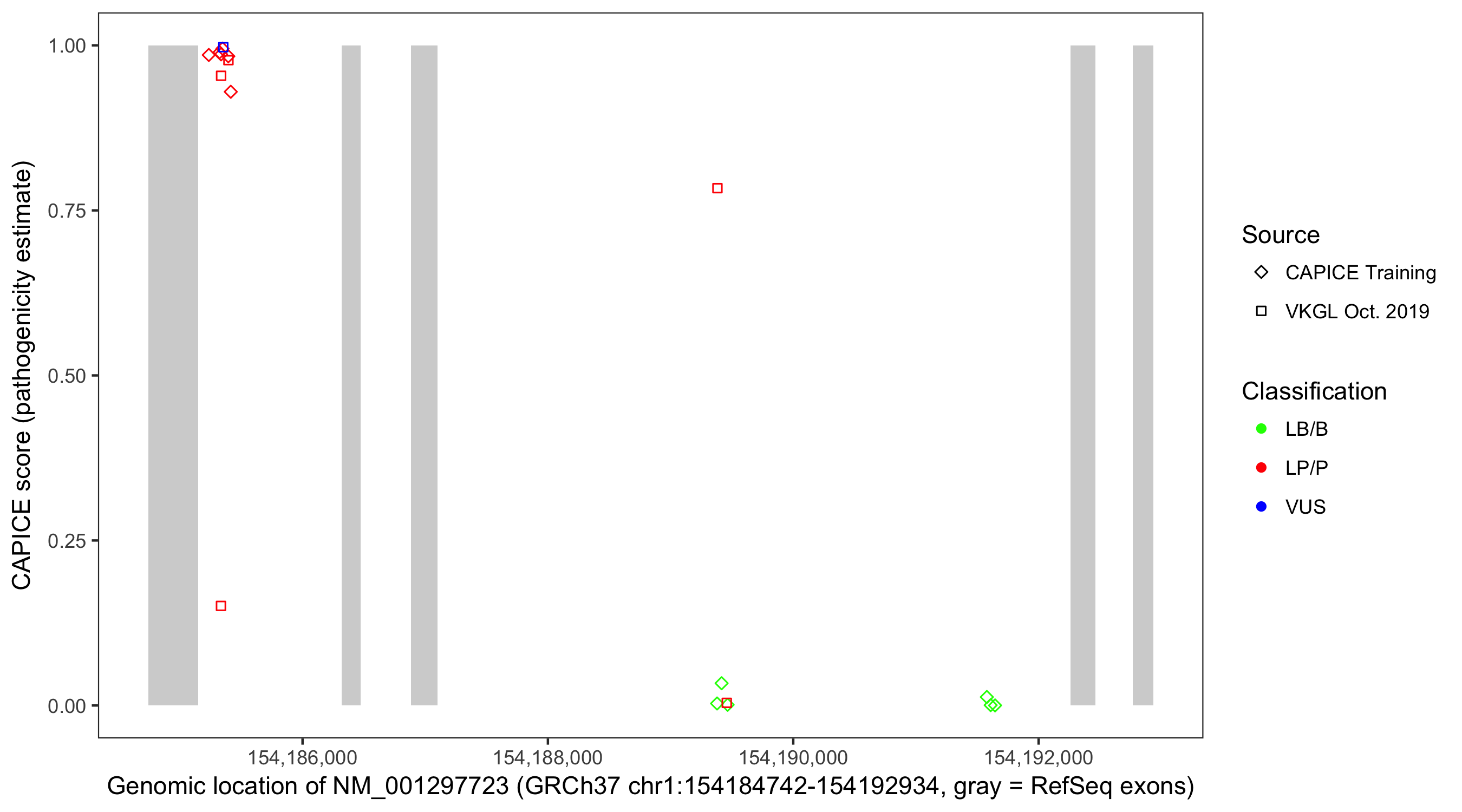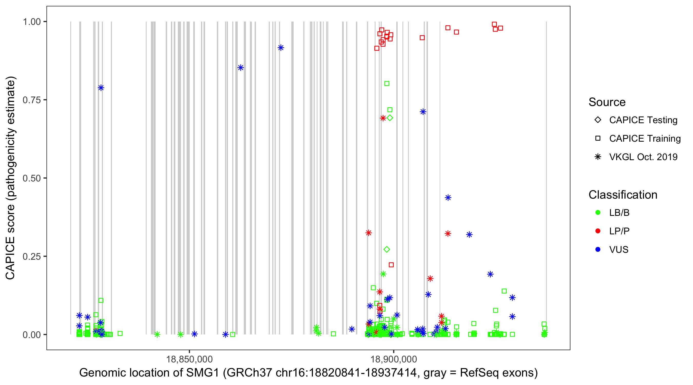 Shown are CAPICE train/test variants plus VKGL Oct 2019.