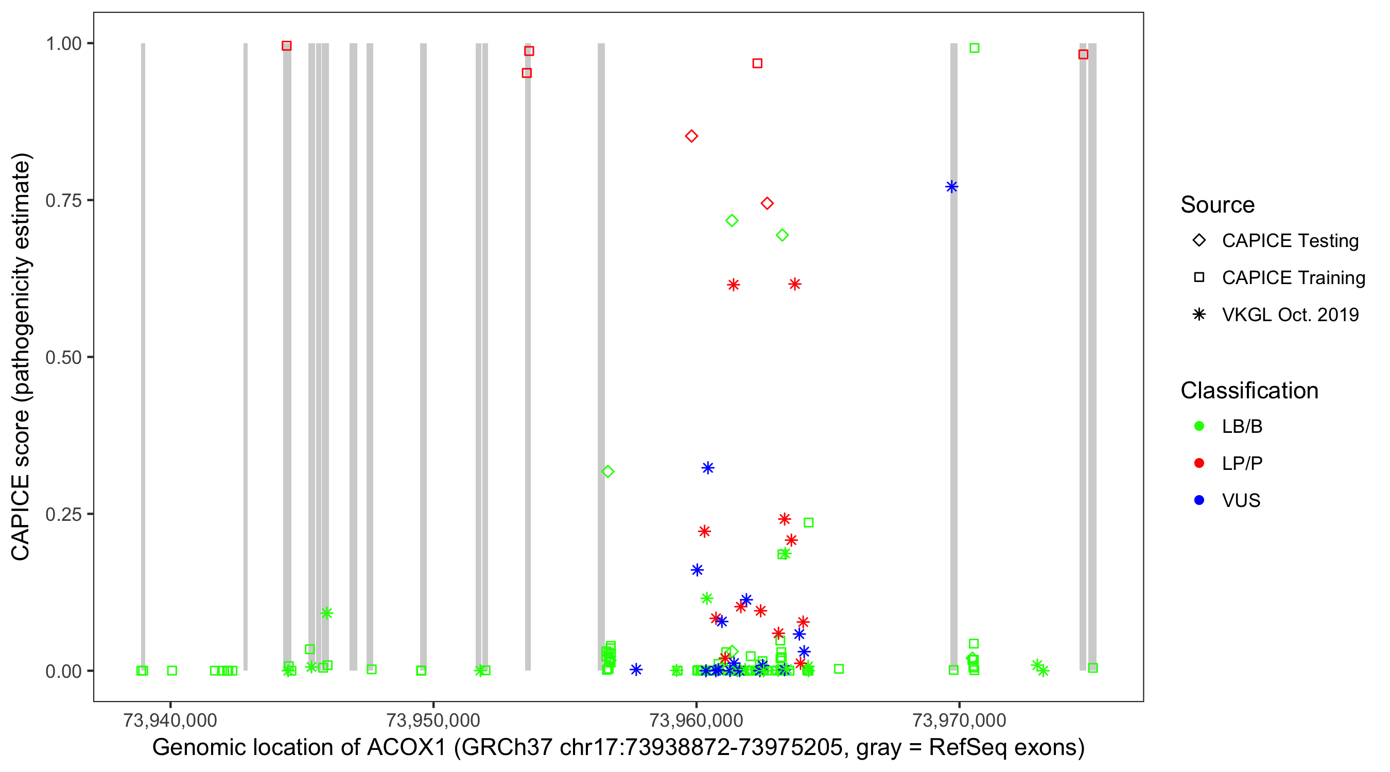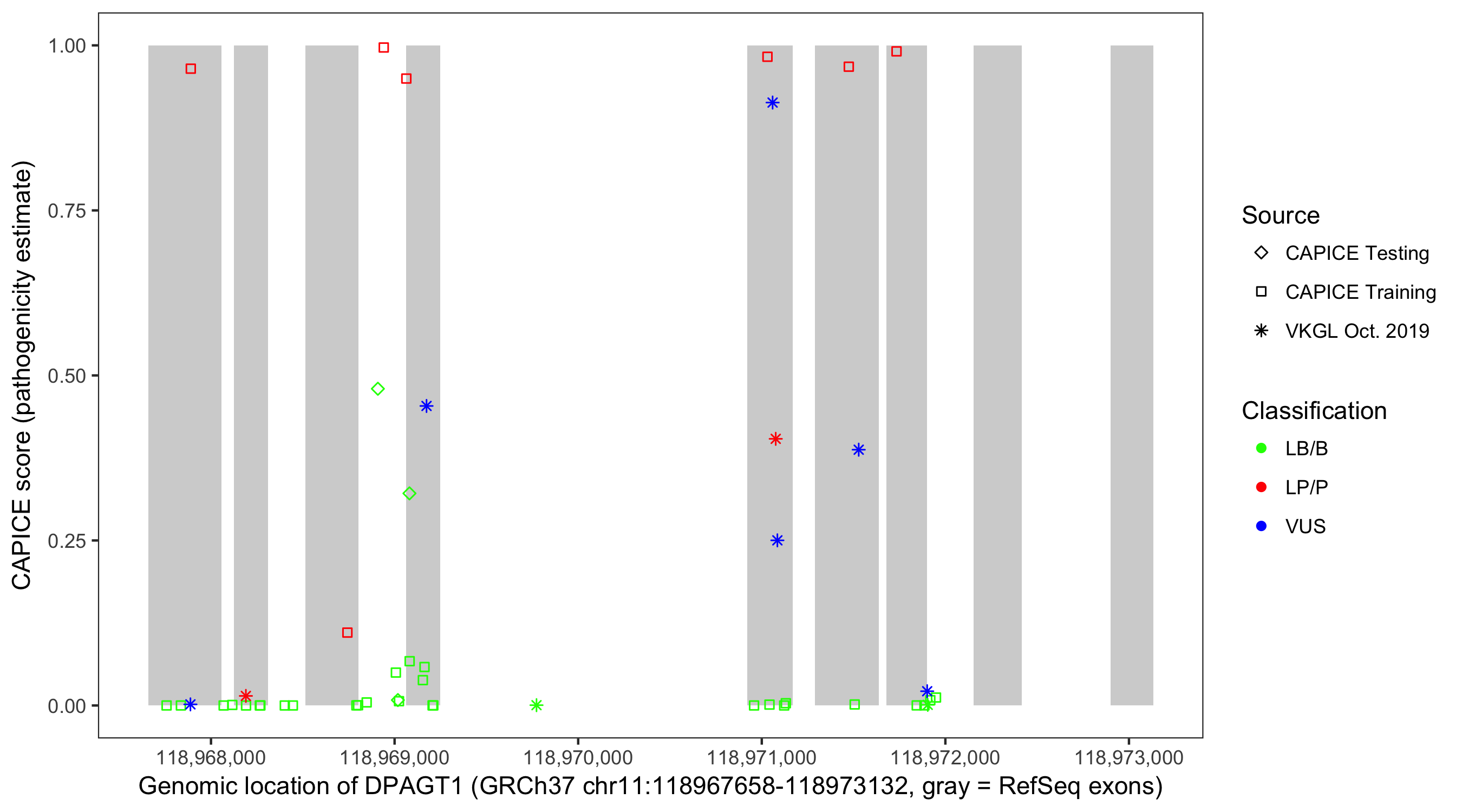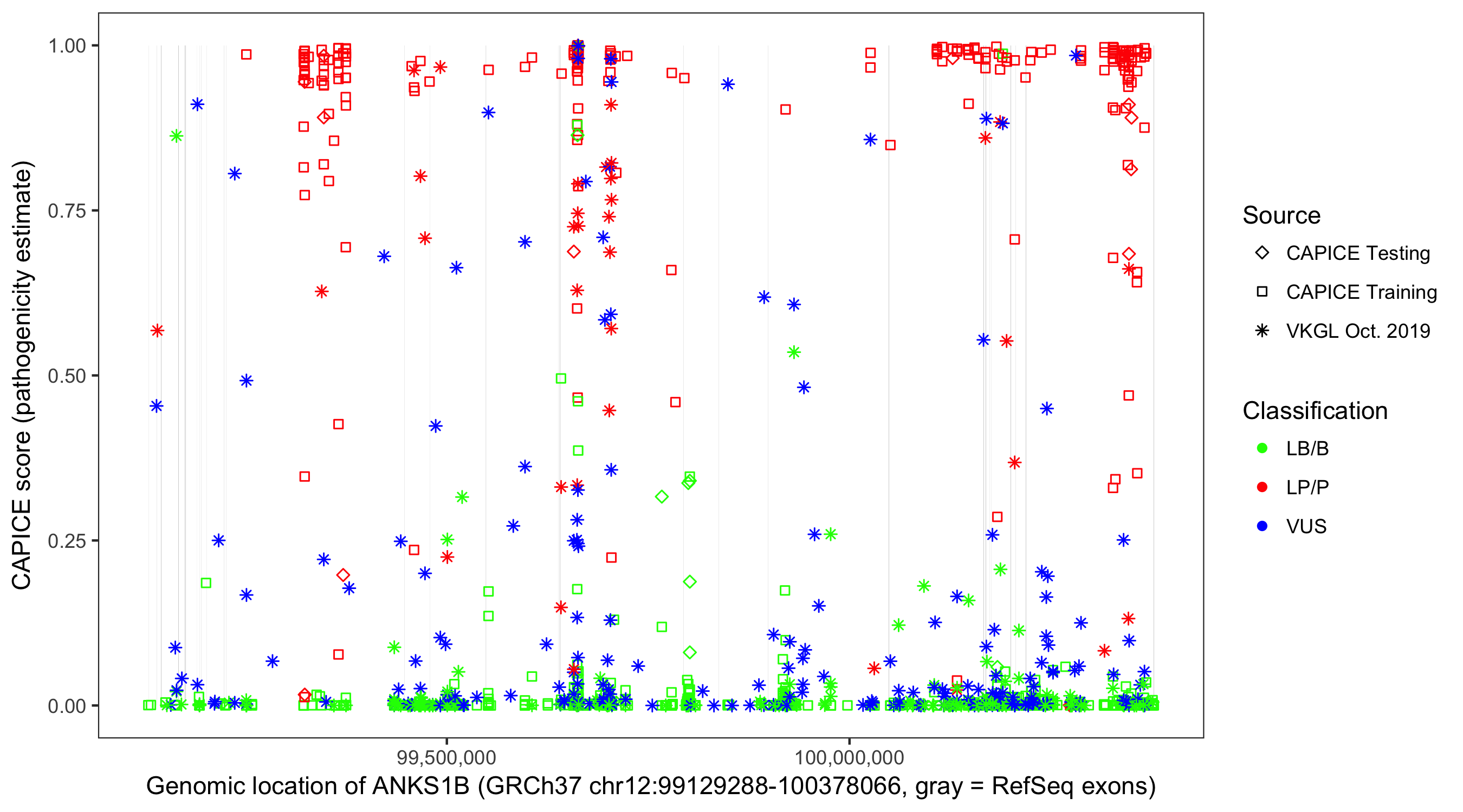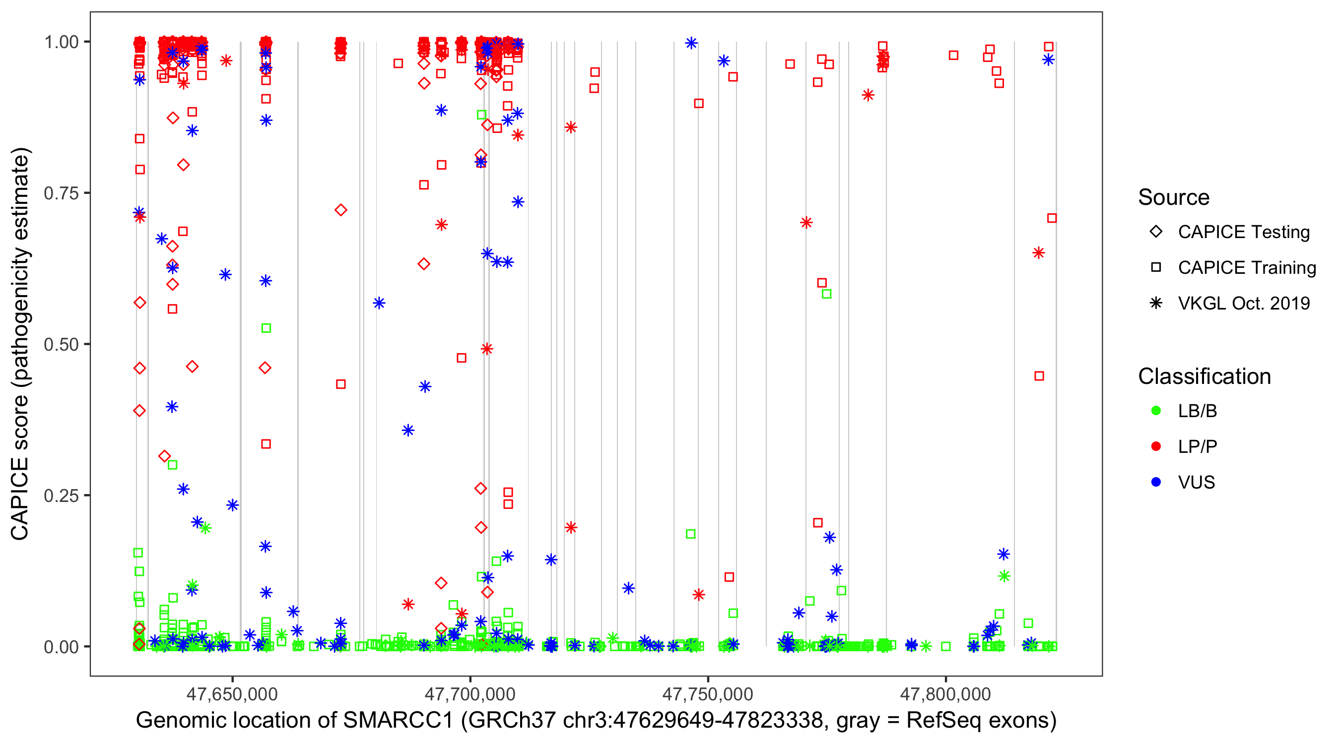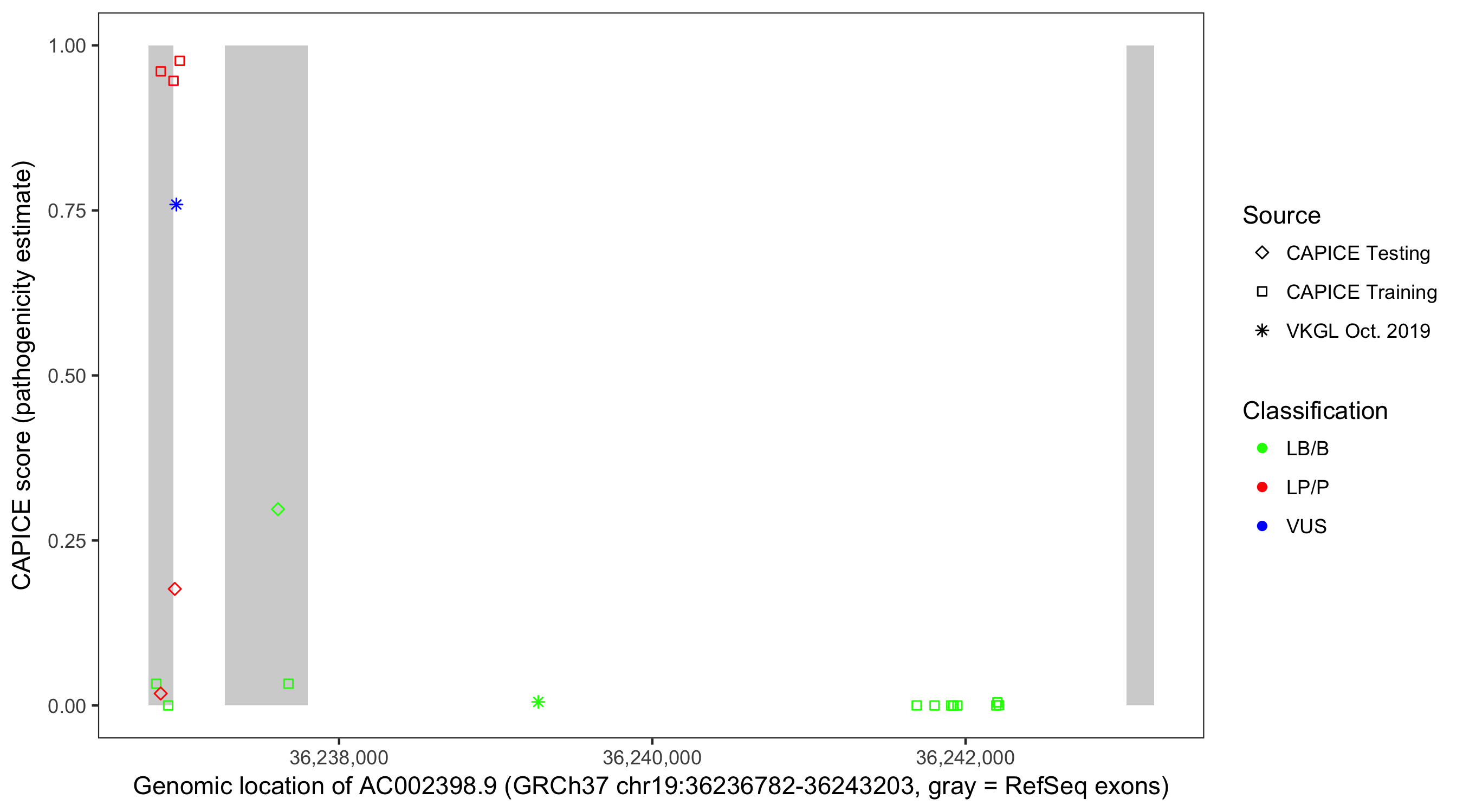 Shown are CAPICE train/test variants plus VKGL Oct 2019.