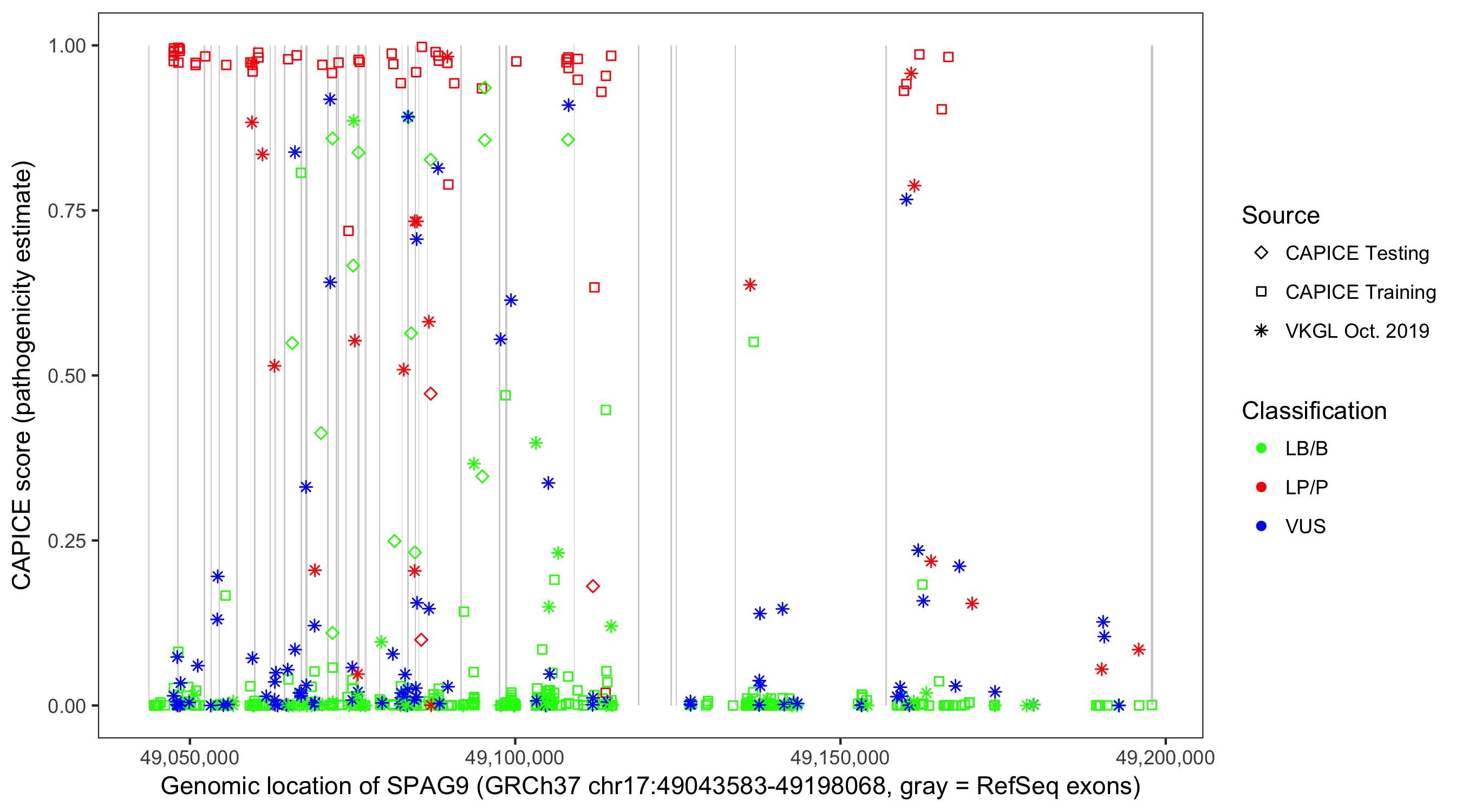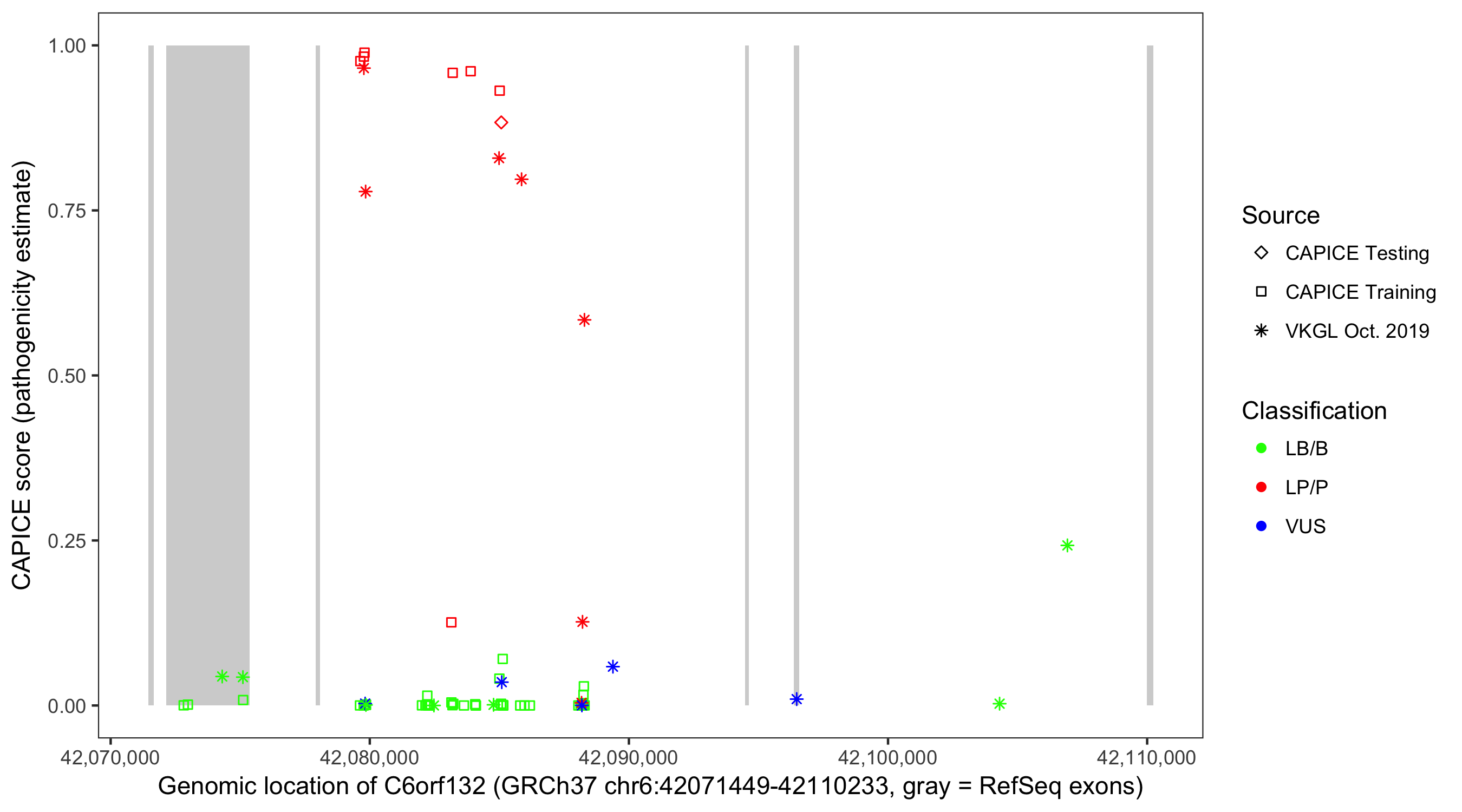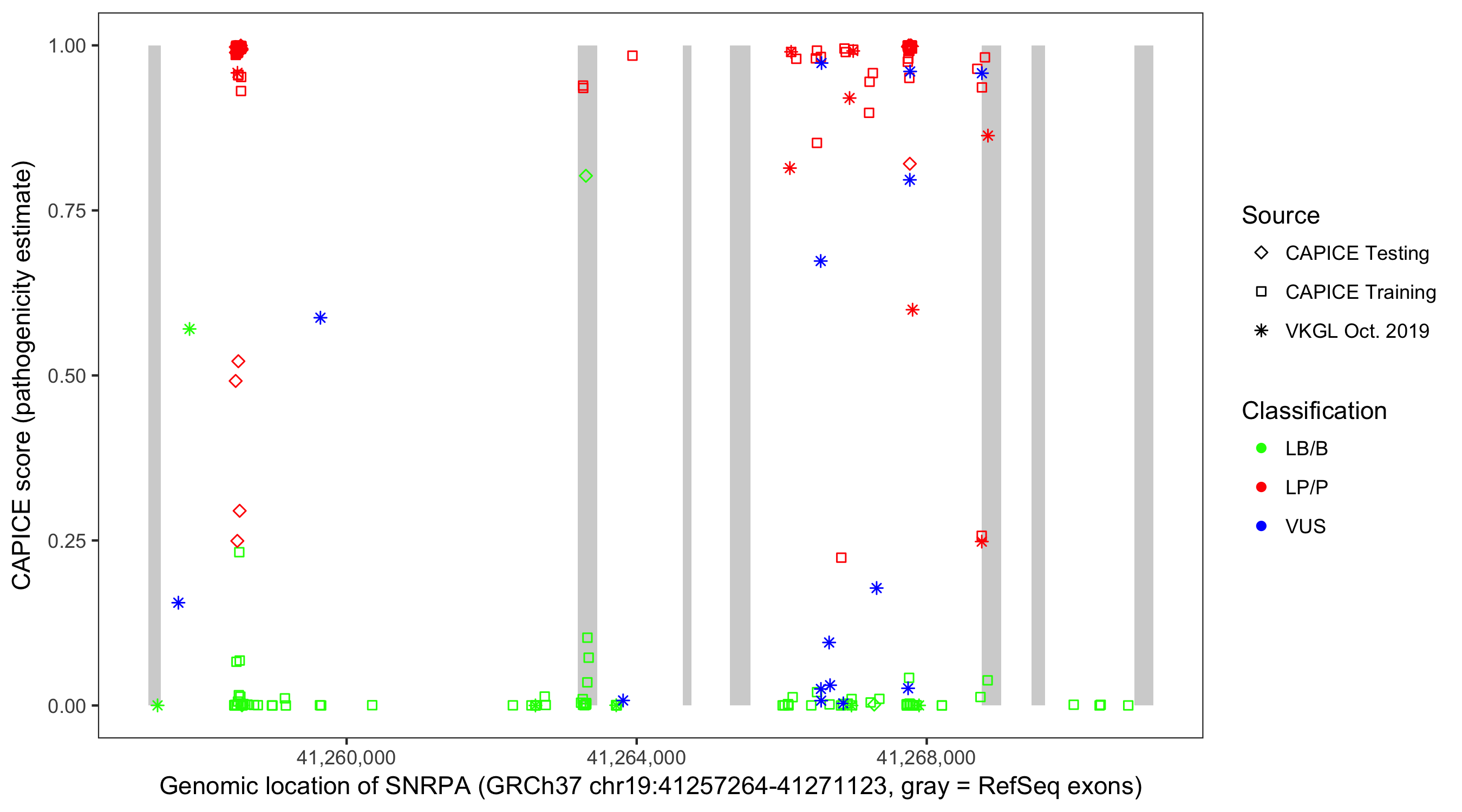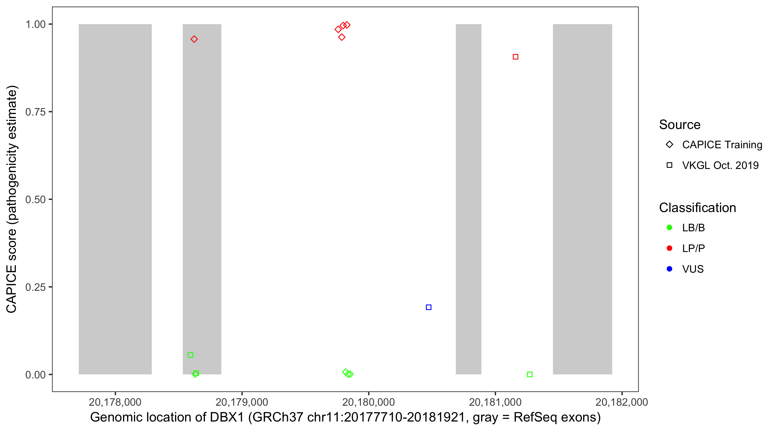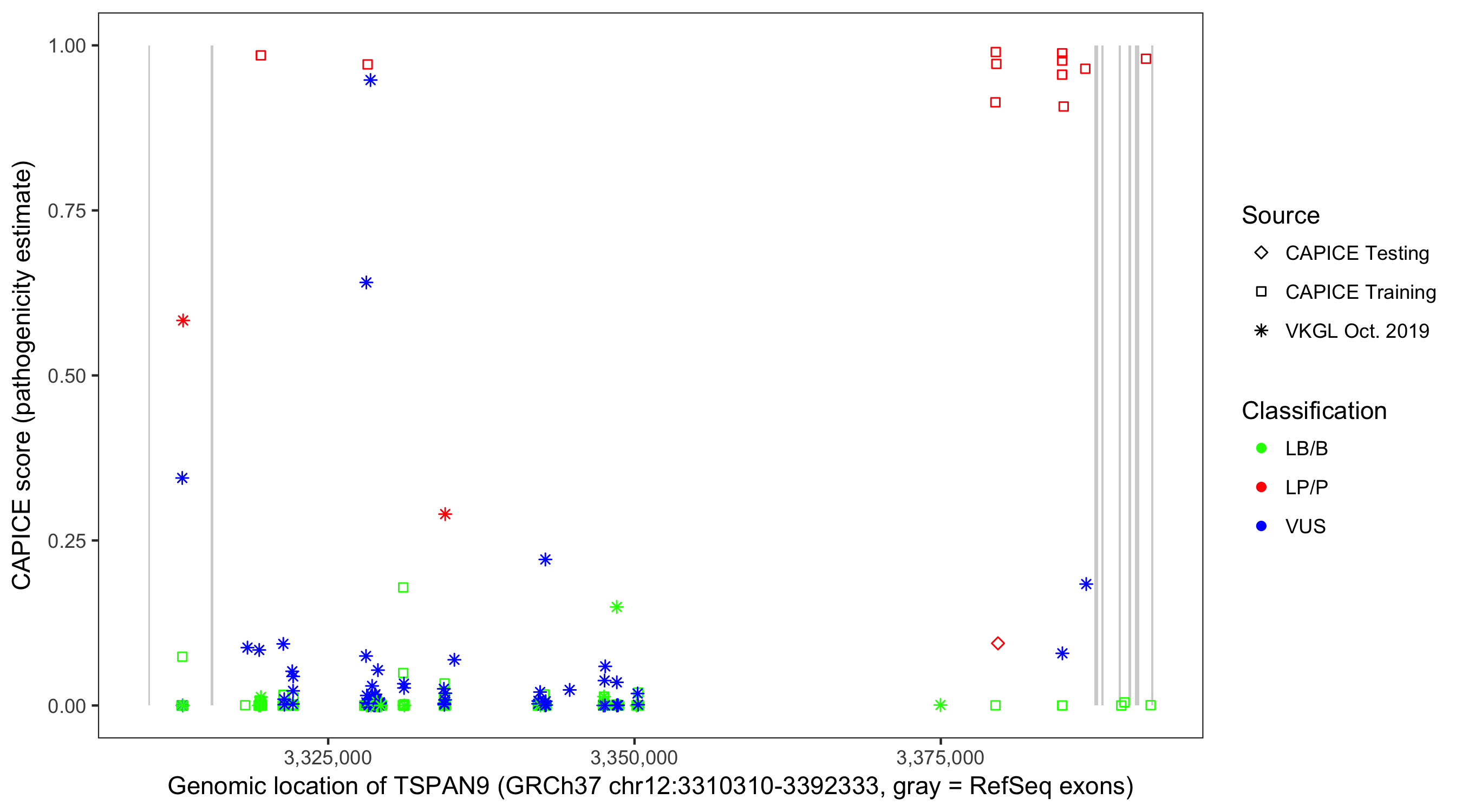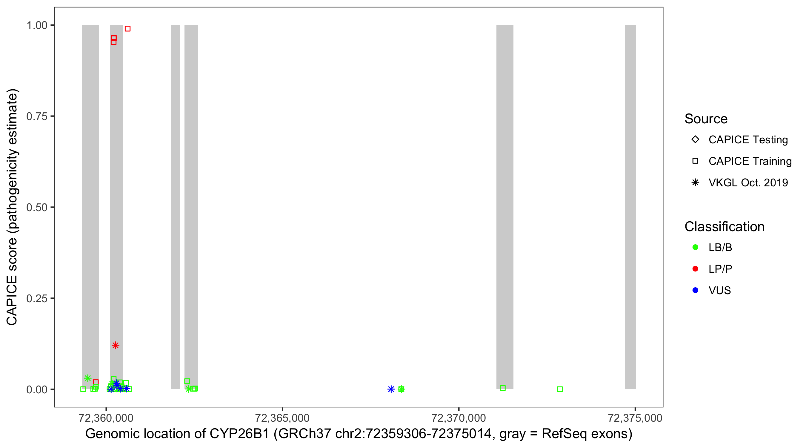 Shown are CAPICE train/test variants plus VKGL Oct 2019.