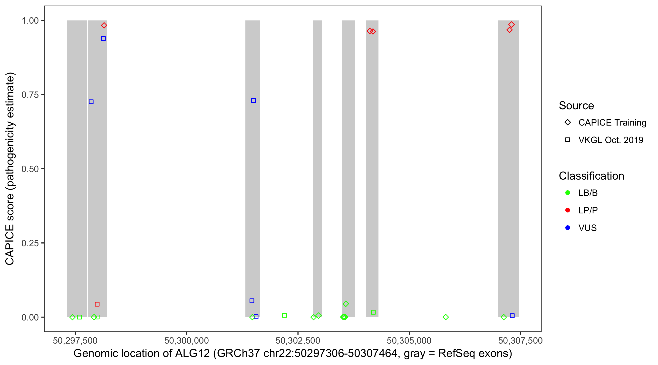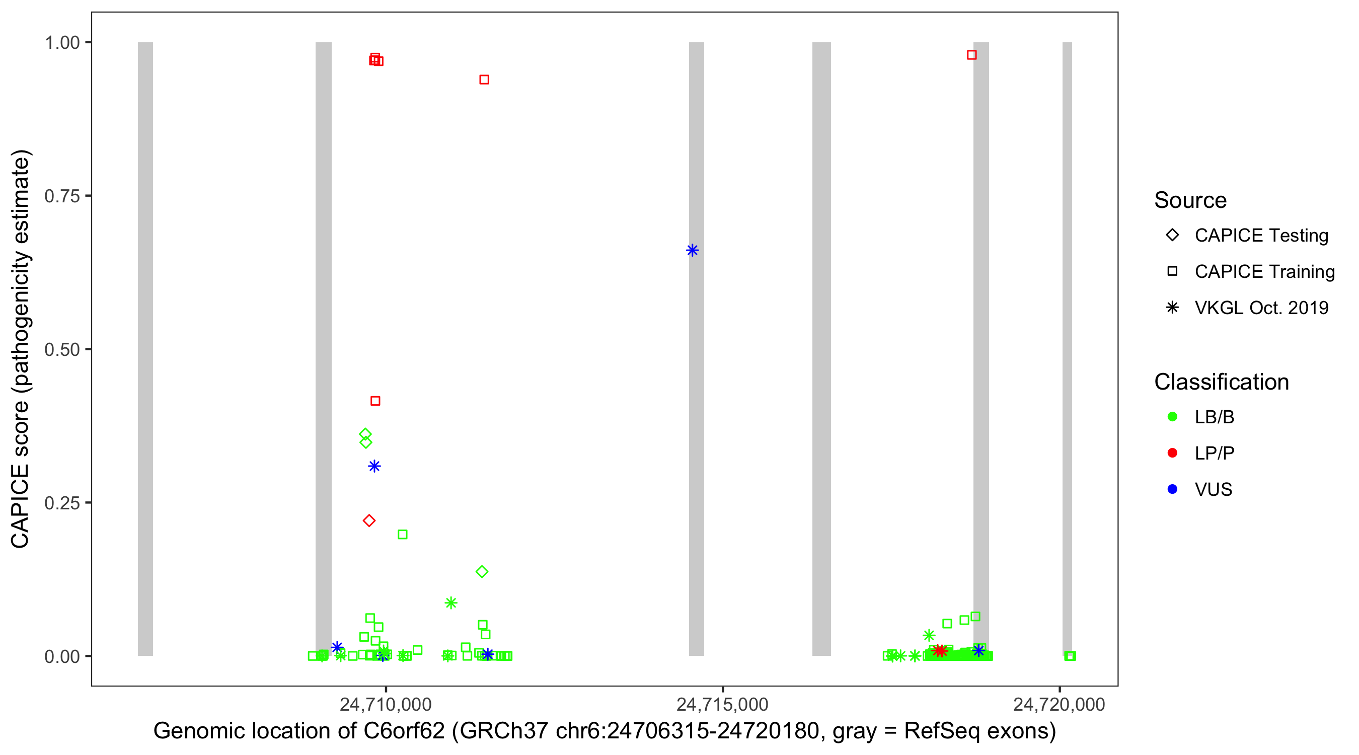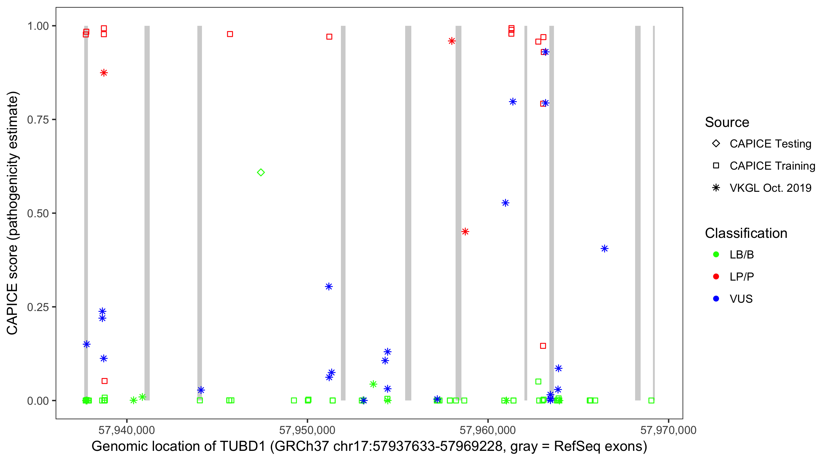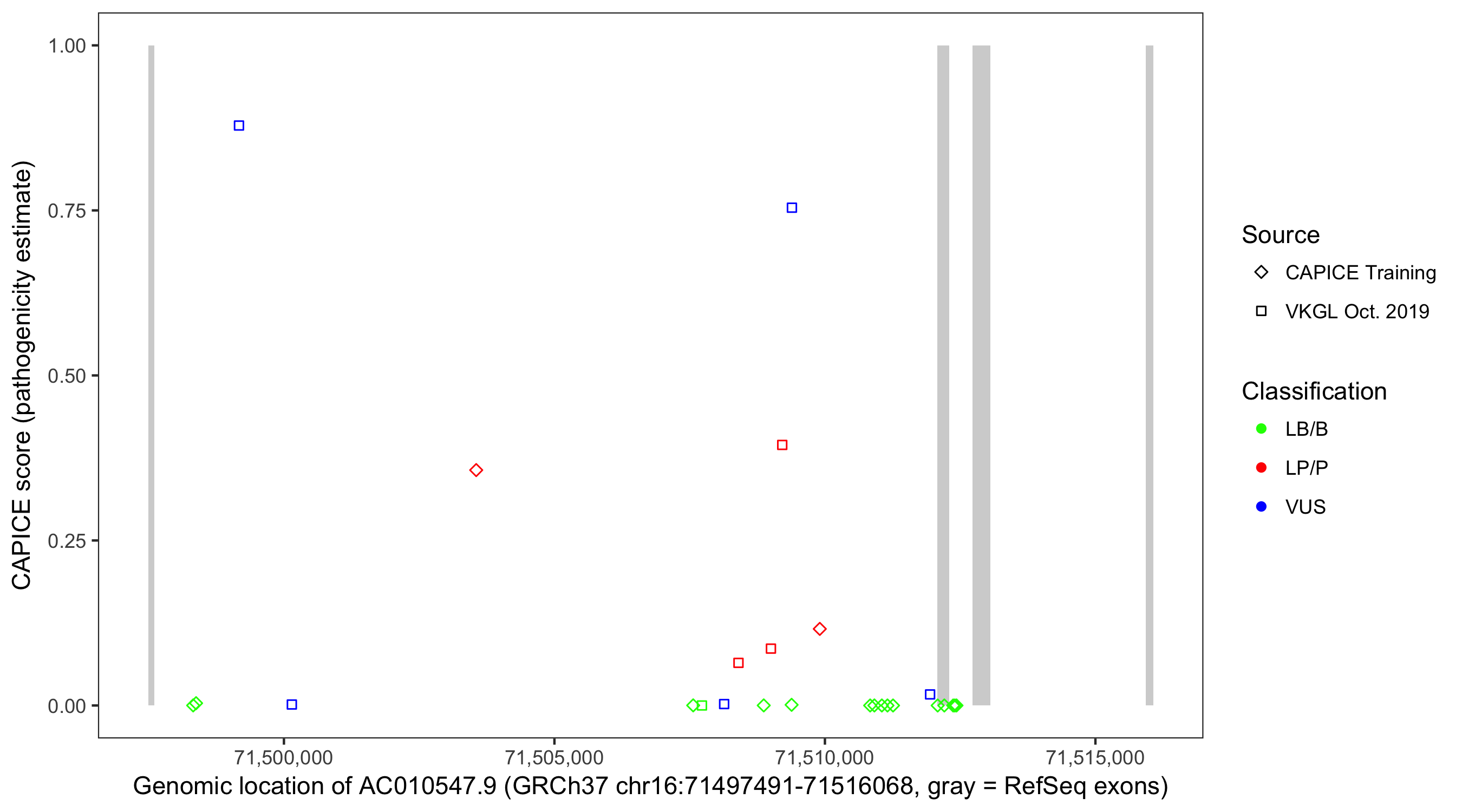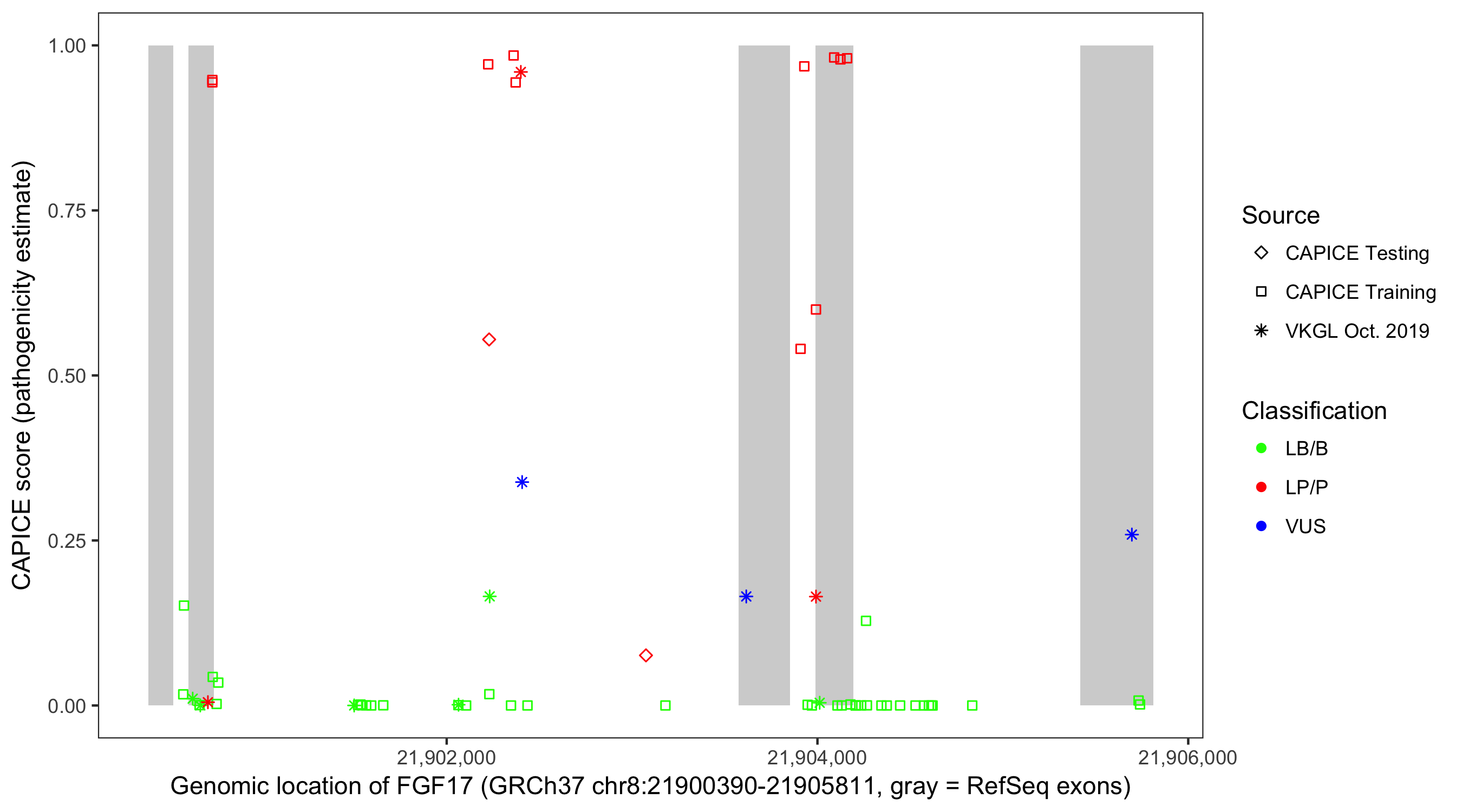 Shown are CAPICE train/test variants plus VKGL Oct 2019.