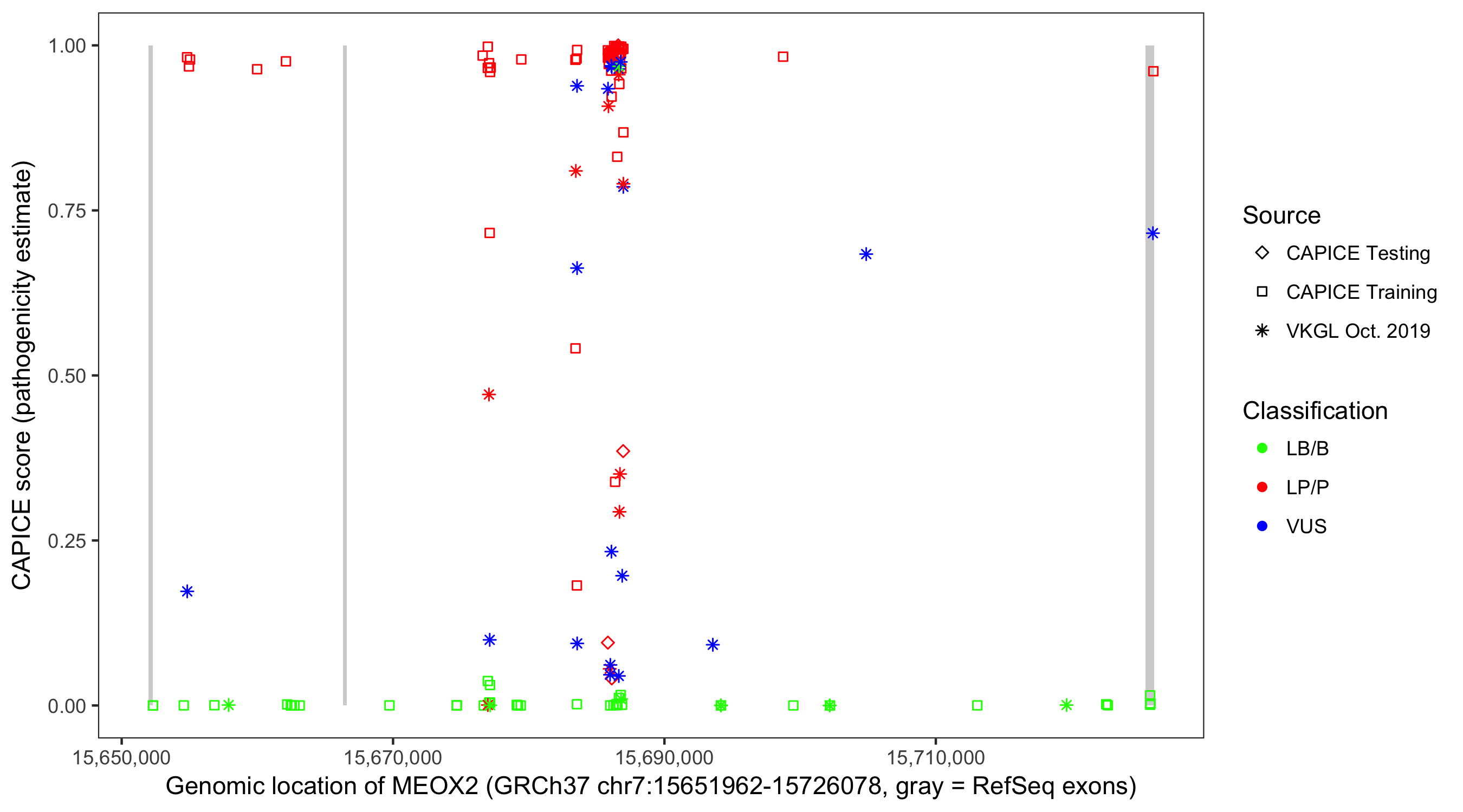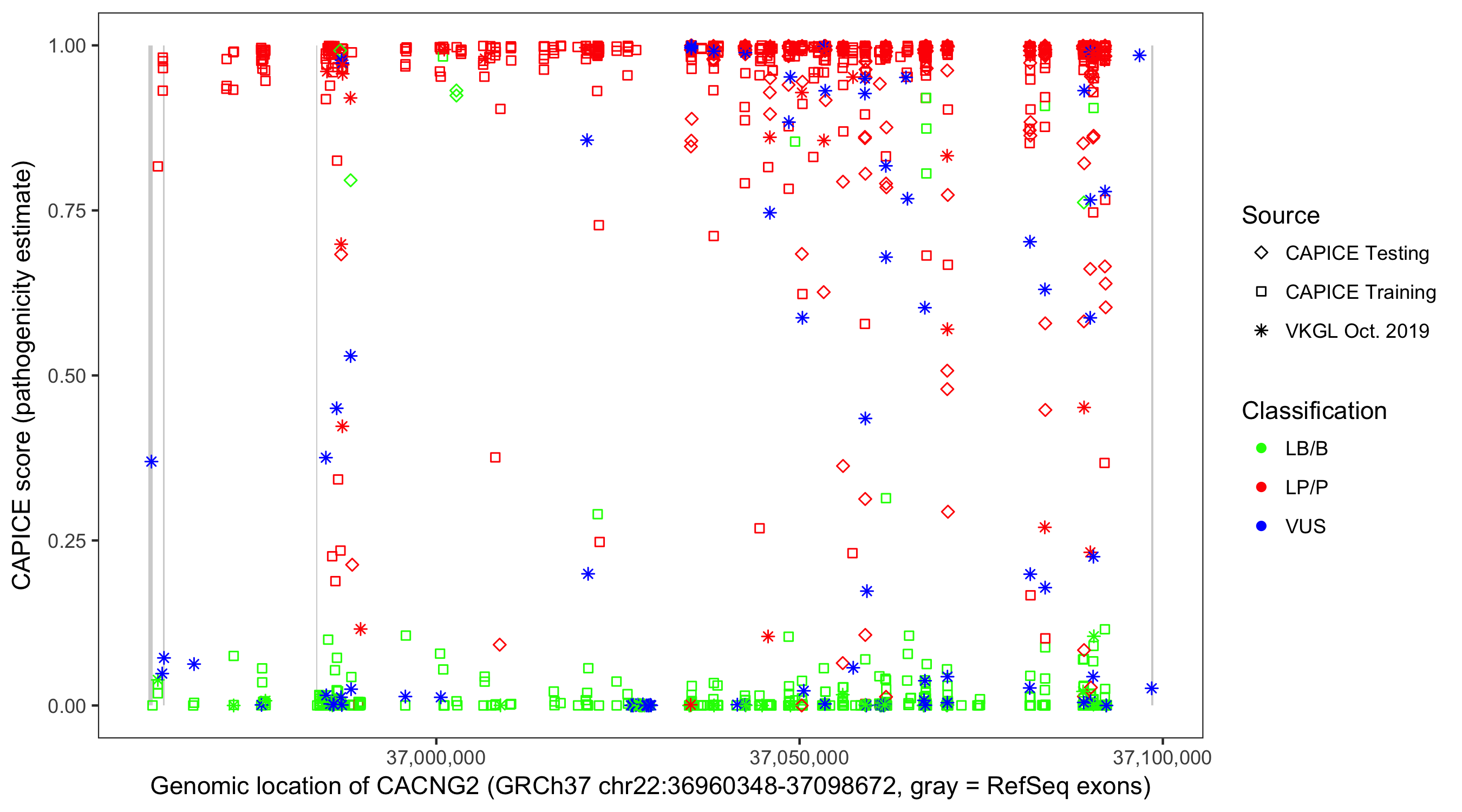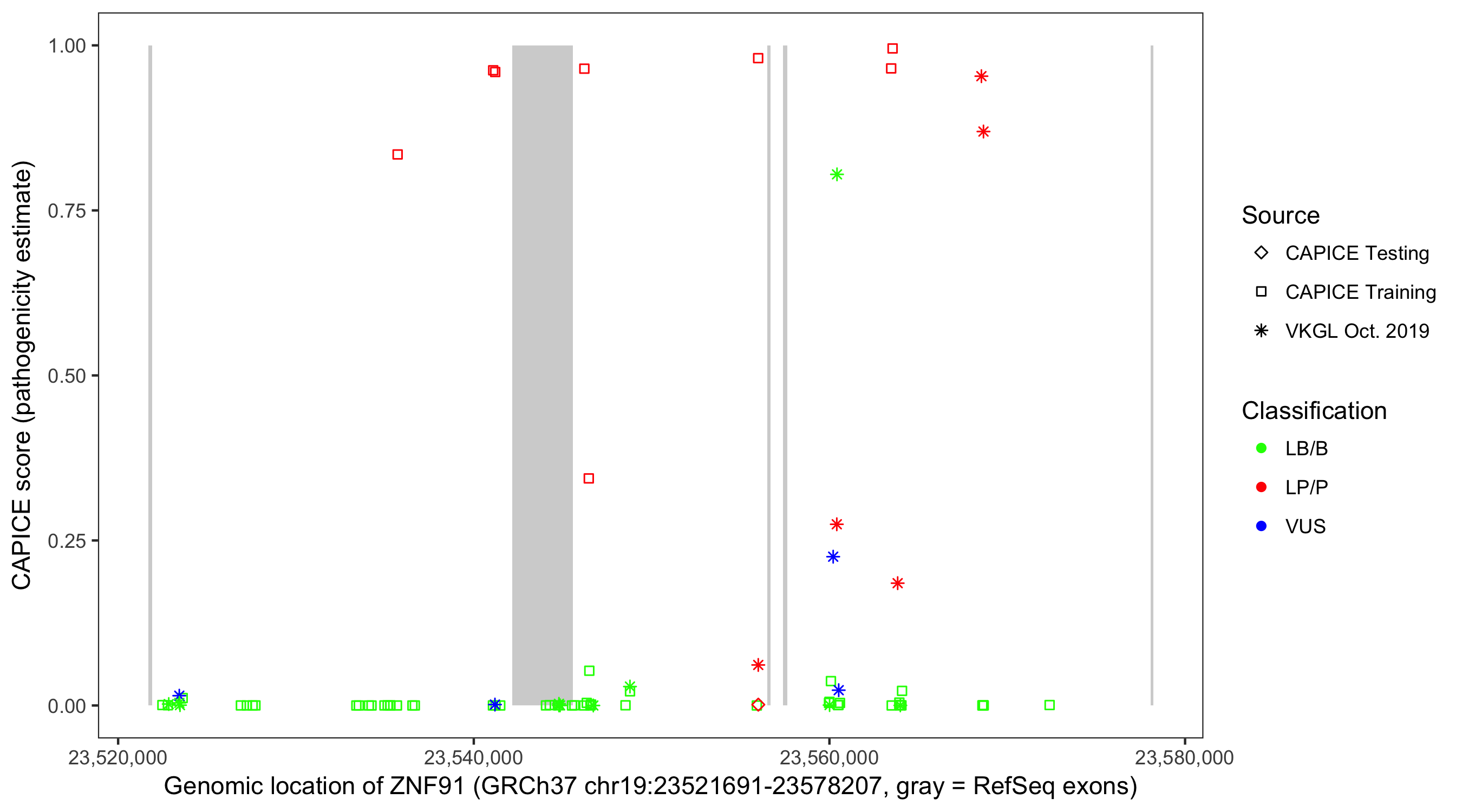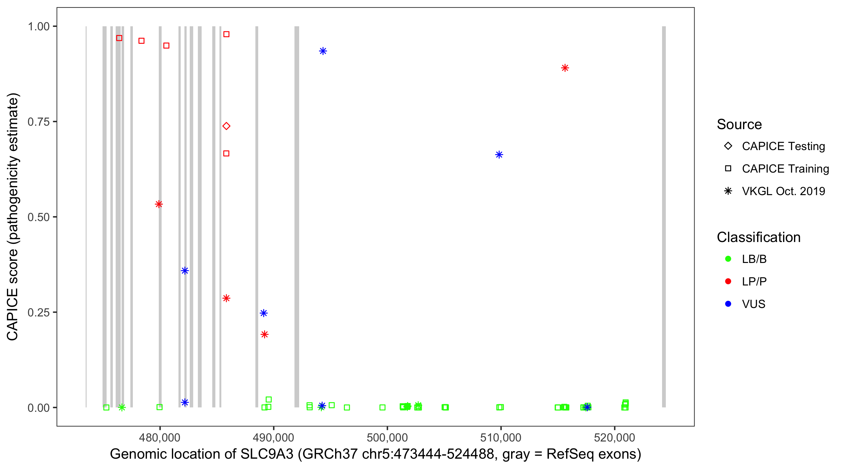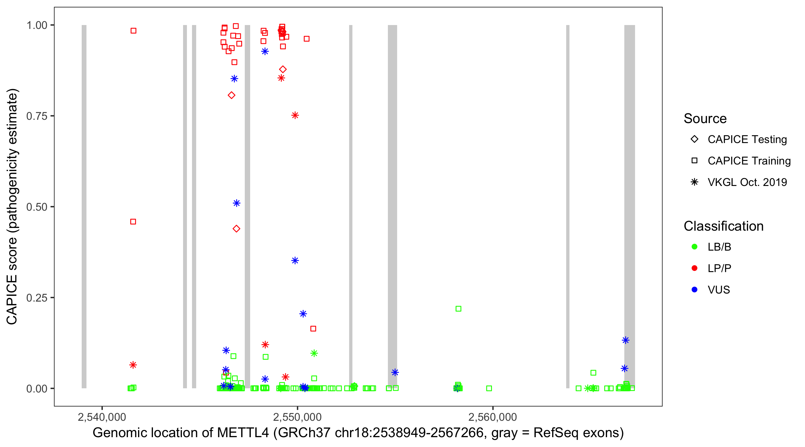 Shown are CAPICE train/test variants plus VKGL Oct 2019.