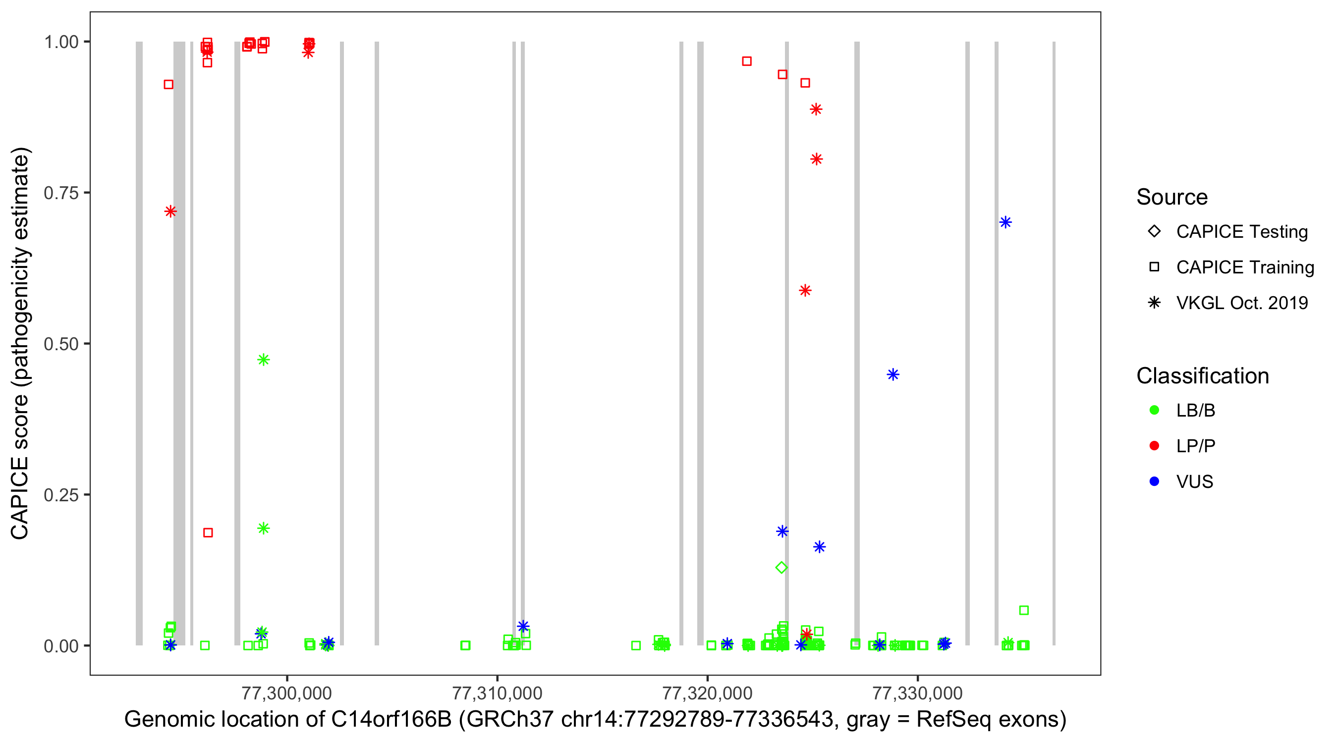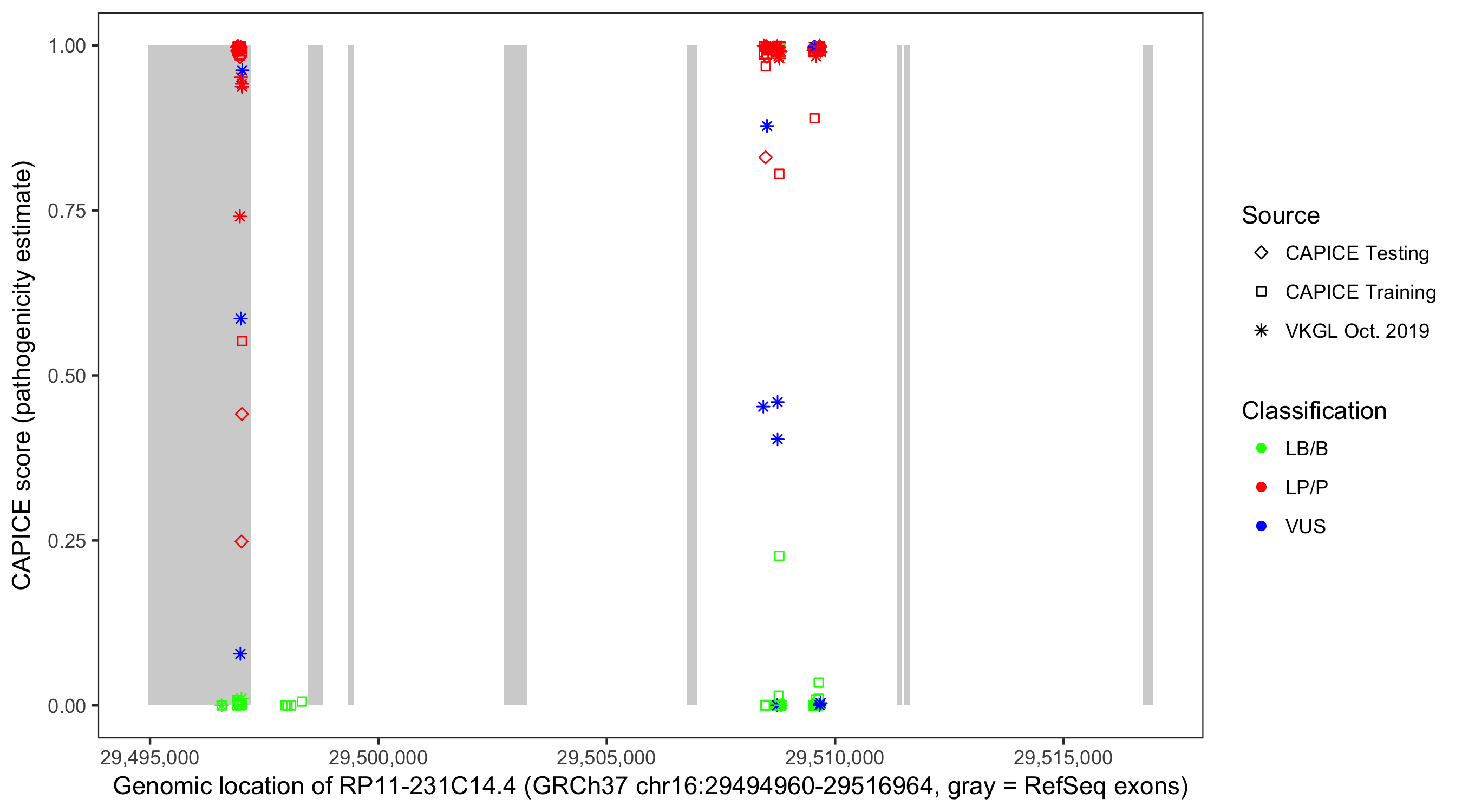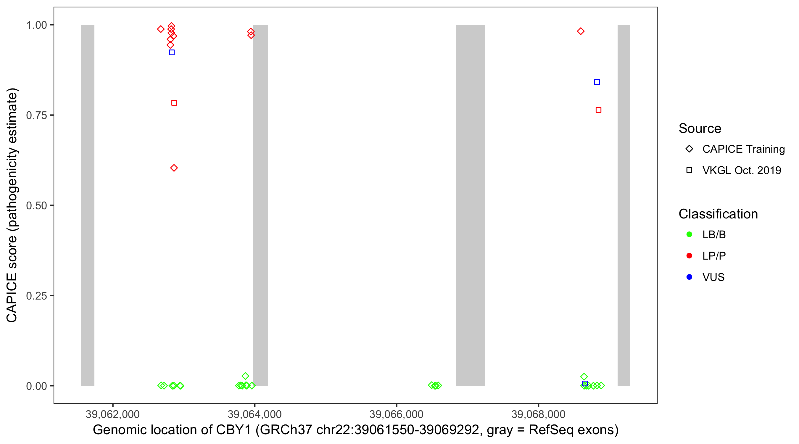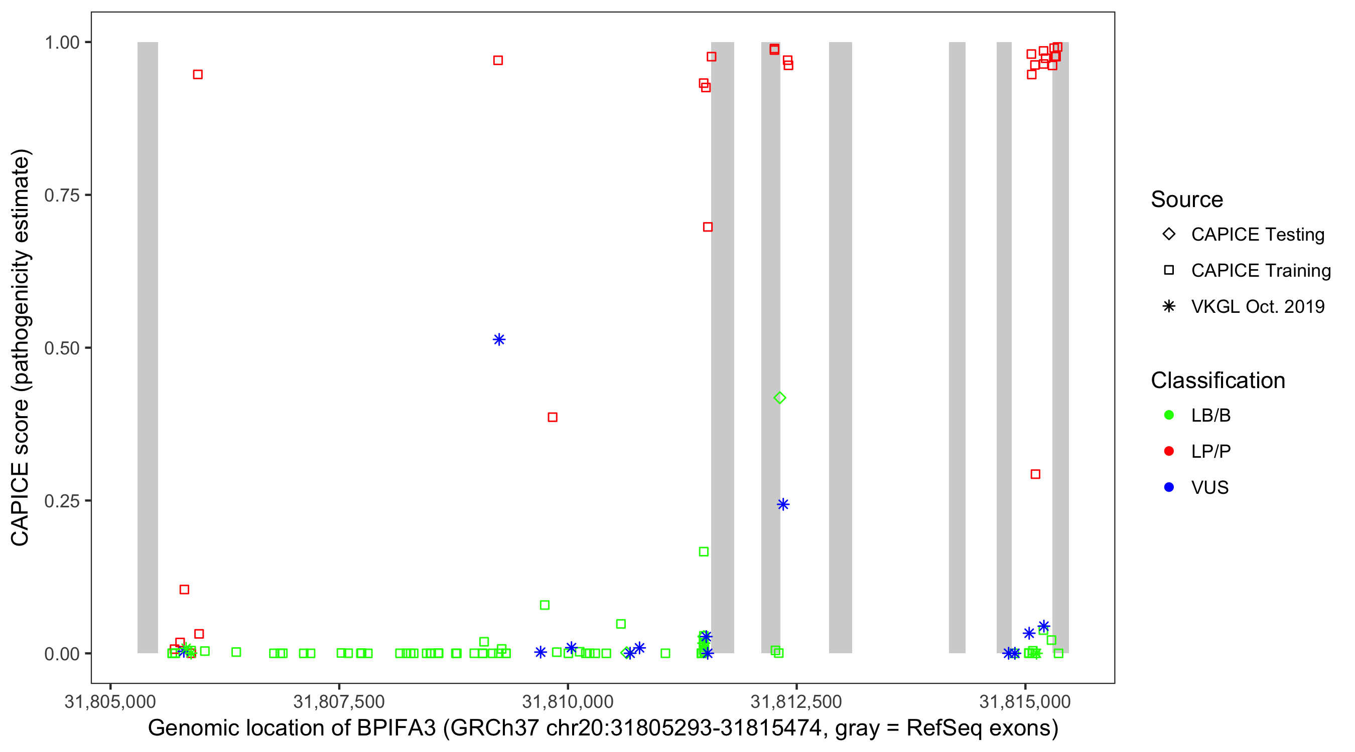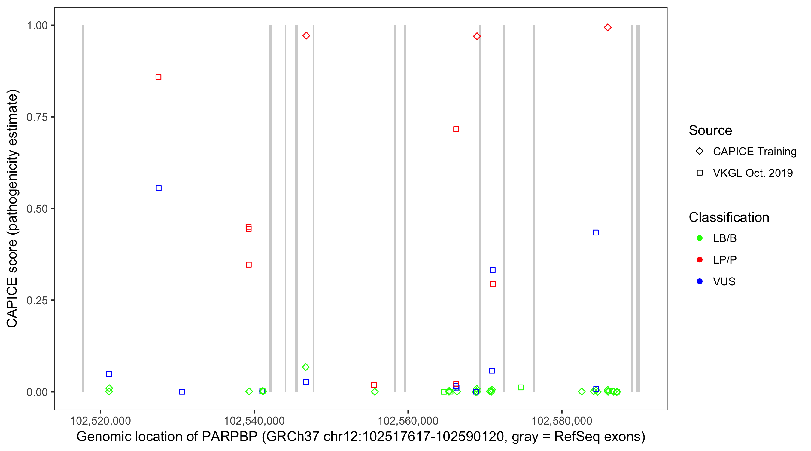 Shown are CAPICE train/test variants plus VKGL Oct 2019.