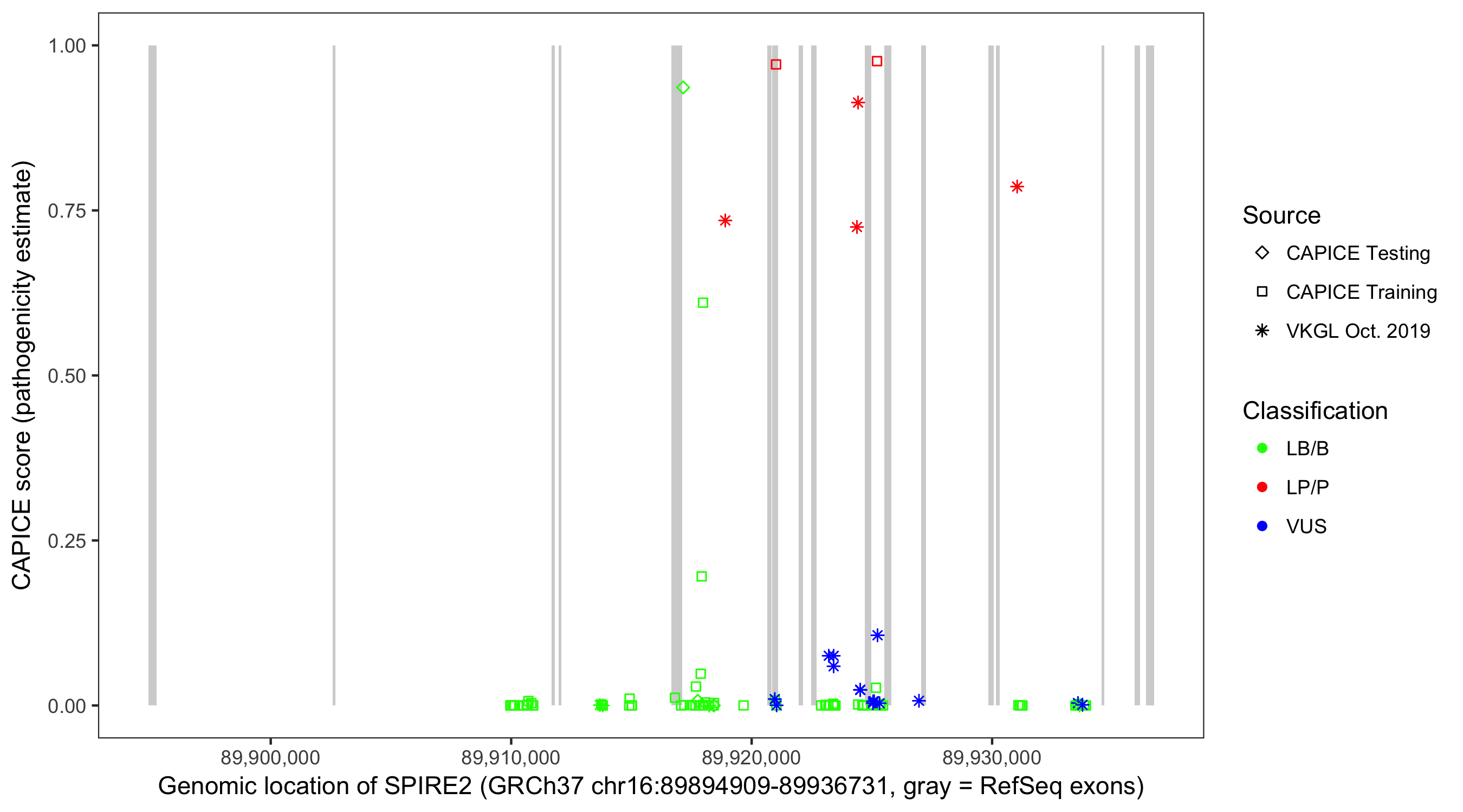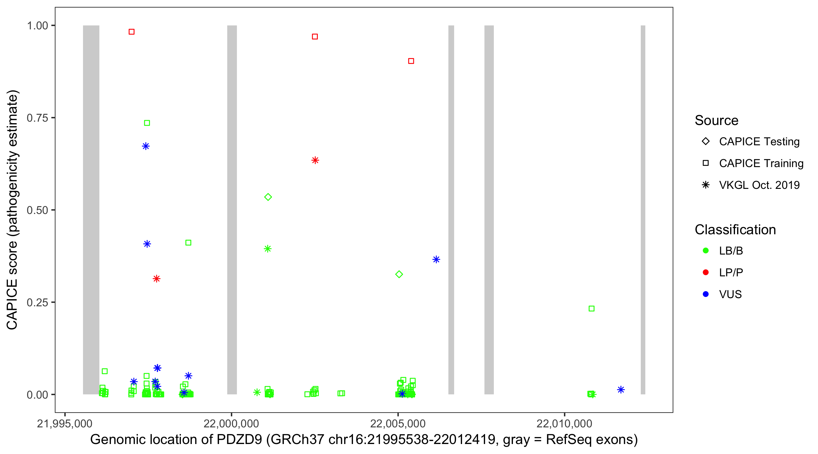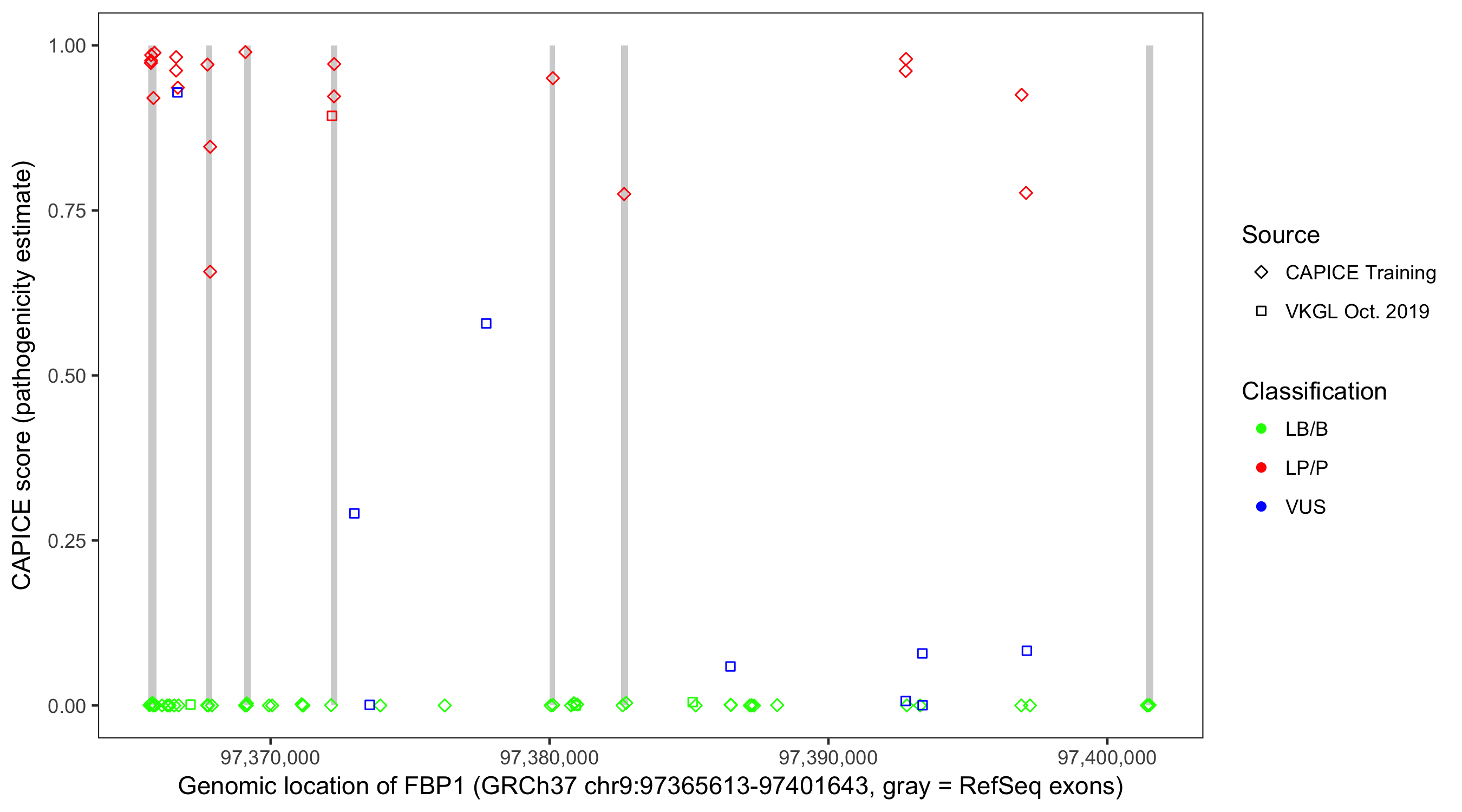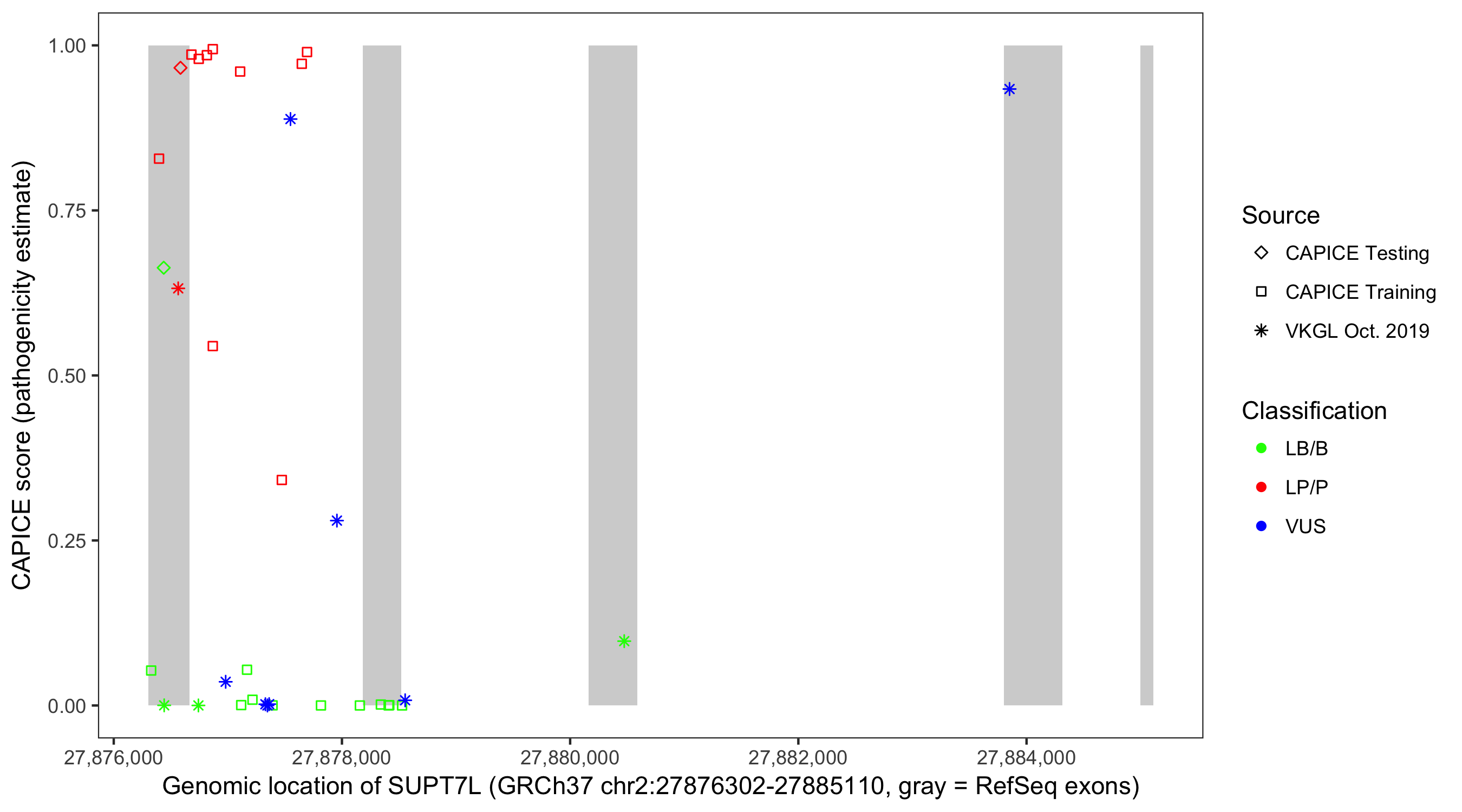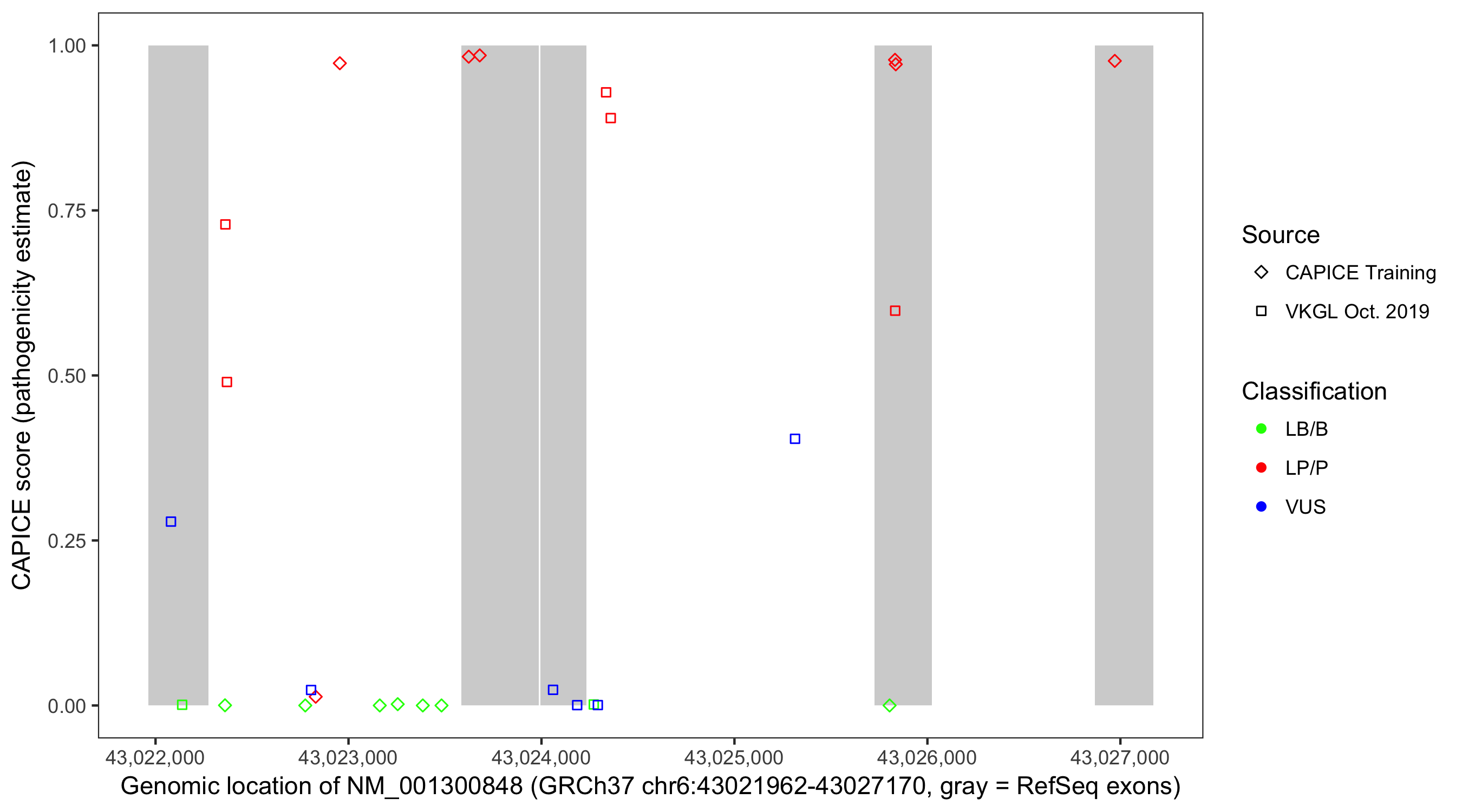 Shown are CAPICE train/test variants plus VKGL Oct 2019.