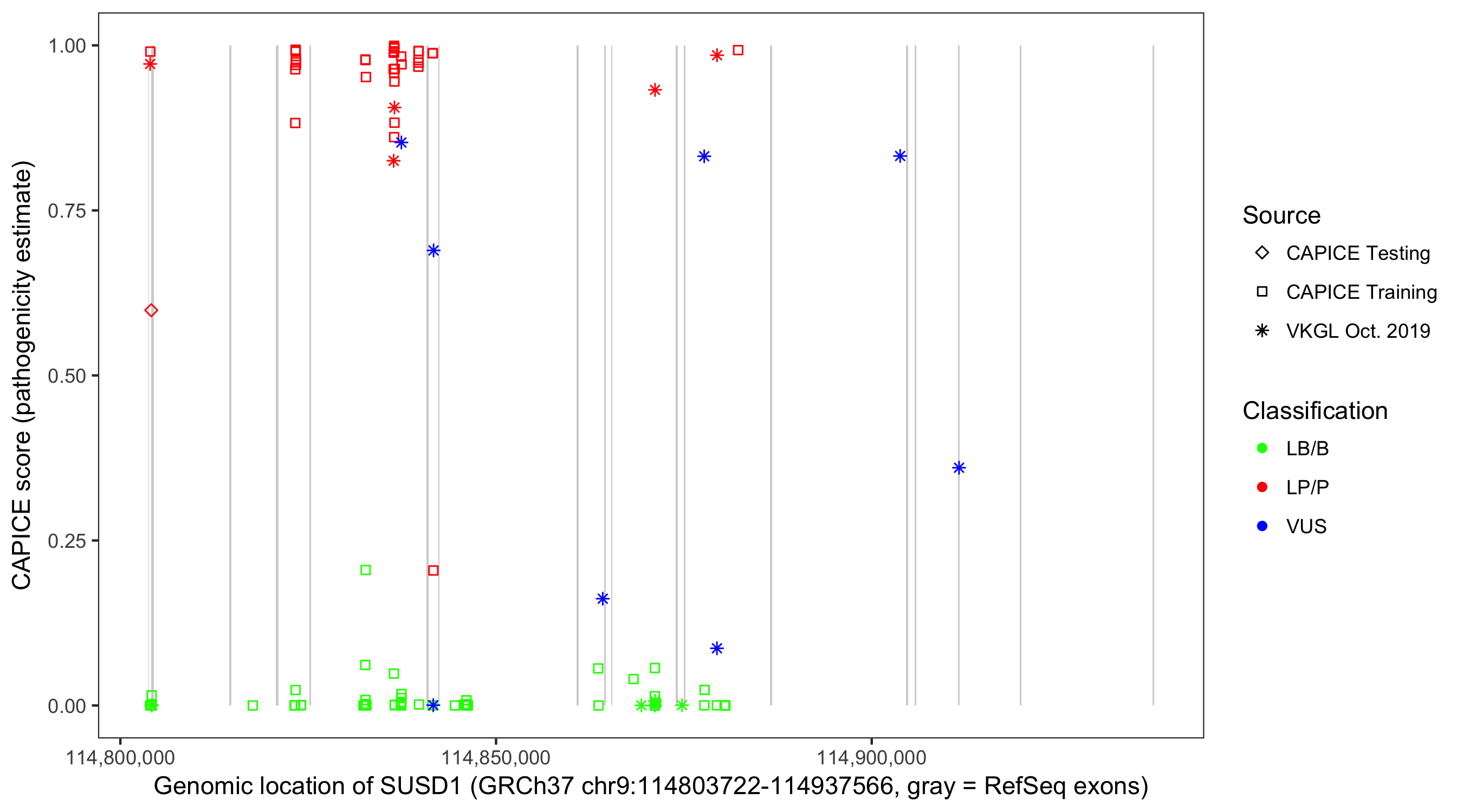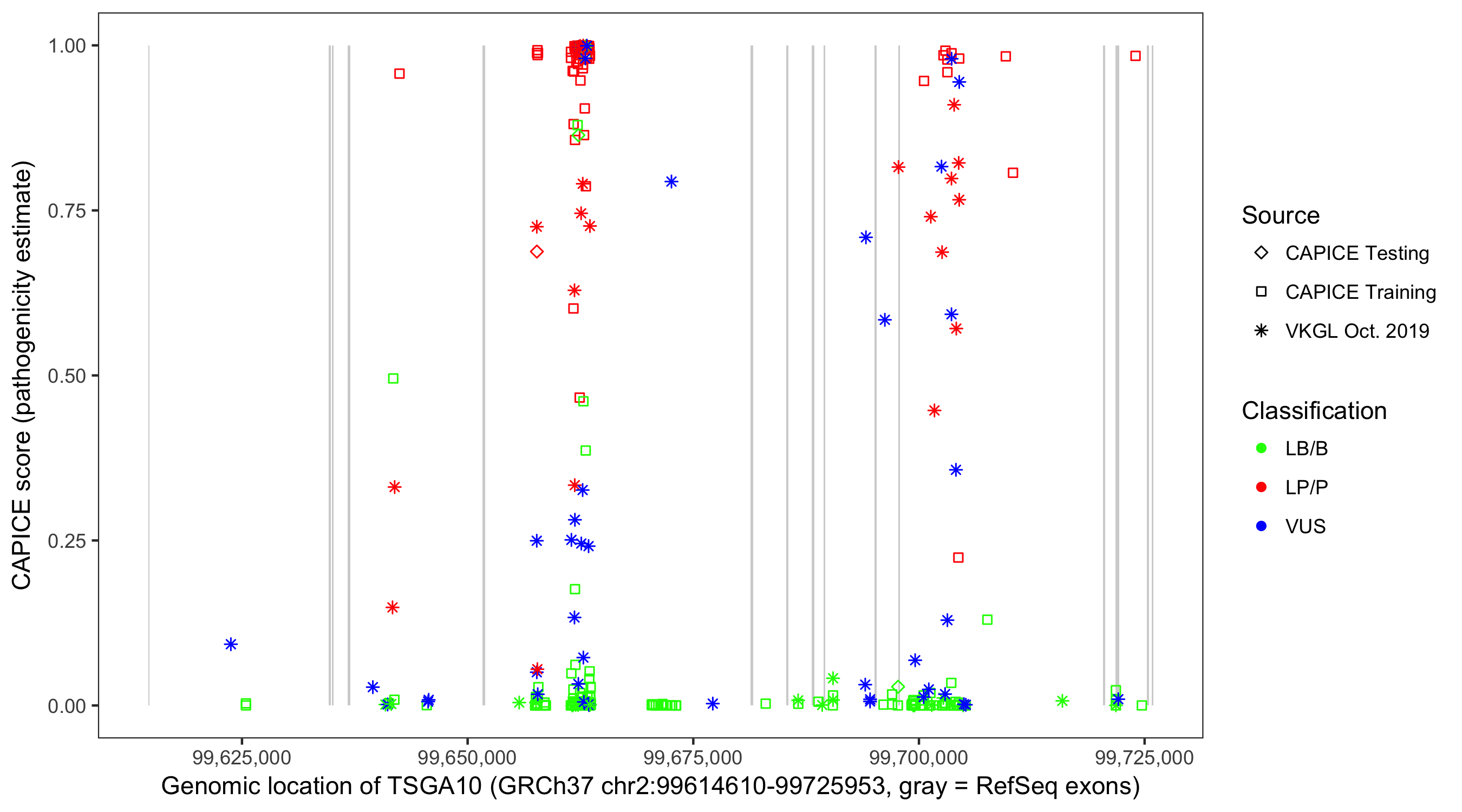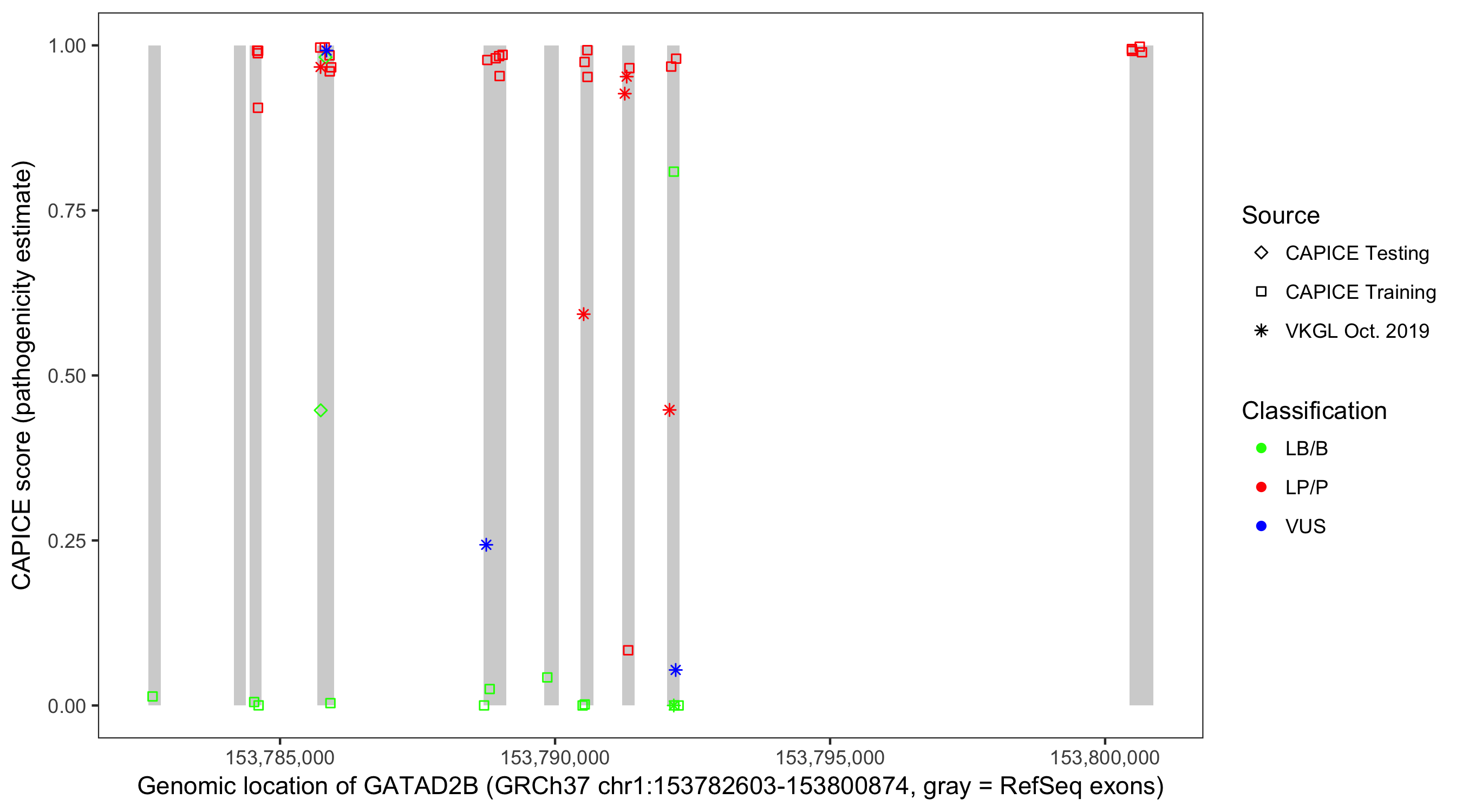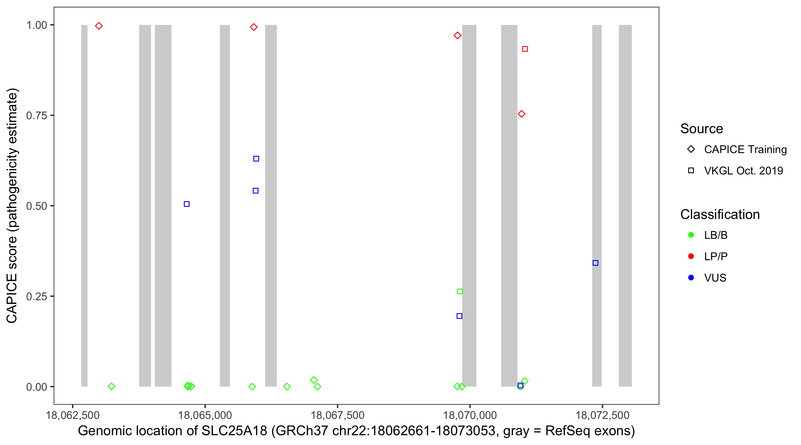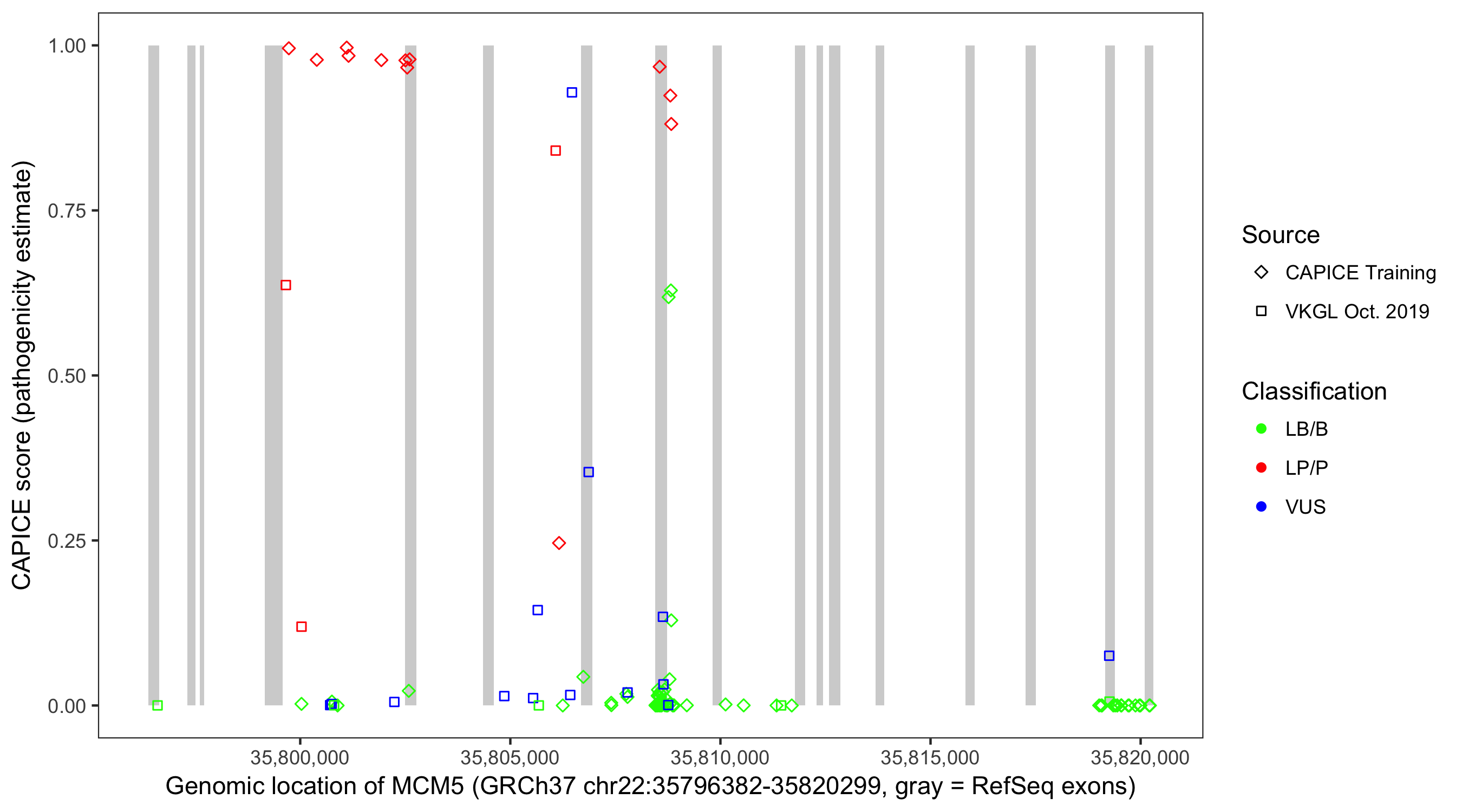 Shown are CAPICE train/test variants plus VKGL Oct 2019.