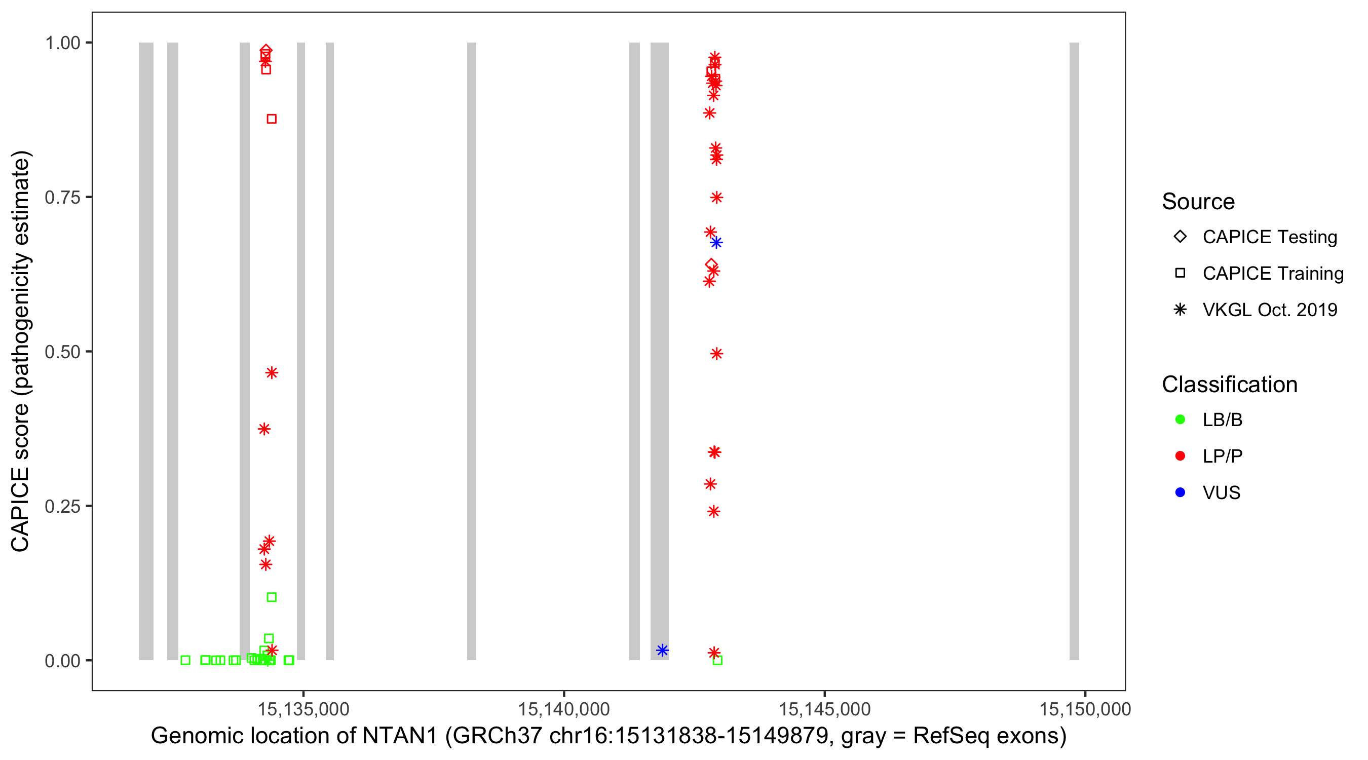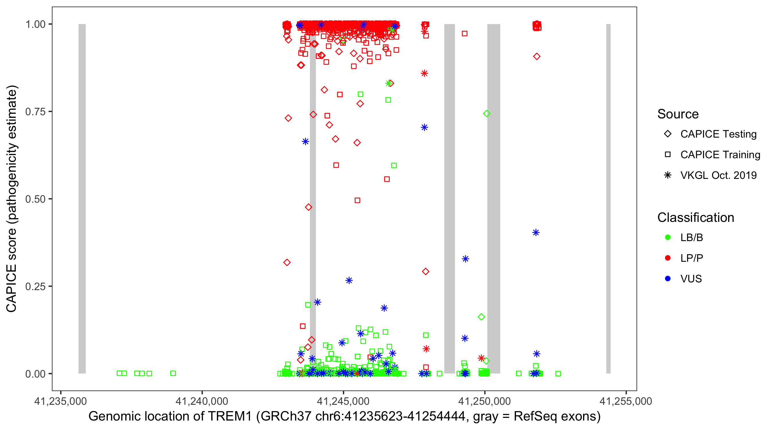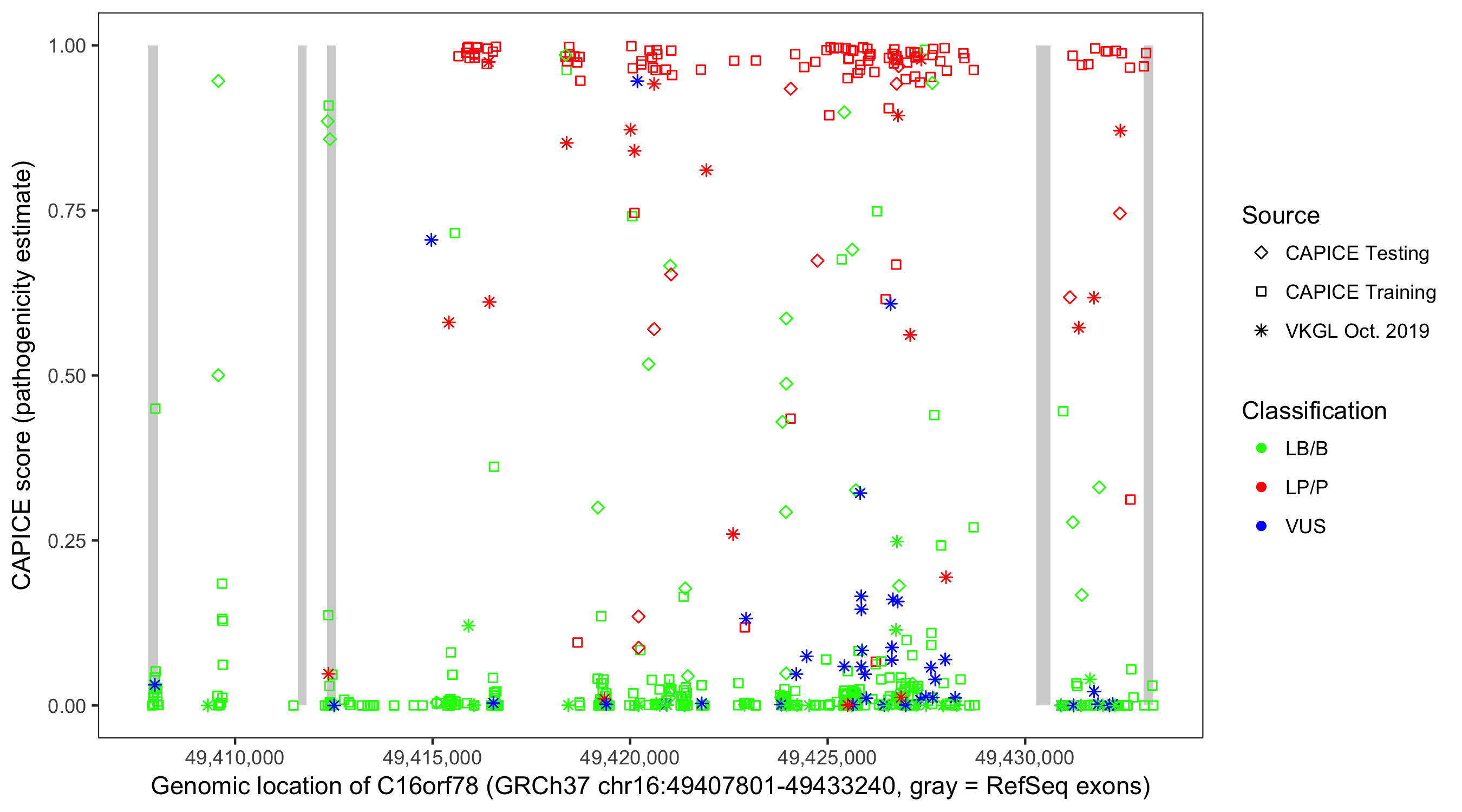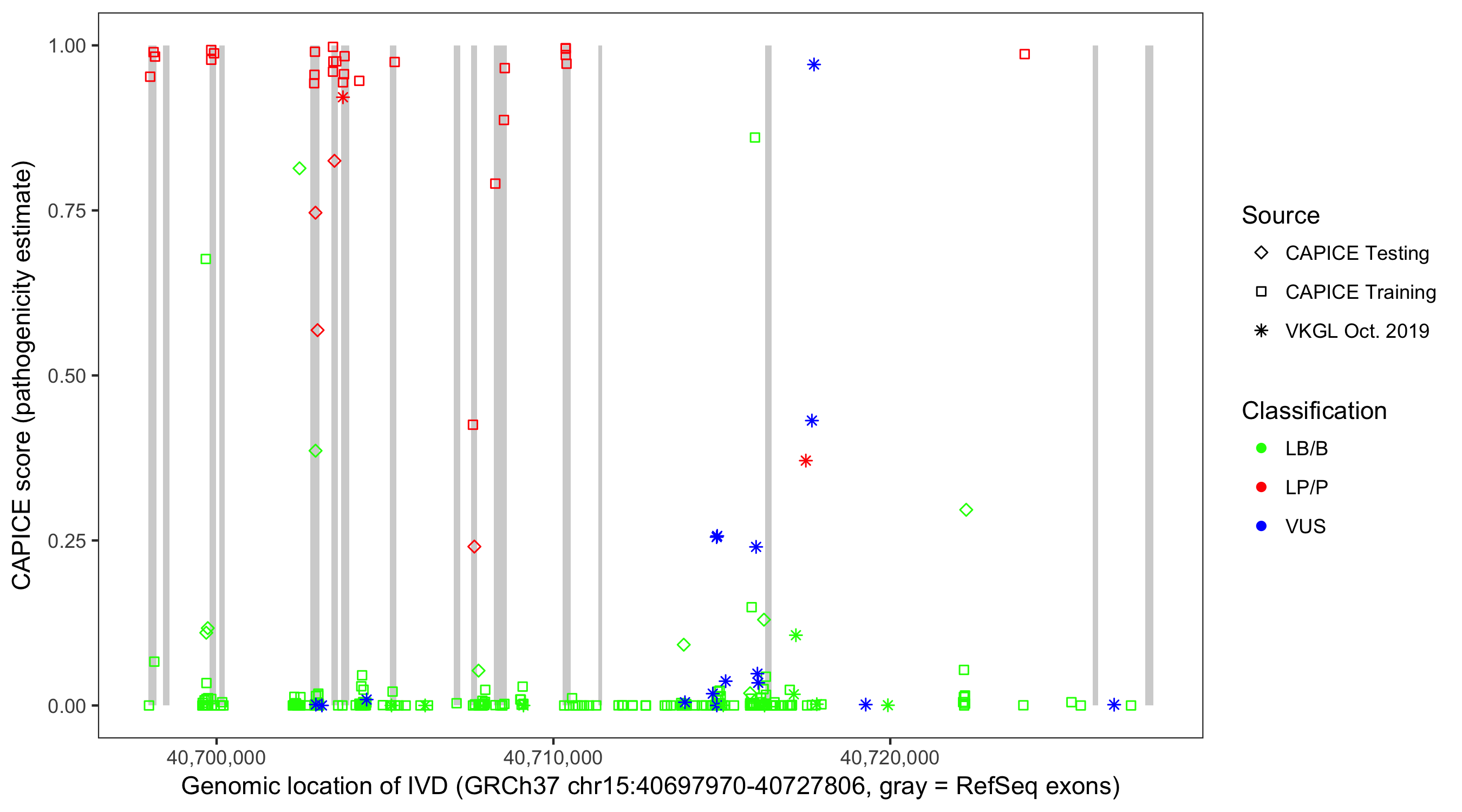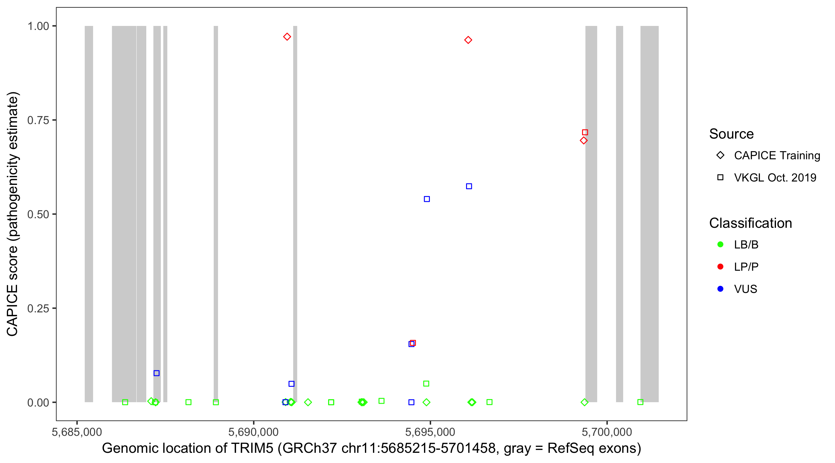 Shown are CAPICE train/test variants plus VKGL Oct 2019.