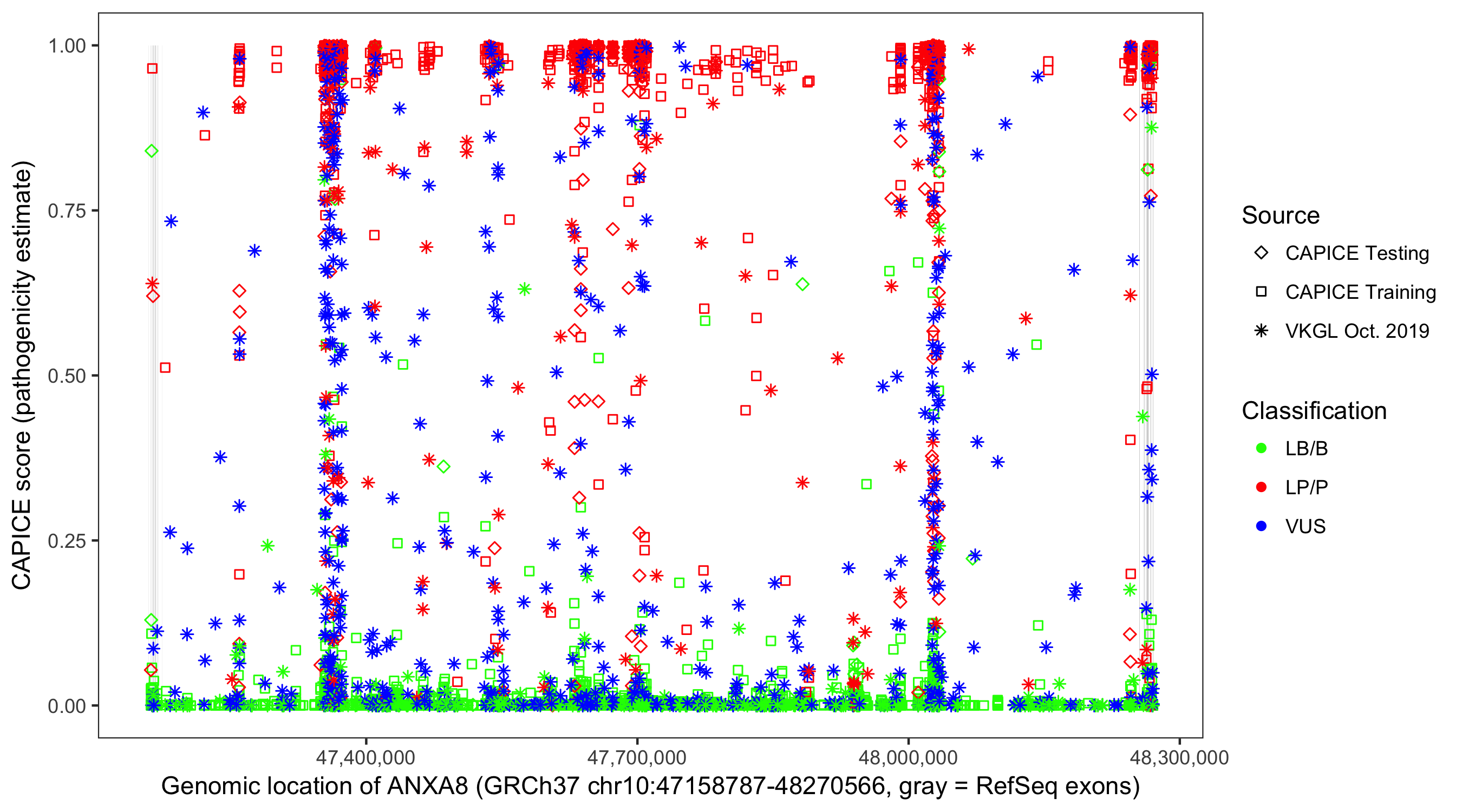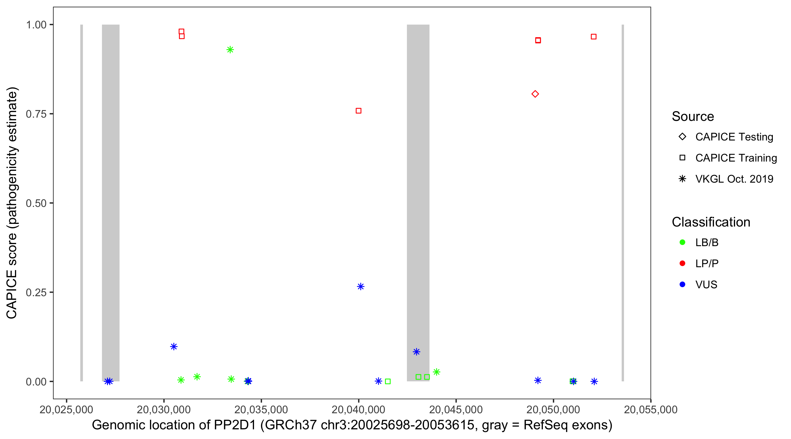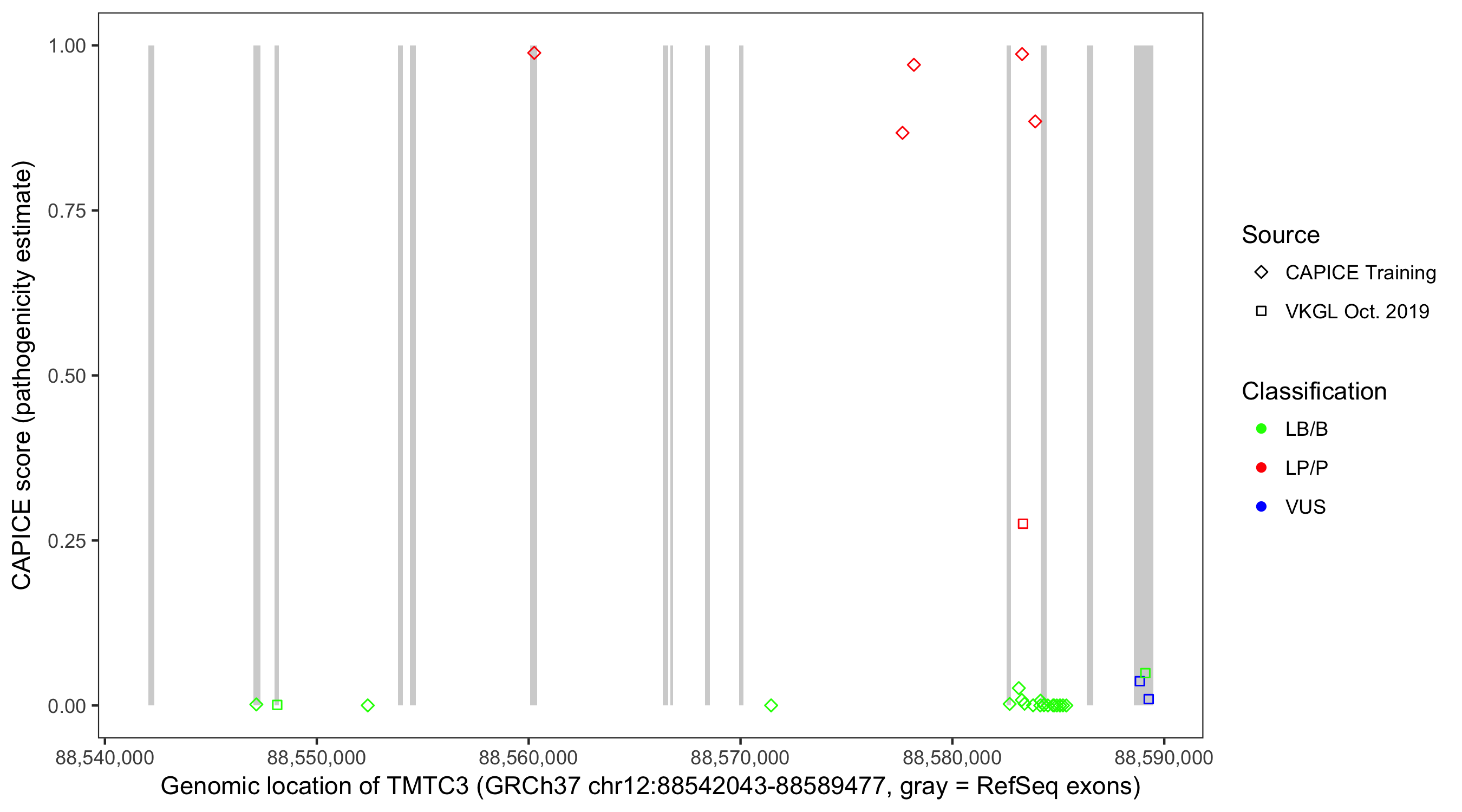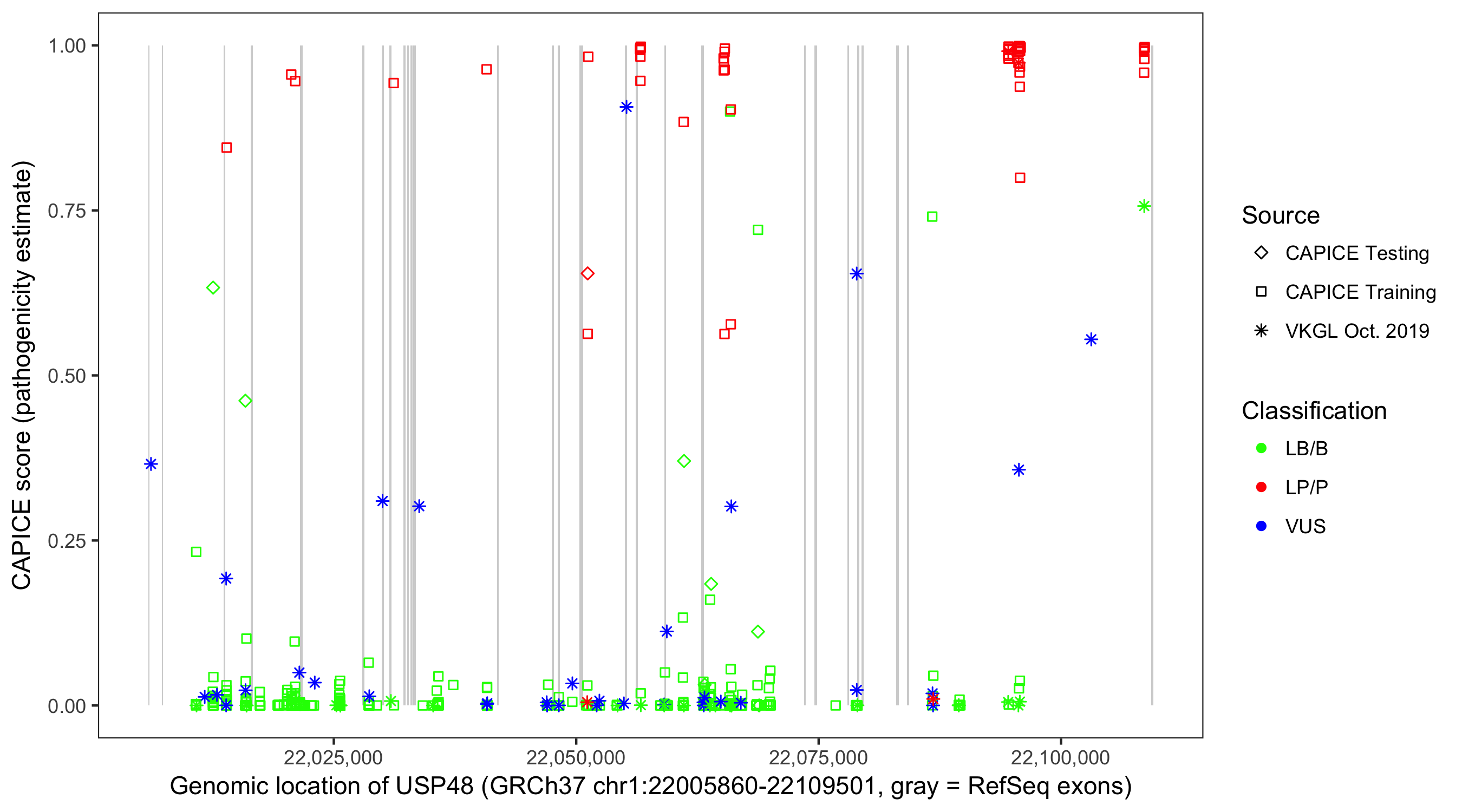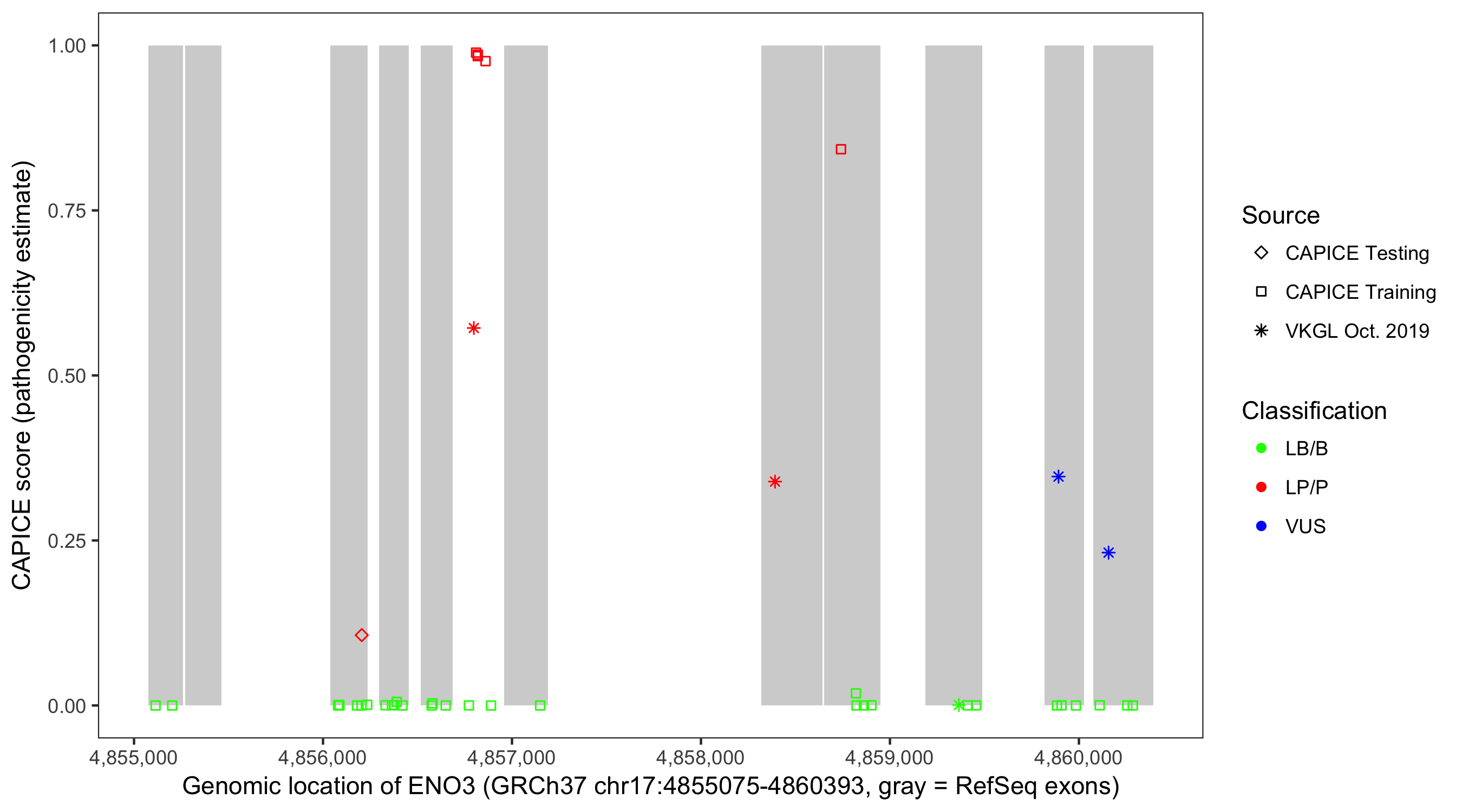Shown are CAPICE train/test variants plus VKGL Oct 2019.
