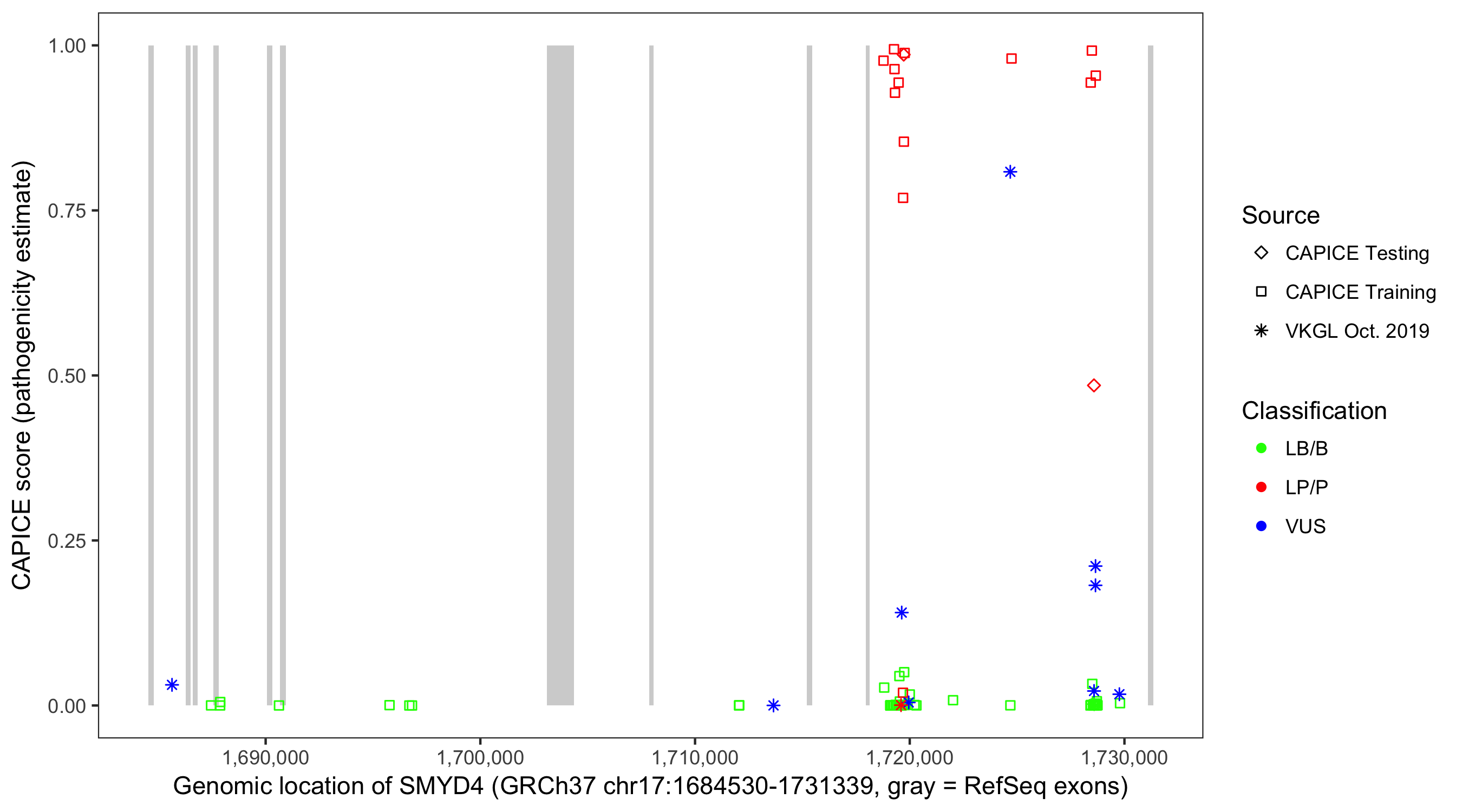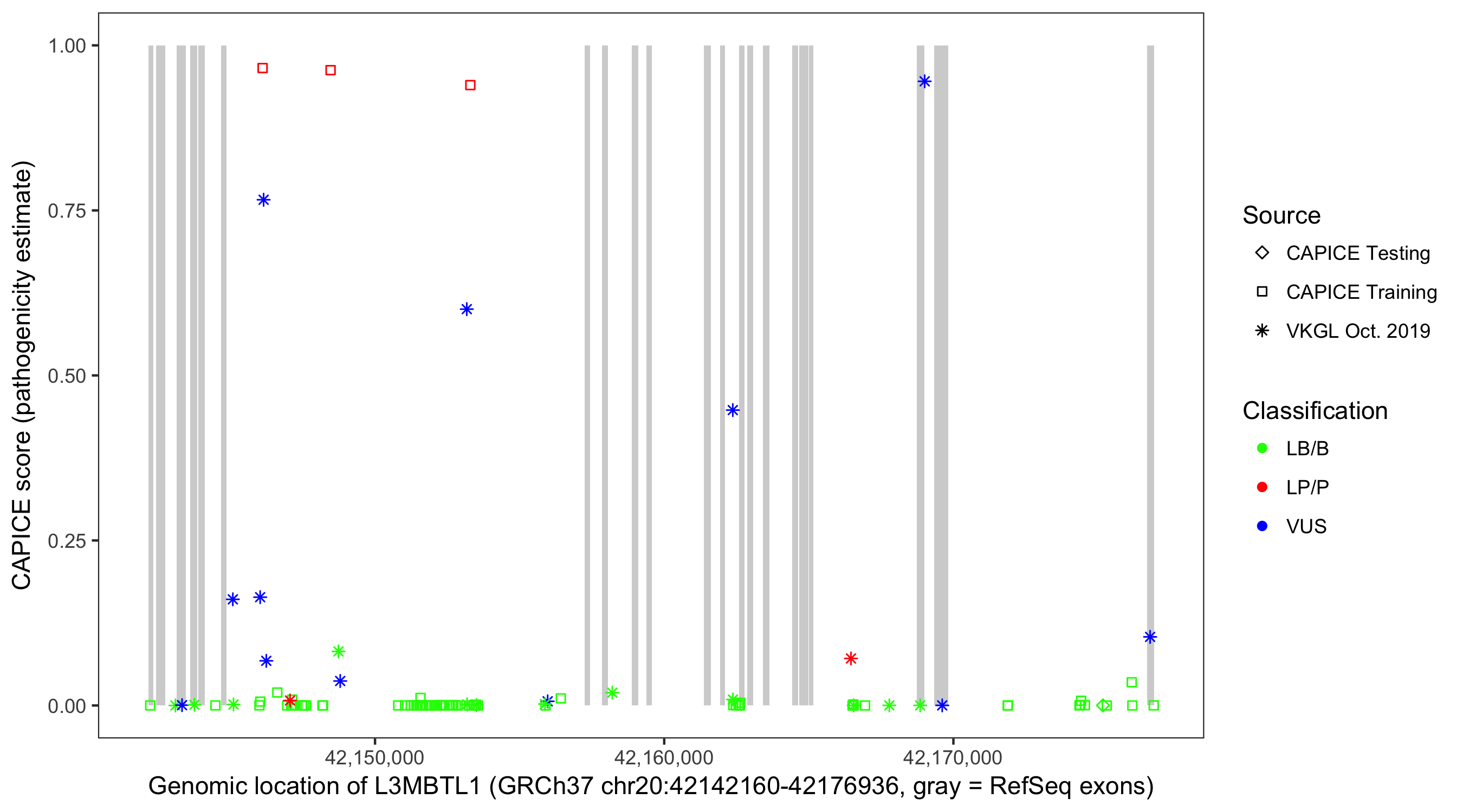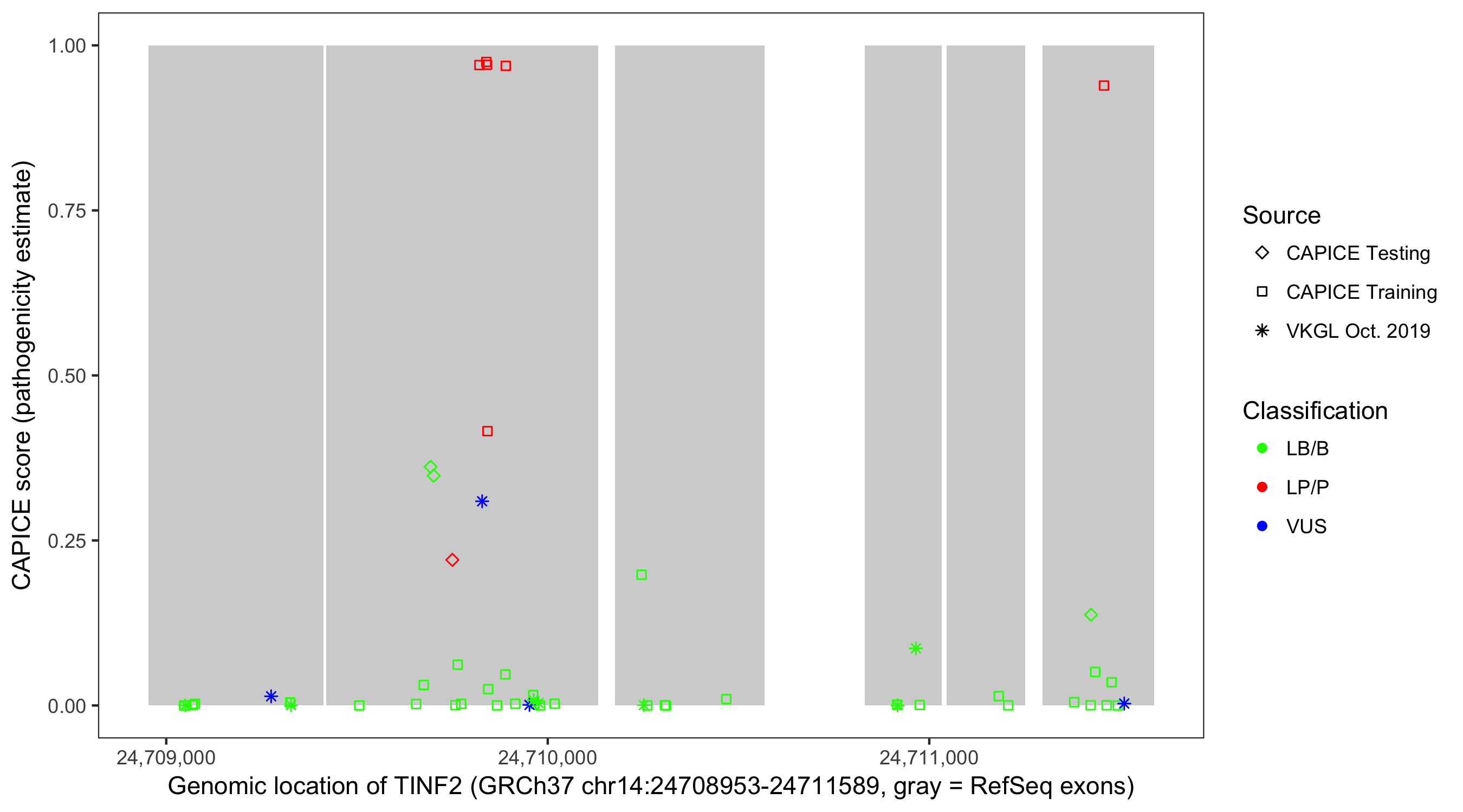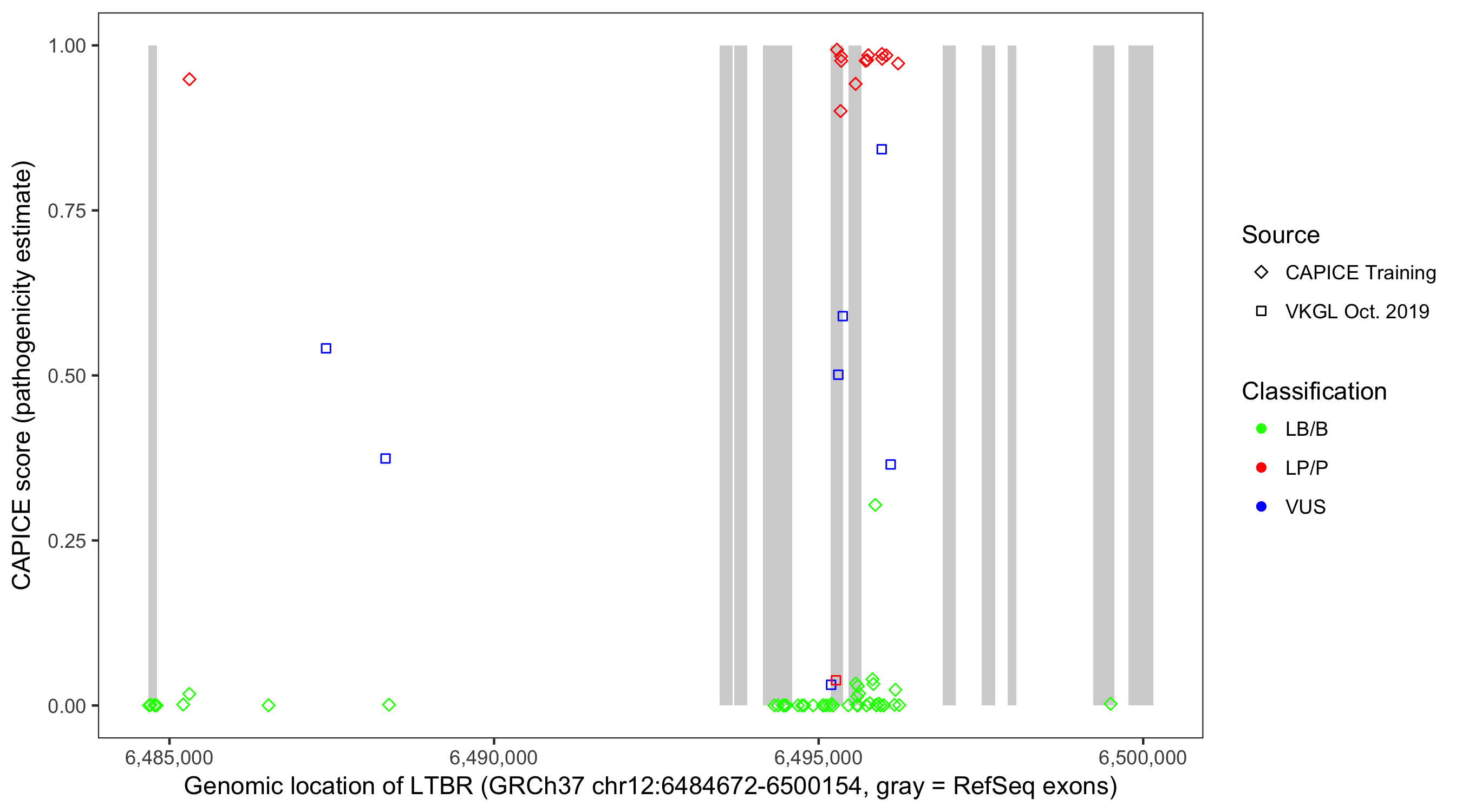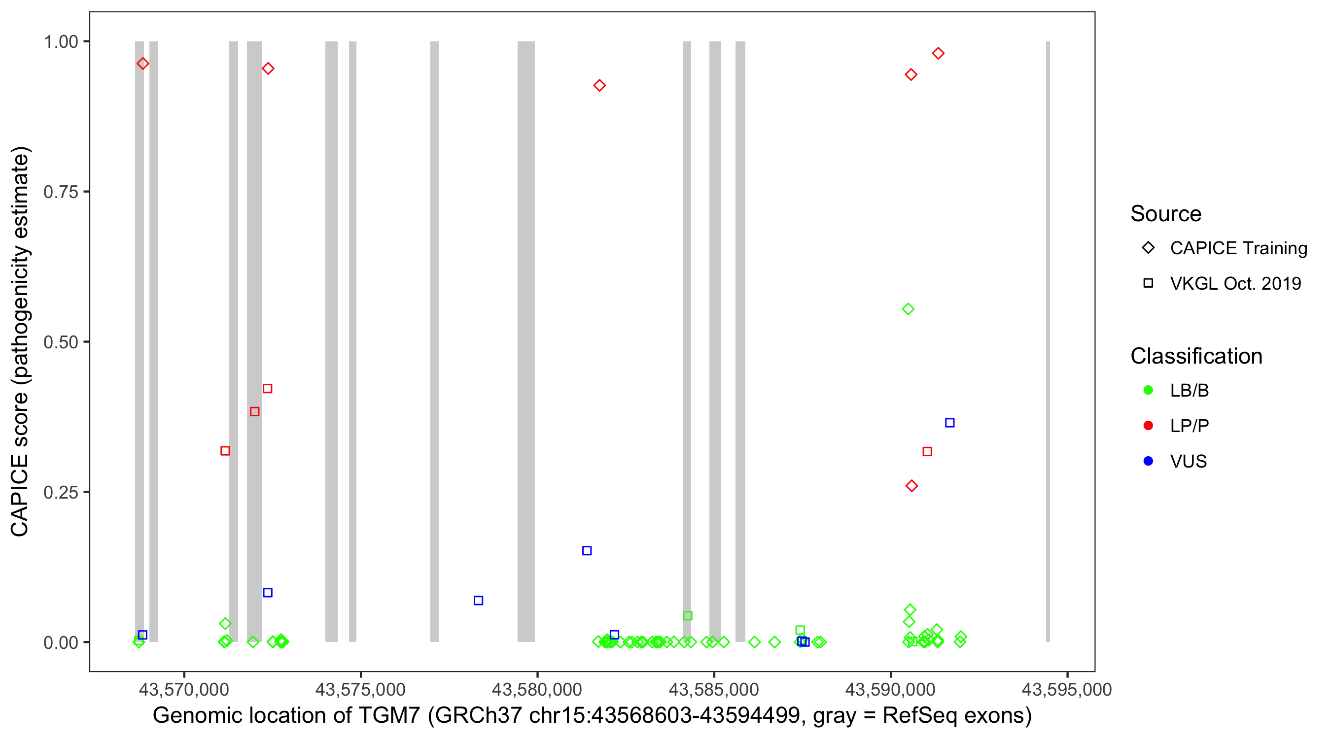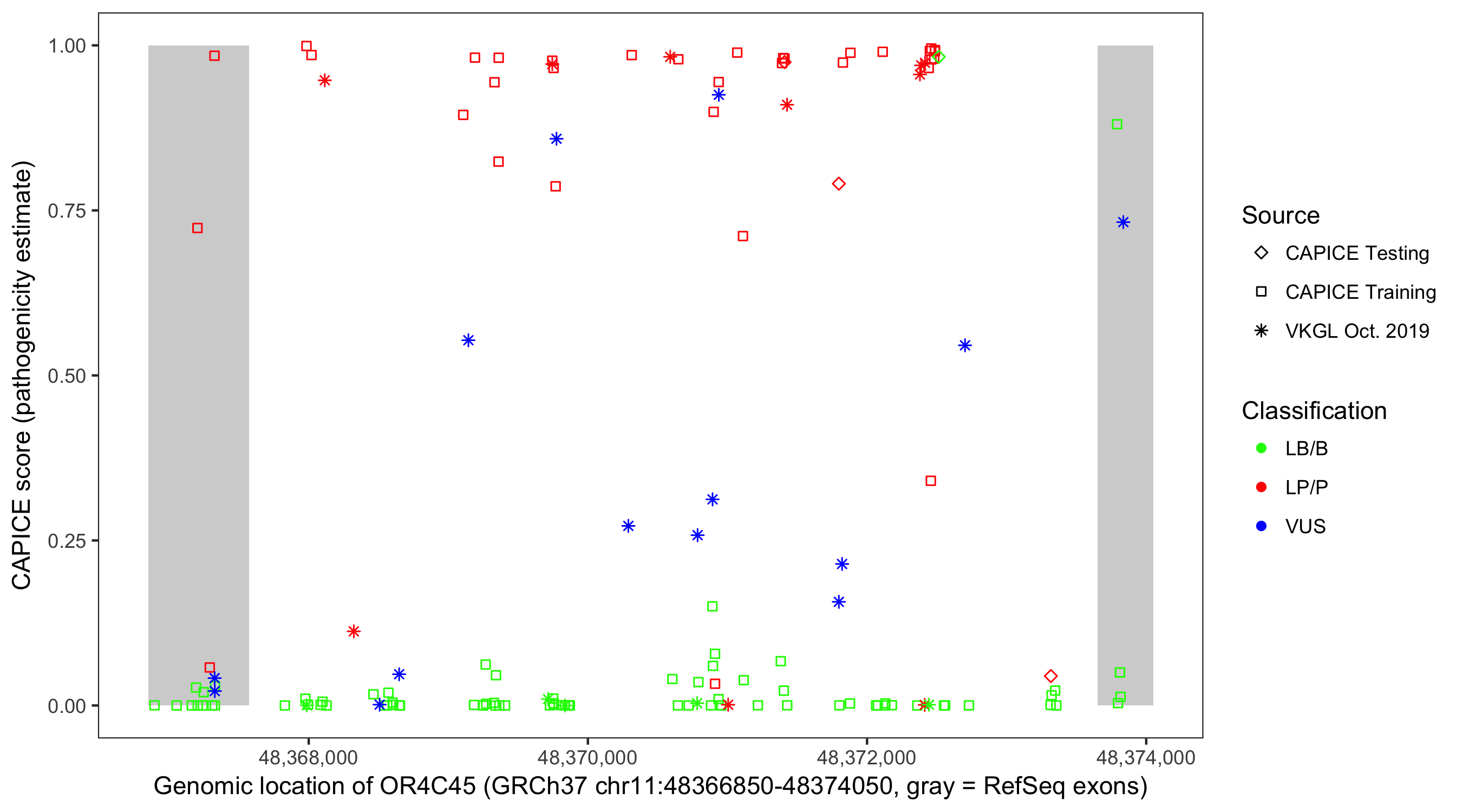 Shown are CAPICE train/test variants plus VKGL Oct 2019.
