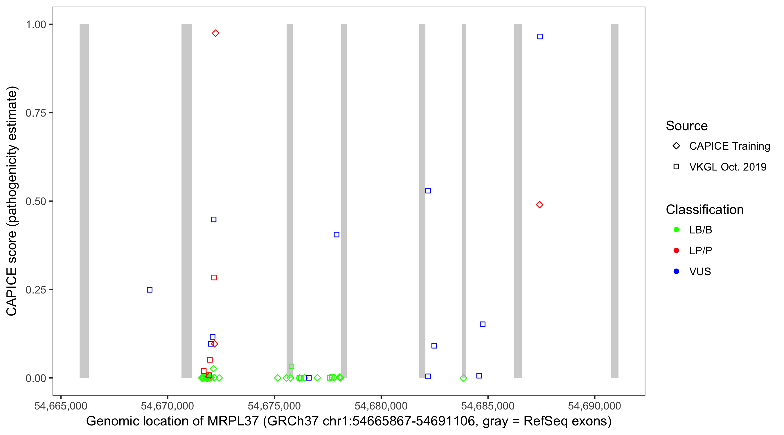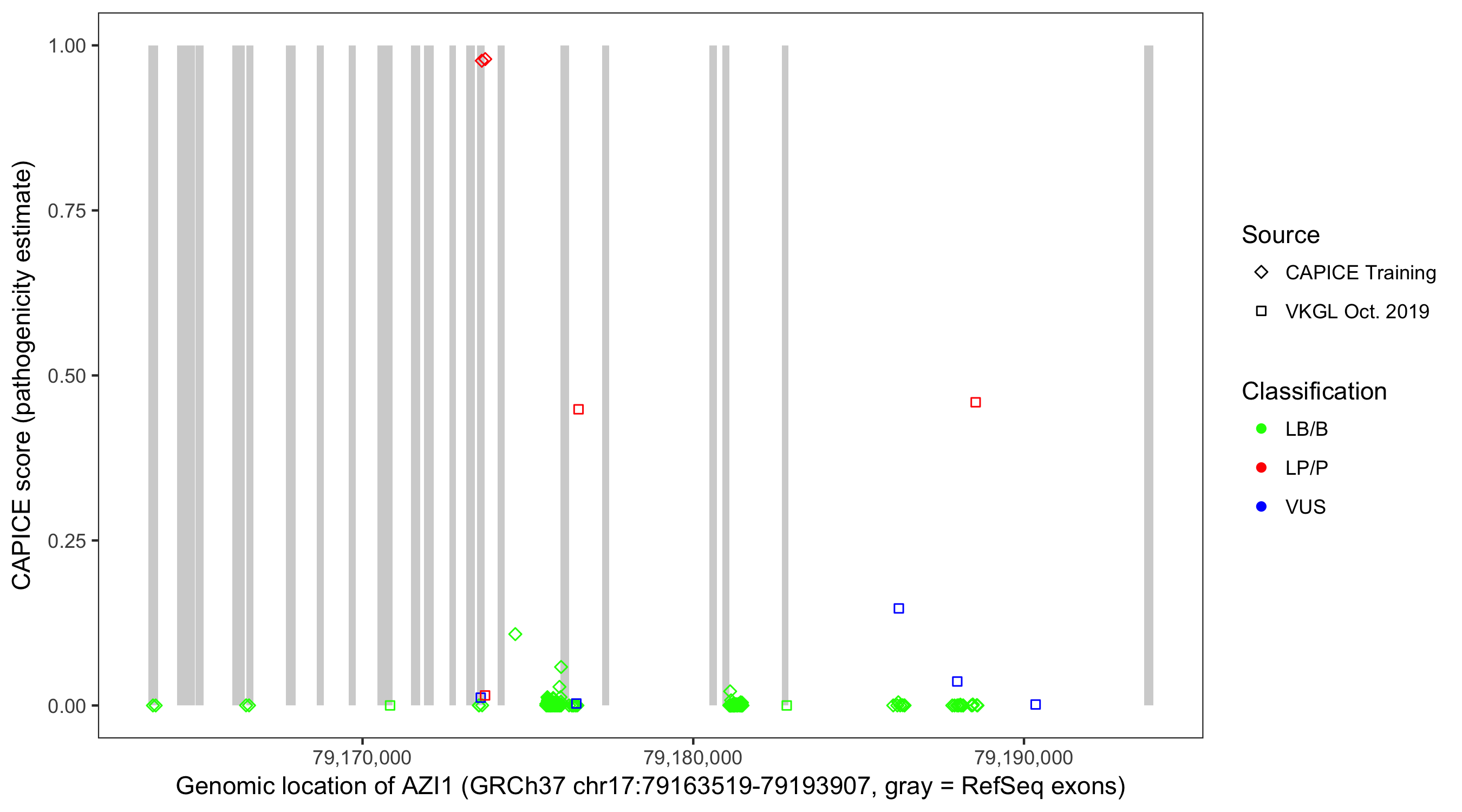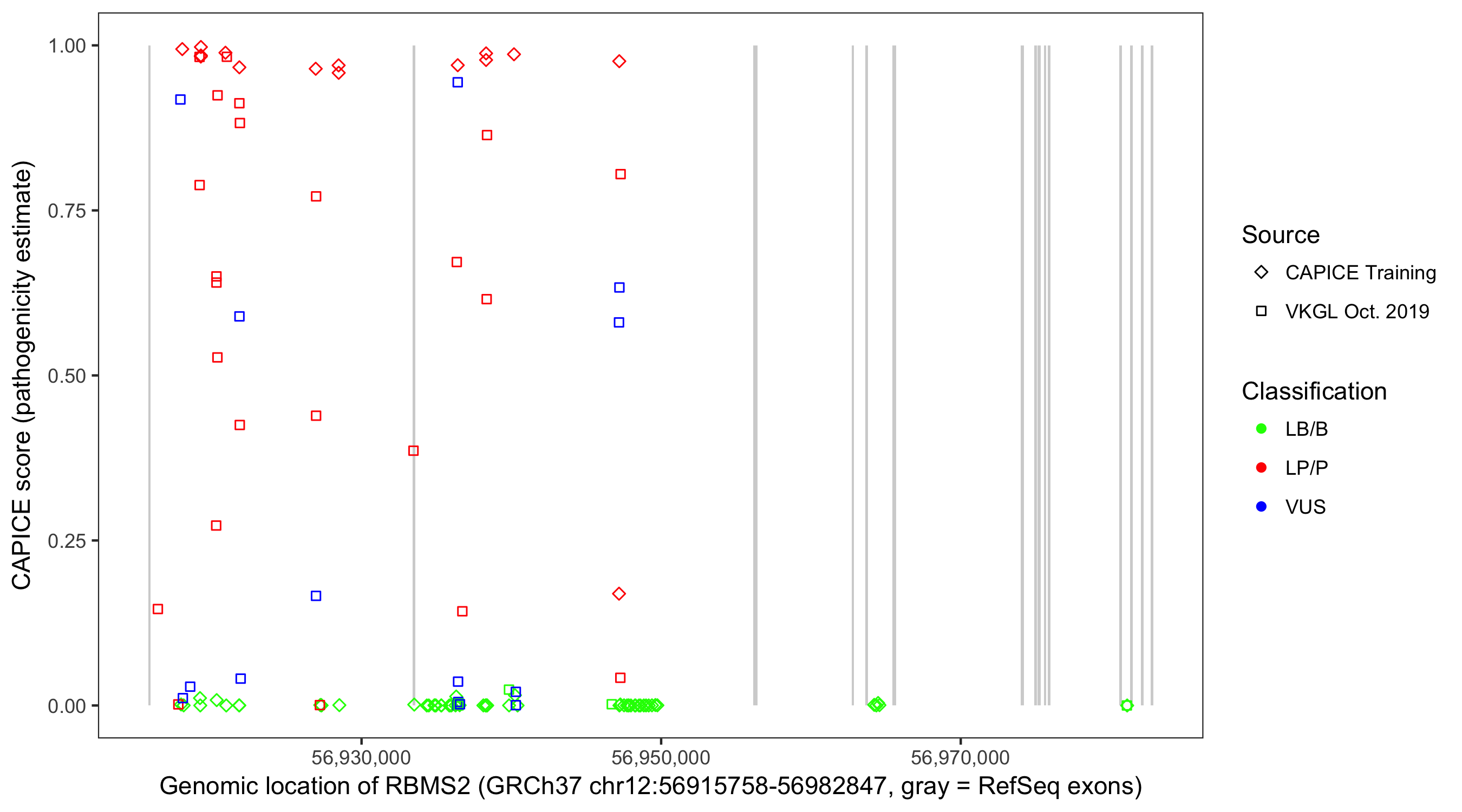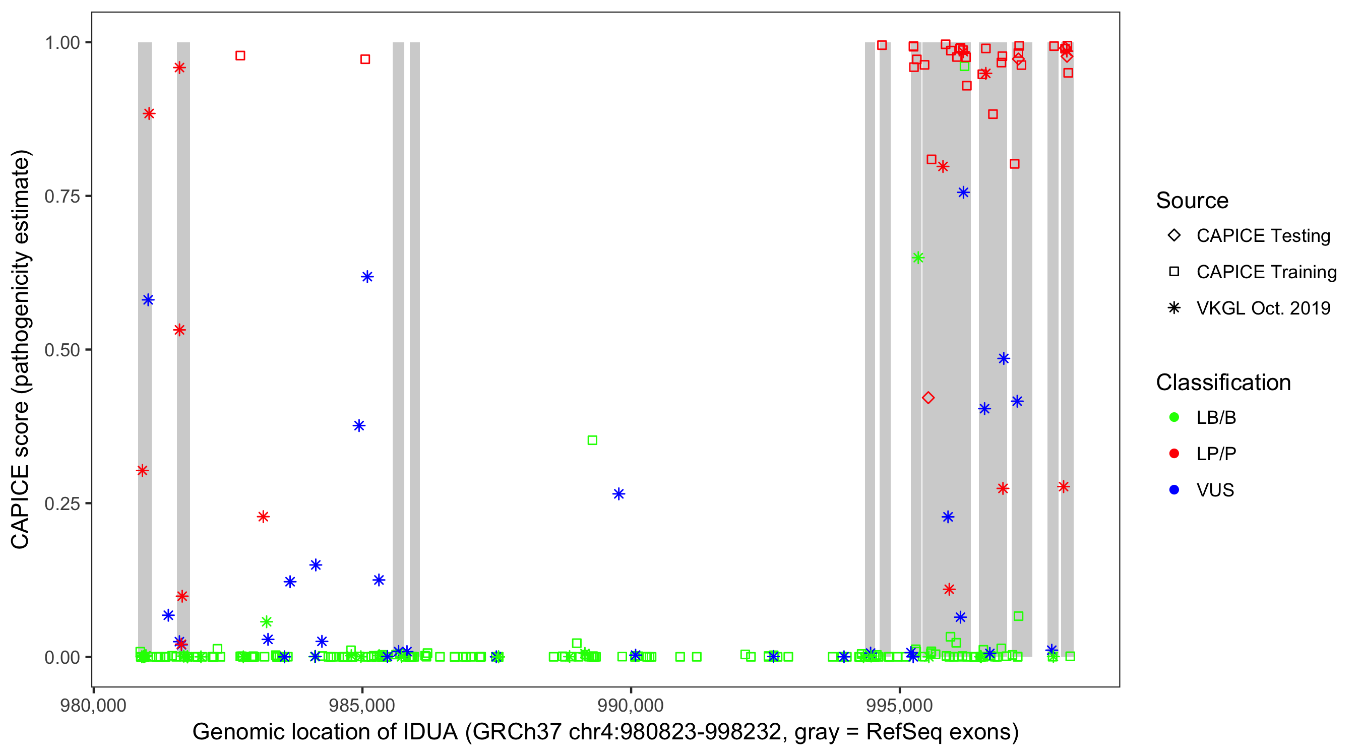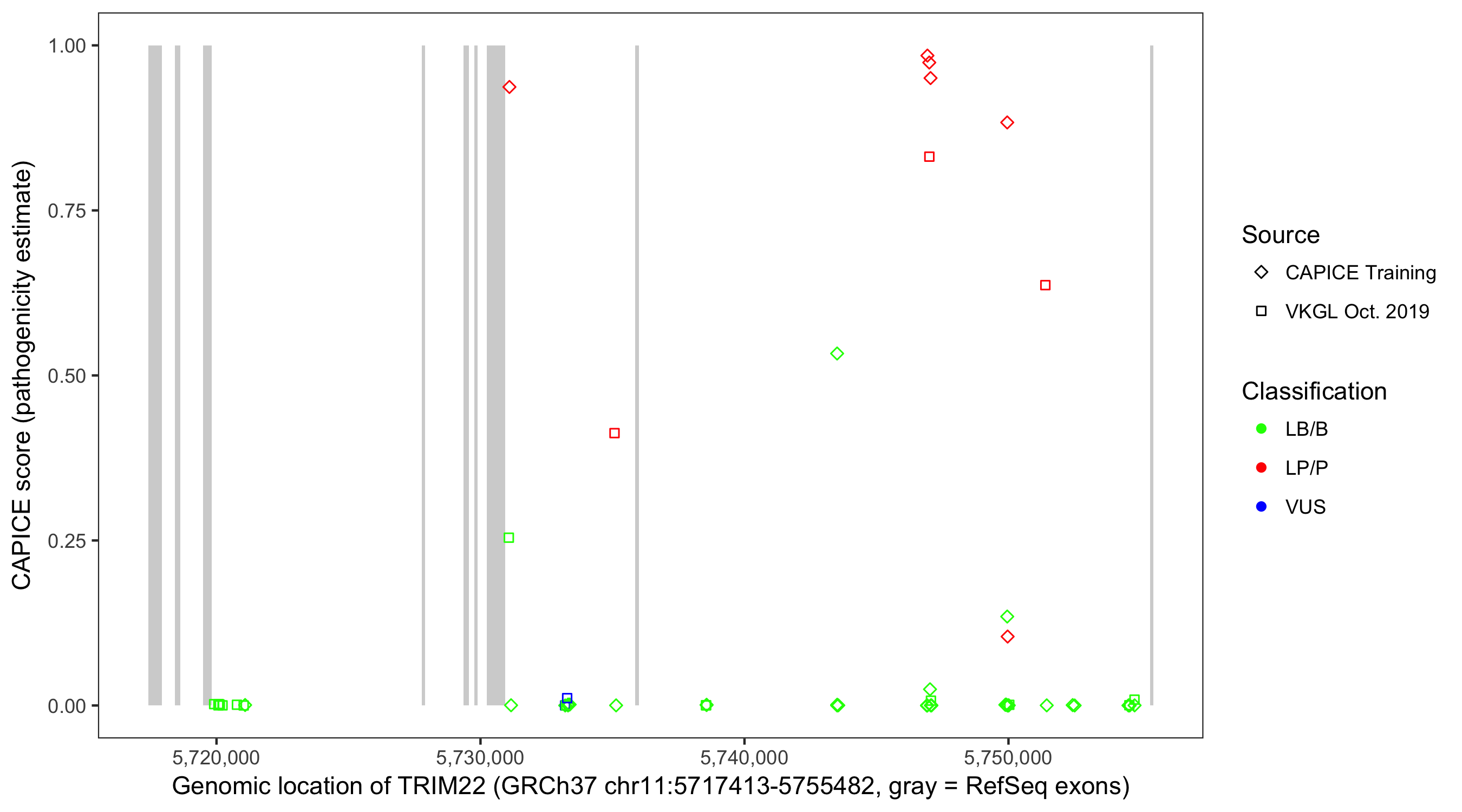 Shown are CAPICE train/test variants plus VKGL Oct 2019.